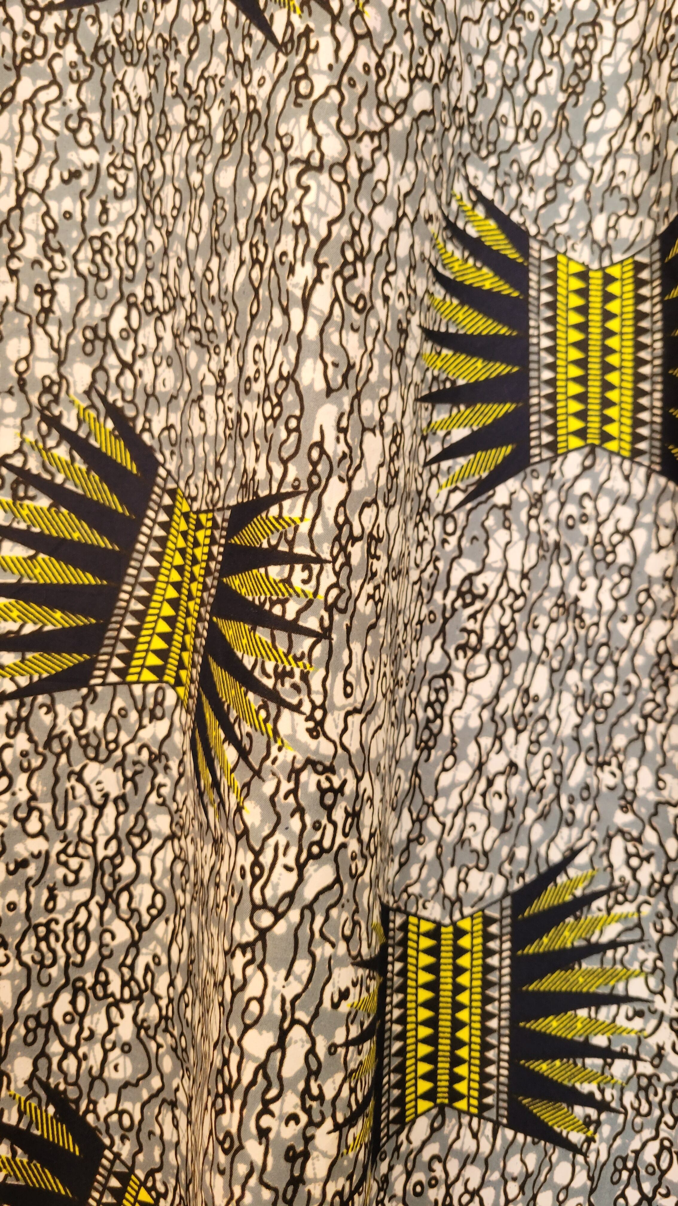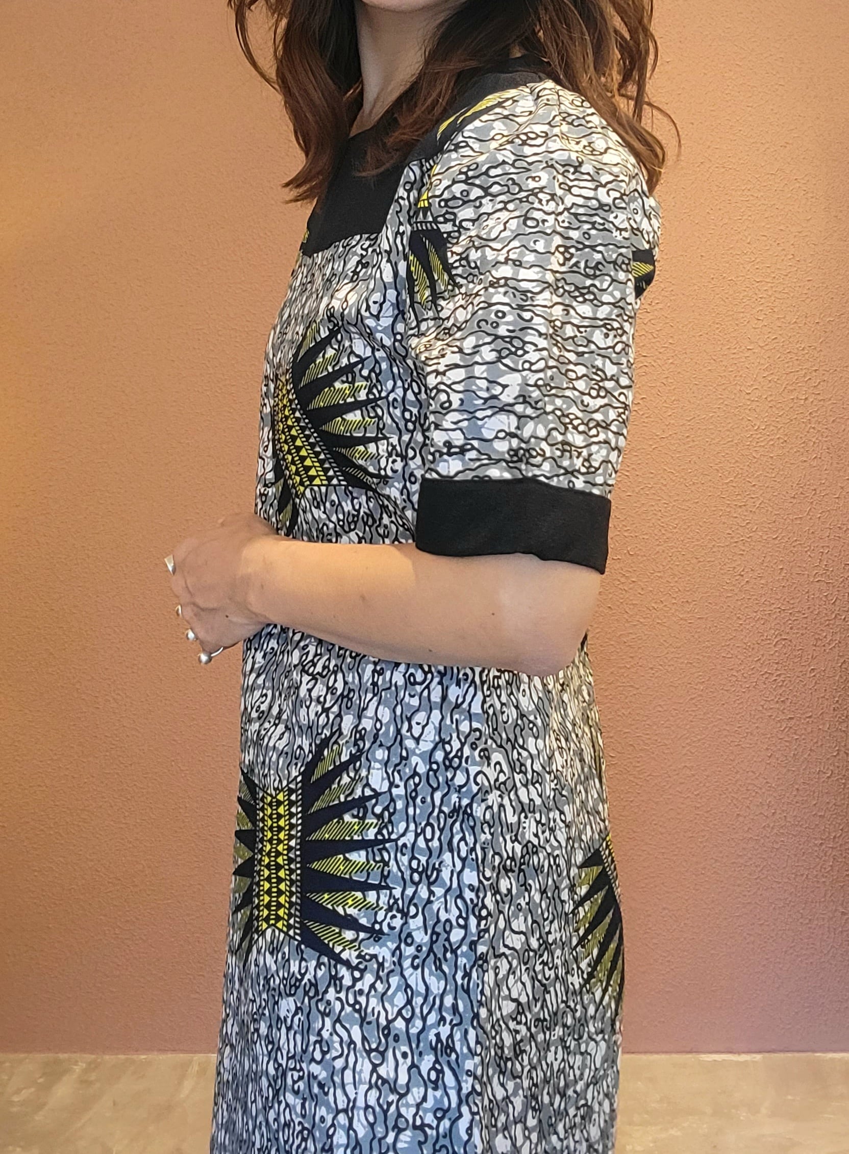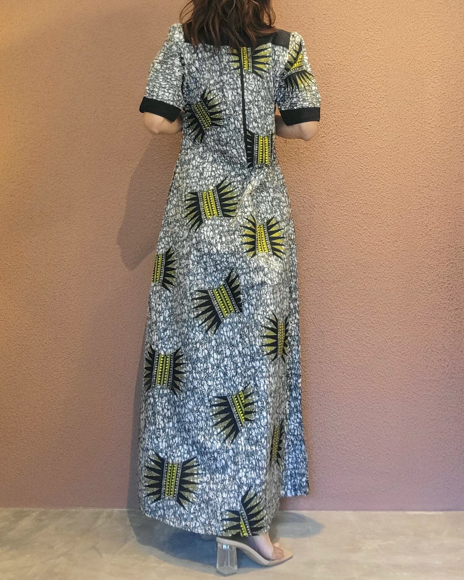 ヴィンテージのアフリカンバティックマキシワンピース。素材表記はありませんがコットンです。バックファスナー付きで着脱が簡単です。カラフルな色柄の多いアフリカンバティックですがこちらはブラックのポイント使いの効いた比較的落ち着きのある1着。1枚で着用できるコットンワンピースは暑い夏にぴったりです。