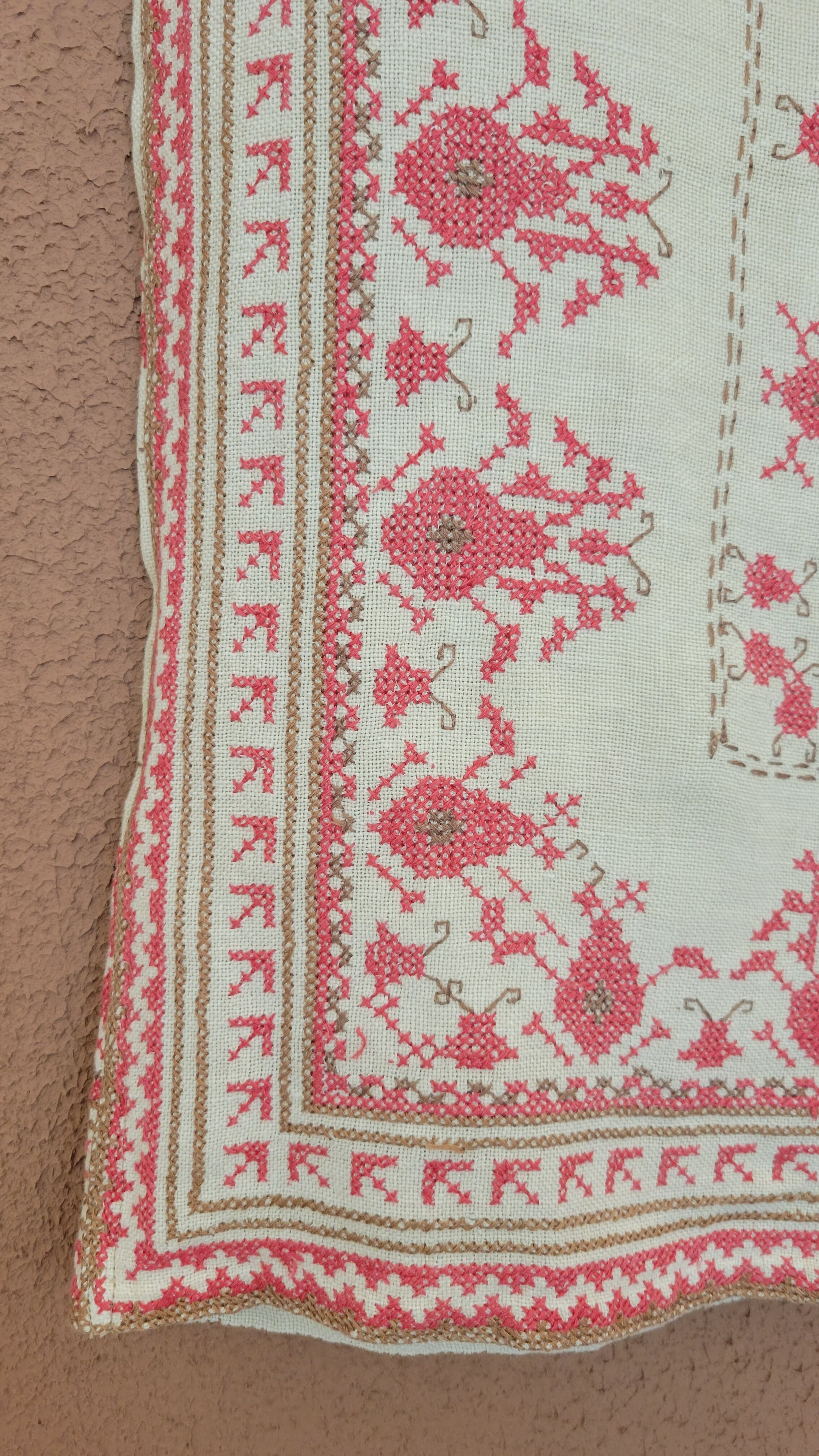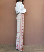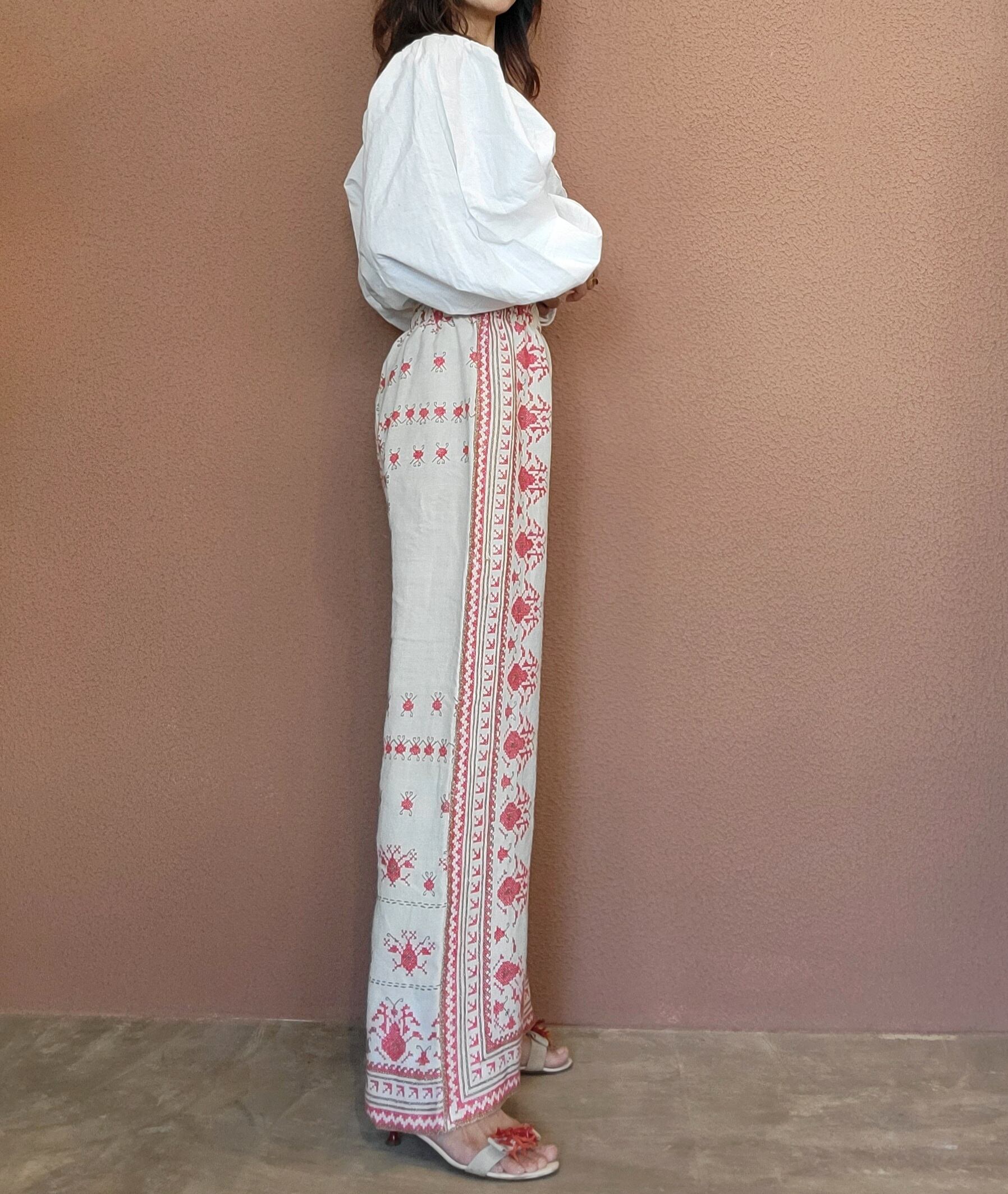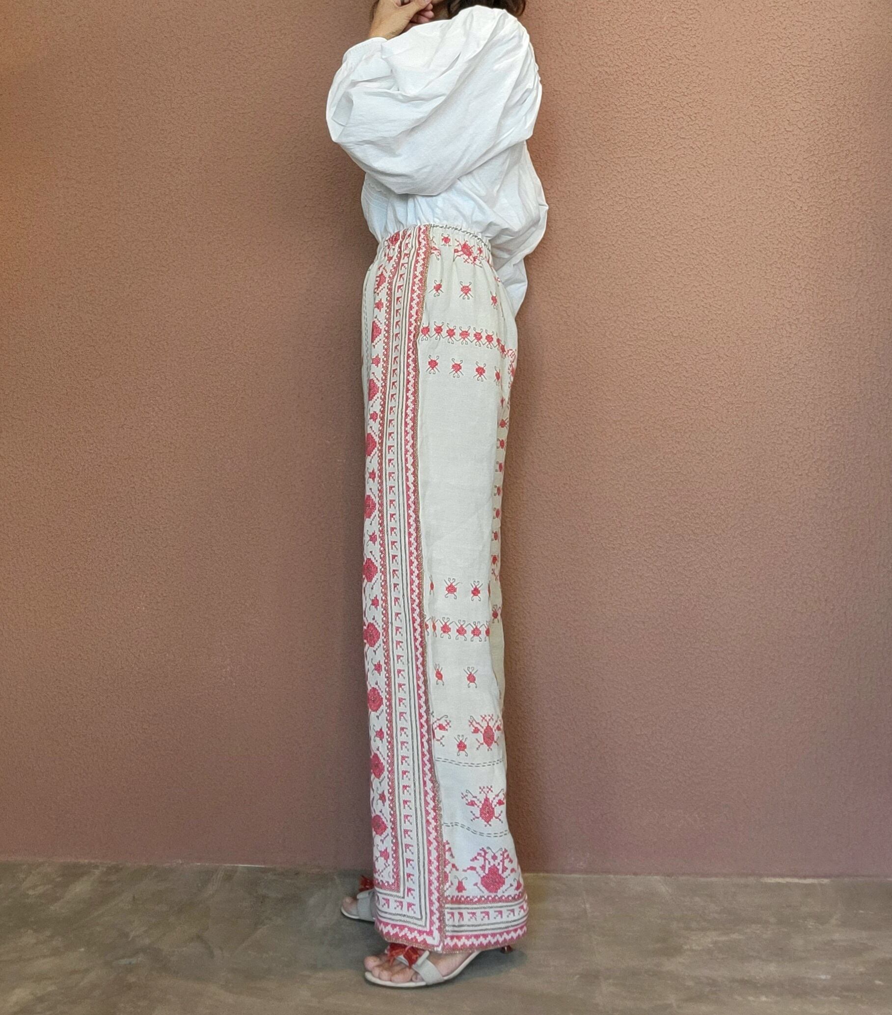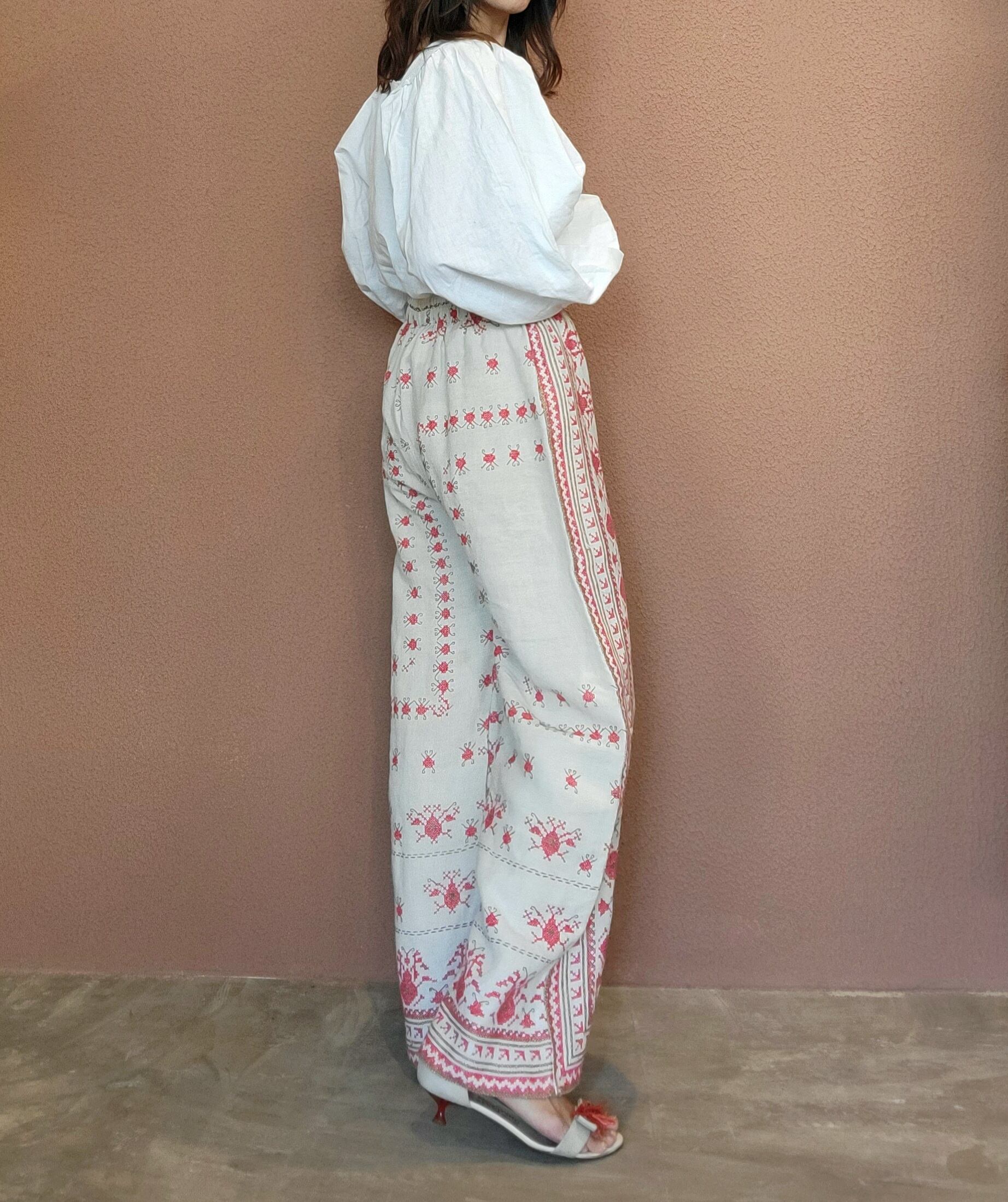ヴィンテージの刺繍クロスを使用したリメイクイージーパンツ。素材表記はありませんがリネンのようです。ウエストゴム、左右シームポケット付き。日常使いにぴったりのストレスフリーな履き心地です。