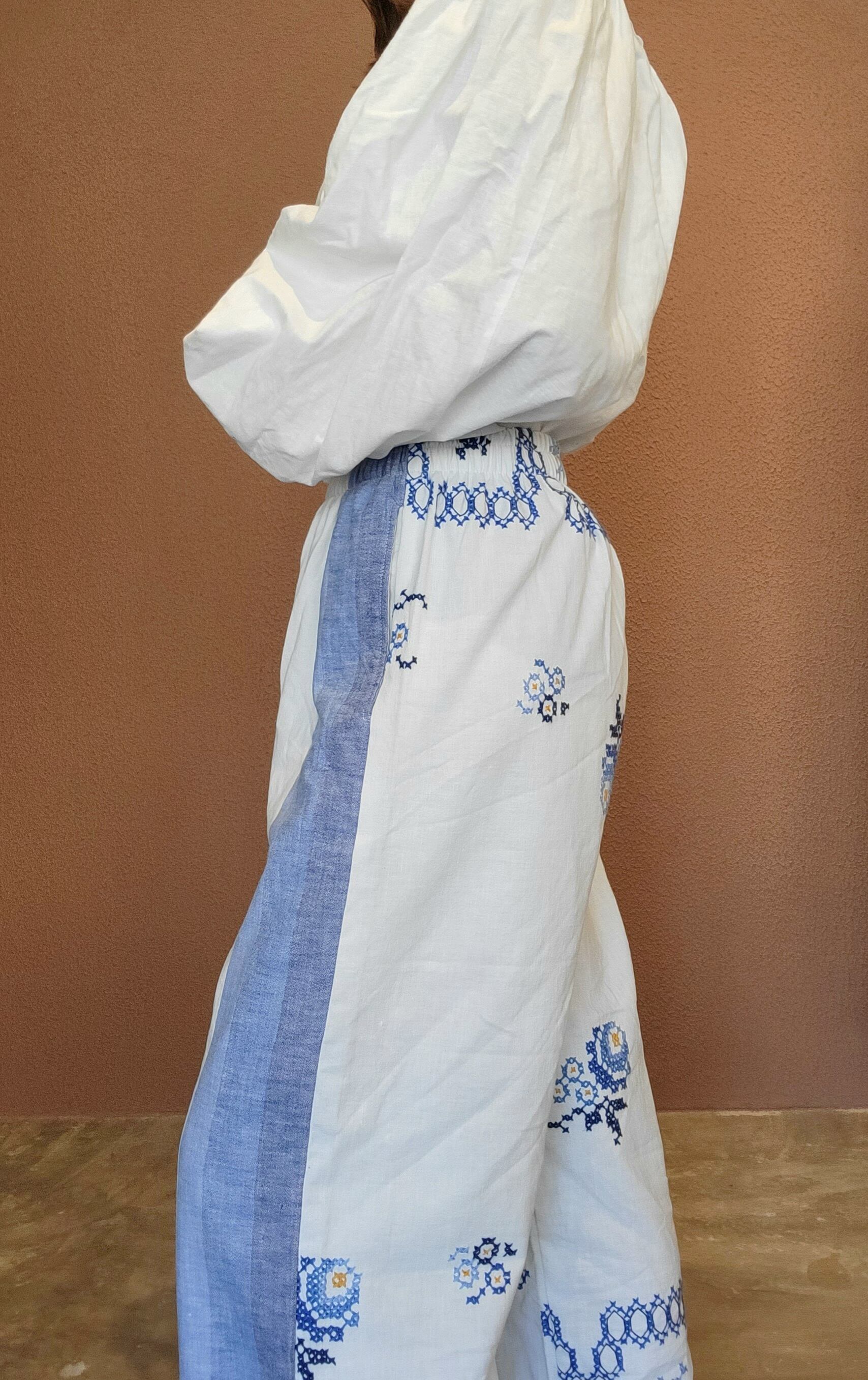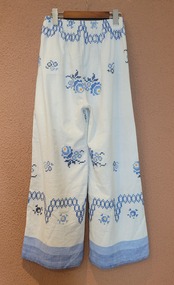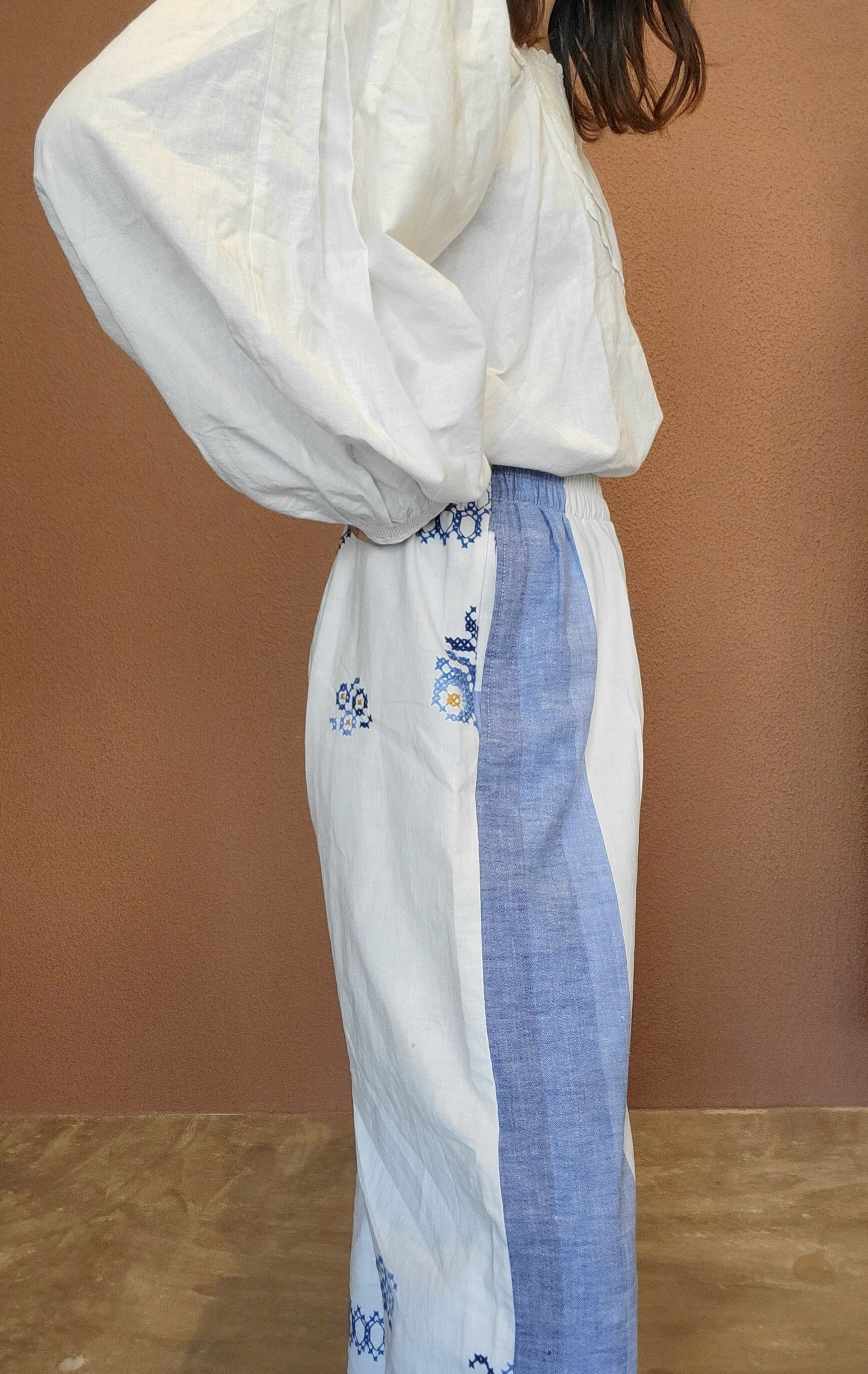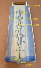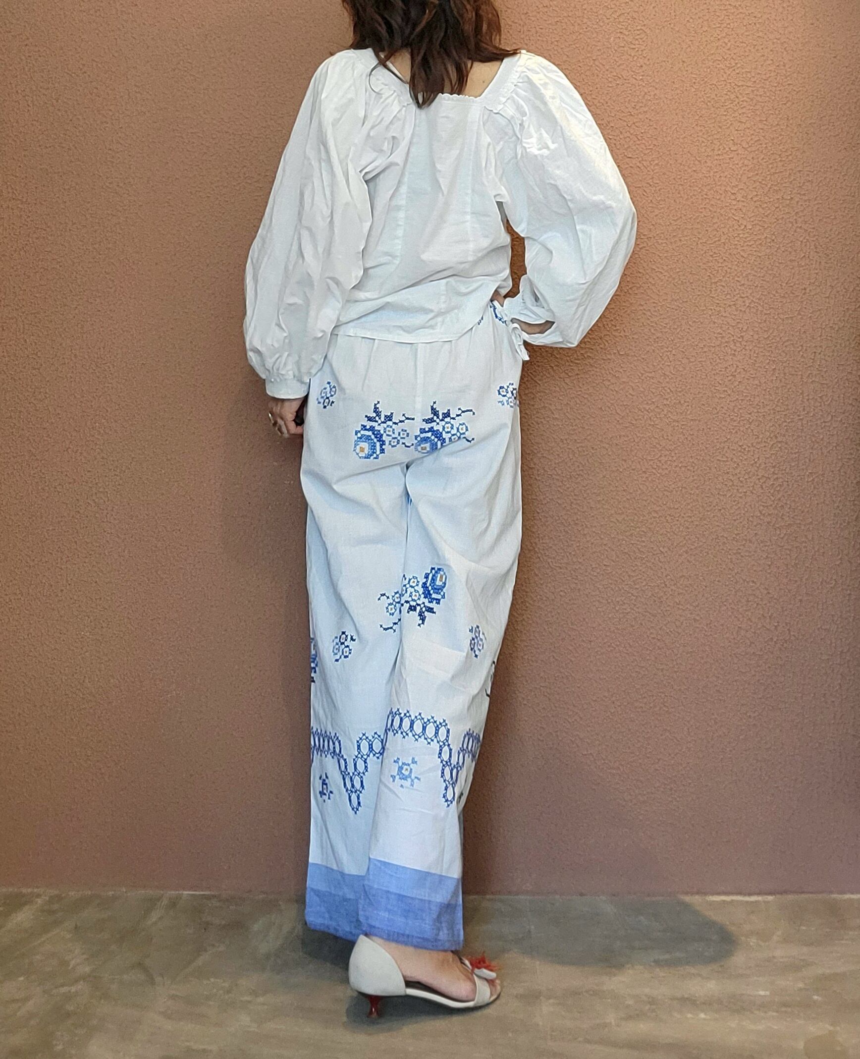 ヴィンテージの刺繍クロスを使用したリメイクイージーパンツ。素材表記はありませんがコットンのようです。ウエストゴム、左右シームポケット付き。ストレスフリーな履き心地は日常使いにぴったりです。