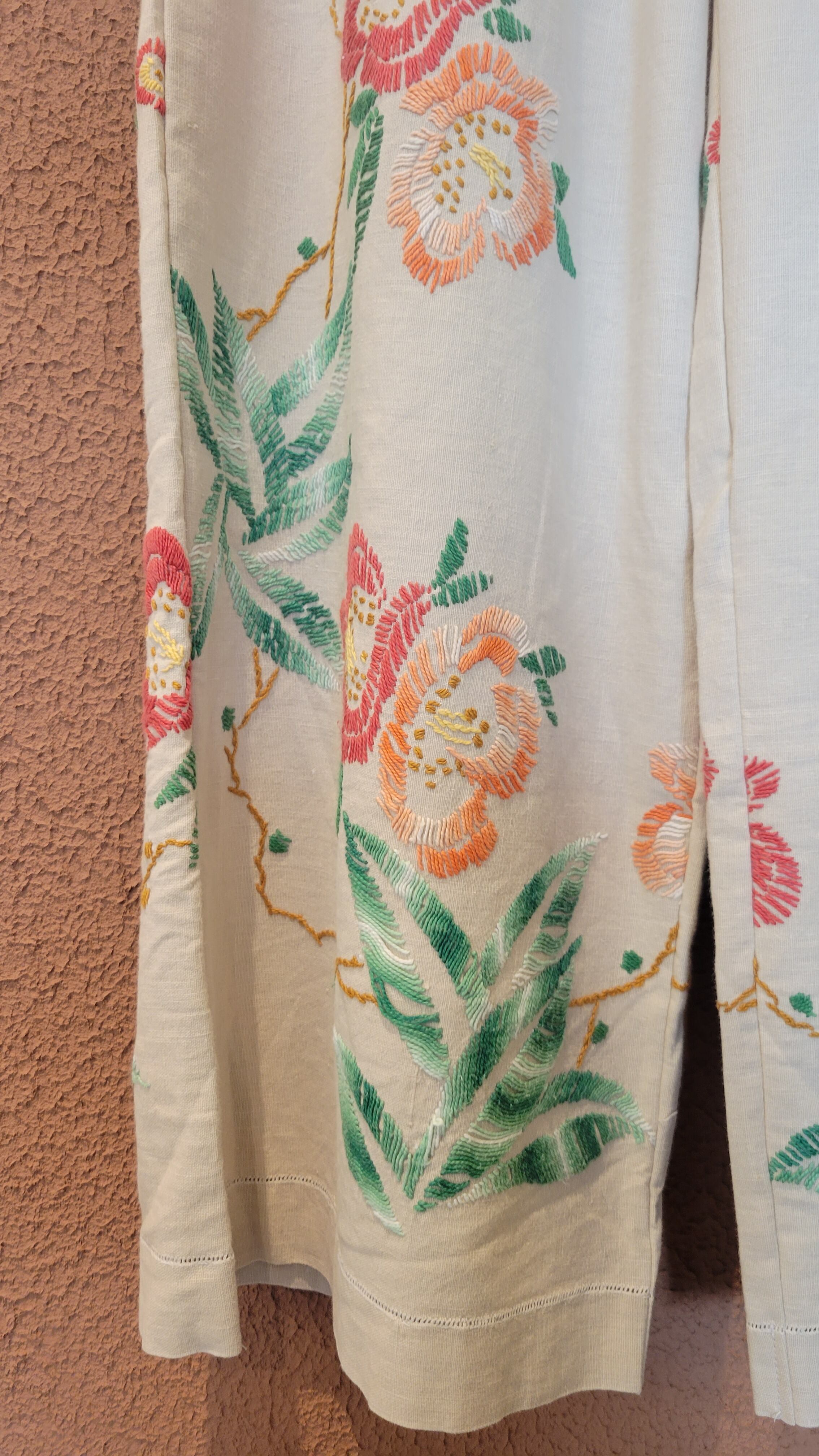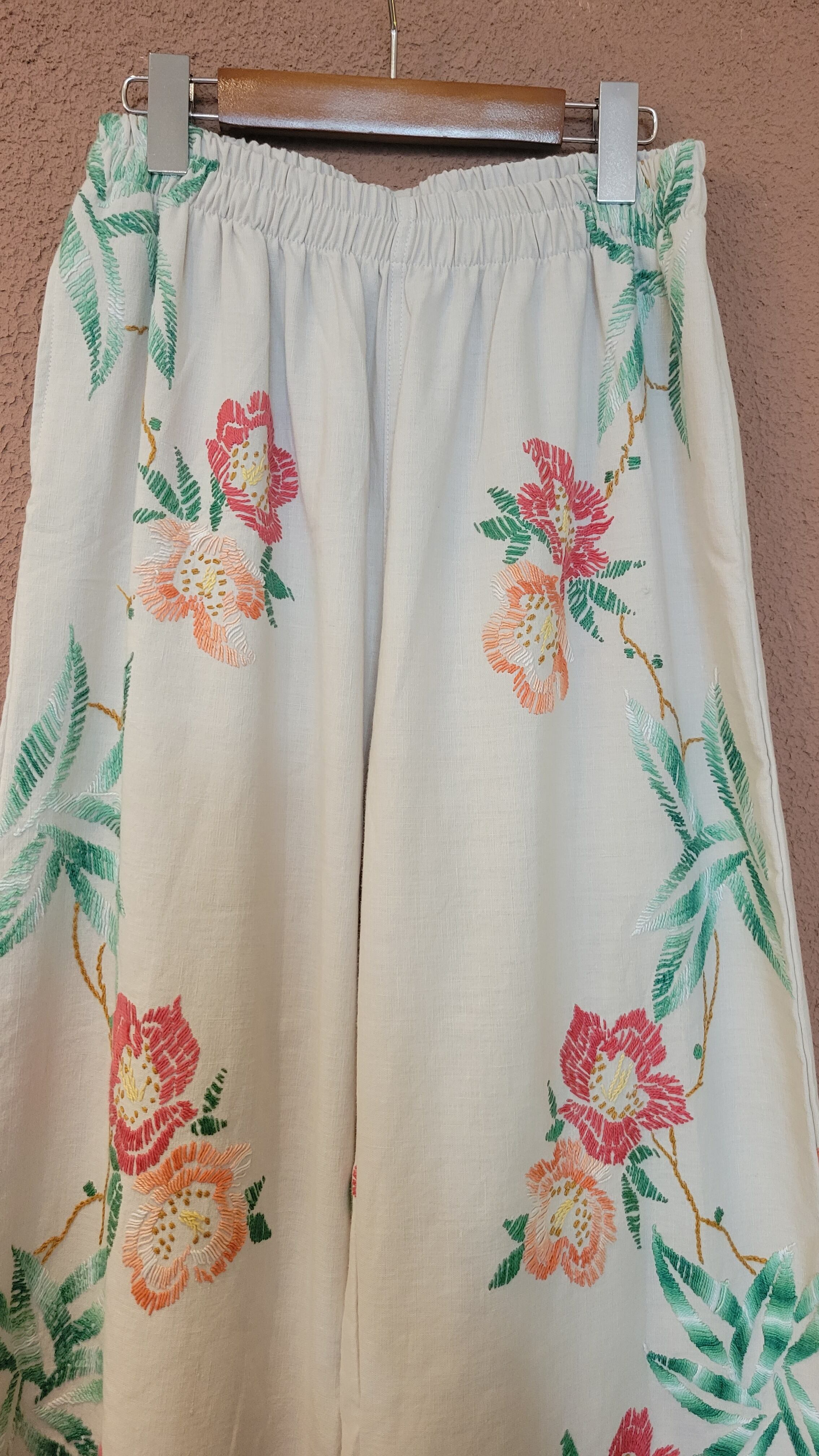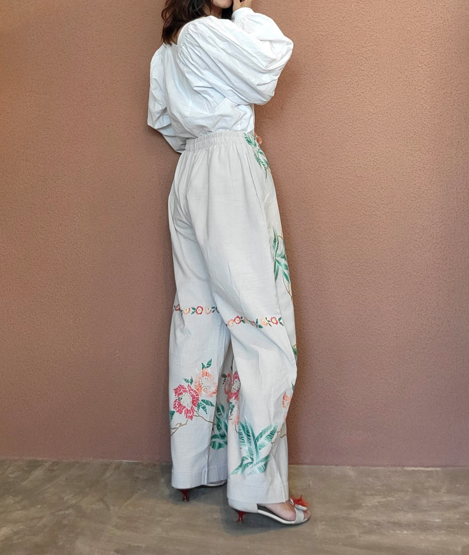 ヴィンテージの刺繍クロスを使用したリメイクイージーパンツ。素材表記はありませんがコットンとレーヨンの混紡のような素材感です。ウエストゴム、左右シームポケット付き。ストレスフリーな履き心地は日常使いにぴったりです。