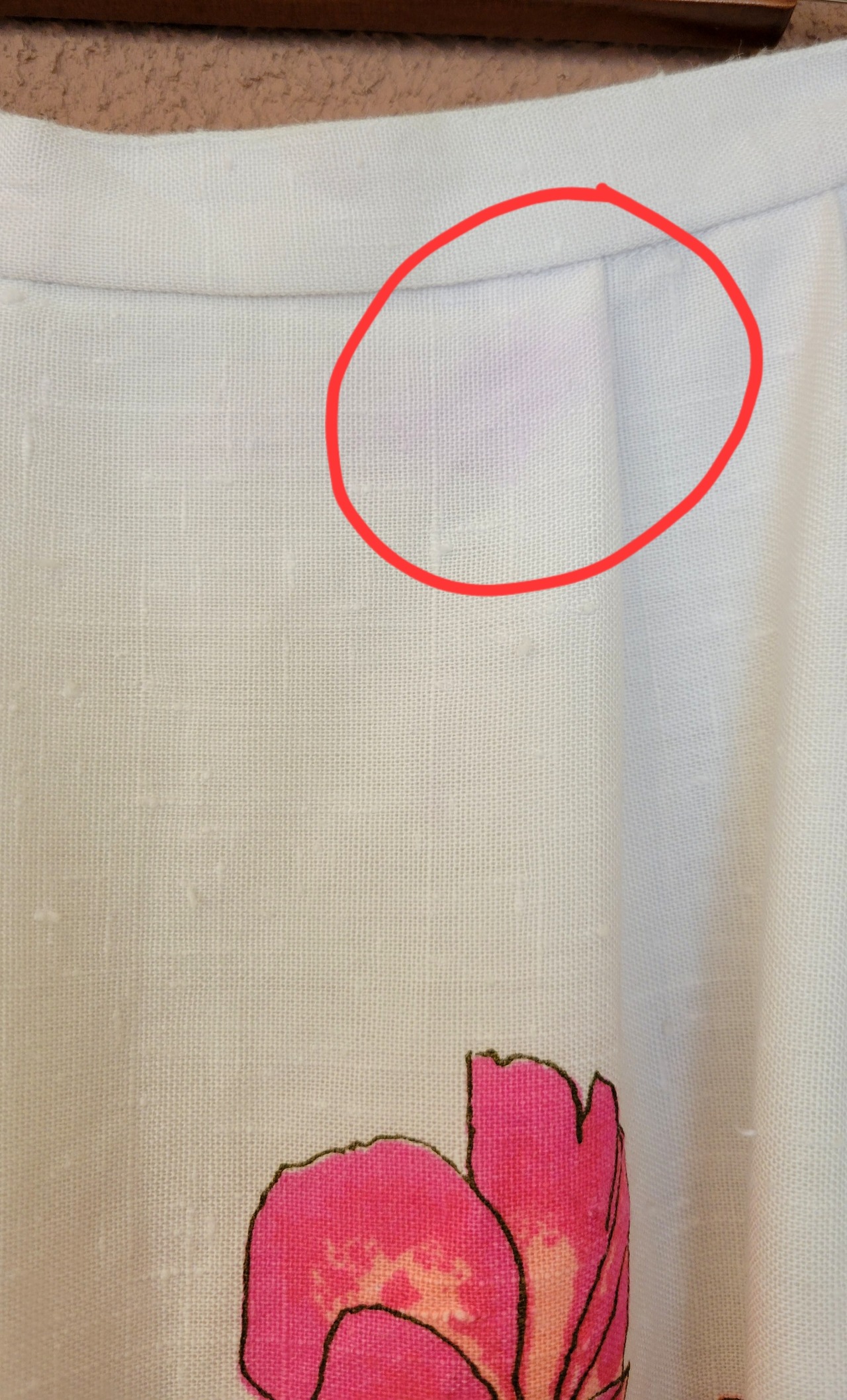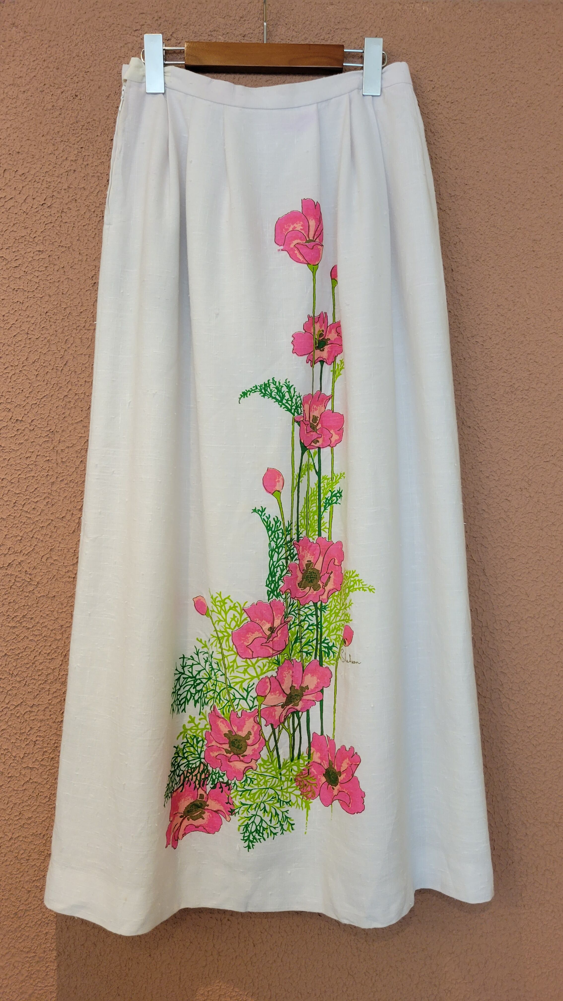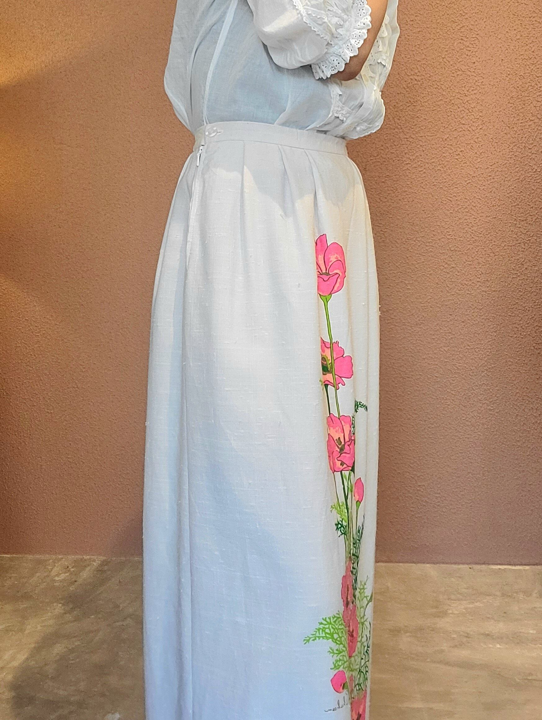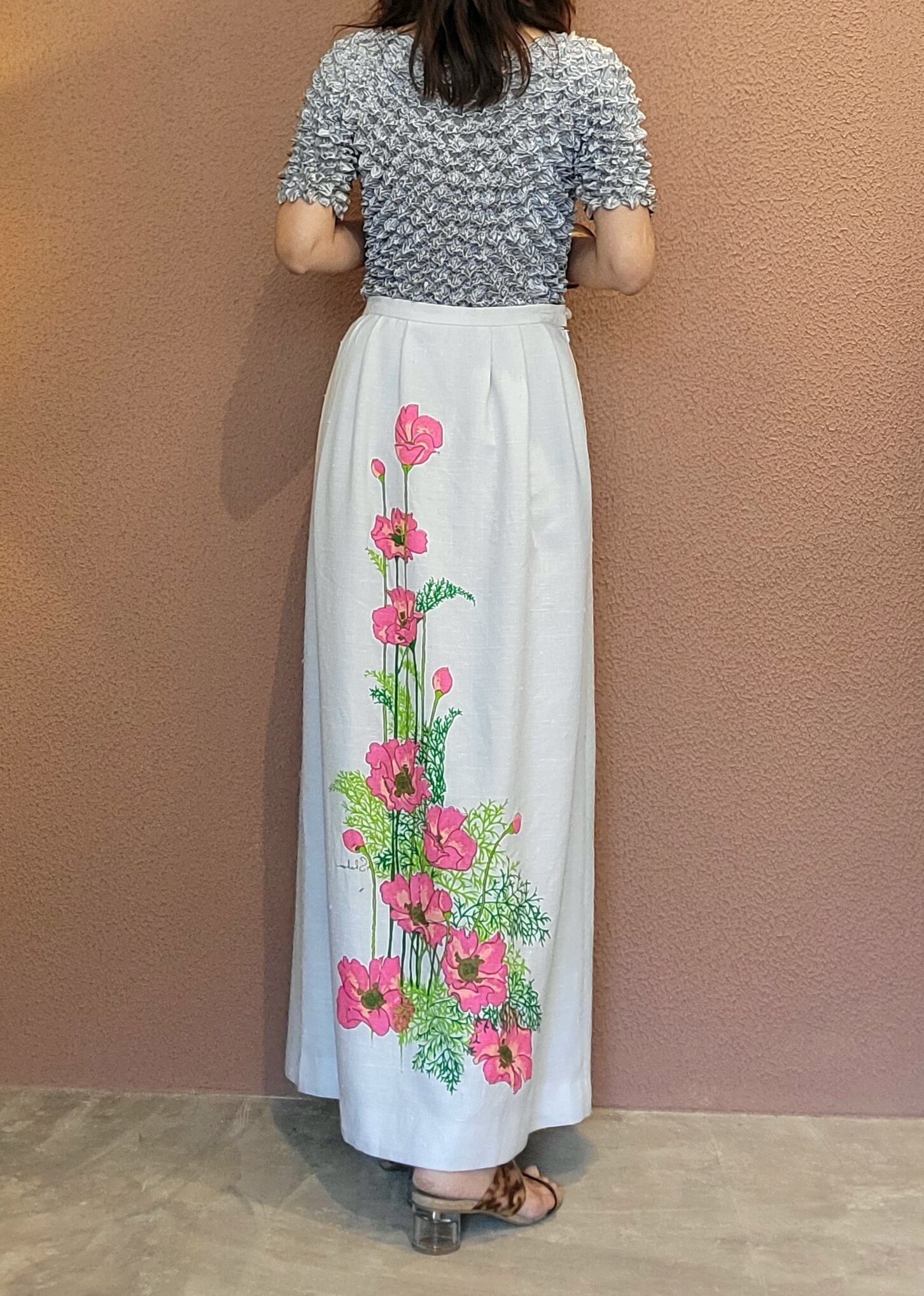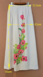 ヴィンテージのプリントマキシスカート。素材表記はありませんがリネンのようです。ネップがあります。ウエスト左にボタン1つとジッパー付き。裏地付きで透けません。白地にシンプルかつ大胆なお花のプリントが目を引く1枚。カジュアルにもドレスアップにも着用いただけます。*後ろのウエストベルト付近に色移りのような薄いシミがあります。画像でご確認ください。