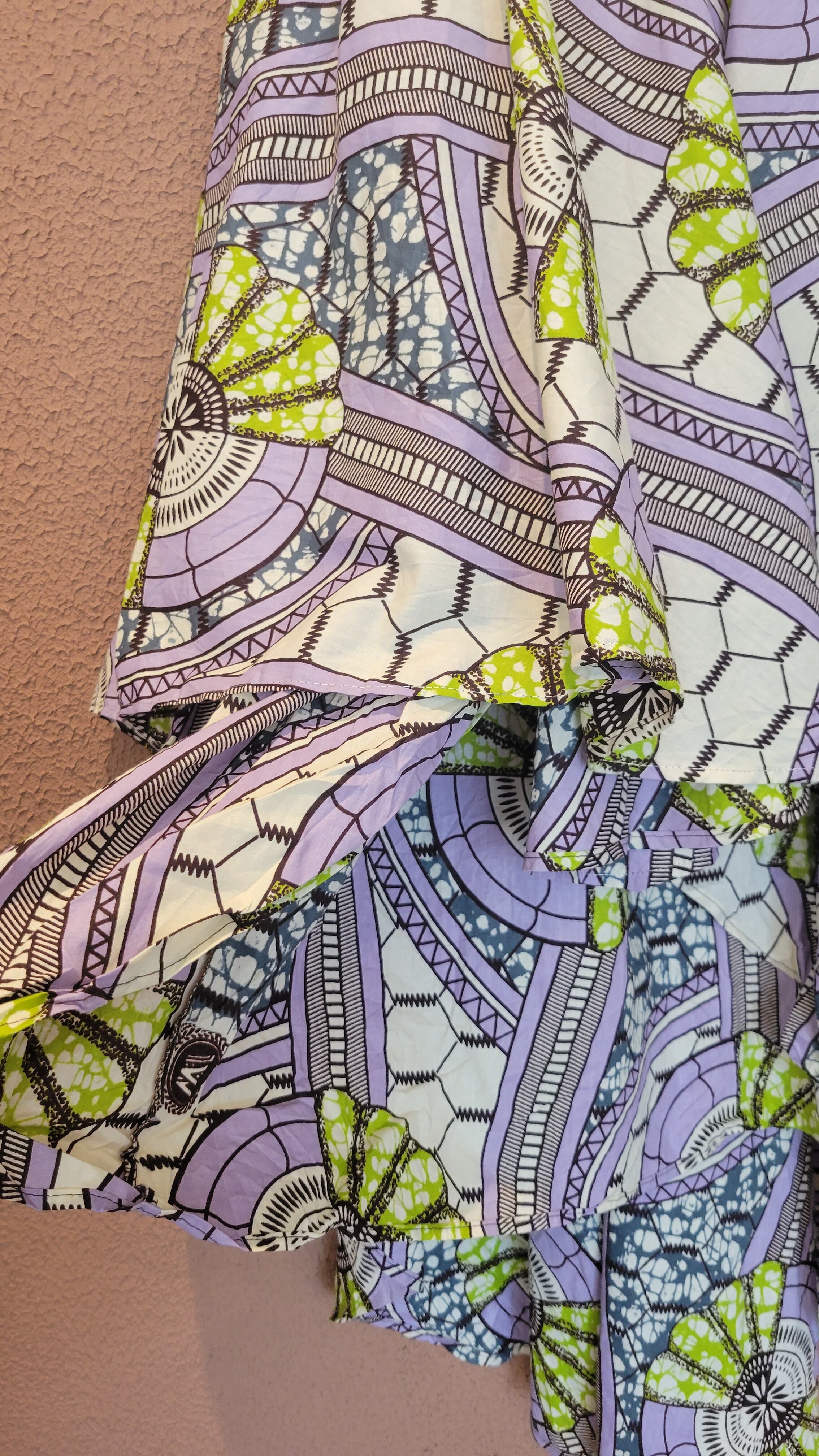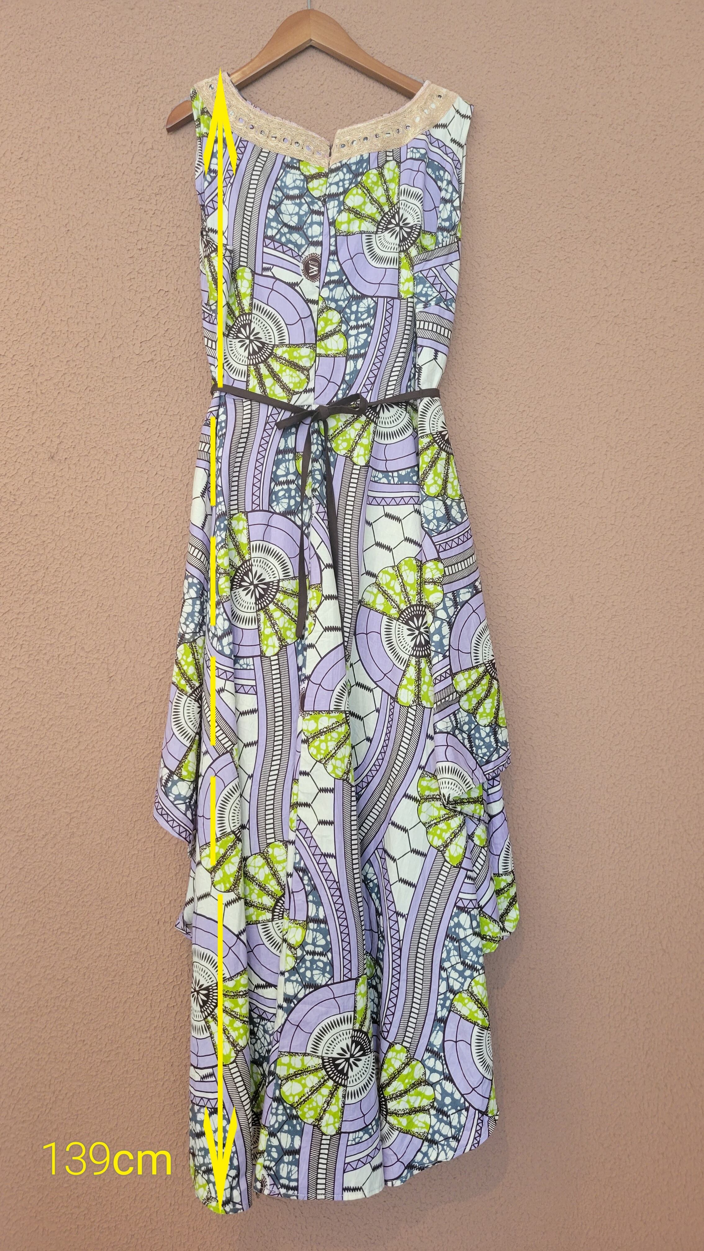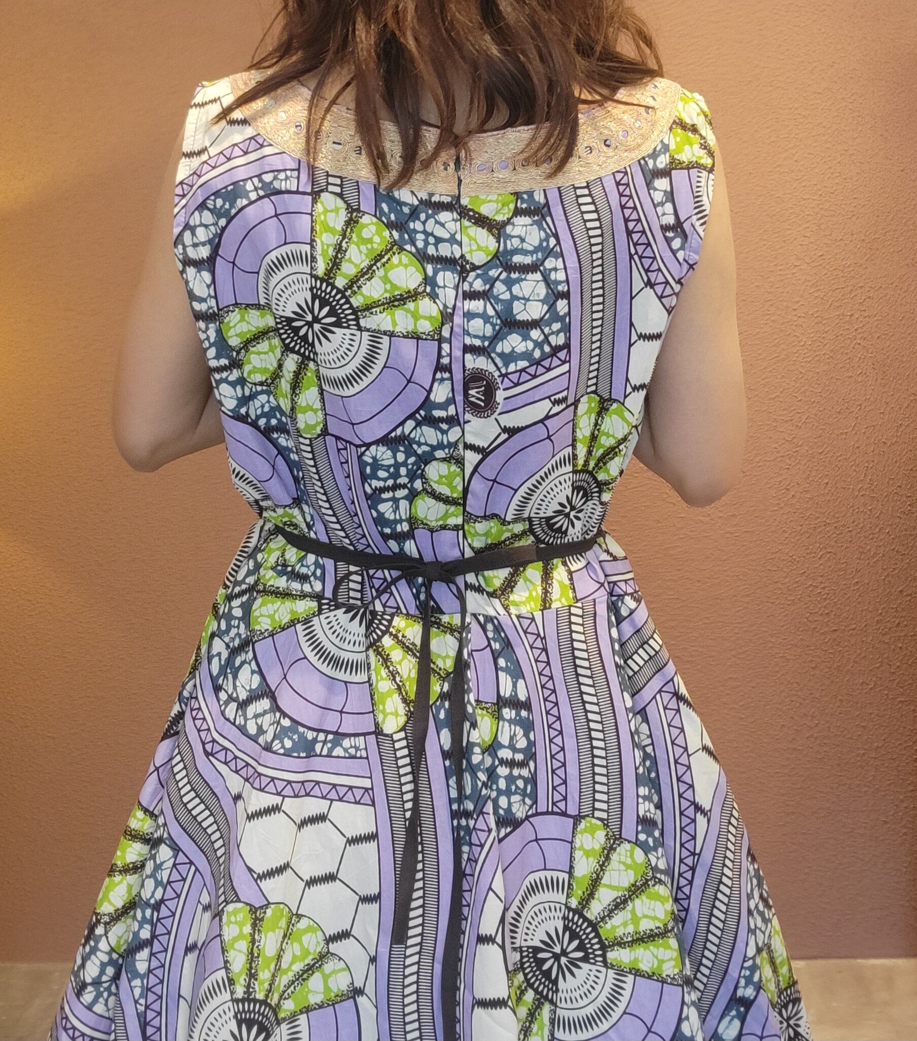 ヴィンテージのアフリカンバティックワンピース。素材表記はありませんがコットンです。バックファスナー付き。大きめサイズですがウエストリボンである程度身幅の調整が可能です。スカート部分はフロントからバックにかけて長くなるアシンメトリーデザイン。生地をたっぷり使用したボリュームあるフレアのレイヤードがとても華やかです。