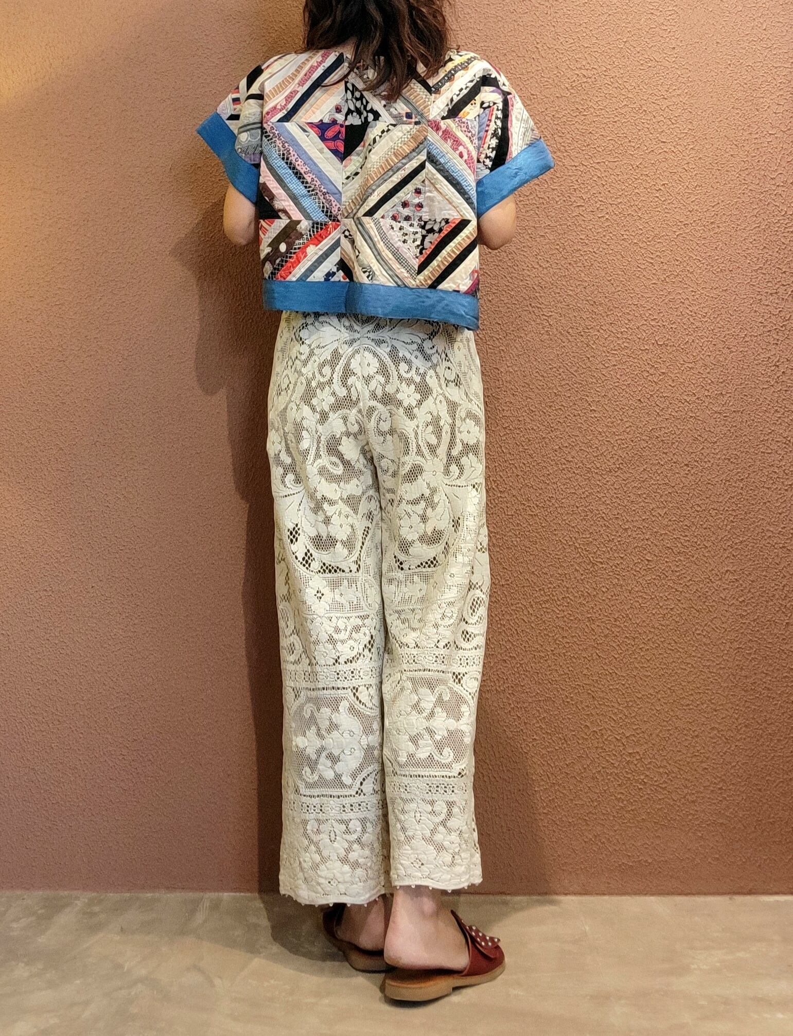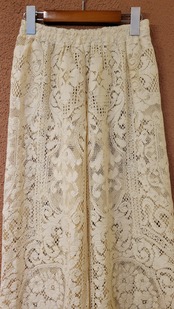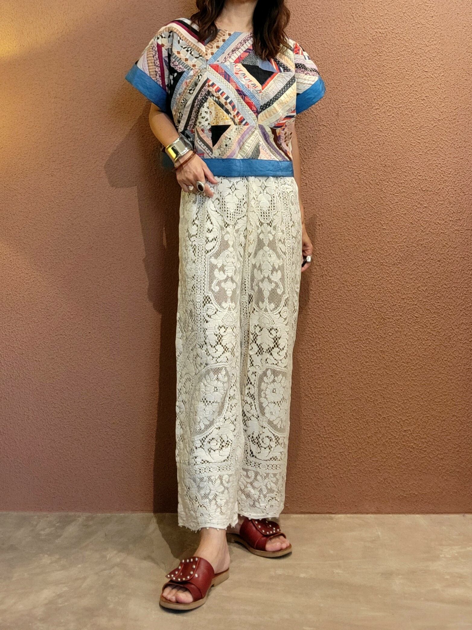 ヴィンテージレースを使用したリメイクイージーパンツ。ウエストゴム、裏地は付いていません。着画は中に薄手のレギンスパンツをペチコート代わりに履いています。ほどよい丈感で気負わずカジュアルに履けるイージーパンツです。