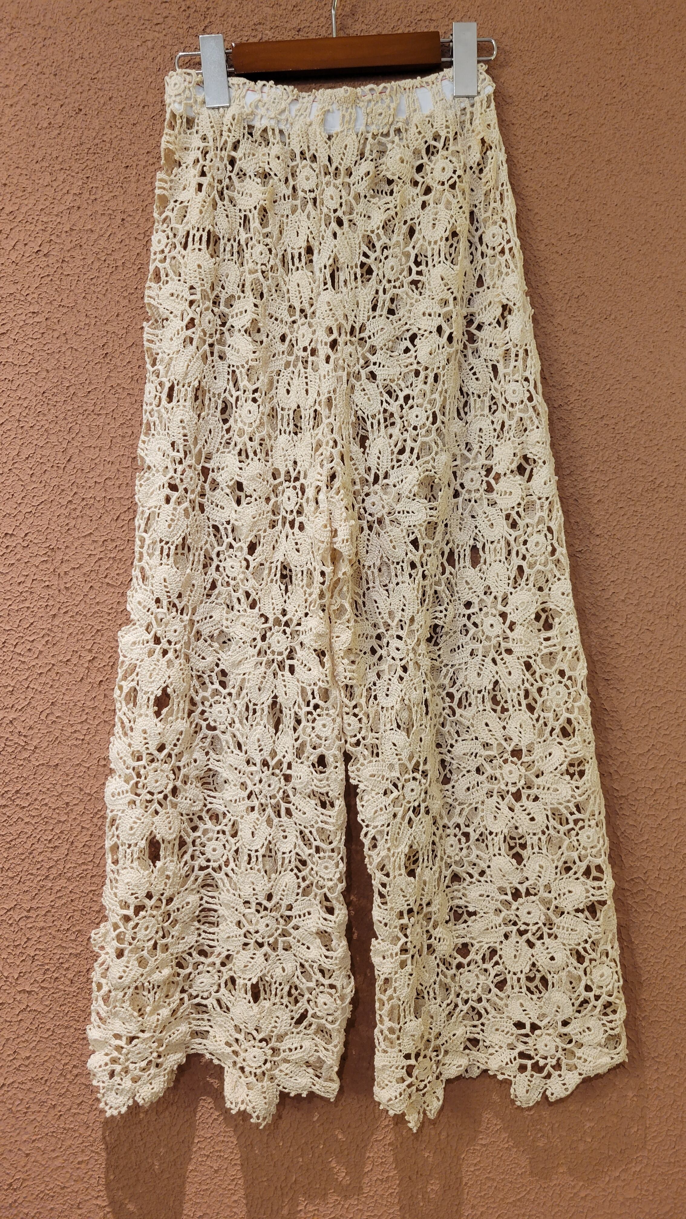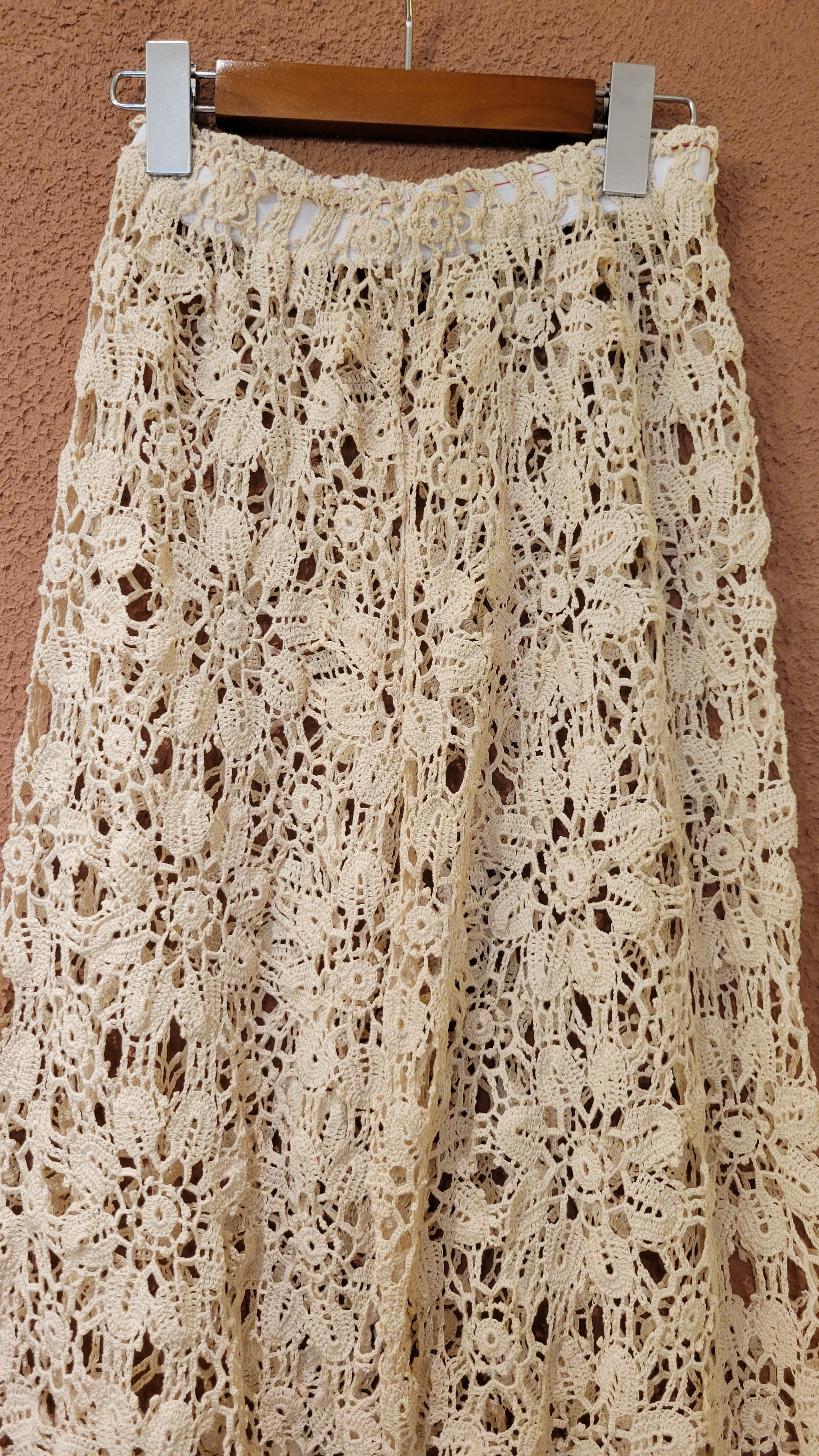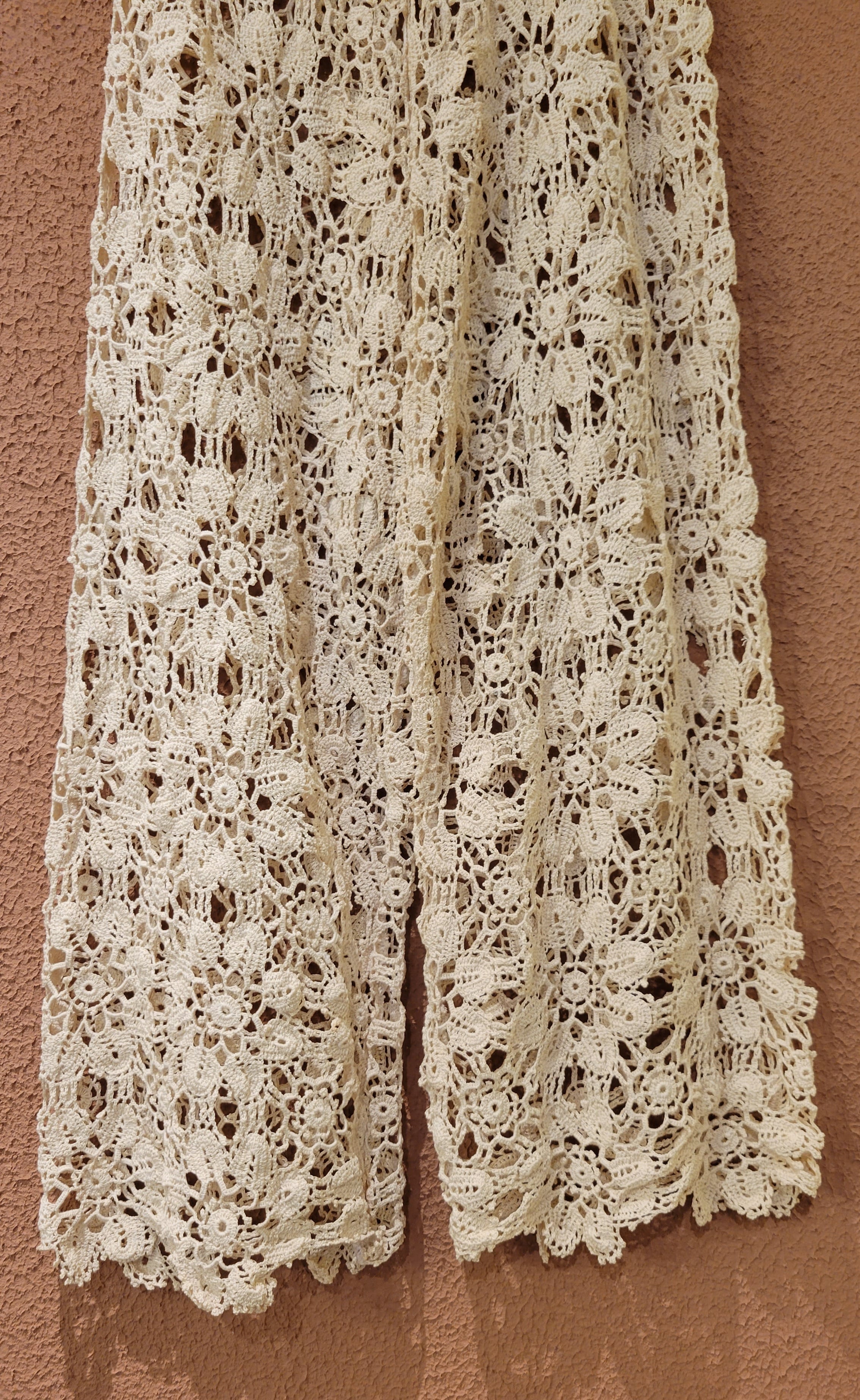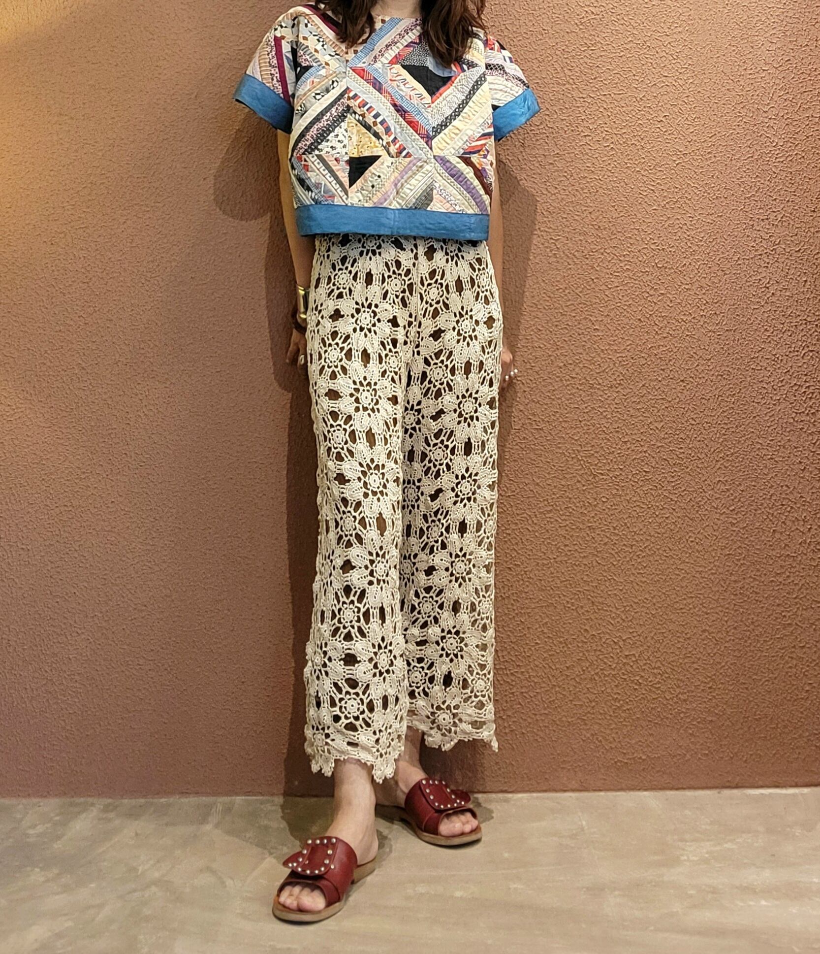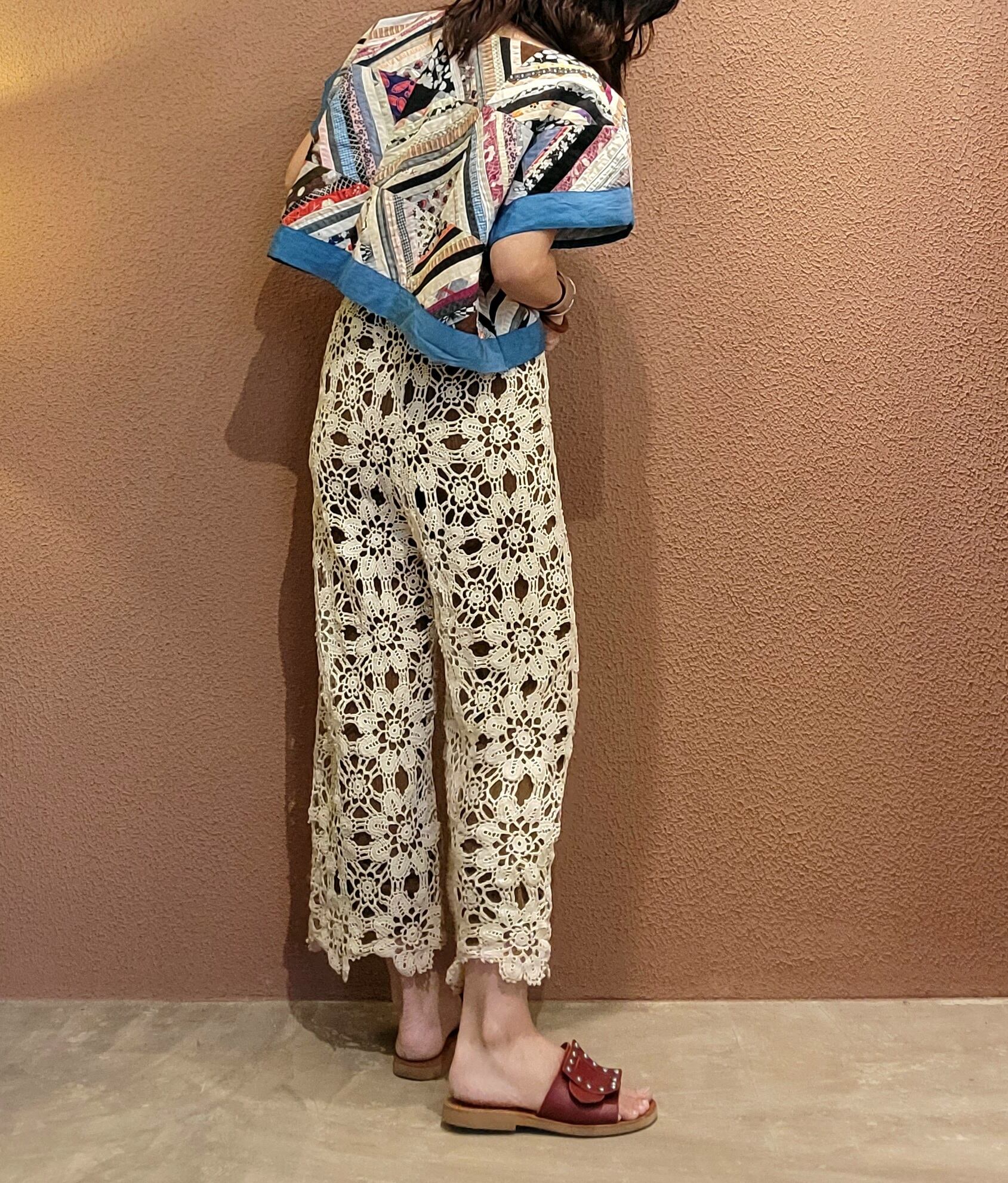 ヴィンテージクロシェを使用したリメイクイージーパンツ。ウエストゴム、裏地は付いていません。着画は中に薄手のレギンスパンツをペチコート代わりに履いています。ほどよい丈感で気負わずカジュアルに履けるクロシェパンツです。