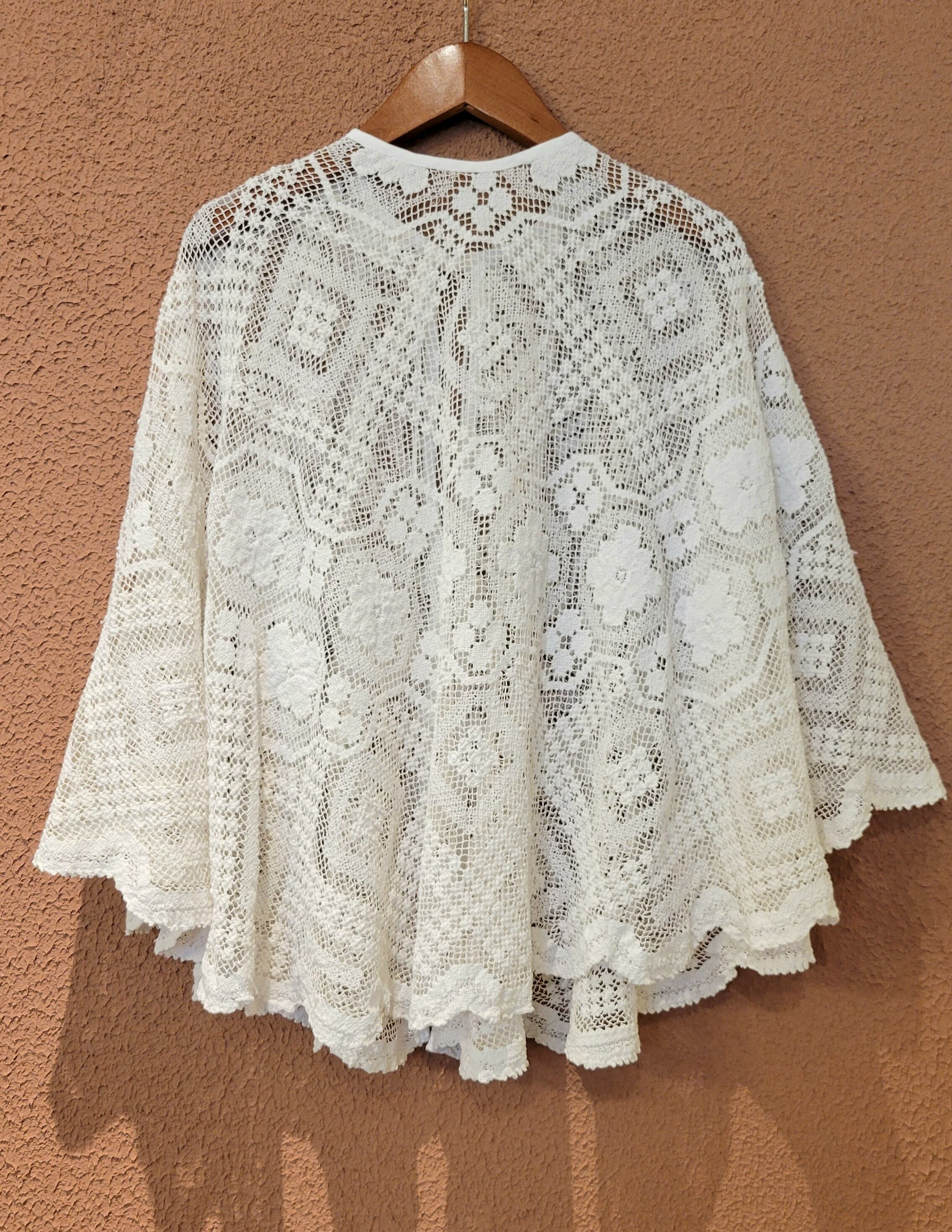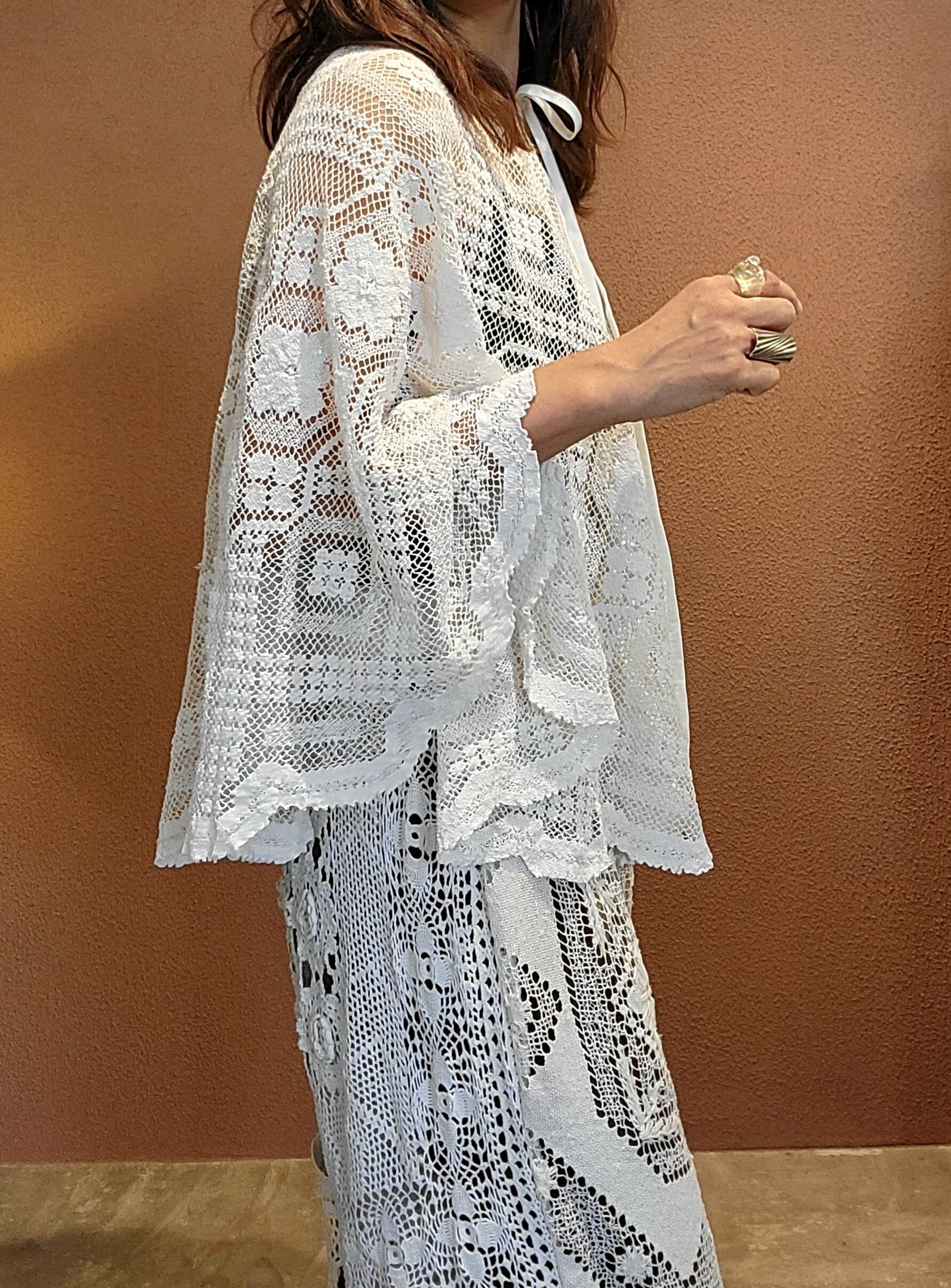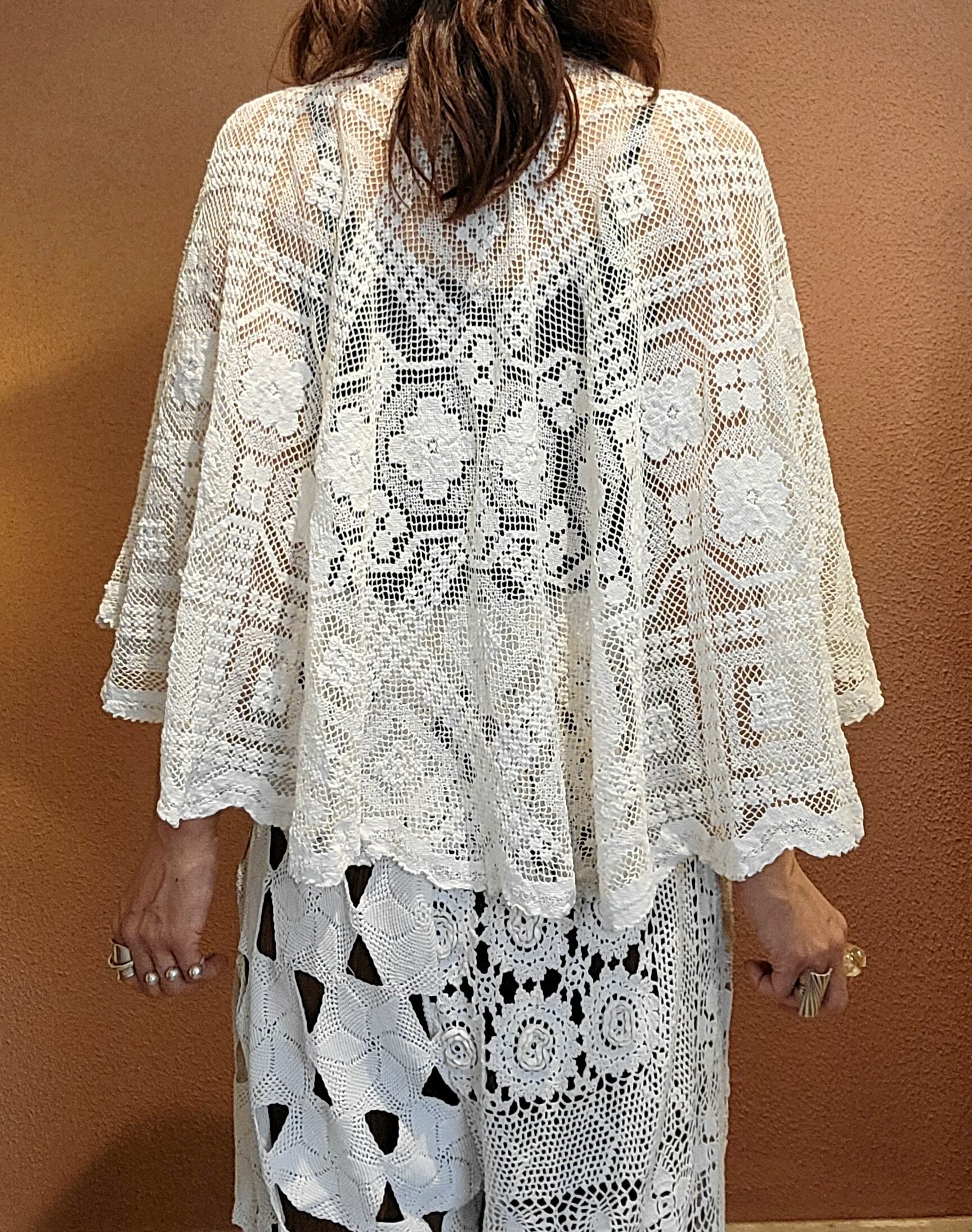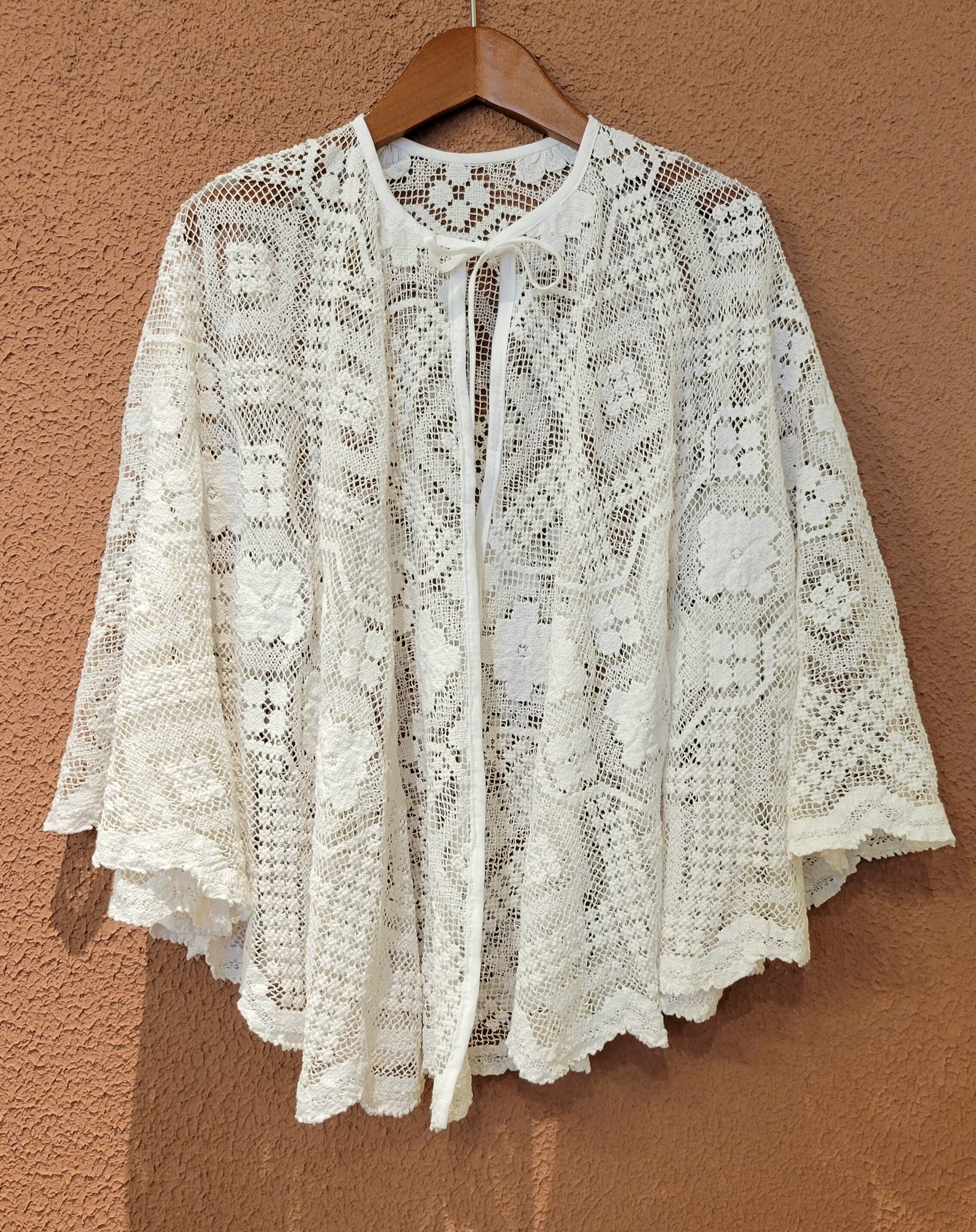 ヴィンテージのコットンレースを使用したリメイクケープ。シンプルなトップスやワンピースにさっと羽織るだけできれいめスタイリングが叶う便利なアイテムです。