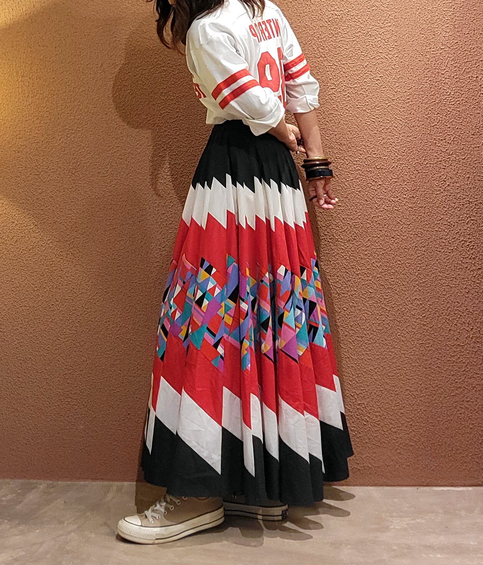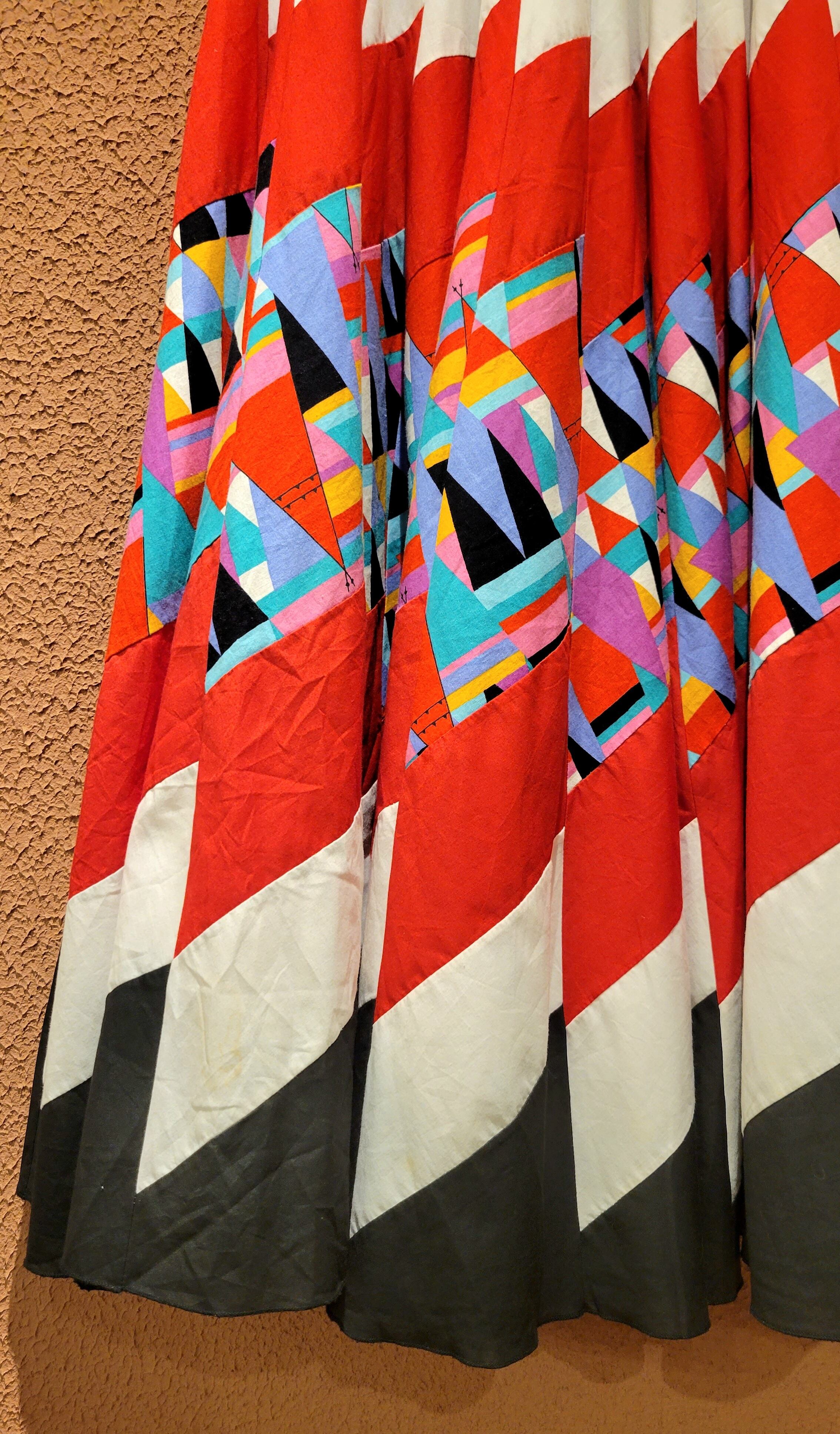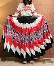 非常に凝った作りの43枚はぎのヴィンテージパッチワークスカート。43枚もの布片を縫い合わせたボリュームたっぷりのサーキュラースカートです。スカートを構成する43枚の布片の1枚をとってみてもパッチワークが施されていたりと大変手の込んだ作りとなっております。一点ものスペシャルピースです。