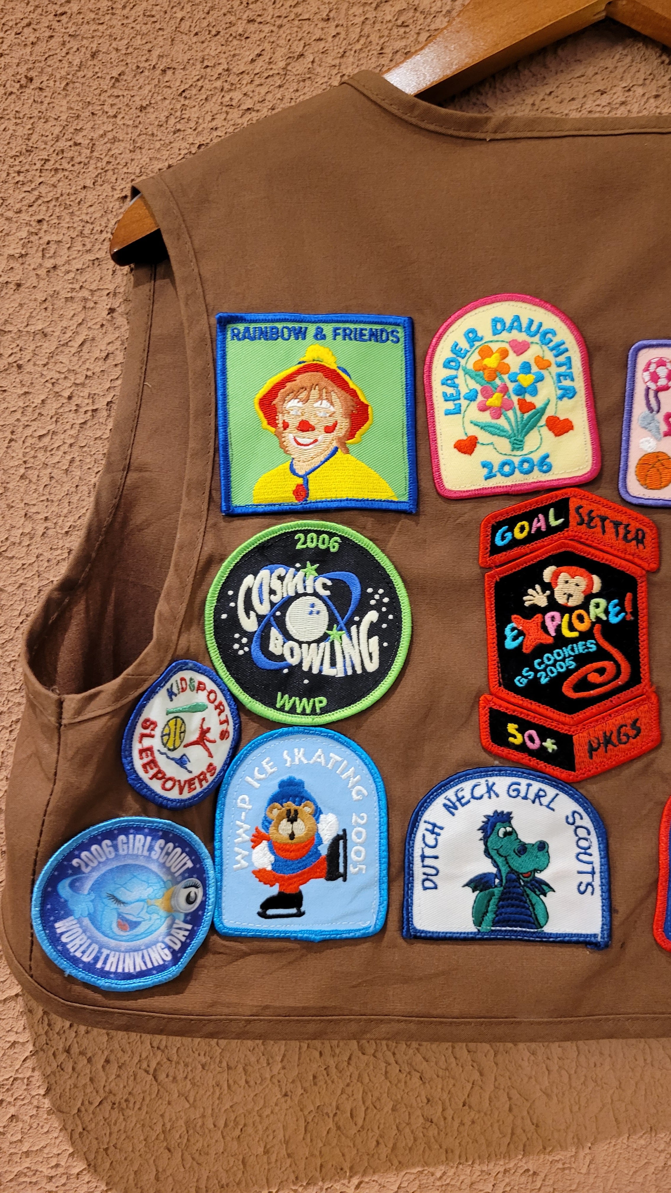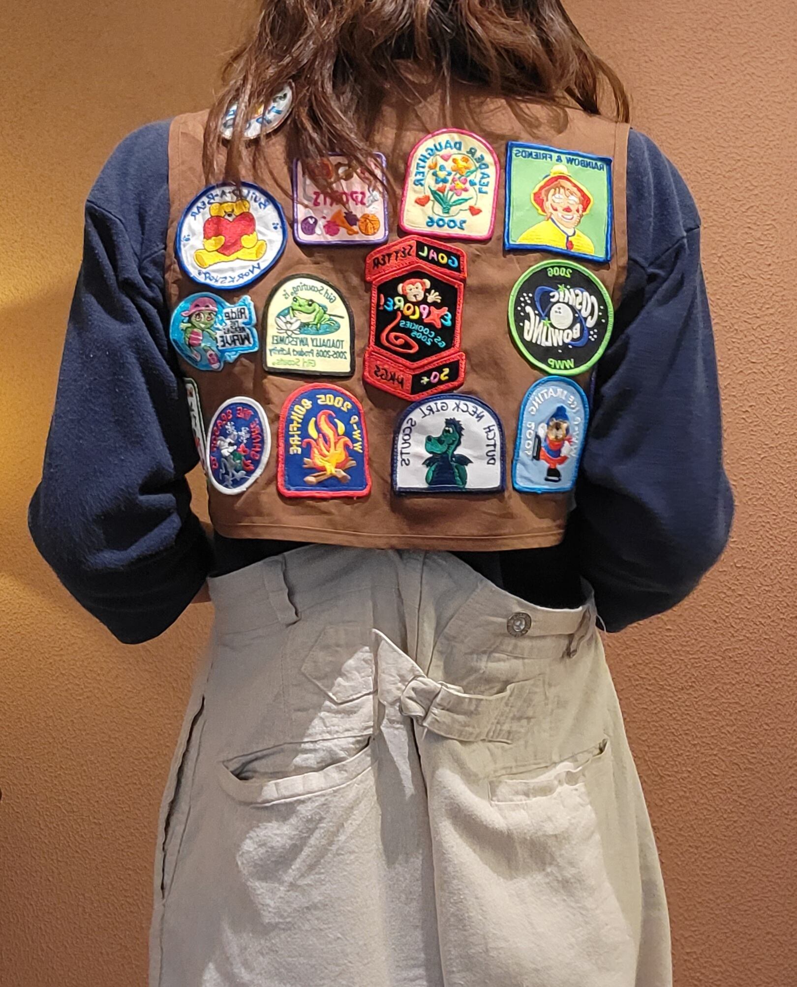 USA ガールスカウトベスト。素材表記はありませんがコットンとポリエステルの混紡のようです。ショート丈、コンパクトなサイズにびっしりワッペンがスペシャルな1枚。スタイリングが物足りない時のプラスワンアイテムにも。