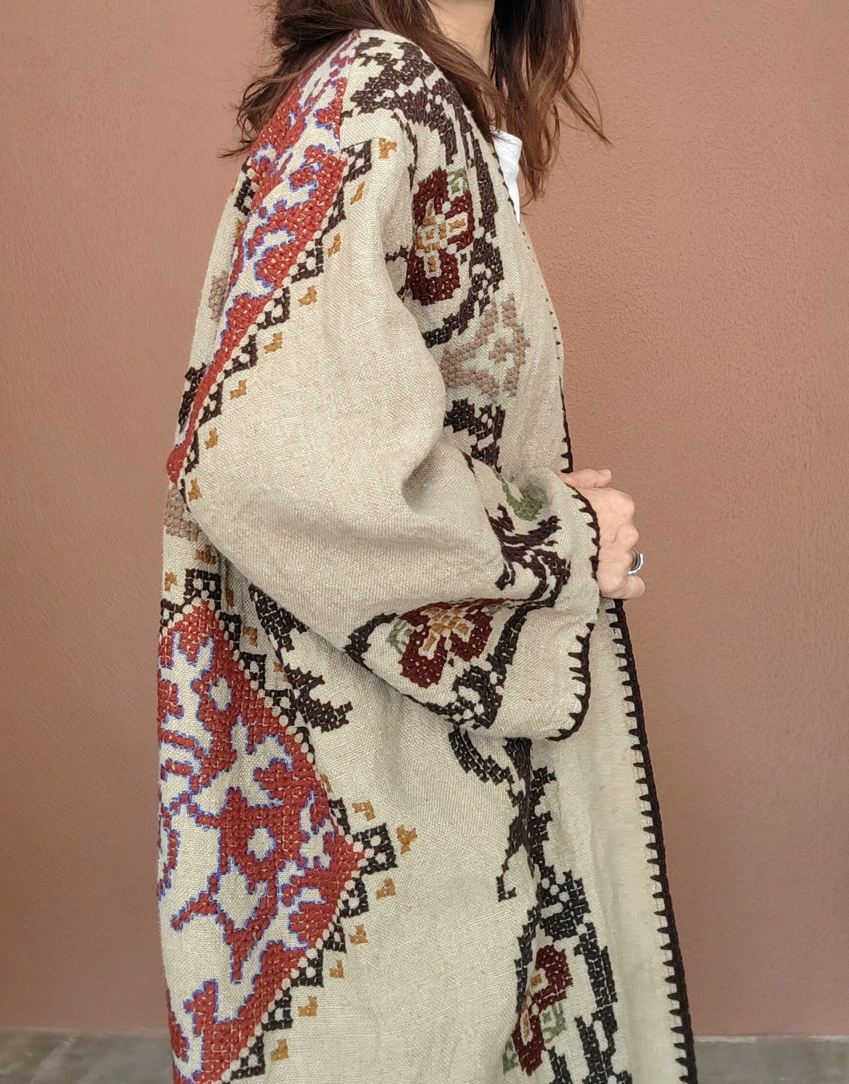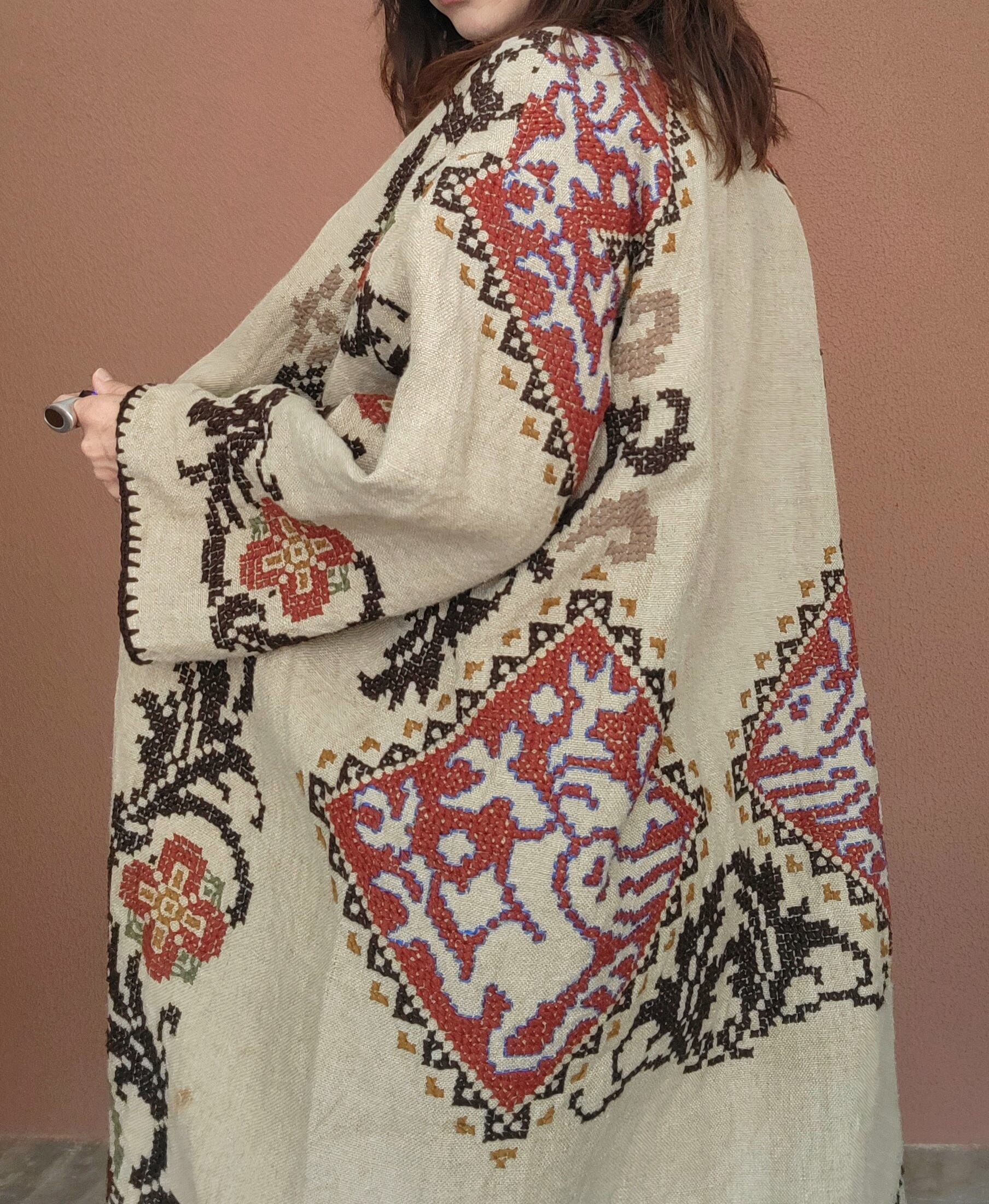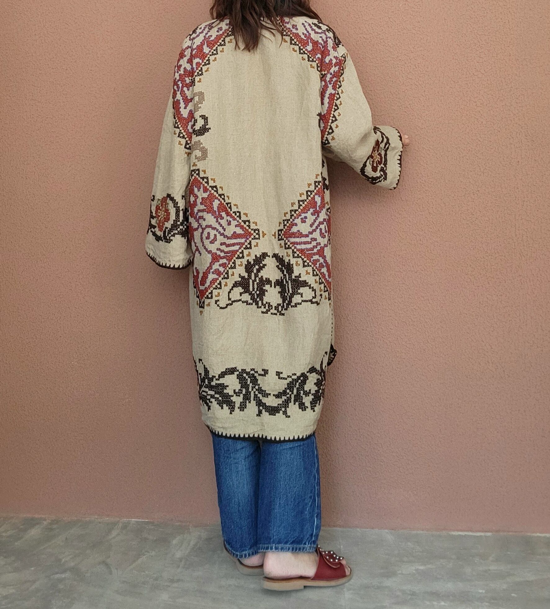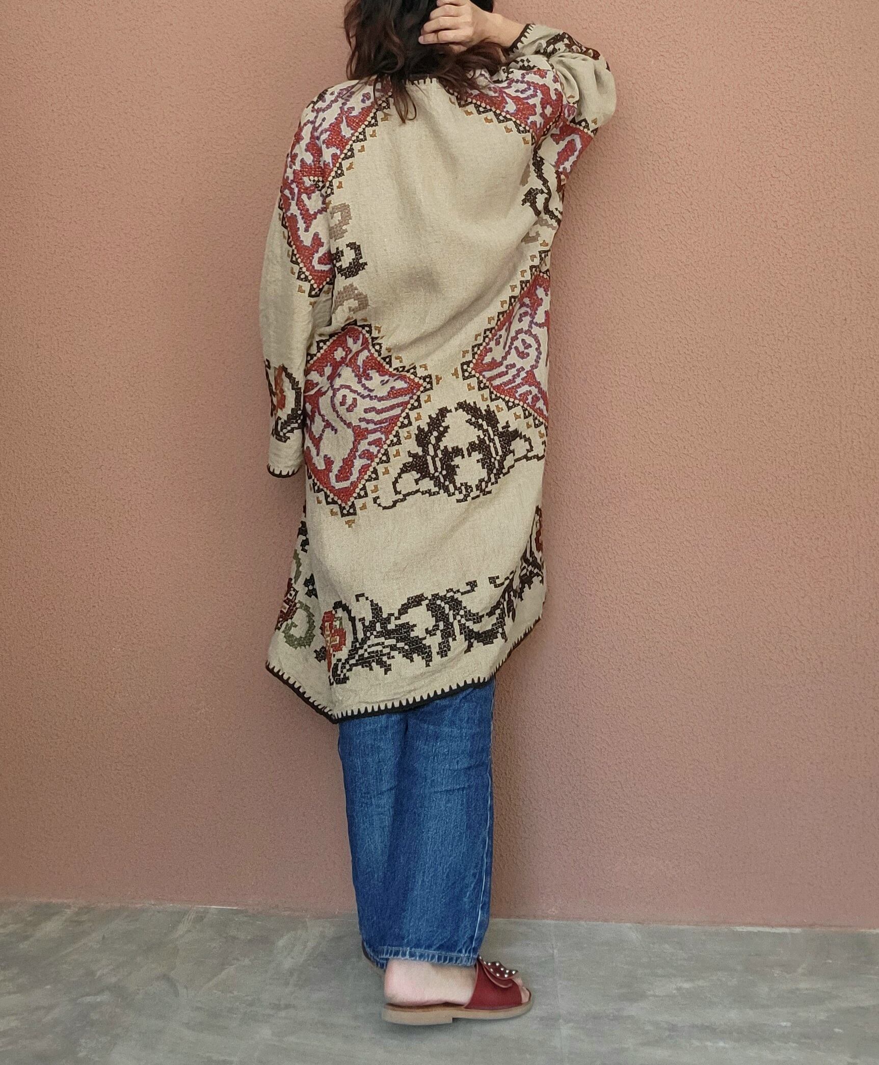 ヴィンテージの刺繍クロスを使用したリメイクガウン。素材表記はありませんがリネンです。ざっくりしたリネンの素材感に肉厚な手刺繍がスペシャルな1着。渋めのカラーは男女問わず着用いただけます。晩夏から初秋まで活躍するオープンガウンです。