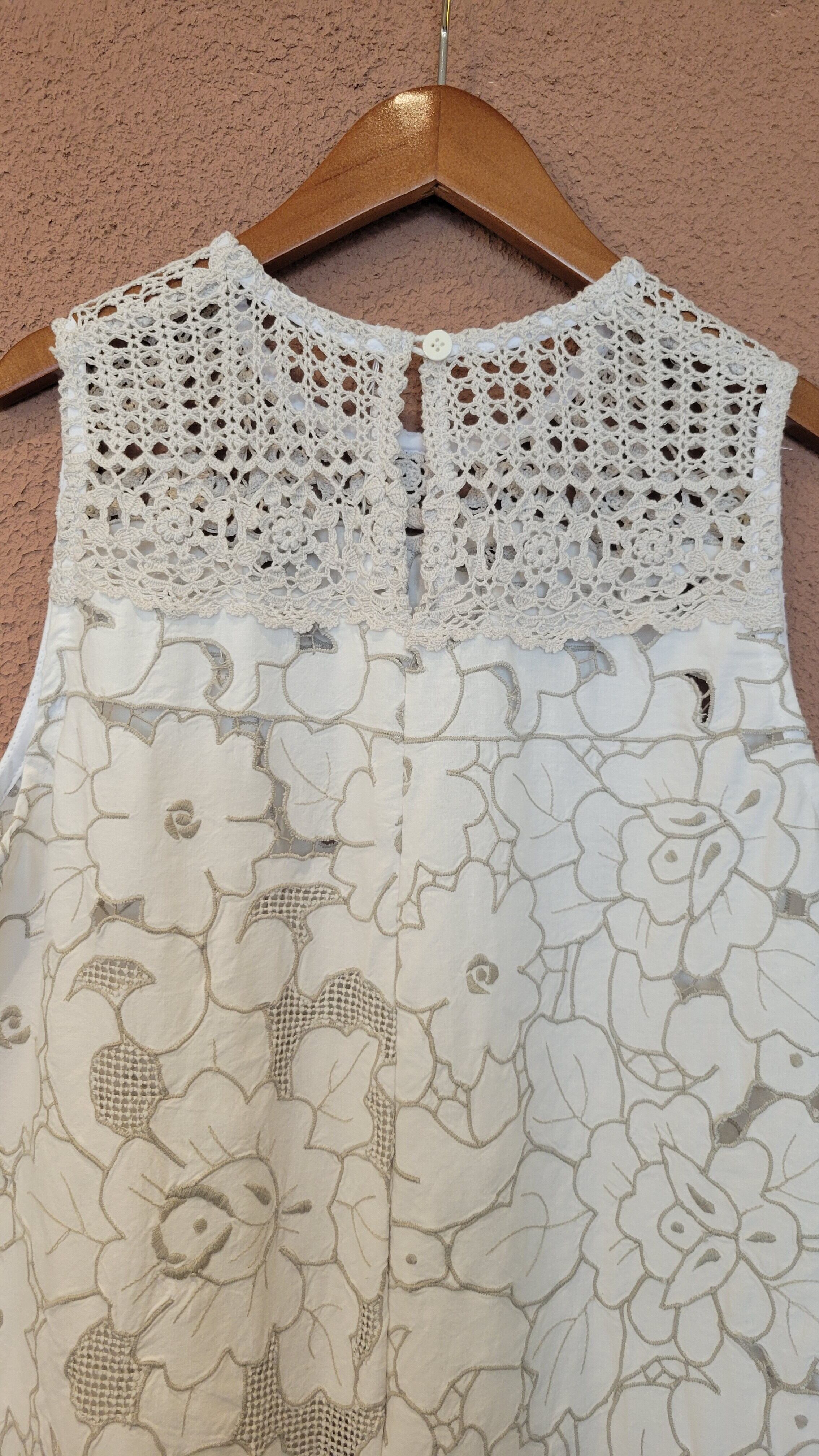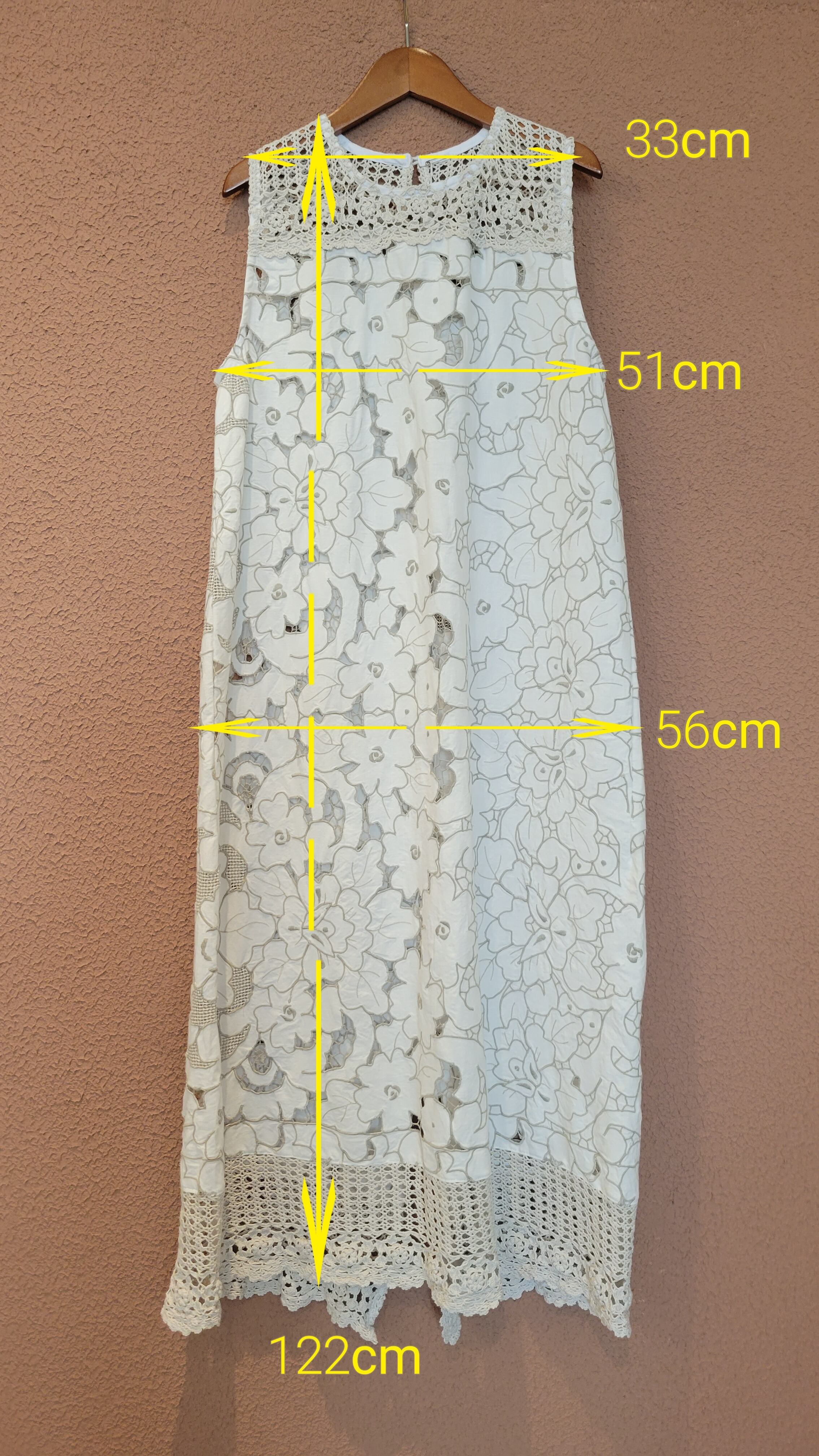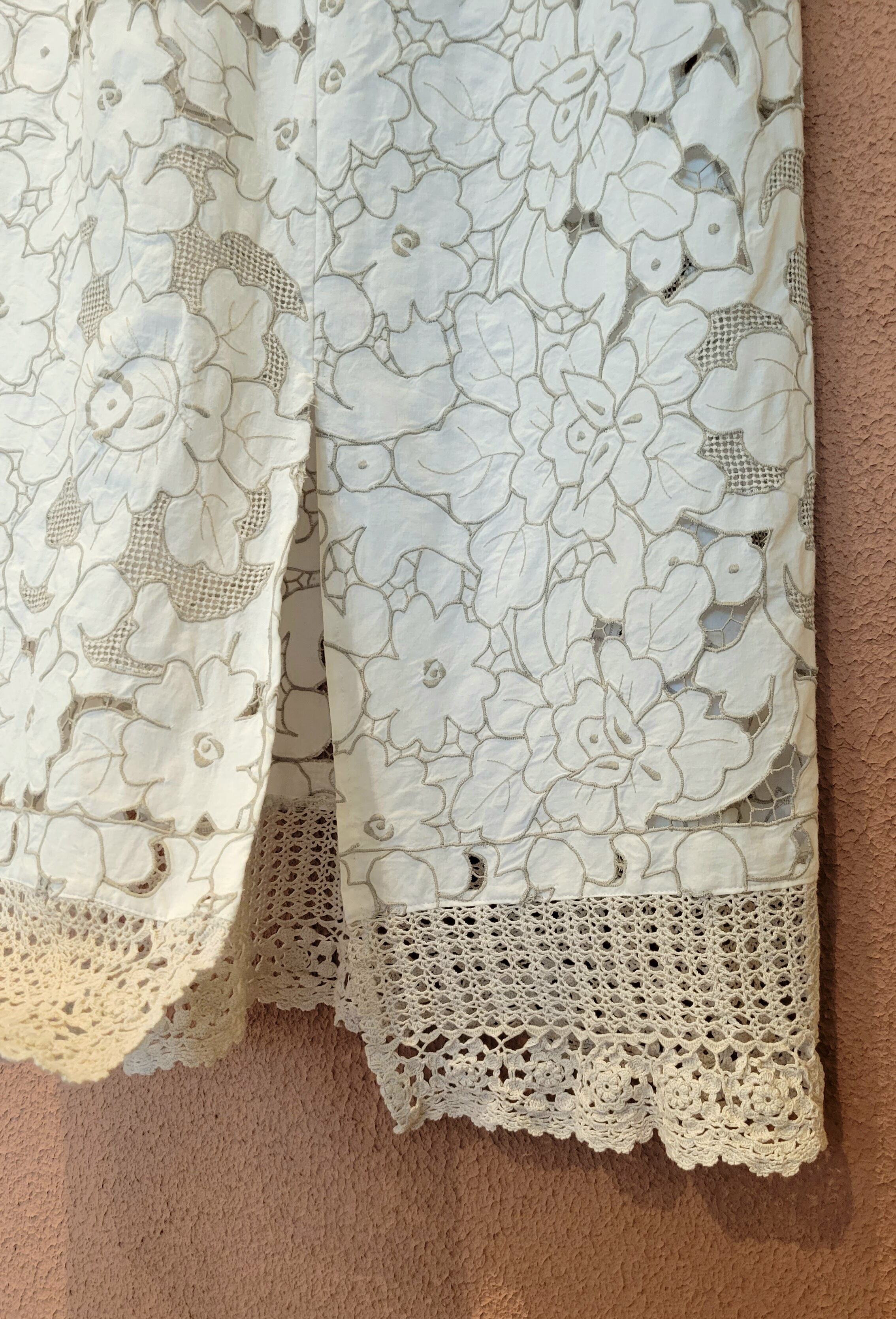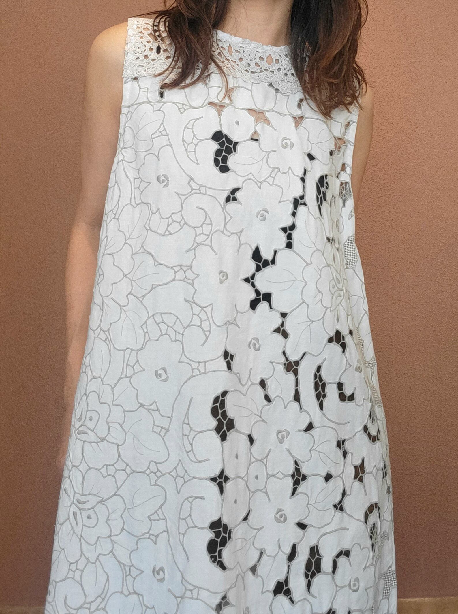 ヴィンテージのカットワーク刺繍クロスを使用したリメイクワンピース。素材表記はありませんがコットンです。しっかりした張り感があり着用時にもきれいなAラインシルエットをキープ。ファスナーは付いておらず首後ろにボタンがひとつ付いています。デコルテと背中周り、裾にヴィンテージクロシェがあしらわれ、身ごろの右半分と左半分でカットワーク刺繍とカットワークレースが使い分けられており、大変表情豊かな1枚となっています。