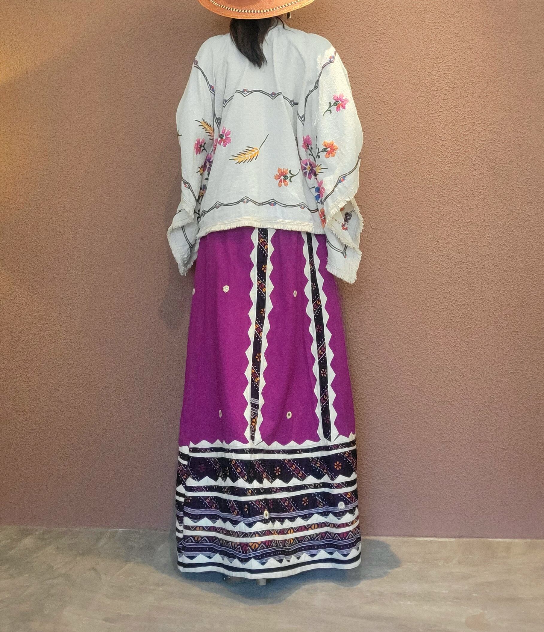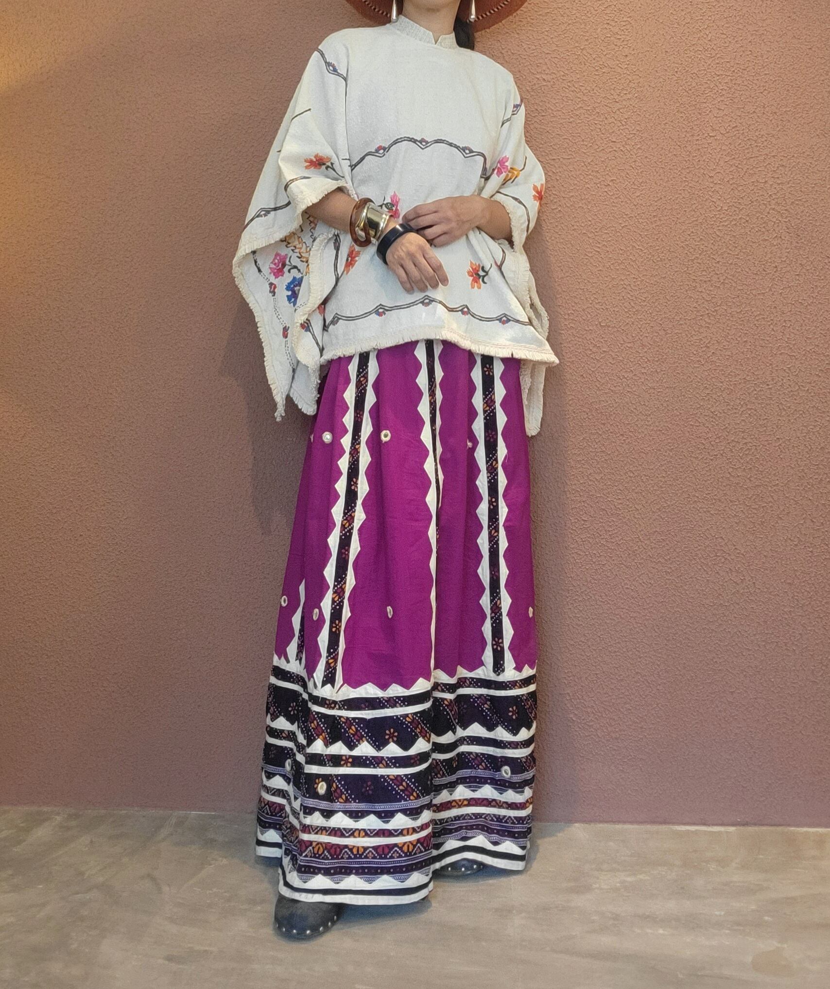 ヴィンテージの刺繍クロスを使用したリメイクトップス。素材表記はありませんがコットンのようです。ざっくりした素材感です。華やかなお花の刺繍とフリンジでエスニックな雰囲気がありながらも、立ち襟のきちんと感でくだけすぎない印象。デニムはもちろん、マキシスカートにも良く合います。