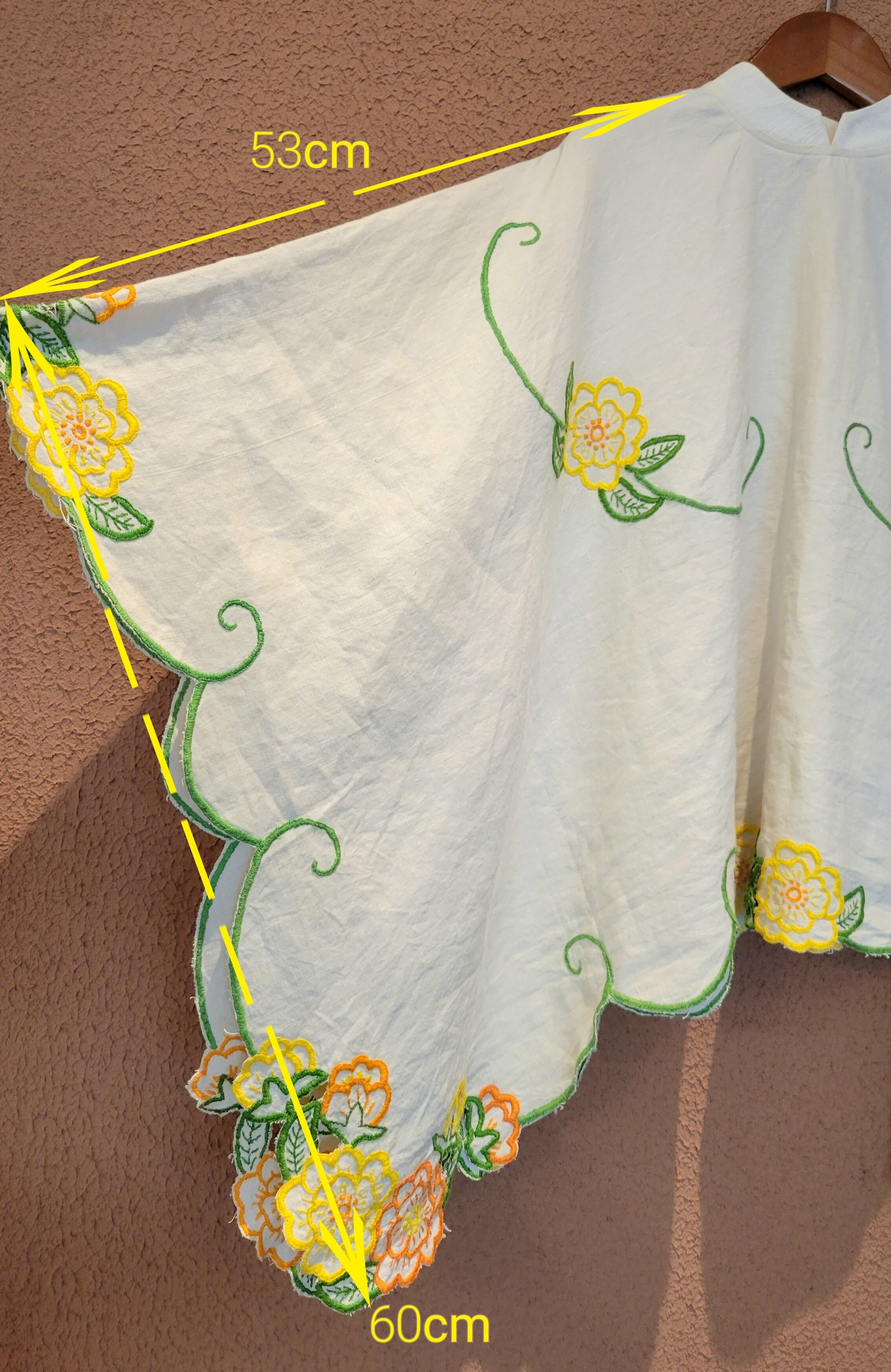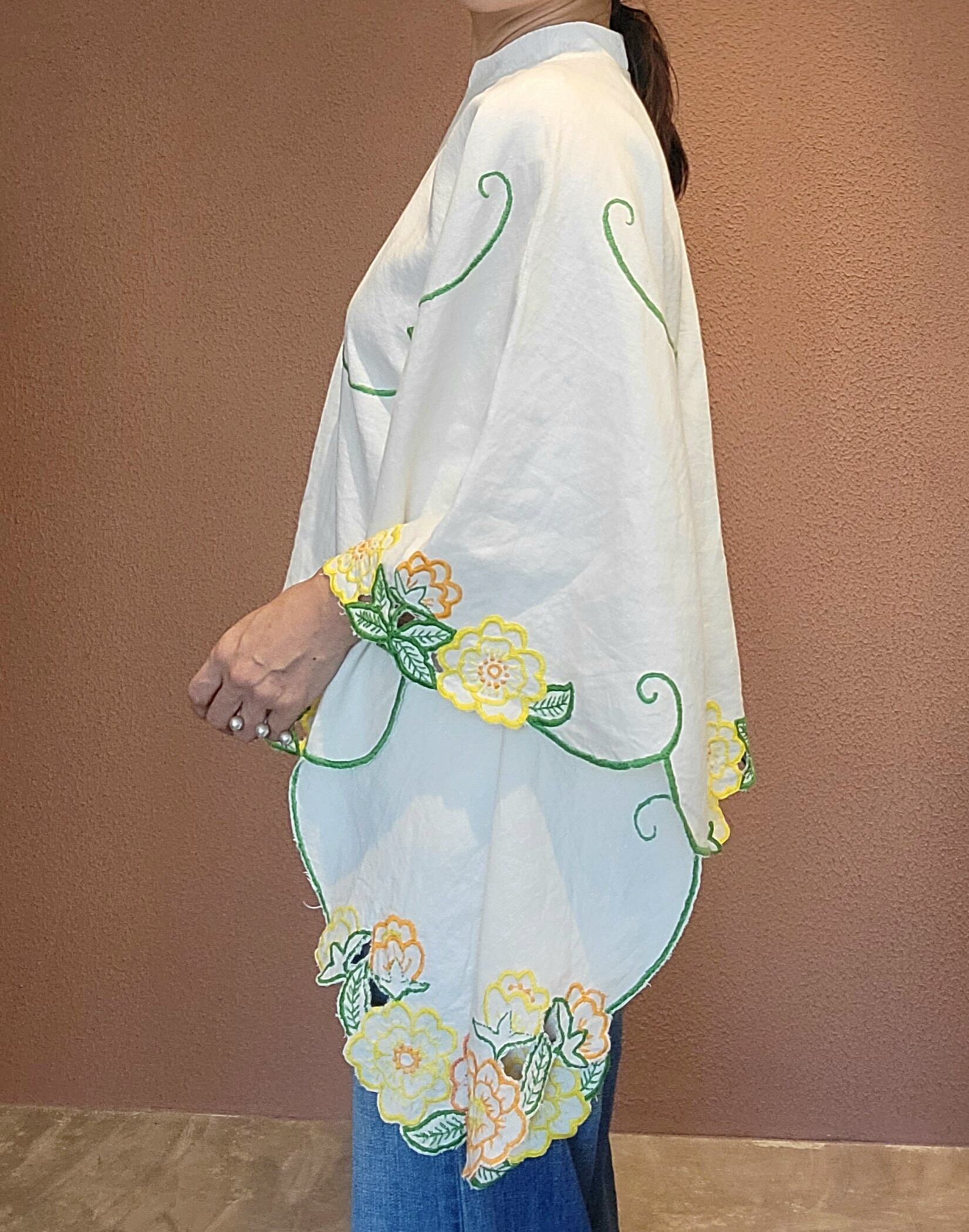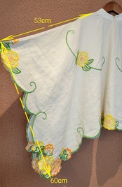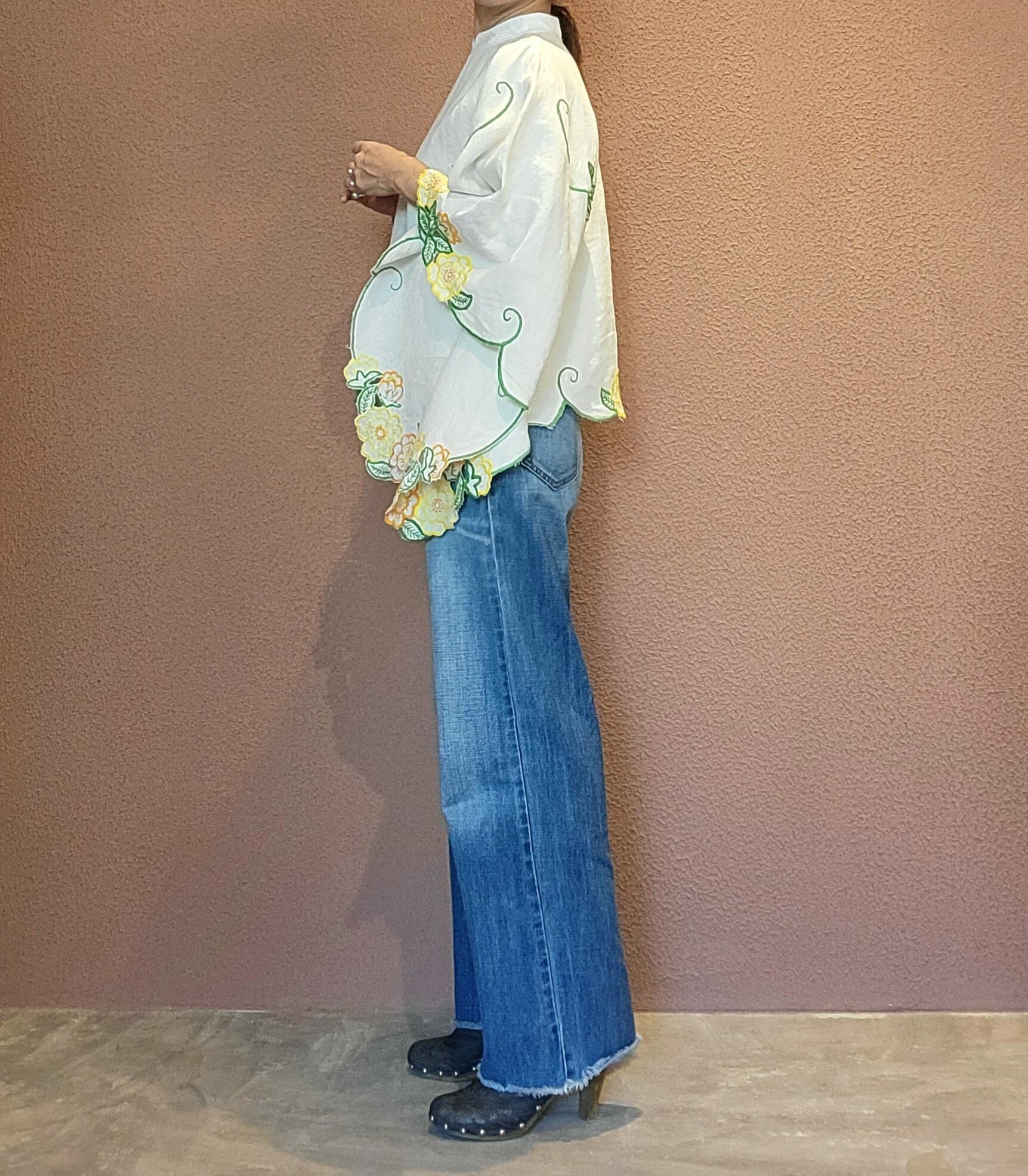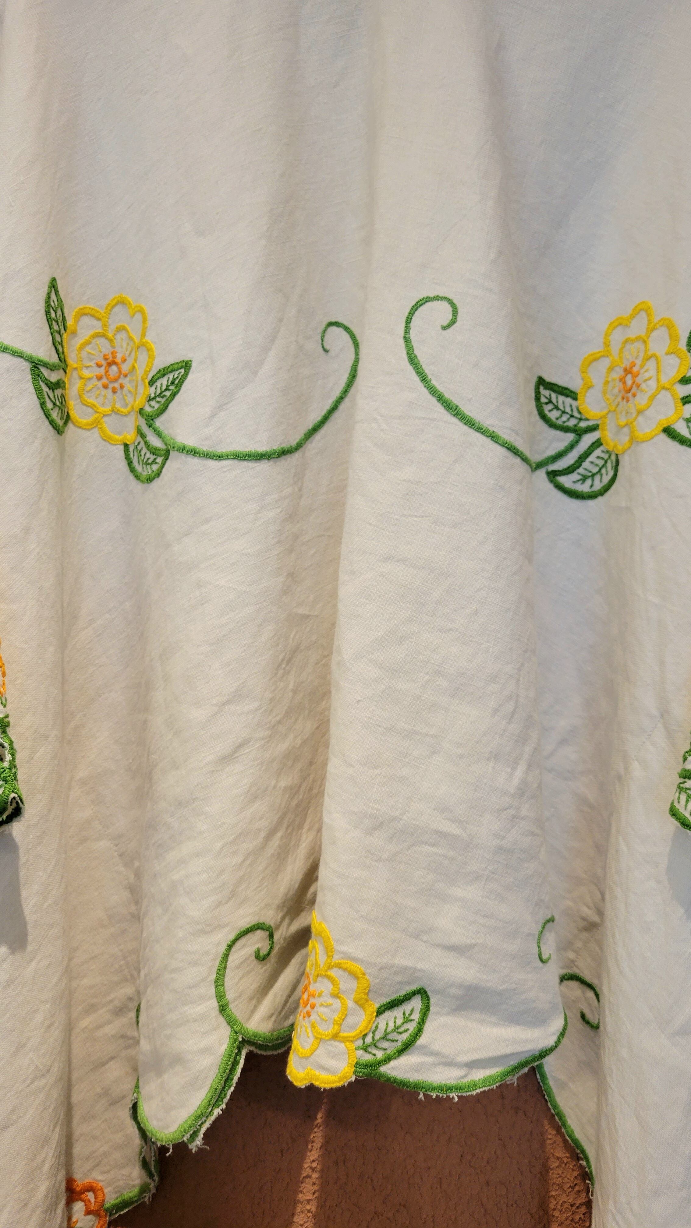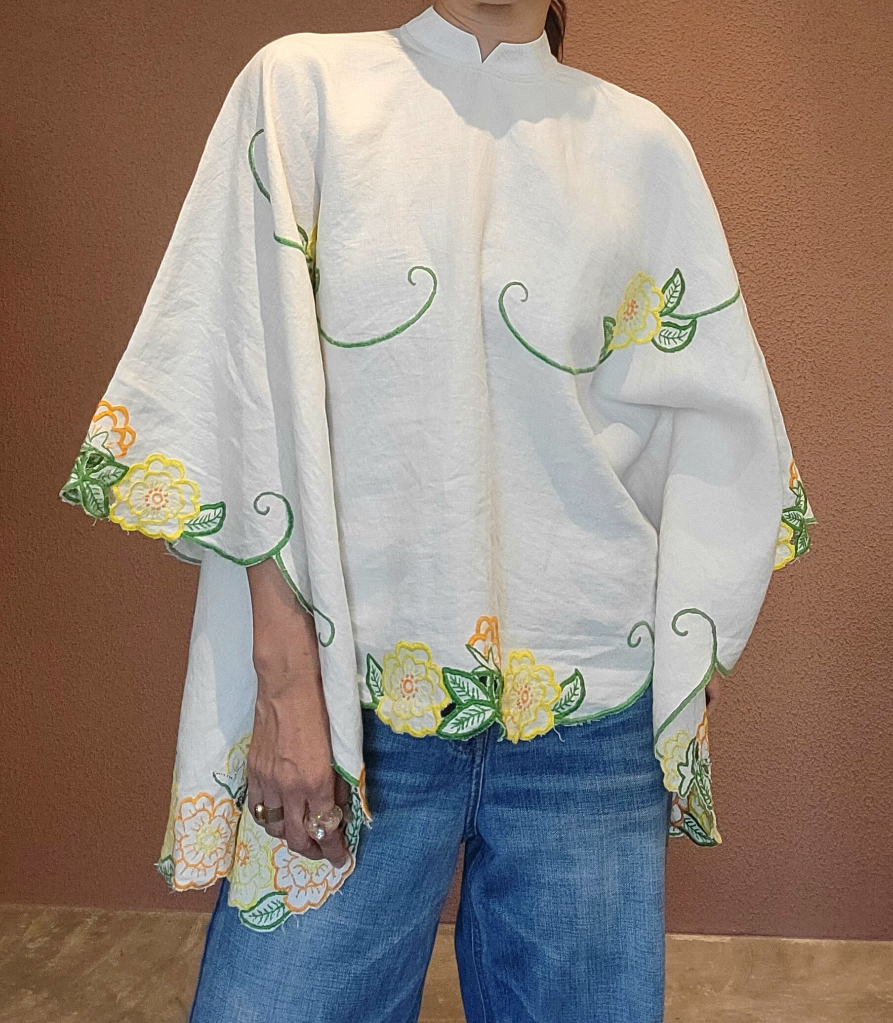 ヴィンテージの刺繍クロスを使用したリメイクトップス。素材表記はありませんが上質なリネンのようです。落ち感があり着用時のドレープが綺麗に出ます。スカラップ刺繍の縁取りが素敵な一点もののリメイクです。
