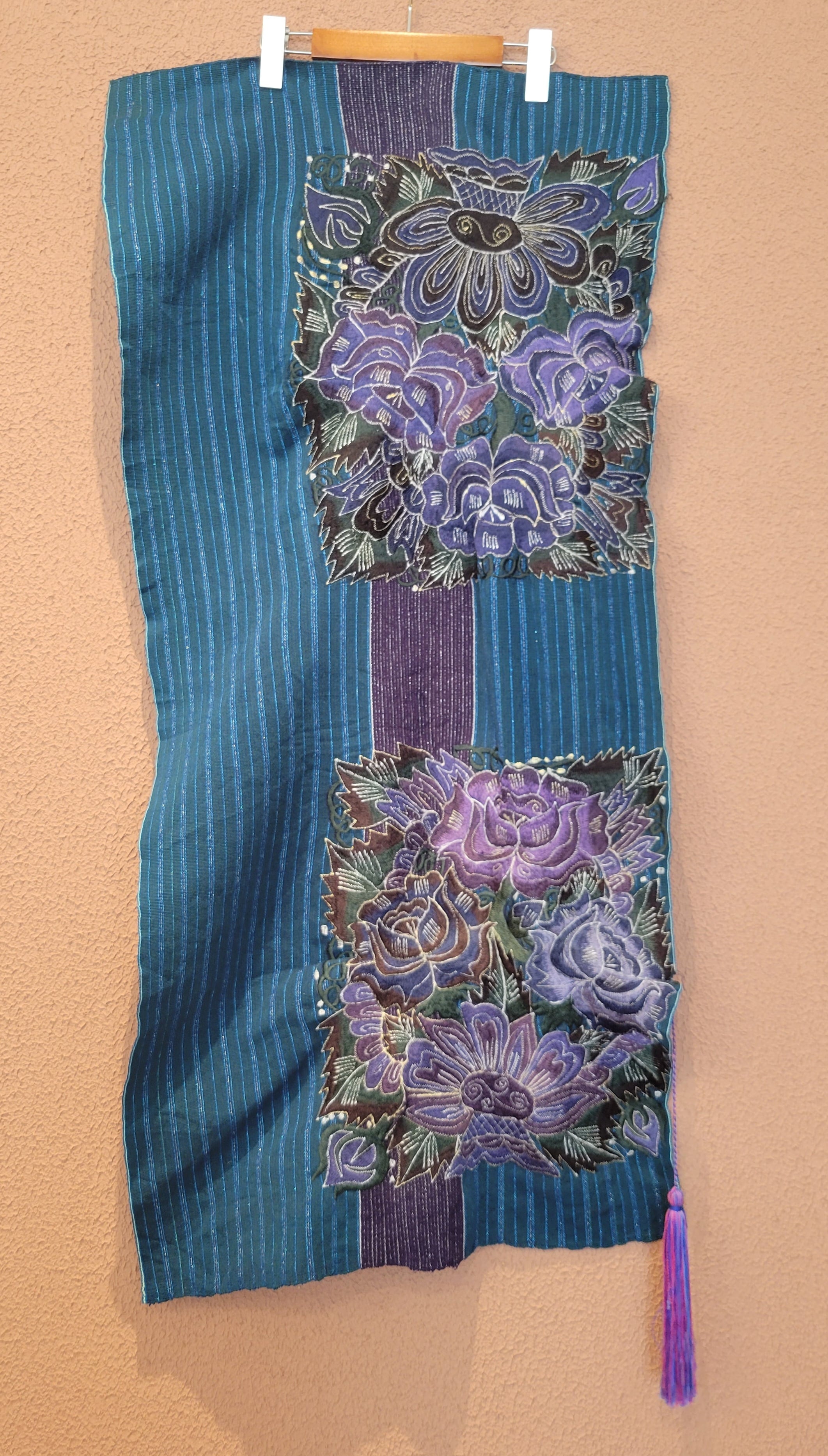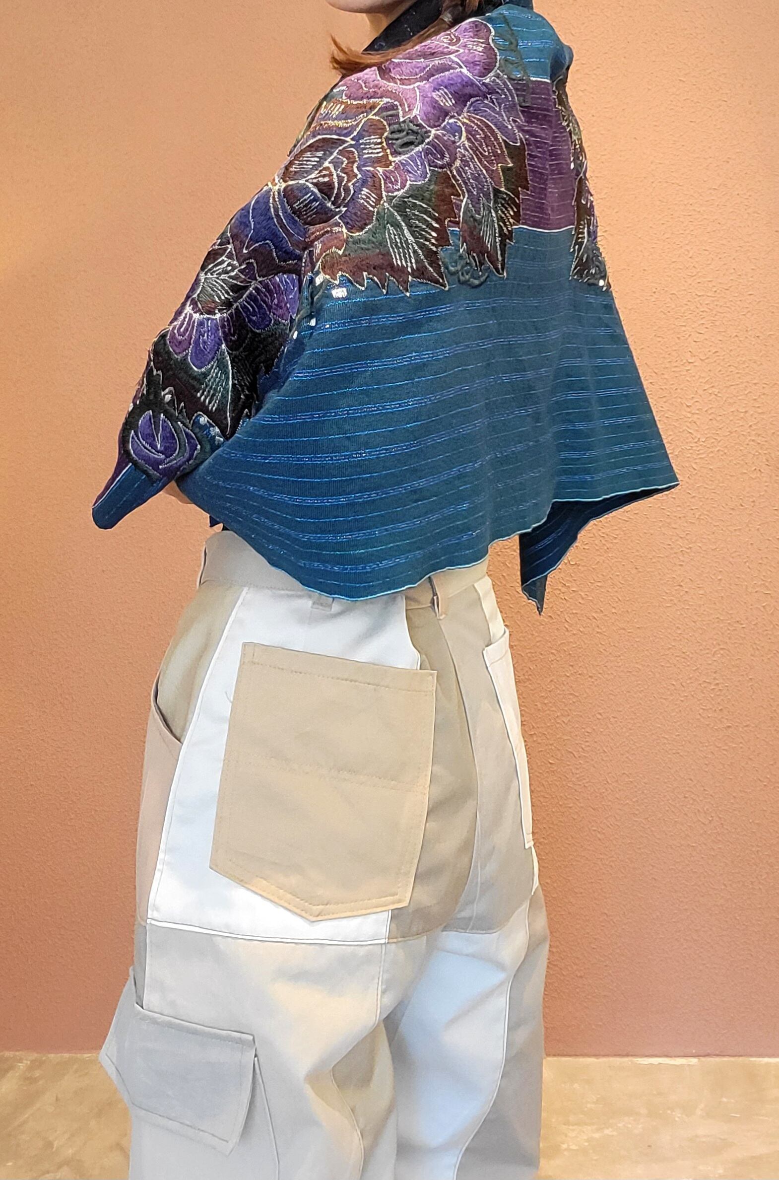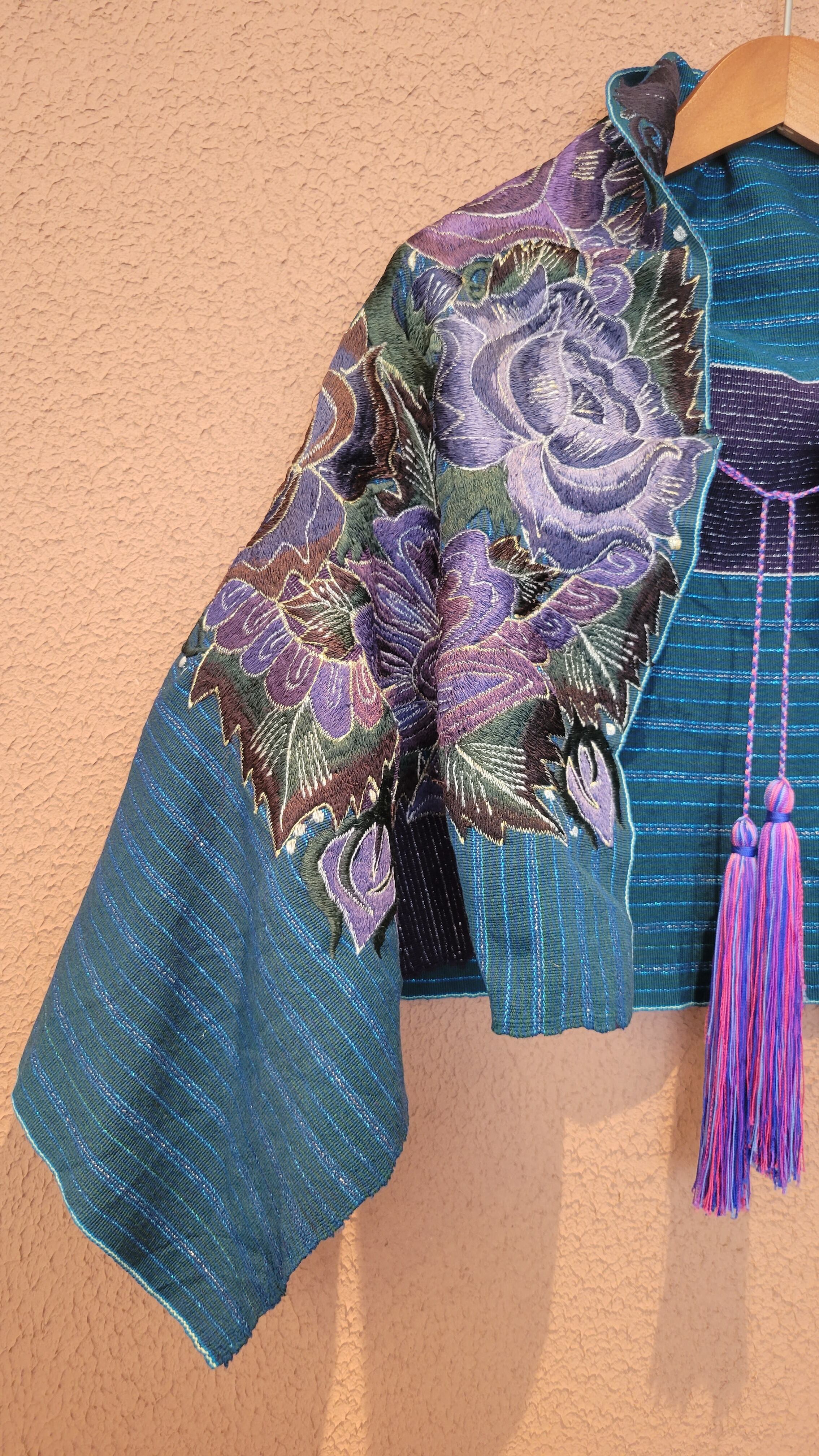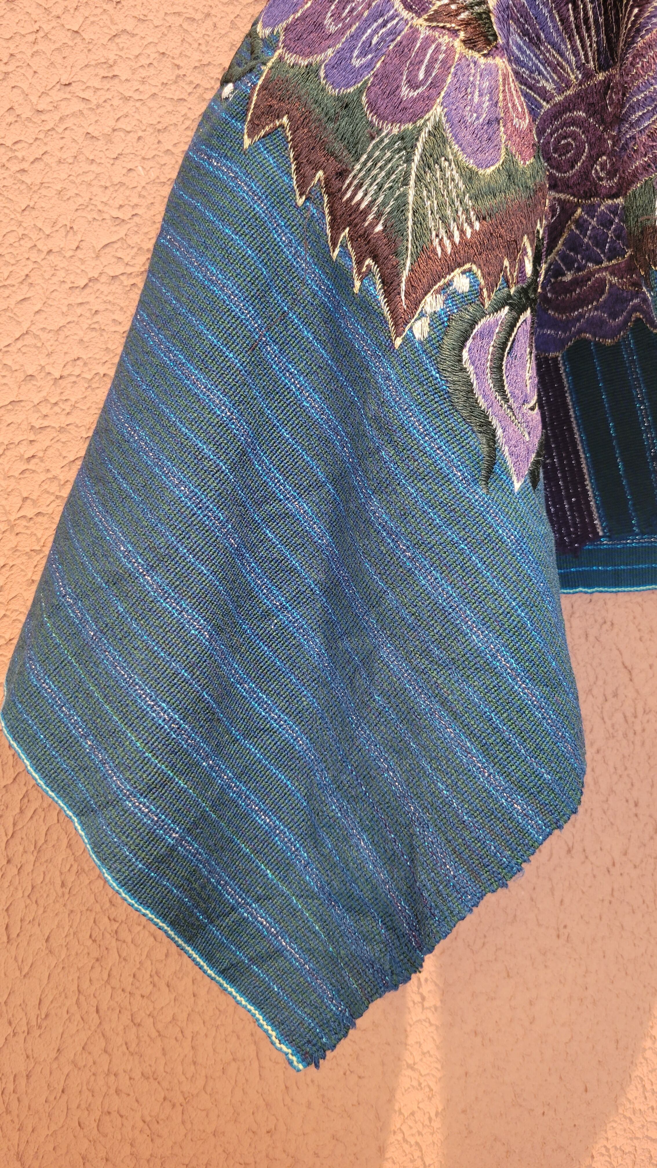 グアテマラのヴィンテージショール。素材表記はありませんがコットンの織りです。やや厚手で張り感があります。銀糸入りの見事な刺繍が立体的で美しく、落ち着きのある色味でありながらも存在感があります。肩に羽織りフロントでタッセル付き紐を結んでボレロ風に着用できます。ジャケットやコートの上に羽織るのも素敵です。