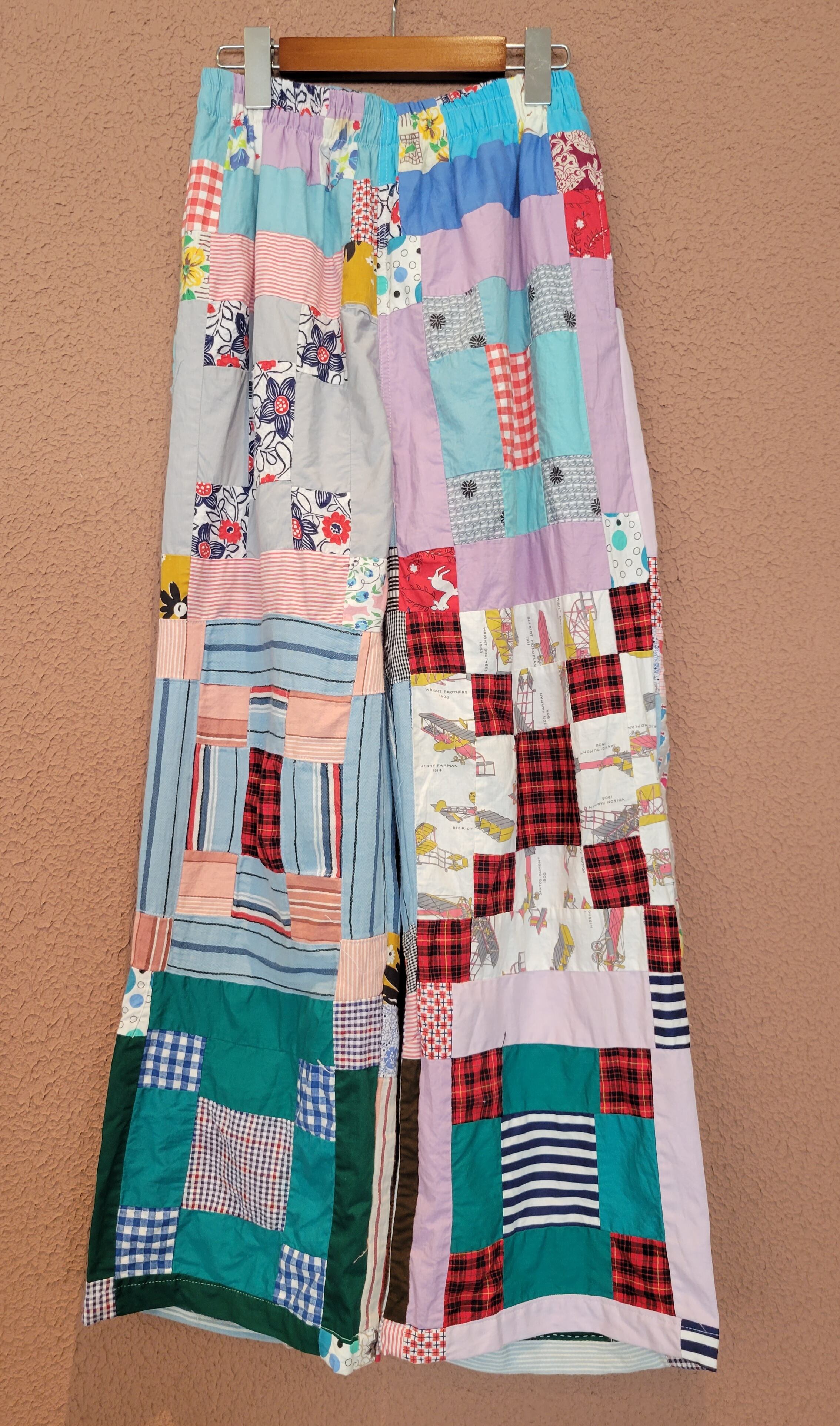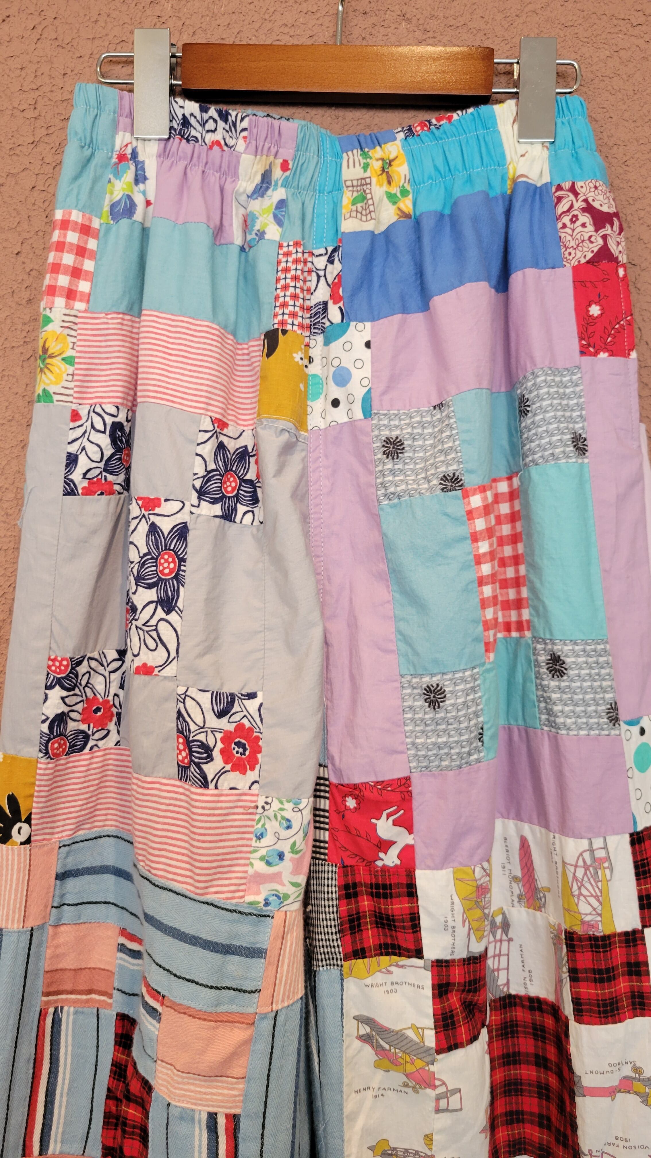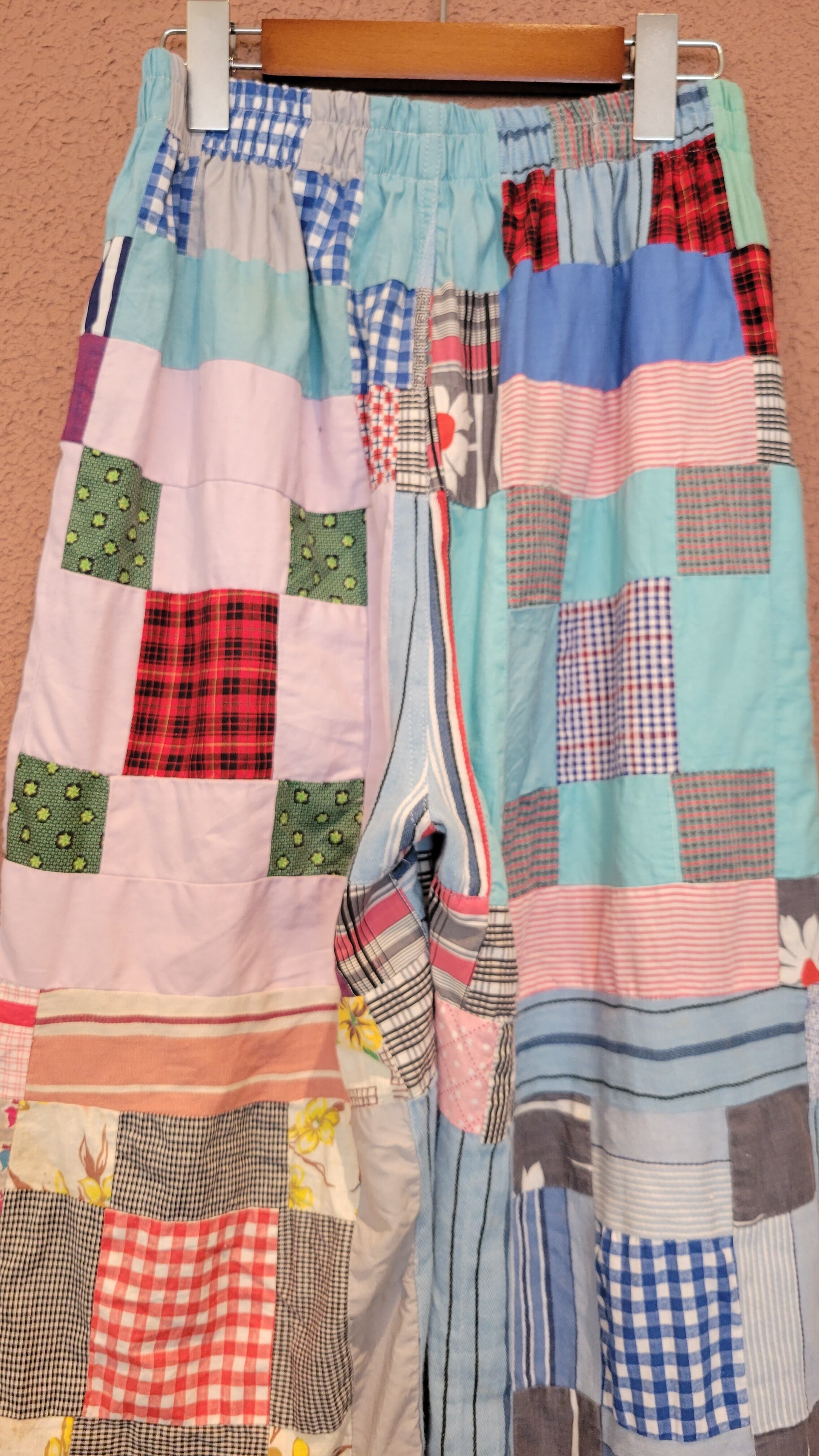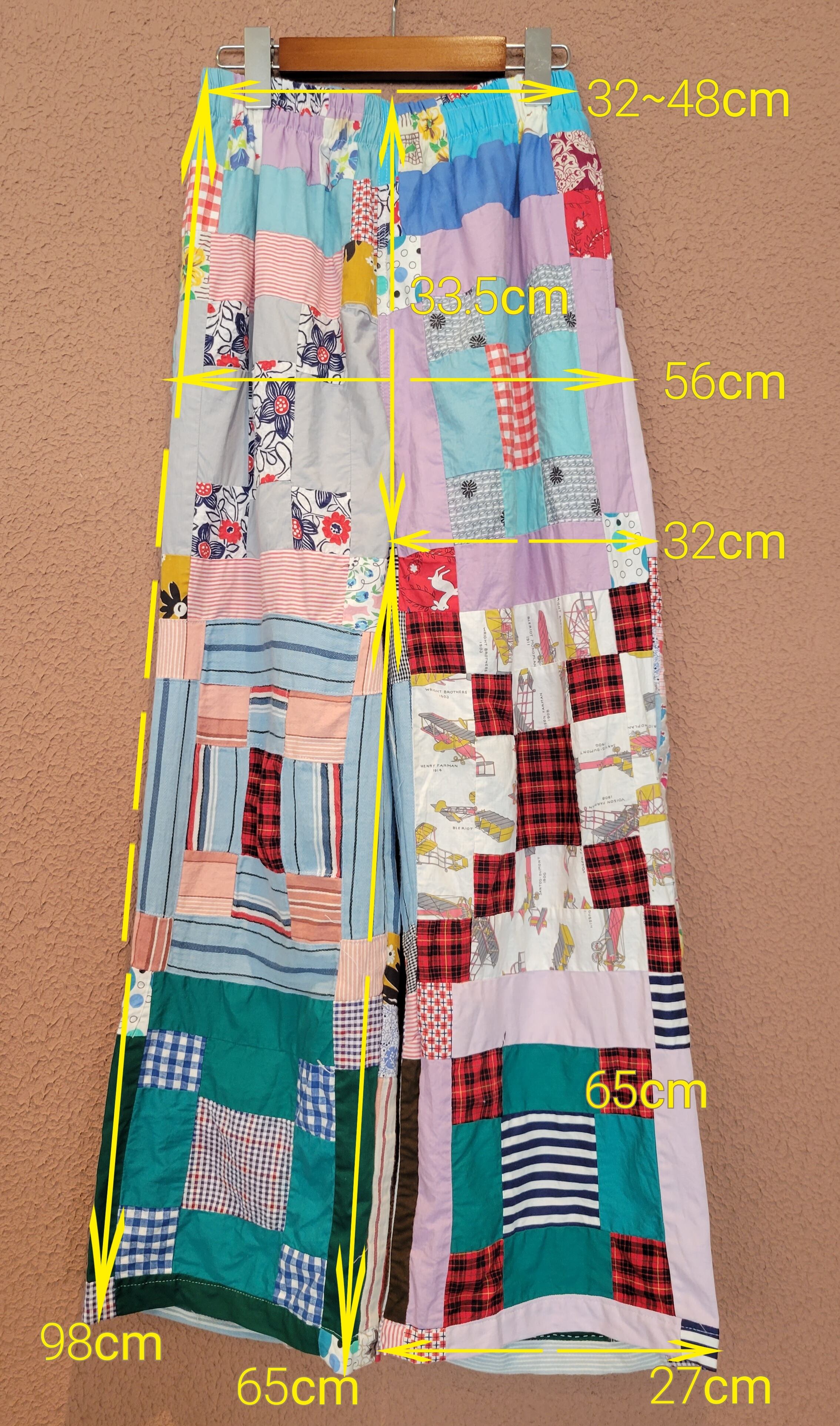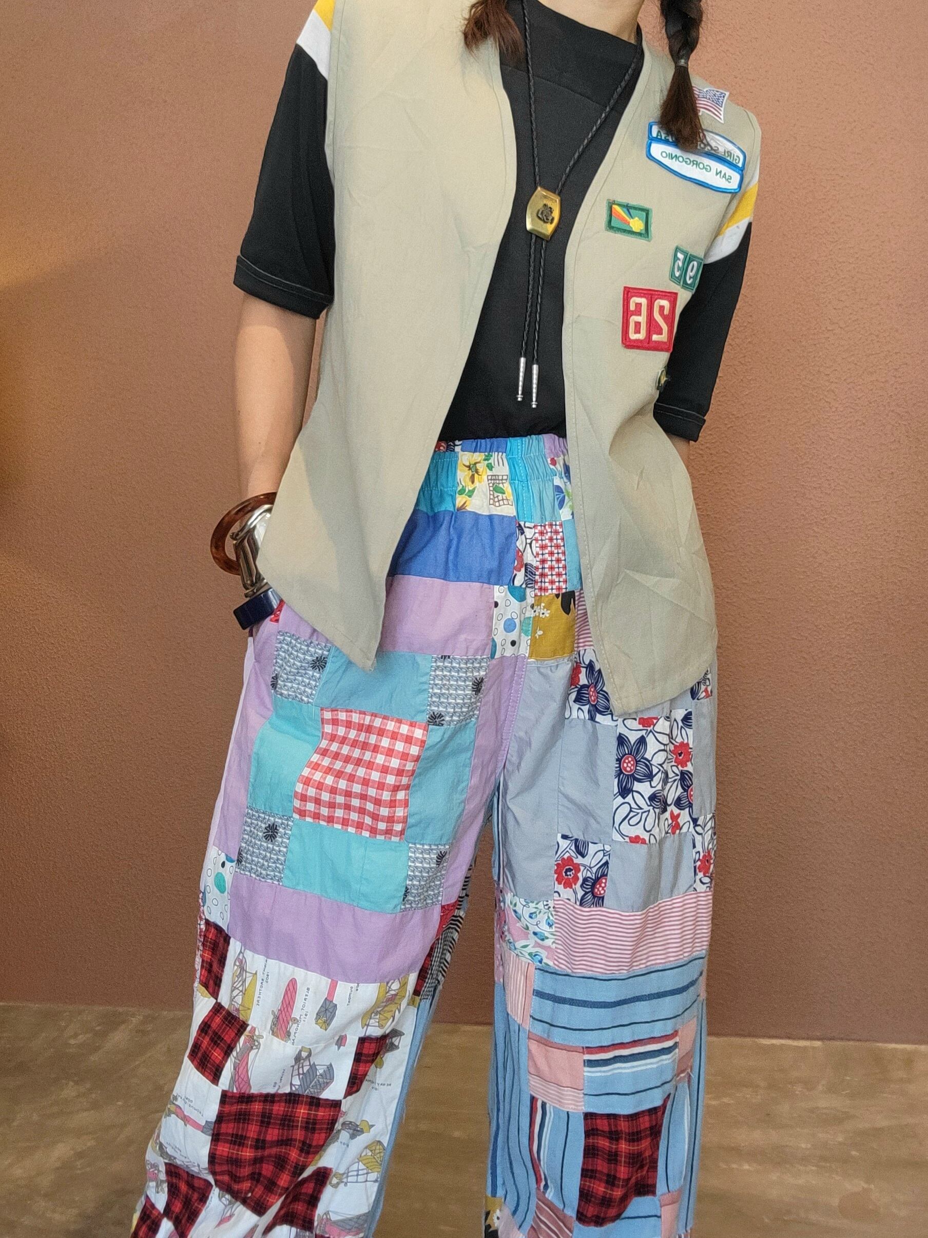 ヴィンテージのパッチワーク生地を使用したリメイクイージーパンツ。素材表記はありませんがコットンのようです。ウエストゴム、左右シームポケット付き。裏地は付いていません。何枚ものハギレを縫い合わせた表情豊かな1本。履き心地良く日常使いにぴったりです。