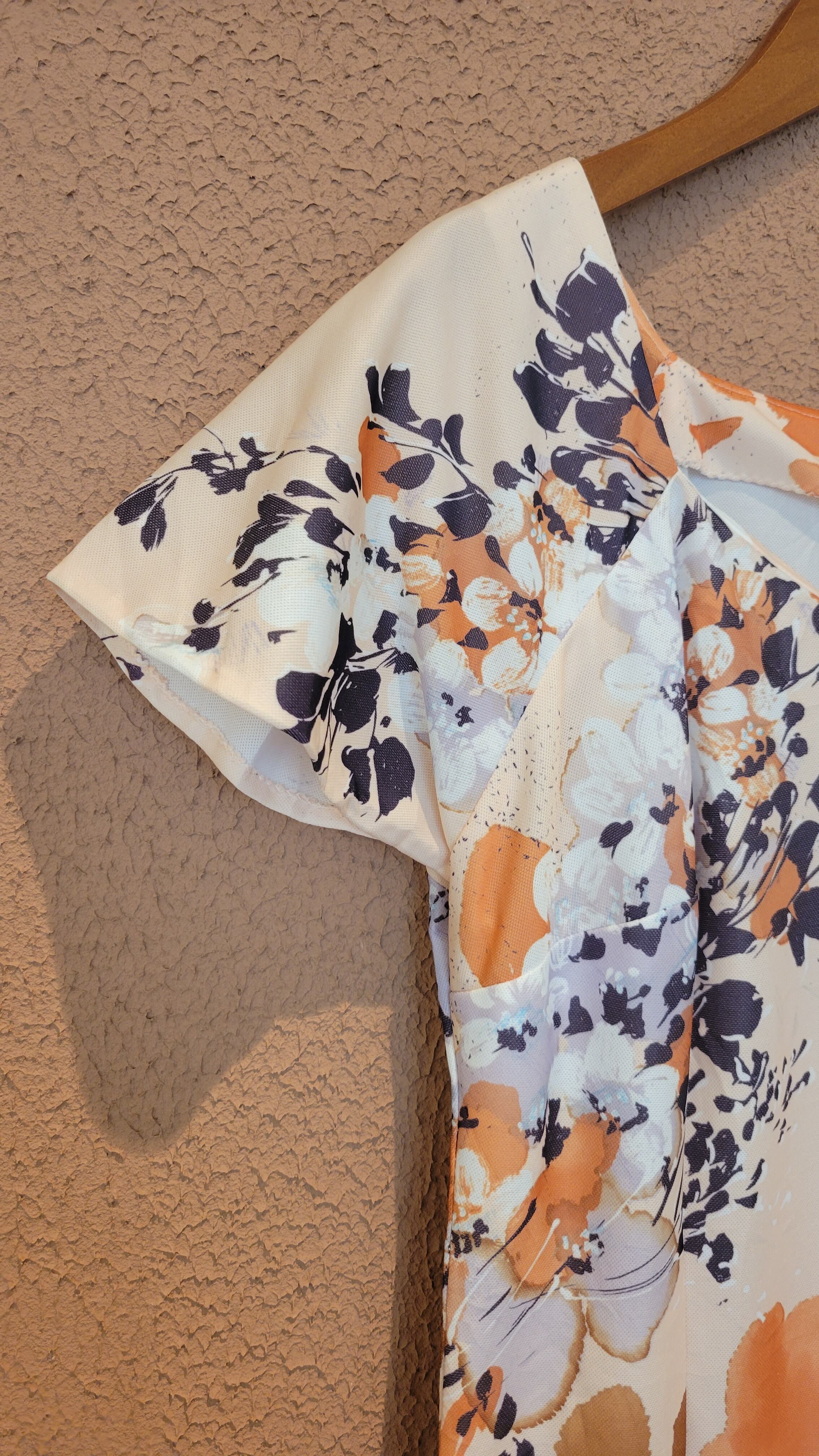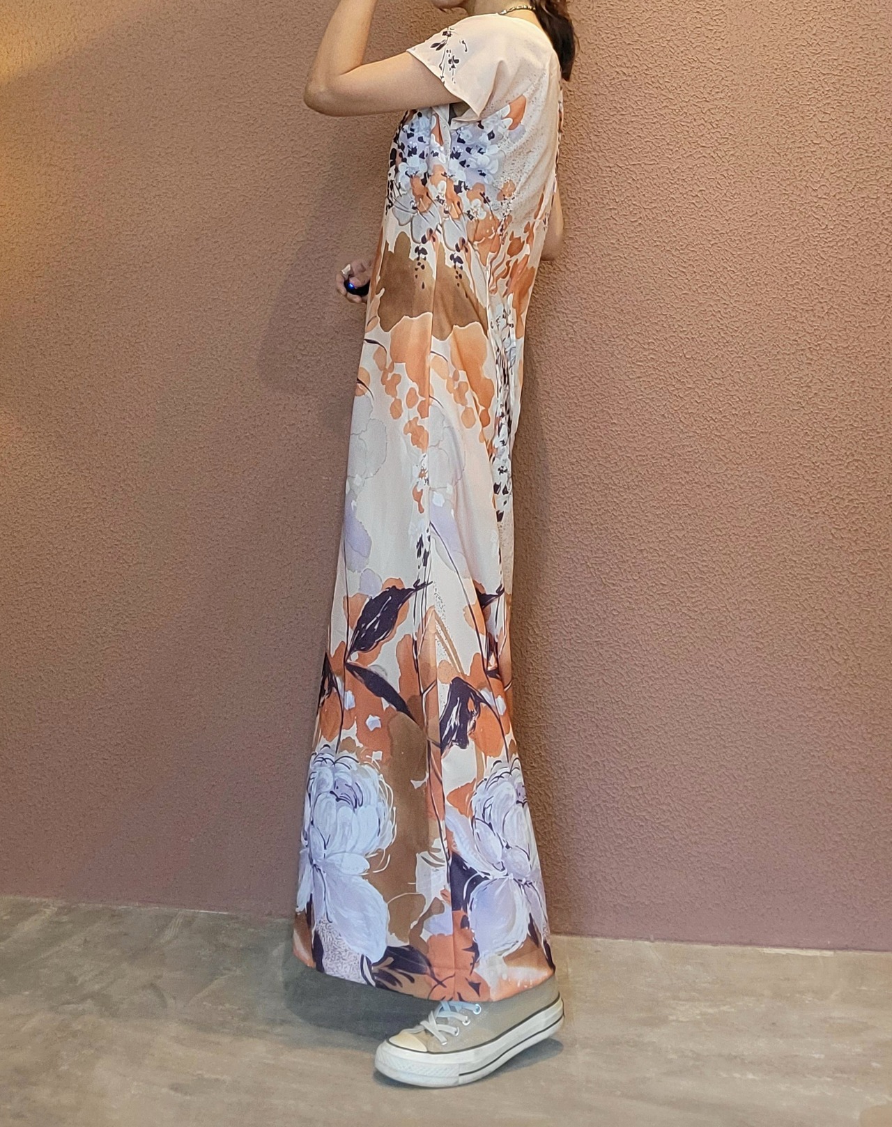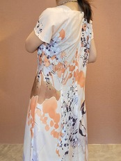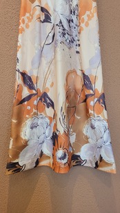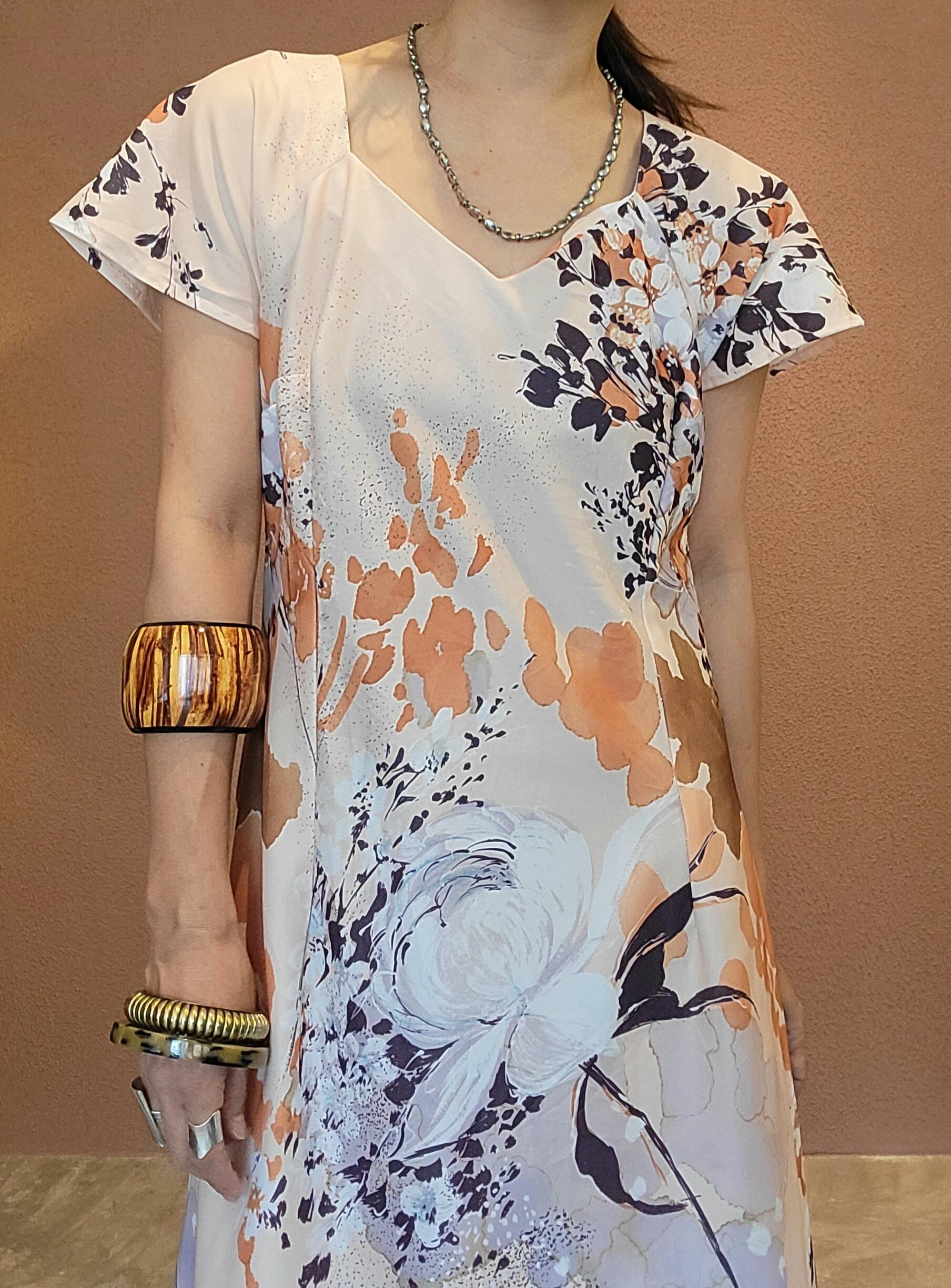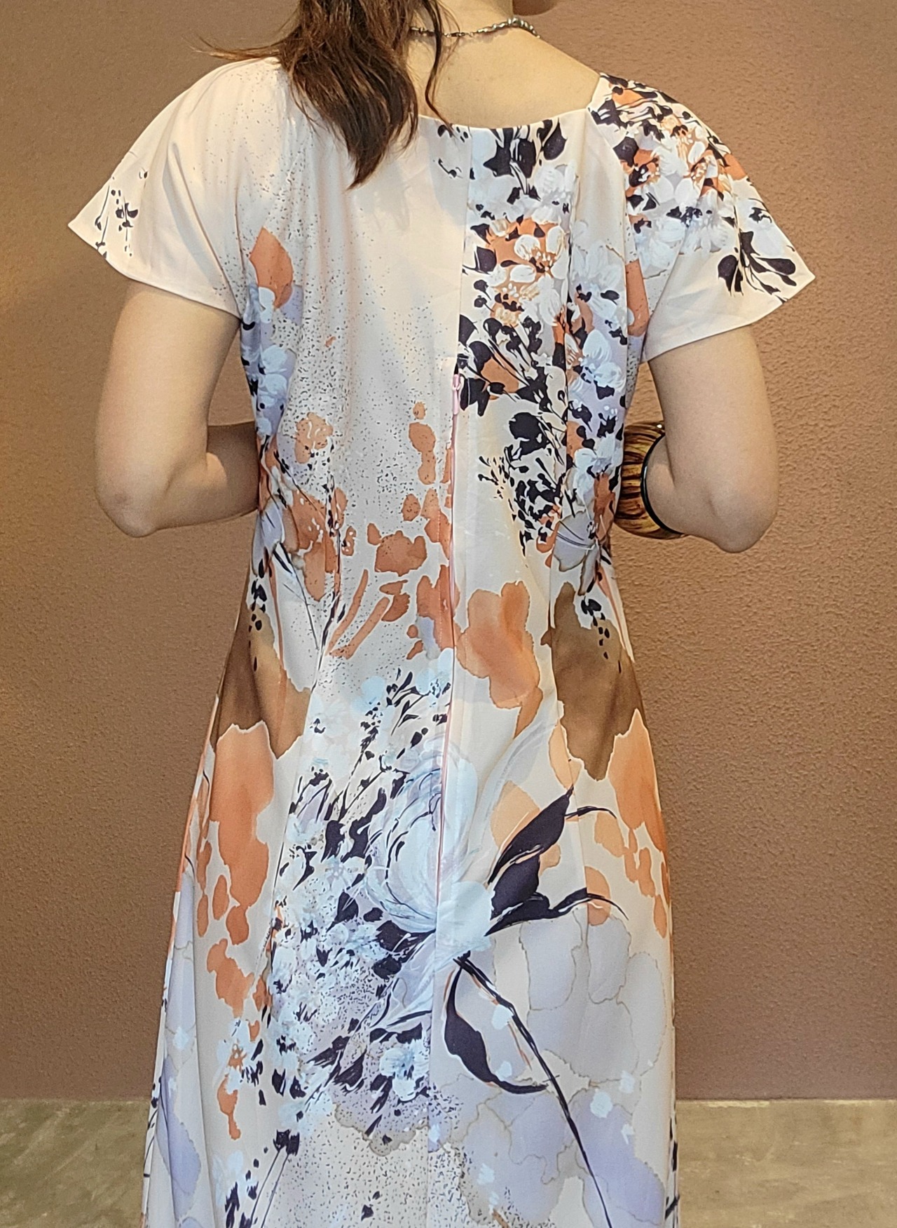 ヴィンテージのマキシワンピース。素材はポリエステルです。バックファスナーは背中の中心辺りから腰までの部分ファスナーです。滲んだ水彩画のようなプリントと淡い色合いが独特の雰囲気。1枚で仕上がるワンピースです。