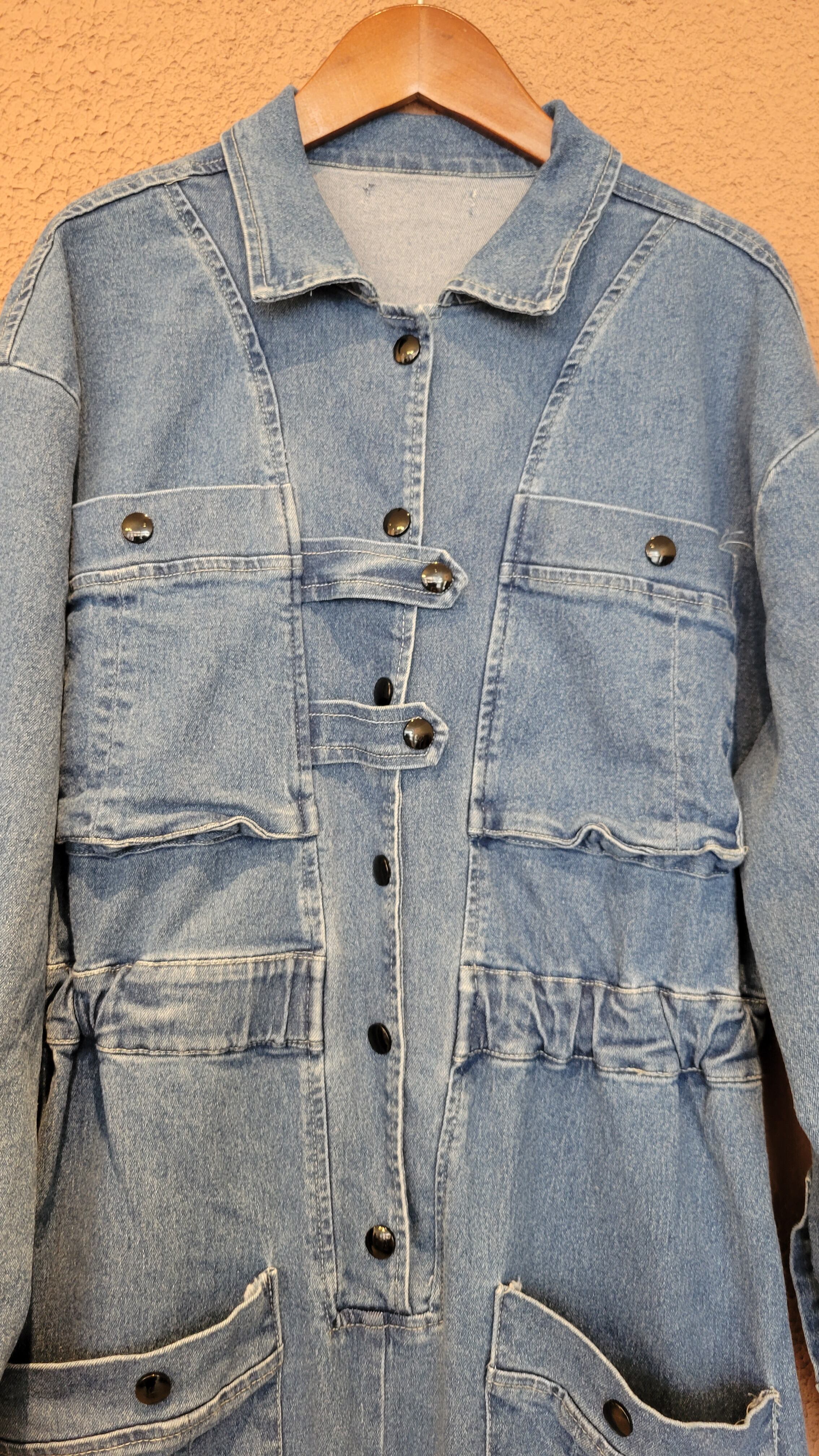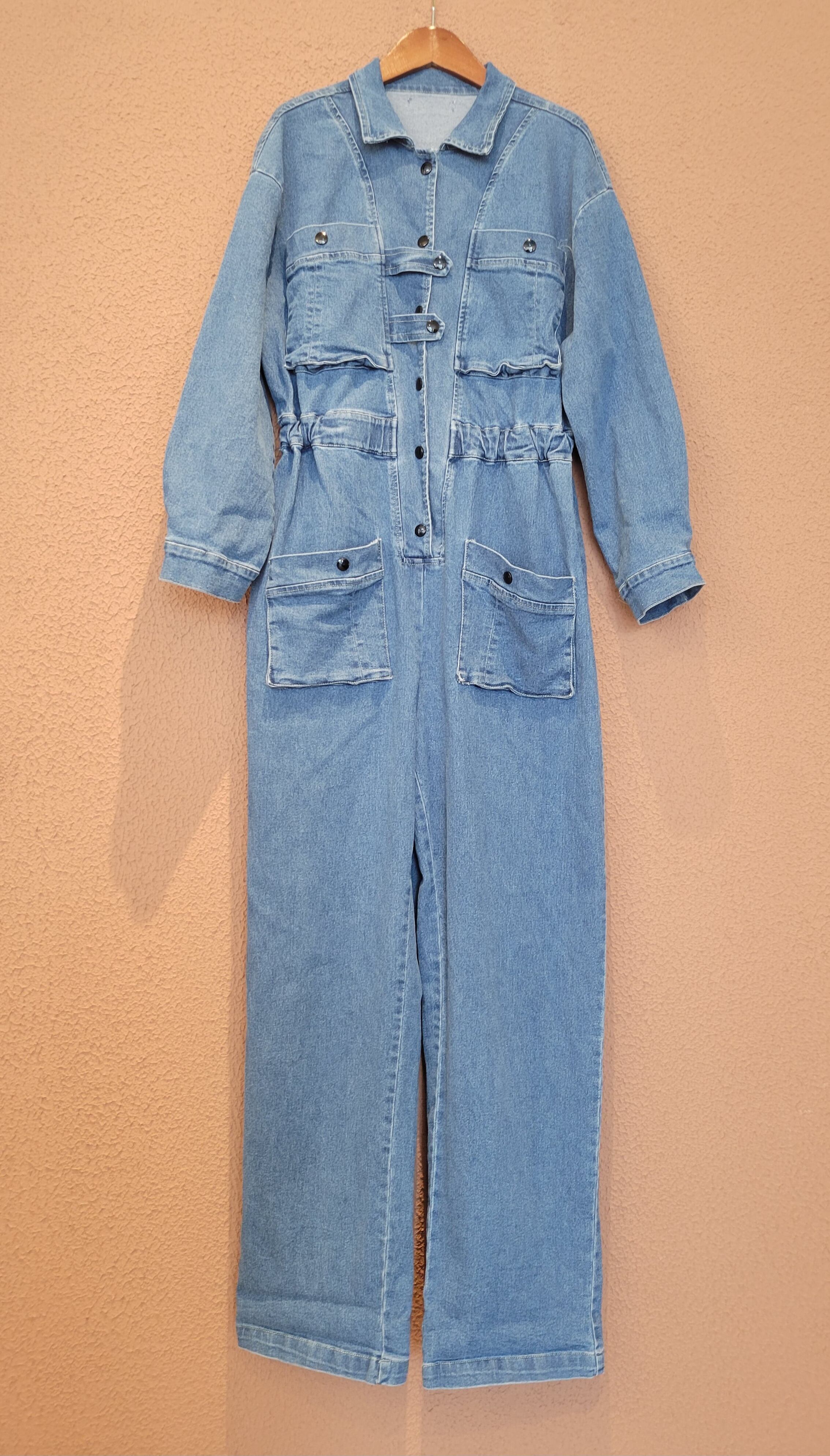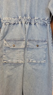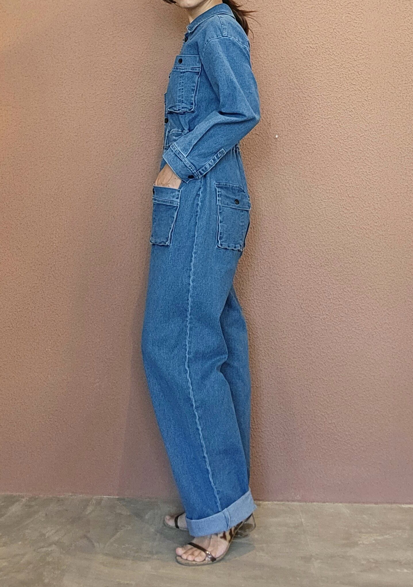 ヴィンテージのデニムジャンプスーツ。素材表記はありませんがコットンとポリウレタンの混紡のようなストレッチデニムです。フラップ付きのスナップボタンやマチ付きのアウトポケットなど可愛いディテールです。楽な履き心地でゆるっとこなれた雰囲気に仕上がります。