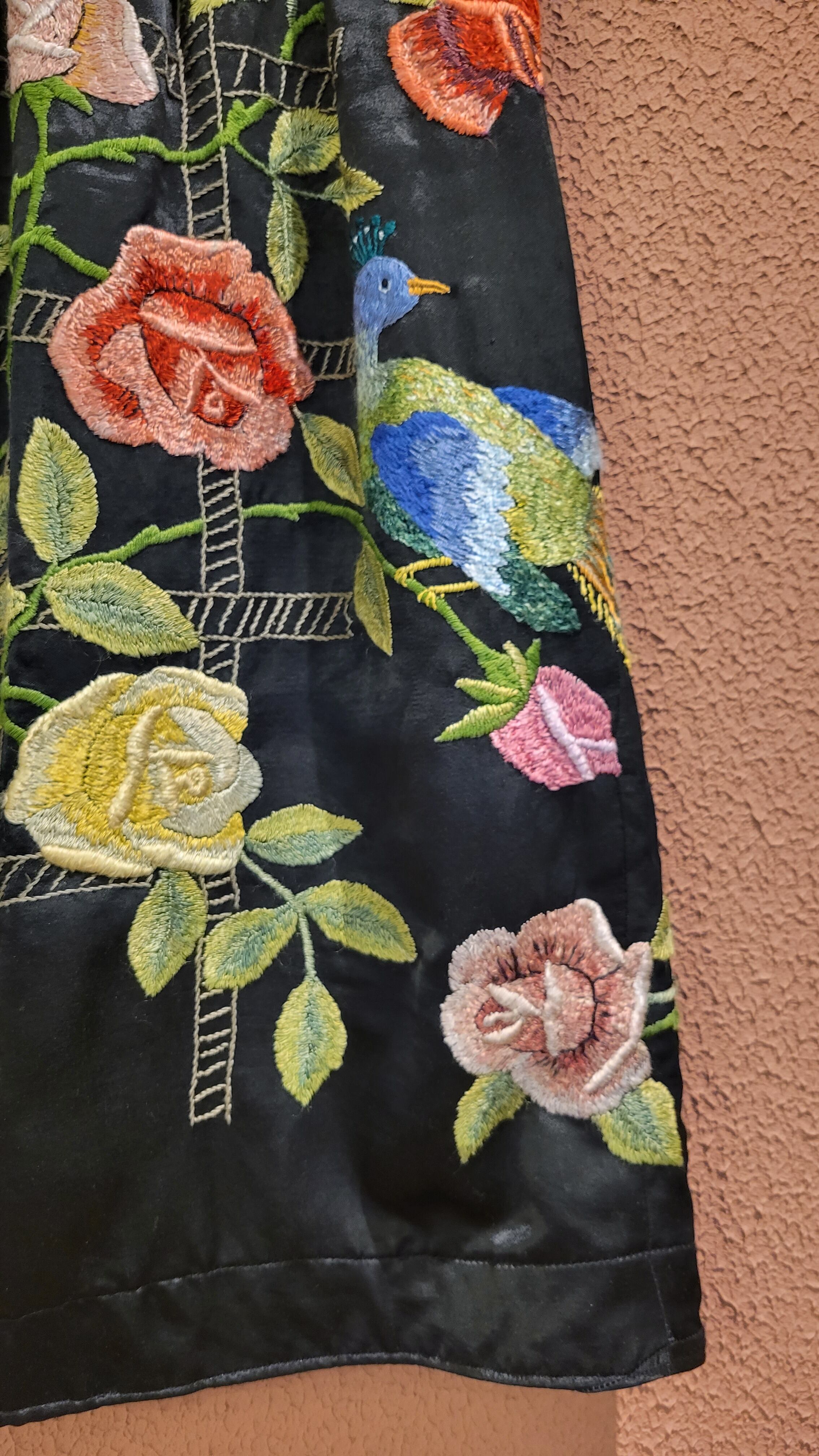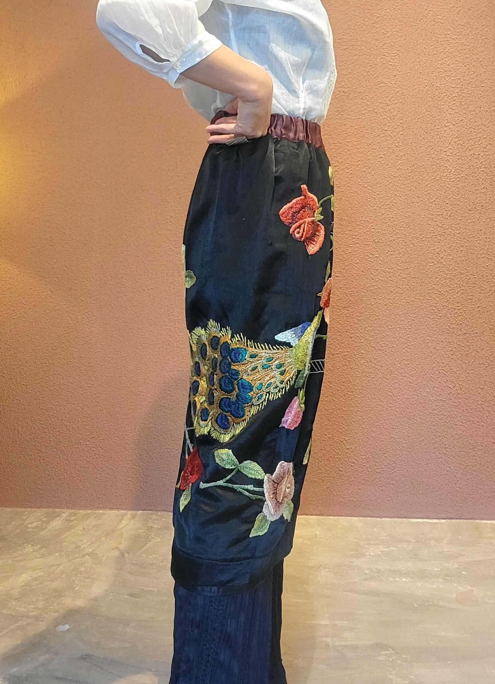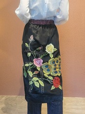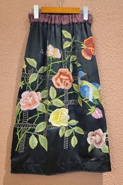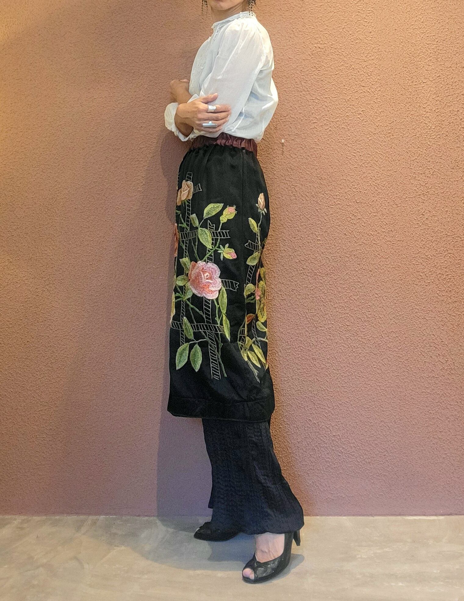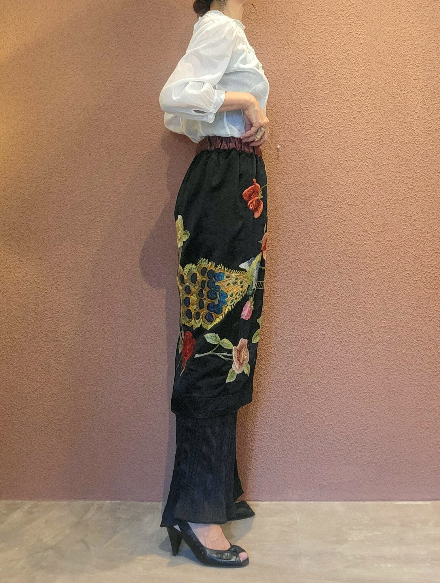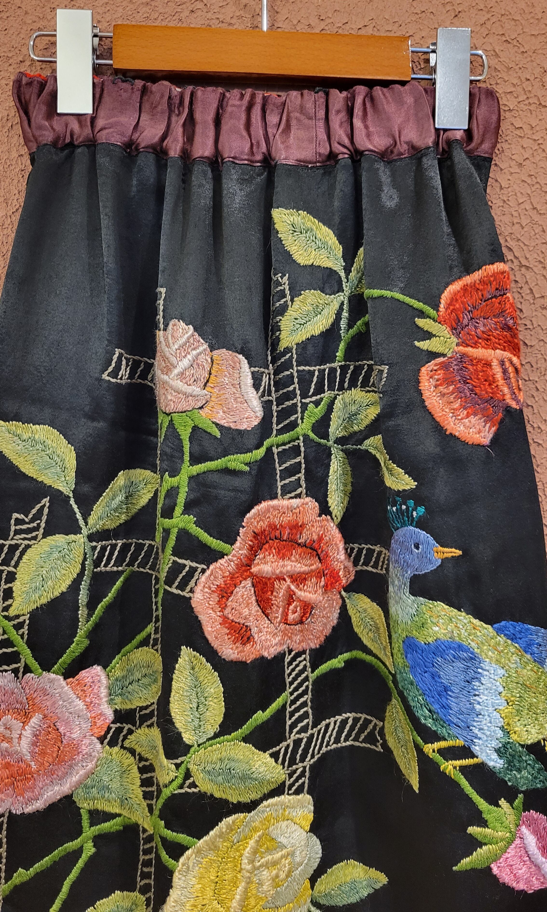 シノワズリな手刺繍が全面に施された光沢のあるヴィンテージシルクを贅沢に使用したリメイクのペンシルスカート。ウエストはゴム仕様。吸い付くようなシルクの滑らかな肌触りが魅力です。左腰あたりに生地ダメージがあります。画像でご確認ください。