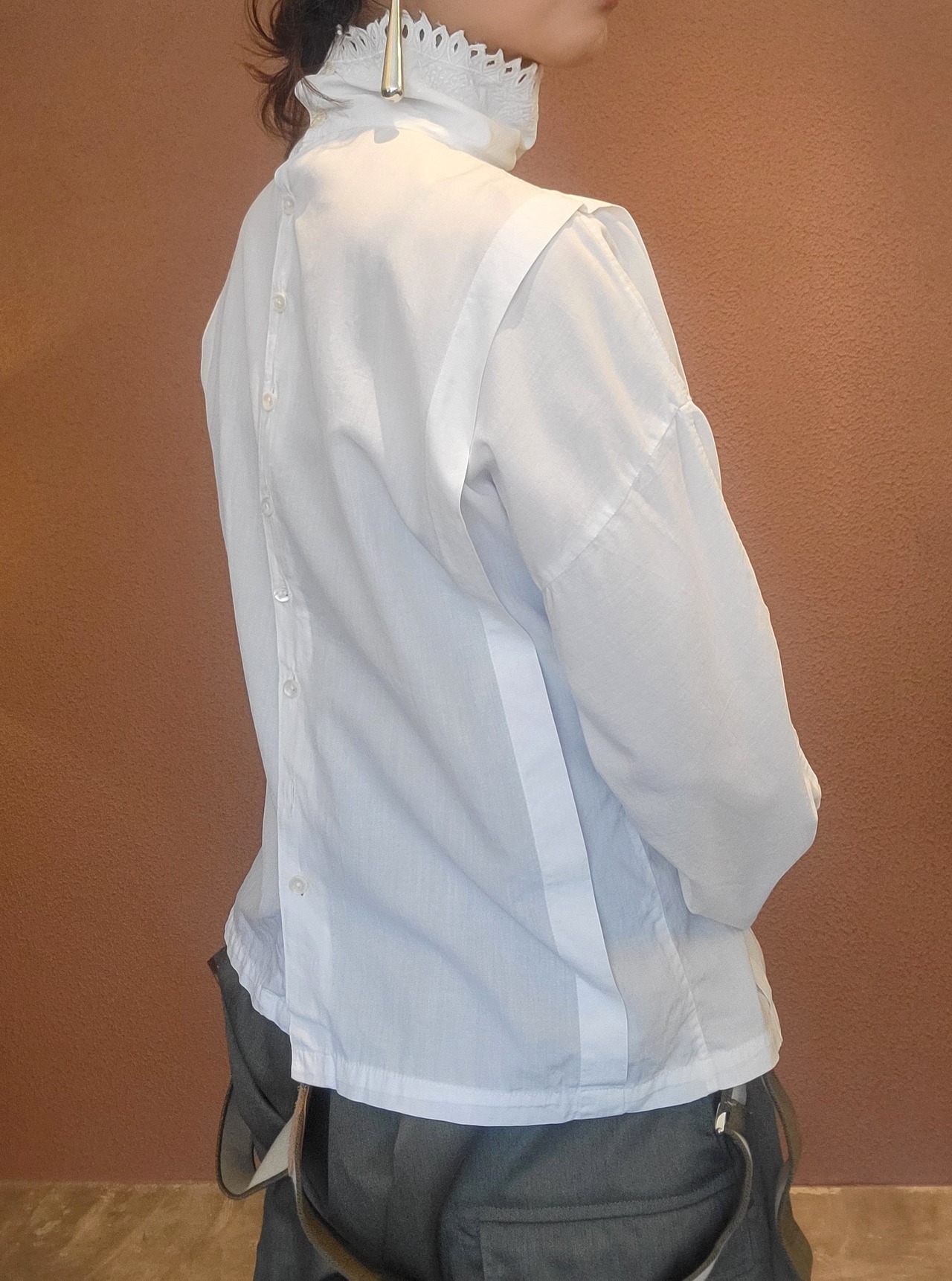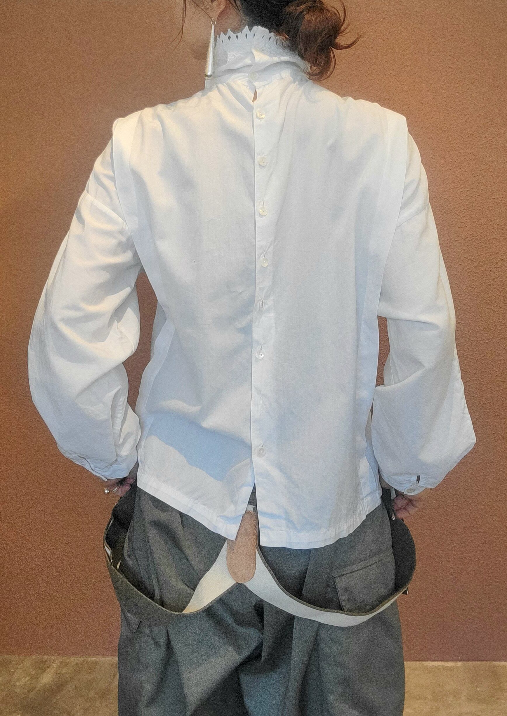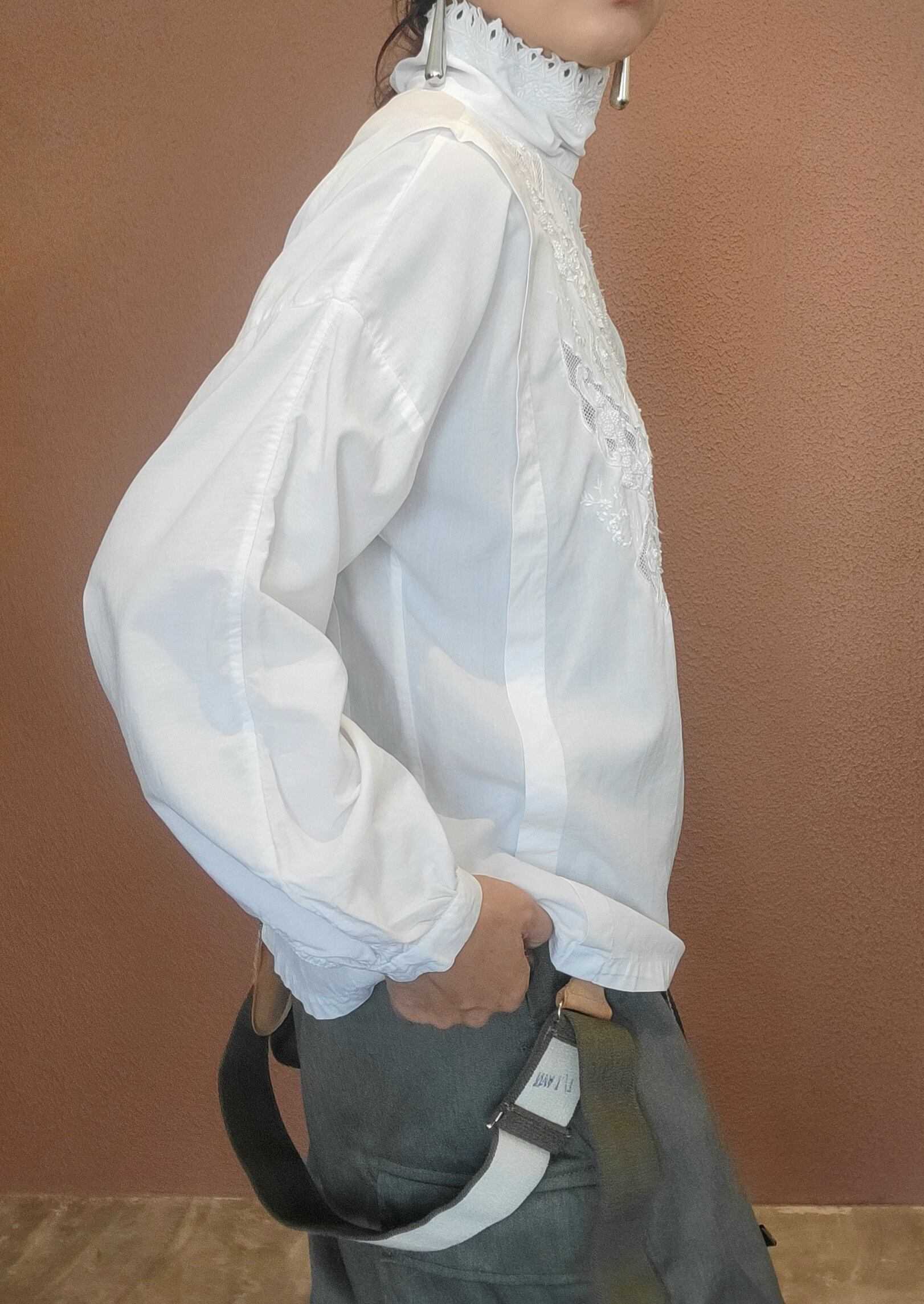 ヴィンテージのホワイトレースブラウス。素材表記はありませんがコットンのようです。バックボタン仕様。高さのあるハイネック、肩のプリーツ、ドルマンスリーブで広めのアームホールなどのディテールが、甘さを抑えています。きちんと感があるため、きれいめなスタイリングはもちろん、ミリタリーパンツ等の無骨なボトムスと合わせても品良く仕上がります。