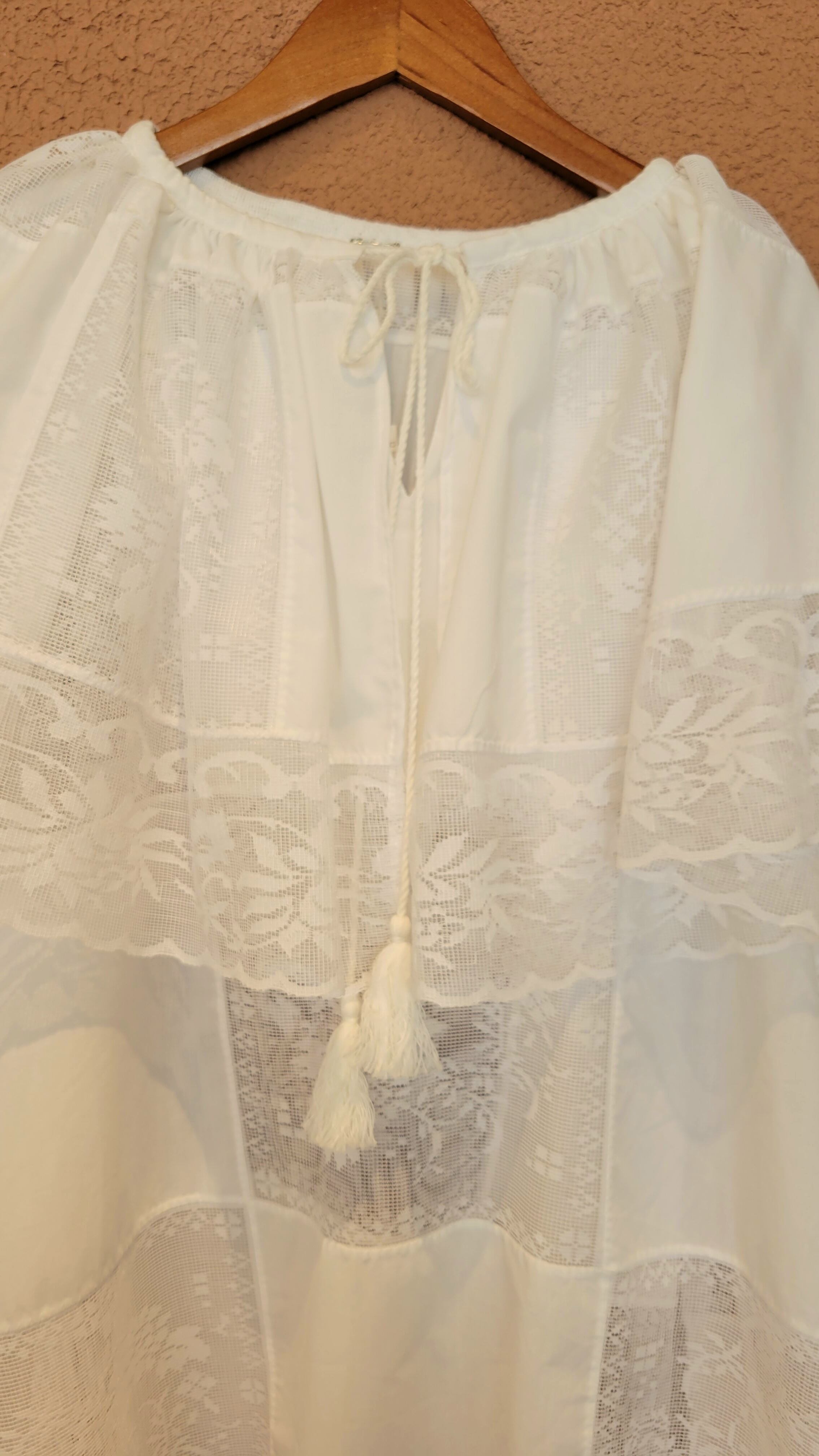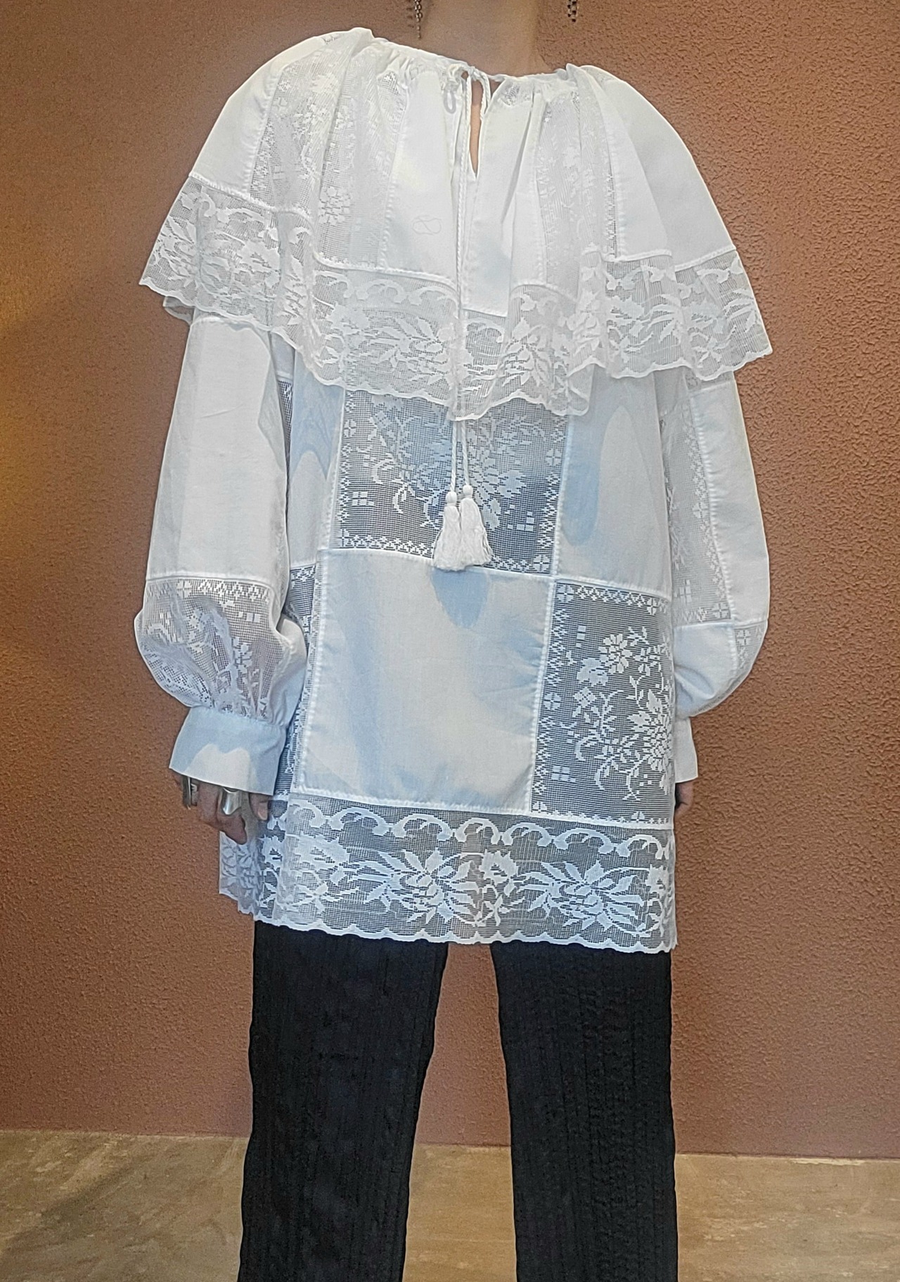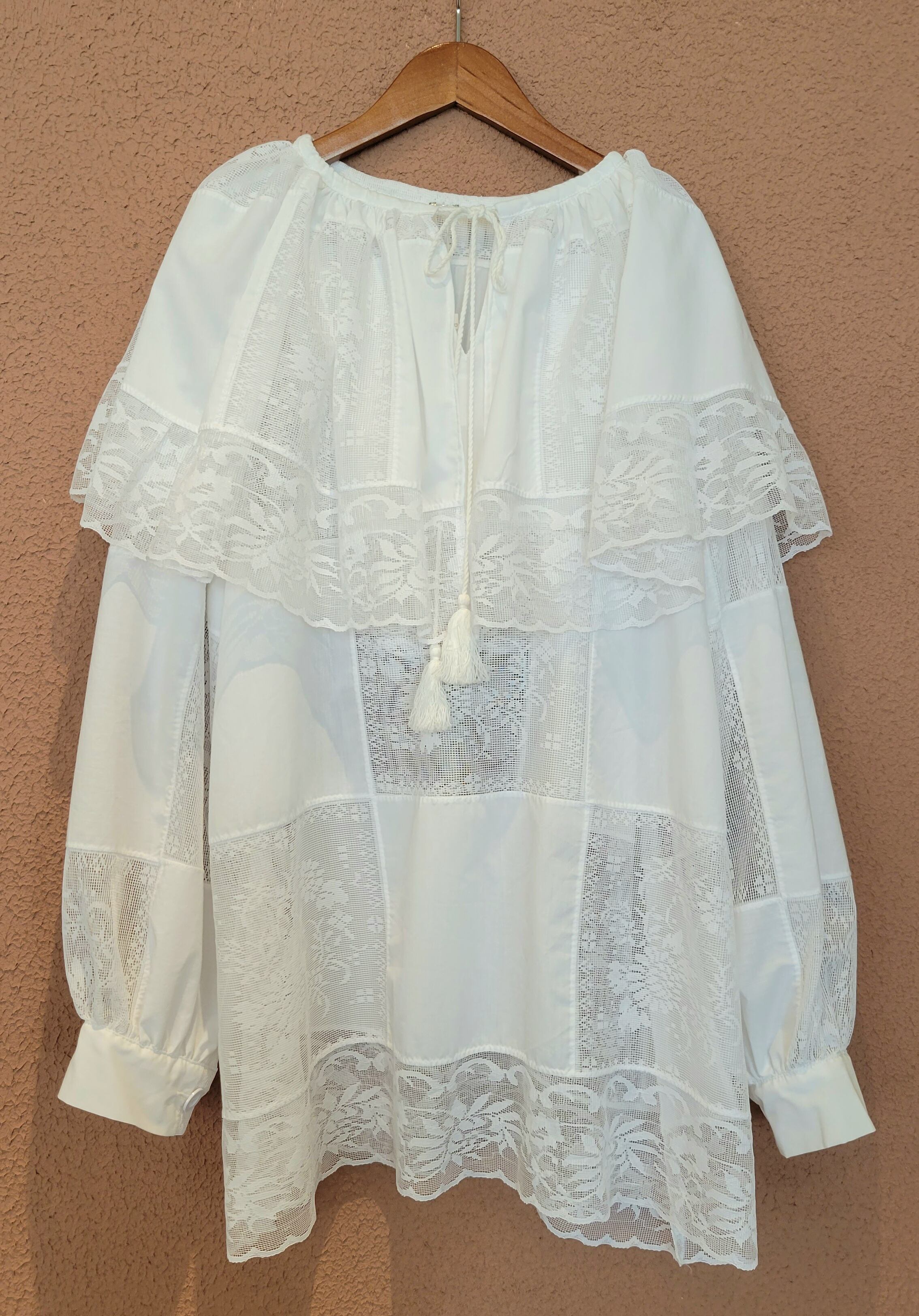 ヴィンテージレースをたっぷり使用したリメイクトップス。素材表記はありませんがコットンのようです。大きな襟が印象的です。襟は取り外し不可です。エレガントで華やかな1着。ふんわり軽量でヒップの隠れるゆったりしたサイズで着心地の良い1着です。