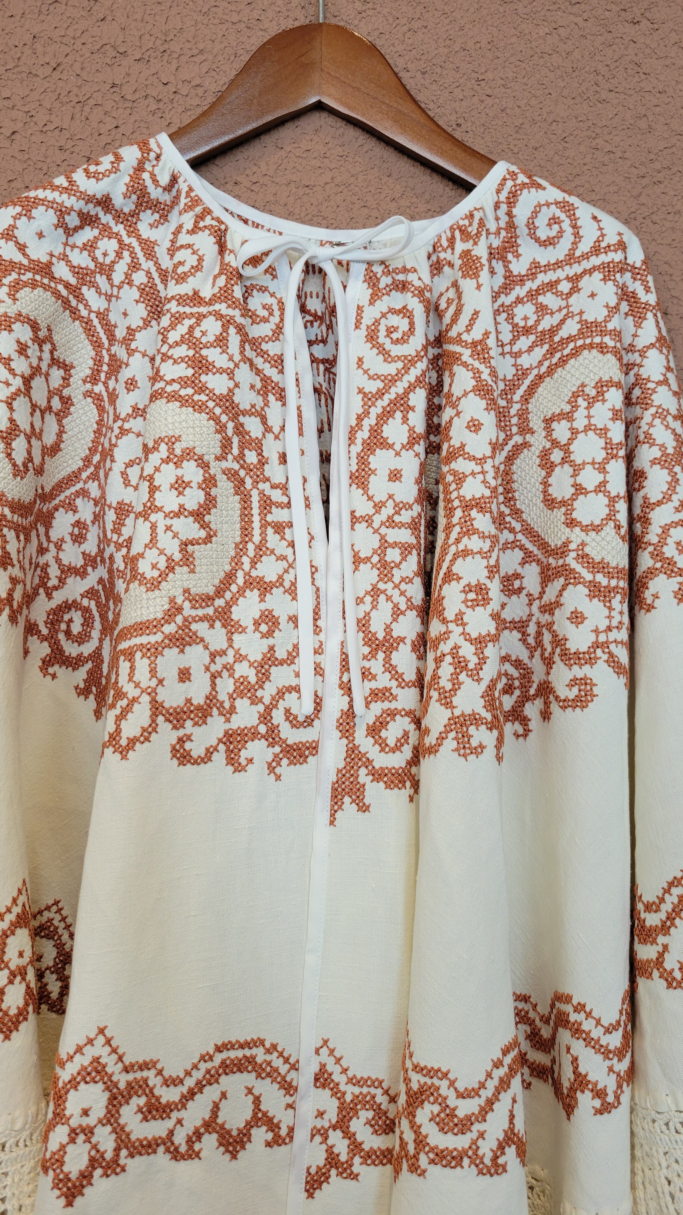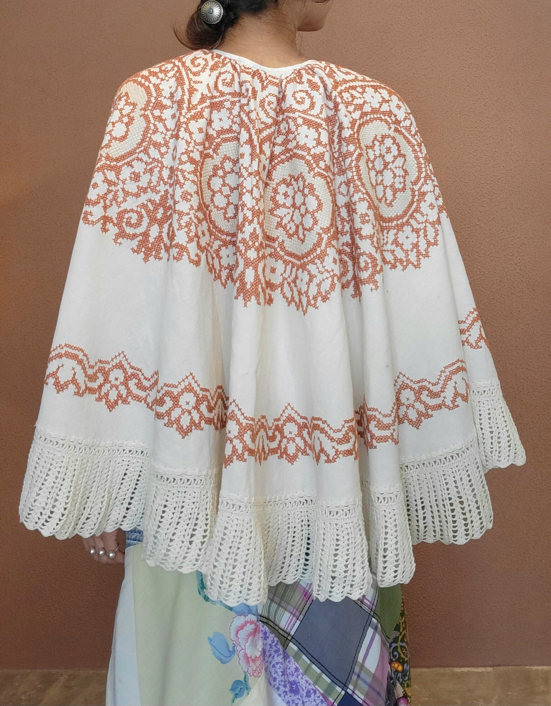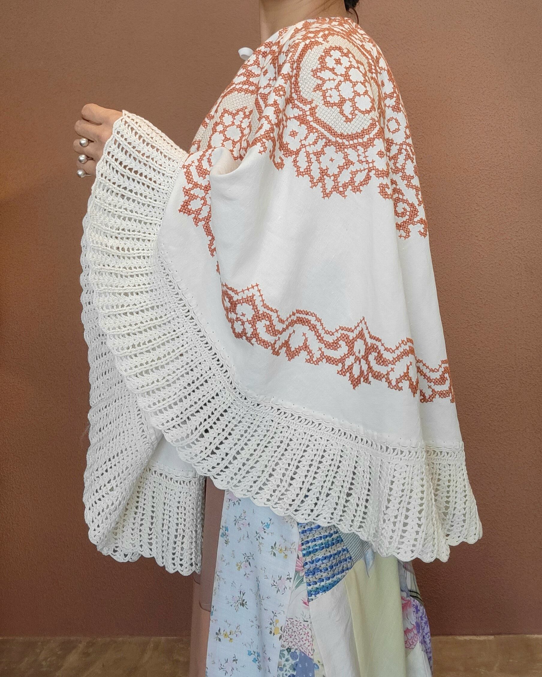 ヴィンテージの刺繍クロスを使用したリメイクケープ。素材表記はありませんがコットンのようです。やや地厚のしっかりした素材感です。裾のクロシェ編みのトリミングも素敵です。シンプルなスタイリングに変化が欲しい時など、さっと1枚羽織るだけでがらりと雰囲気の変わるプラスワンアイテムです。*小さなシミが5-6ヶ所ございます。画像でご確認ください。着用時にはドレープに隠れ目立つものではありませんが、こちらは古着、ヴィンテージに慣れていらっしゃる方へおすすめいたします。