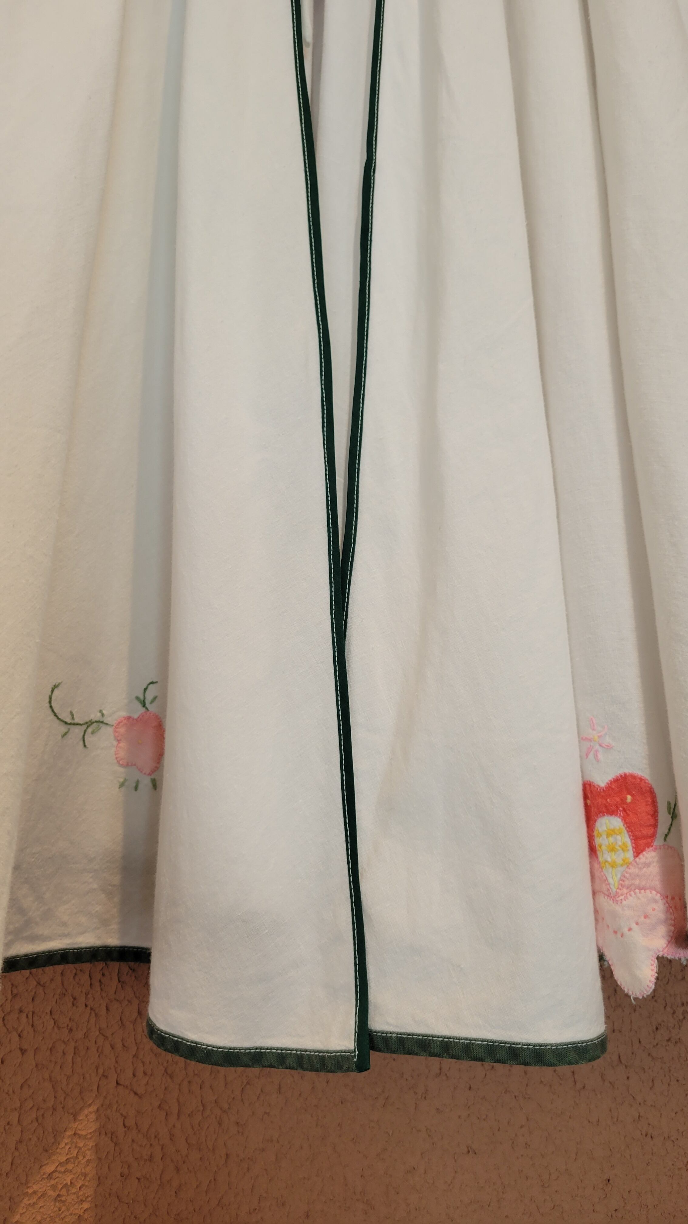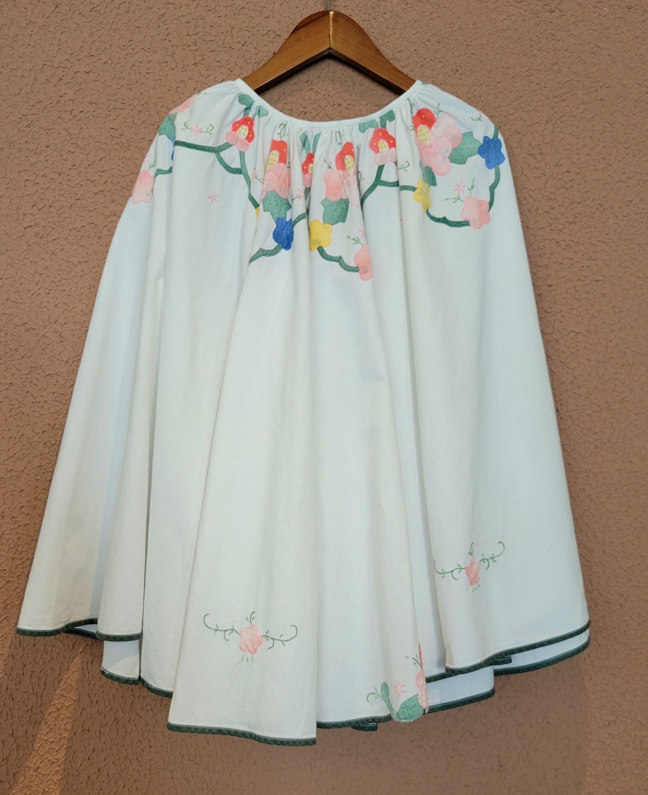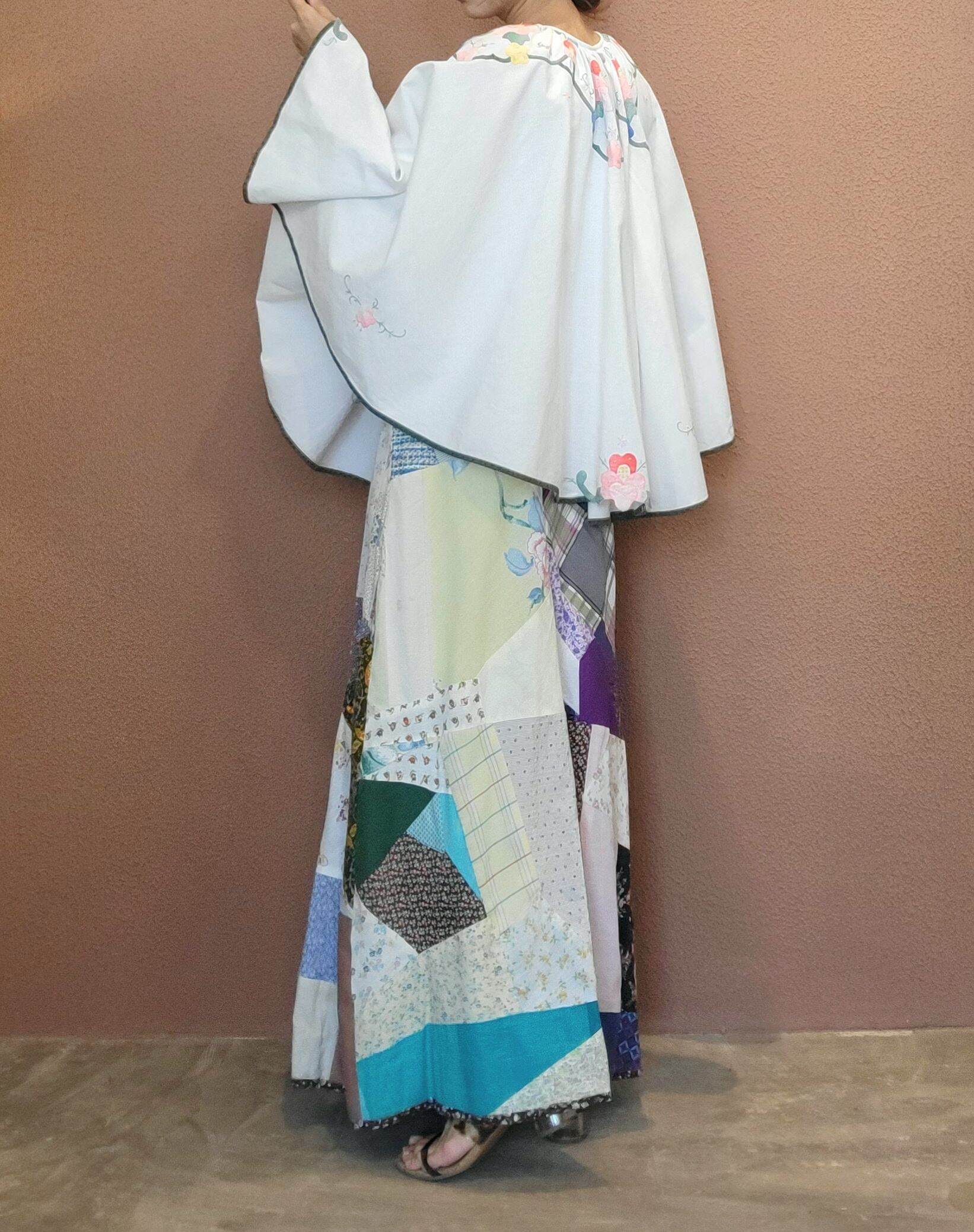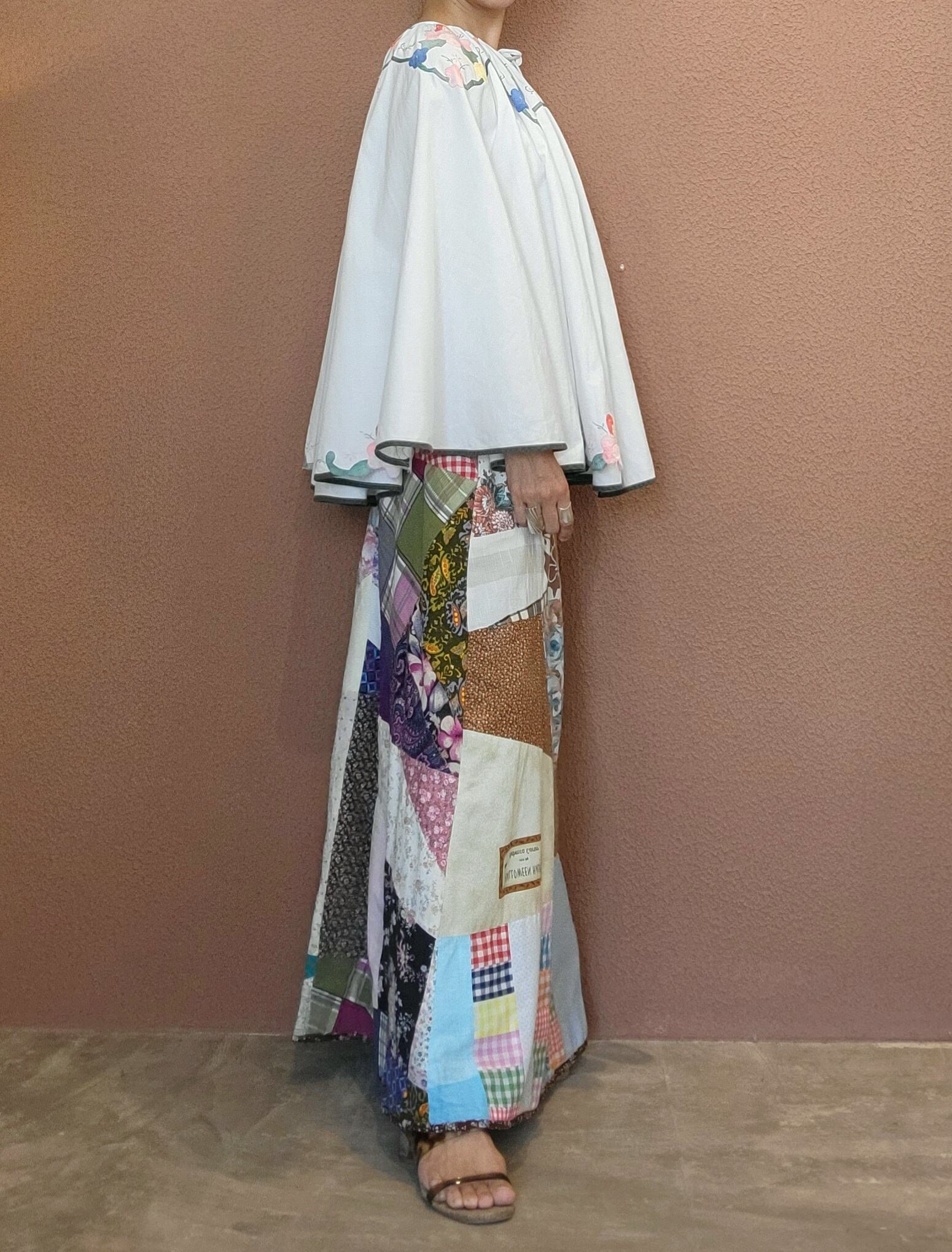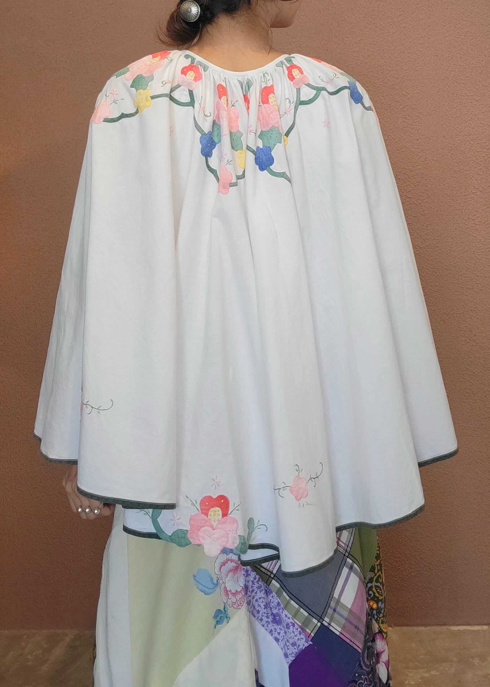 アップリケがあしらわれたヴィンテージクロスを使用したリメイクケープ。素材表記はありませんがコットンです。立体的なアップリケが可愛らしく、たっぷりの丈感でトップス感覚で着られます。シンプルなスタイリングにプラスするだけでがらりと雰囲気を変えられます。