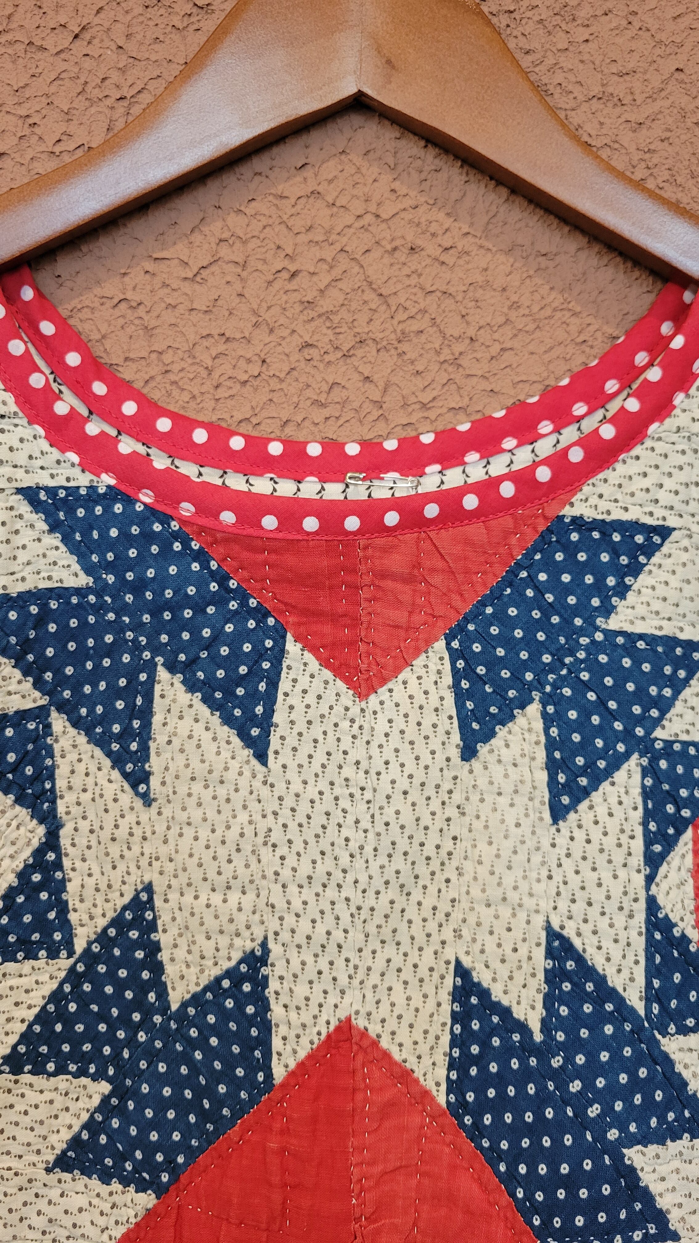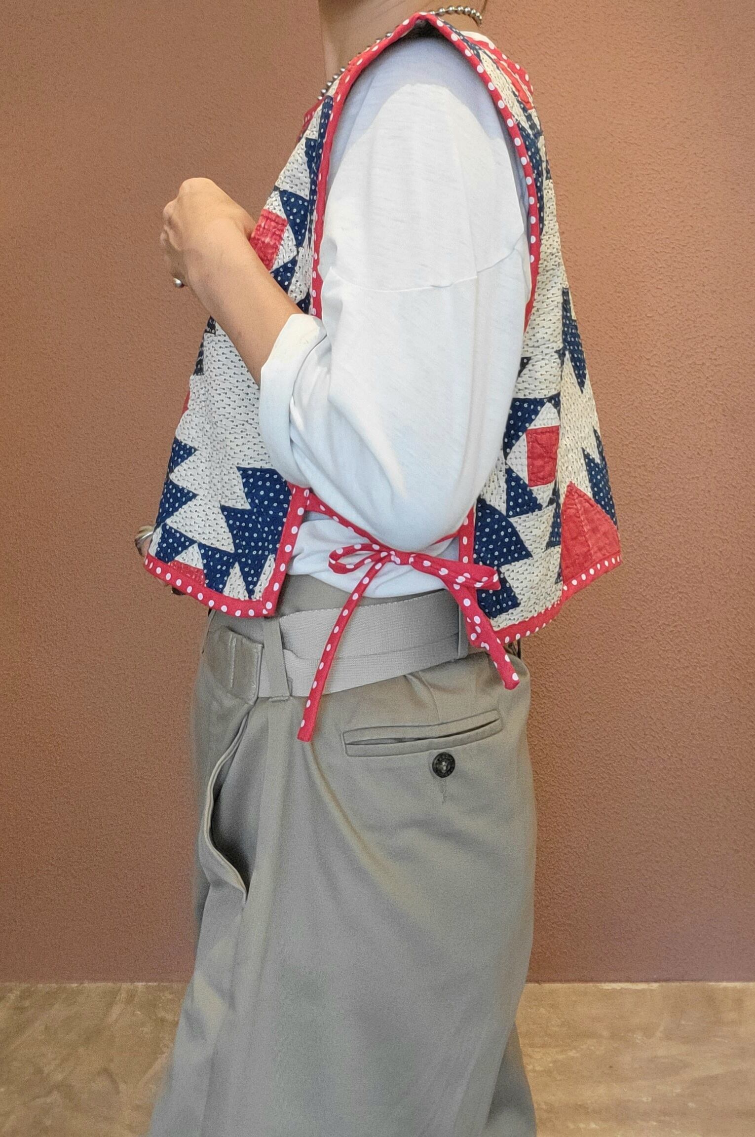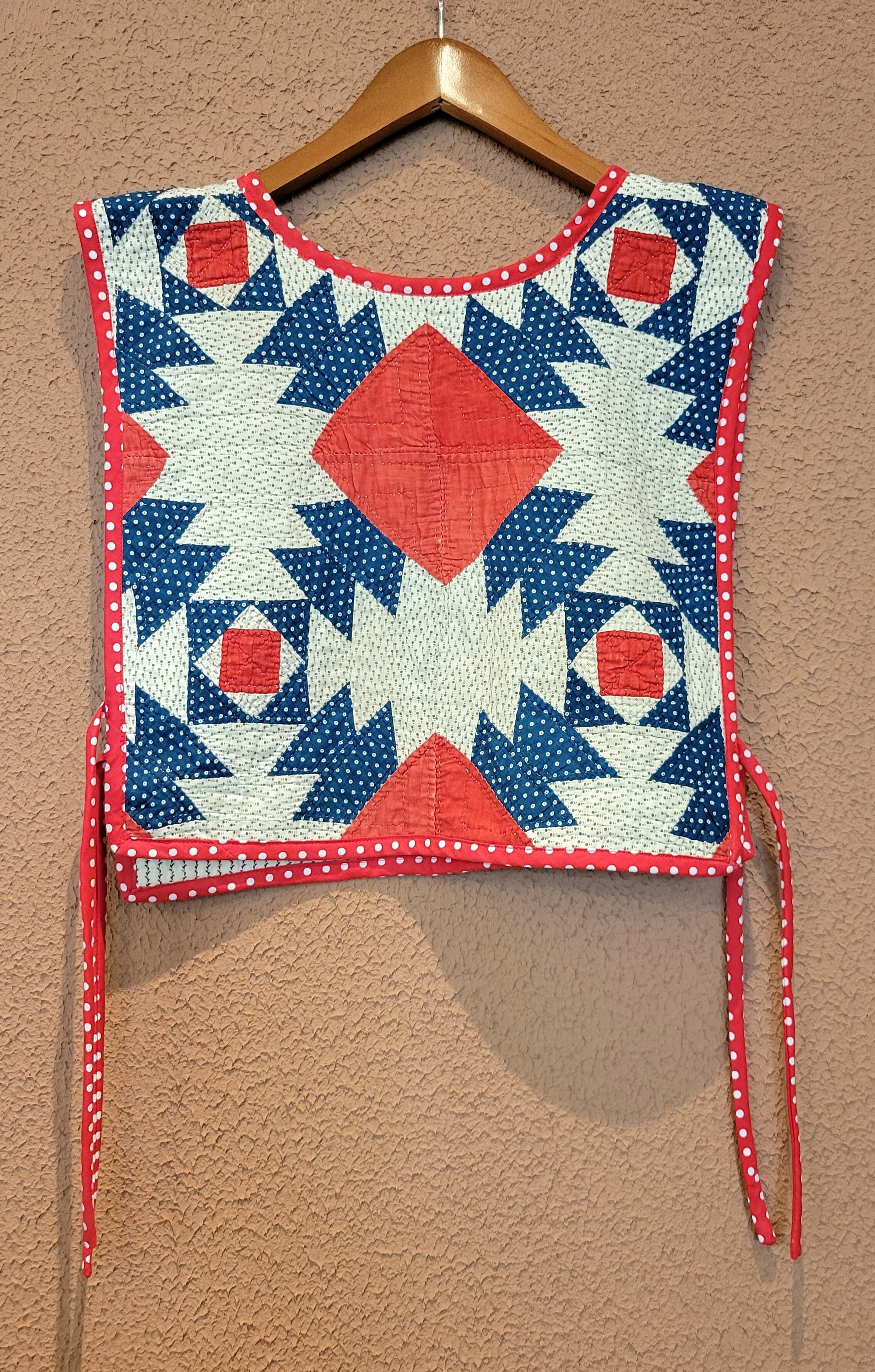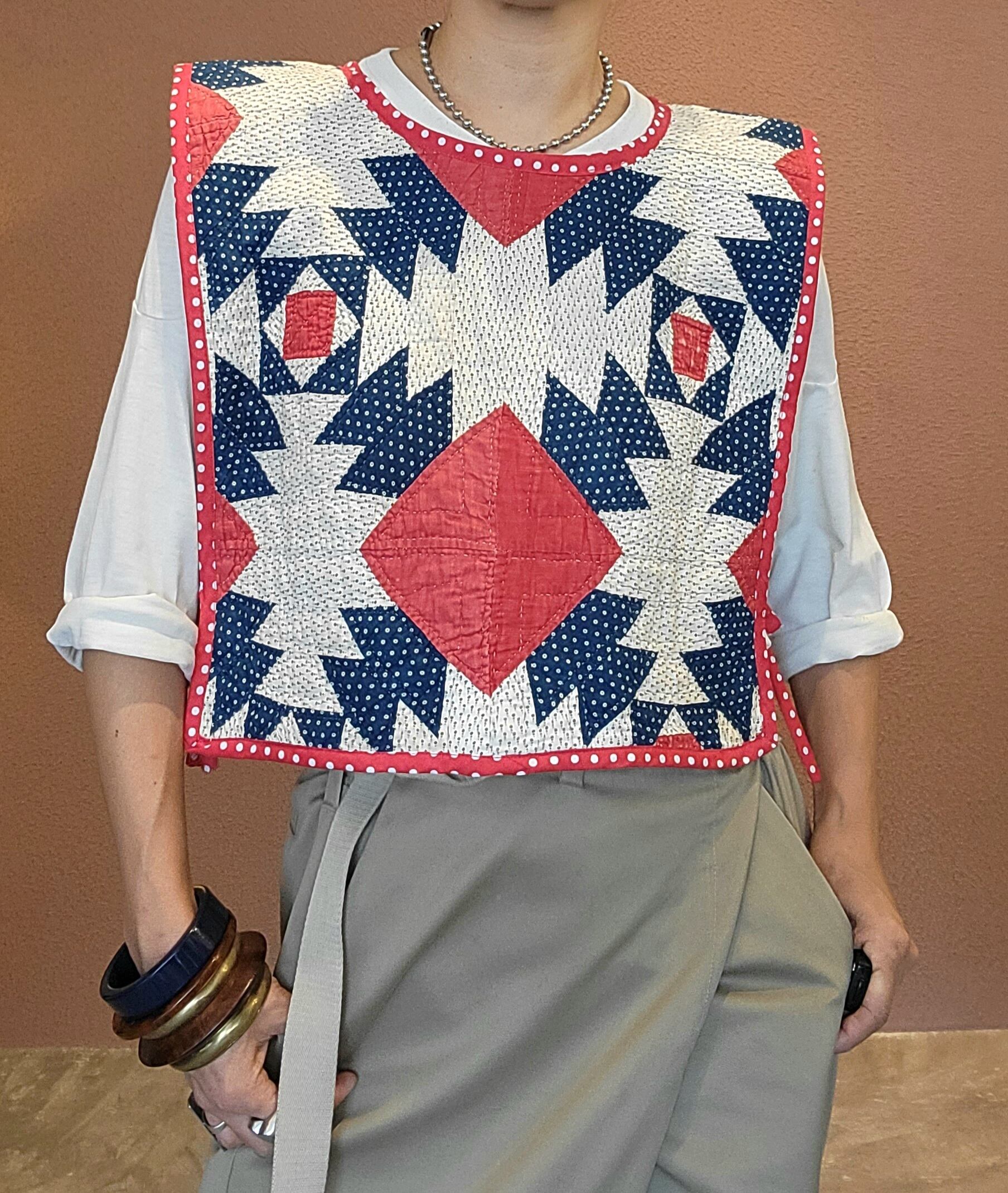 ヴィンテージのパッチワークキルト生地を使用したリメイクビブ。素材はコットンです。サイドオープン(左右紐付き)。短めの丈感はハイウエストのボトムスとの相性ぴったりです。ブラウスやTシャツの上にはもちろん、ワンピースにプラスするのもおすすめです。