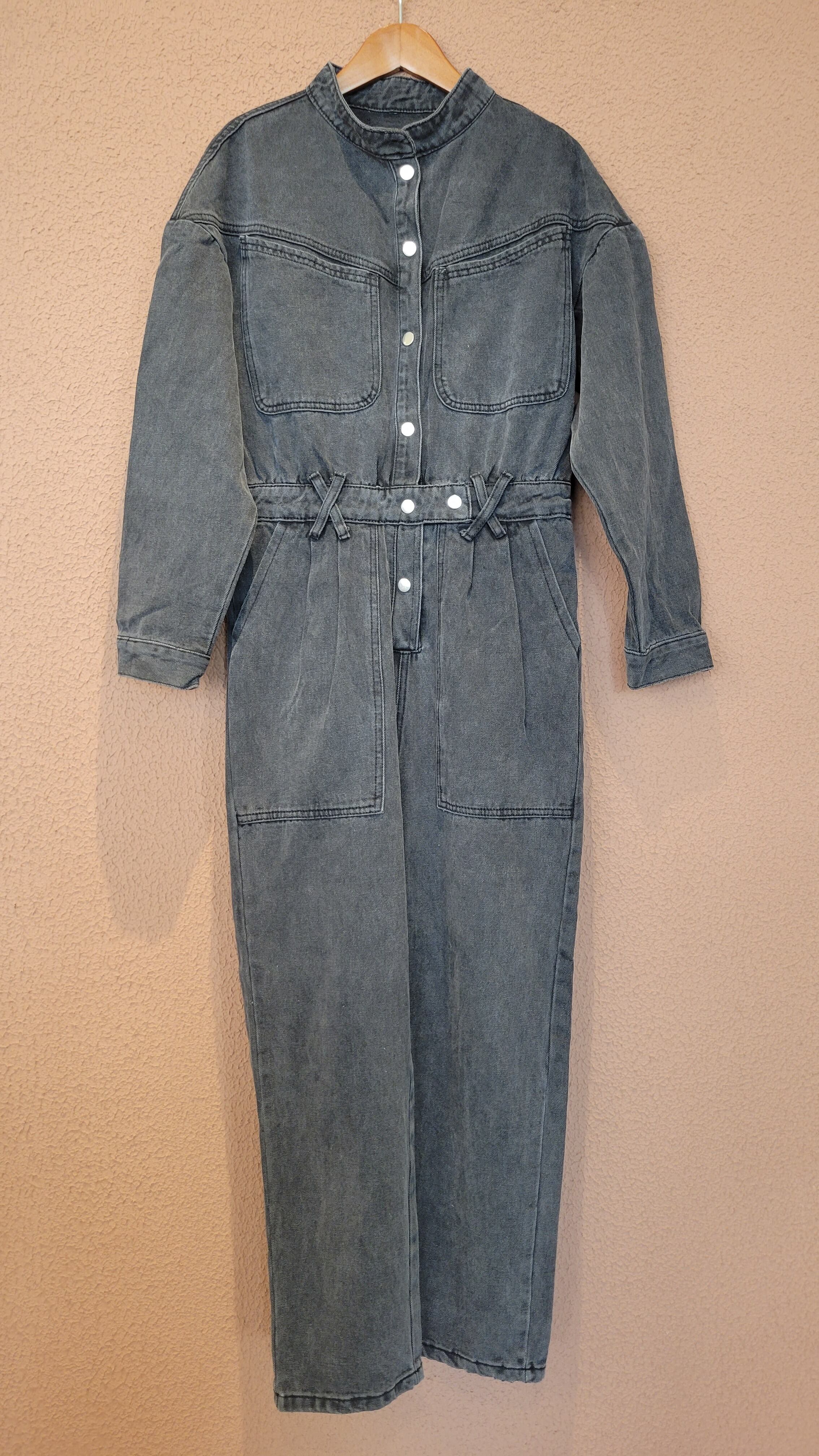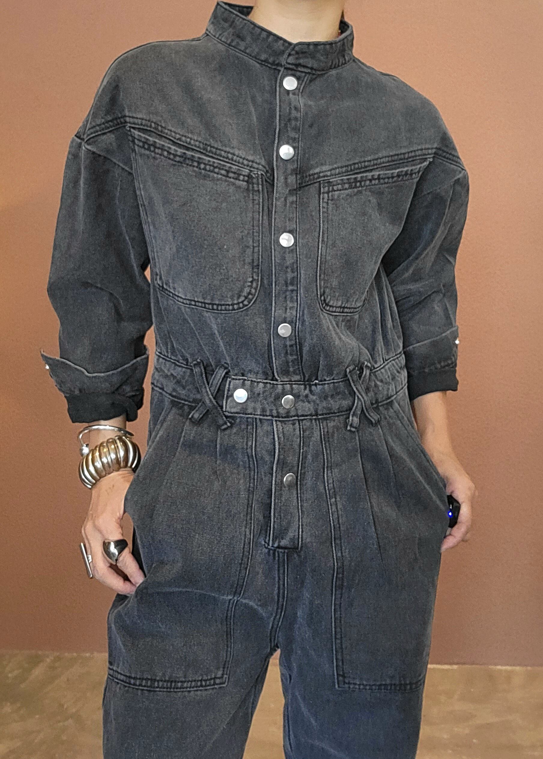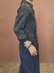 ヴィンテージのブラックデニムジャンプスーツ。珍しいスタンドカラーがお顔周りをすっきり見せてくれます。タイトすぎずゆるすぎず、ほどよいサイズ感で1枚できれいに仕上がります。*実際のお色は着用画像に近いです。