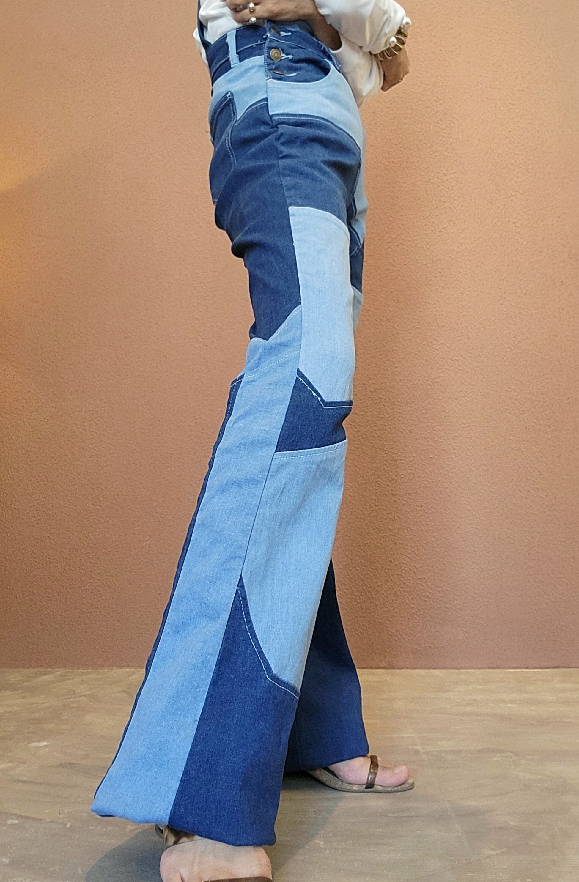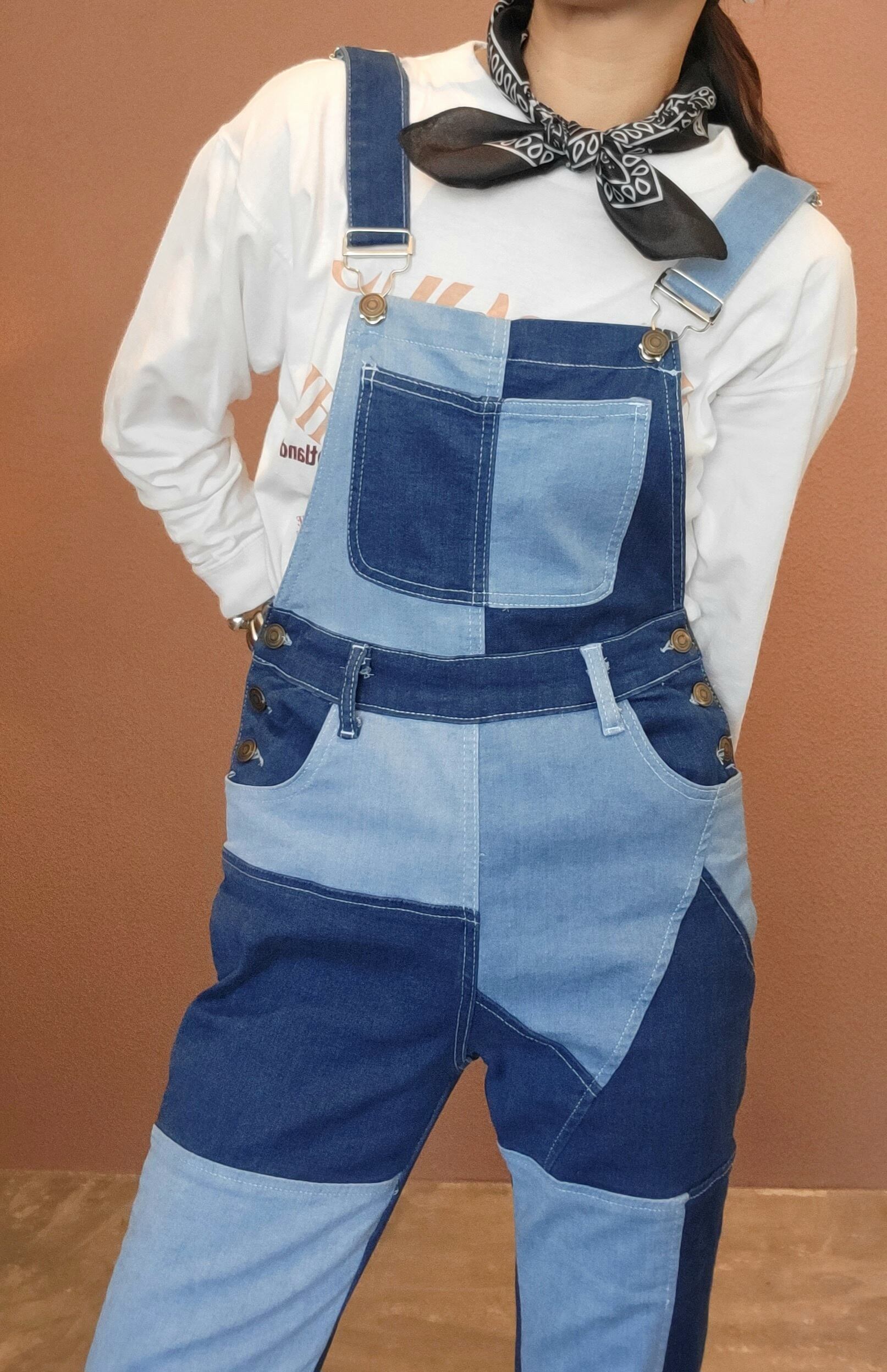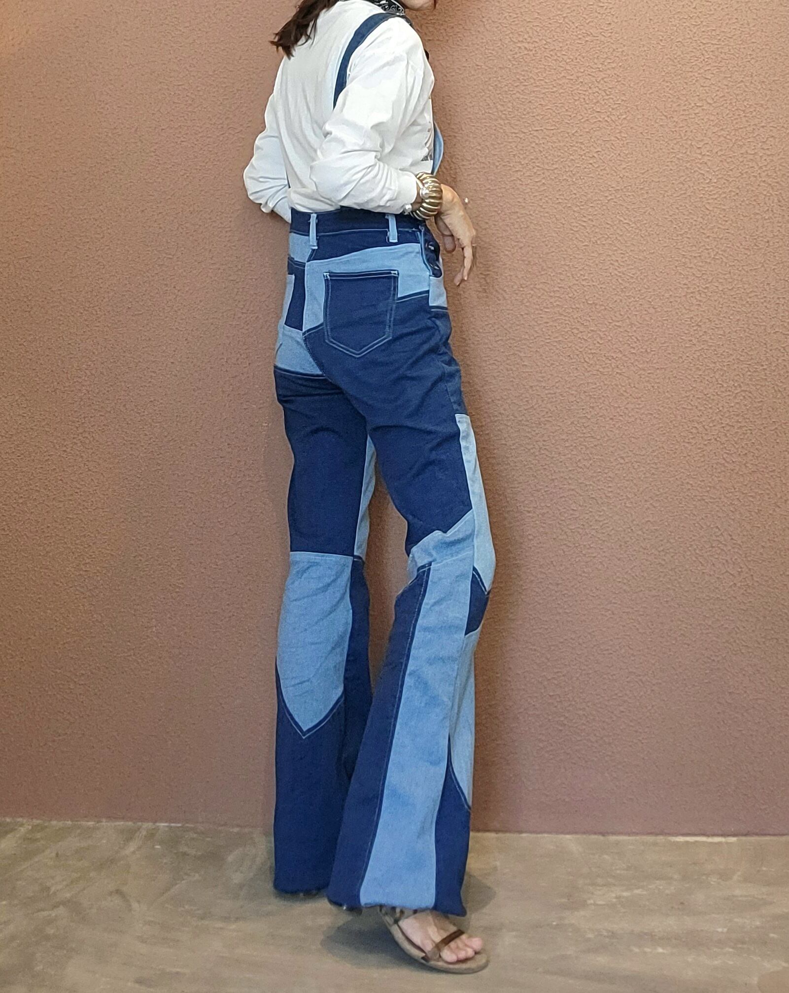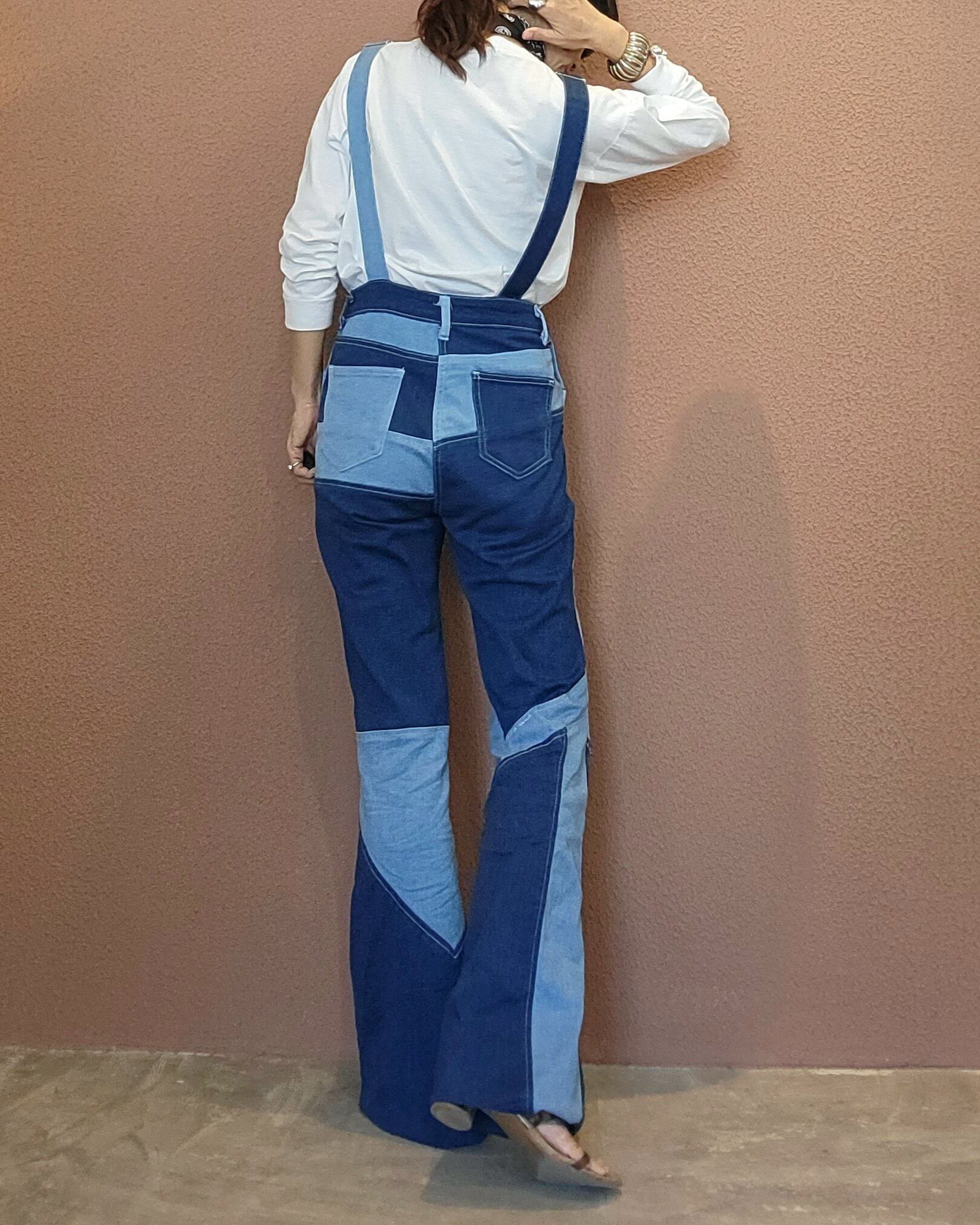 パッチワークの濃淡が可愛い個性的なデニムサロペット。ストレッチデニムで楽な着心地です。きれいなフレアシルエットで脚長見え、スタイルアップが叶います。