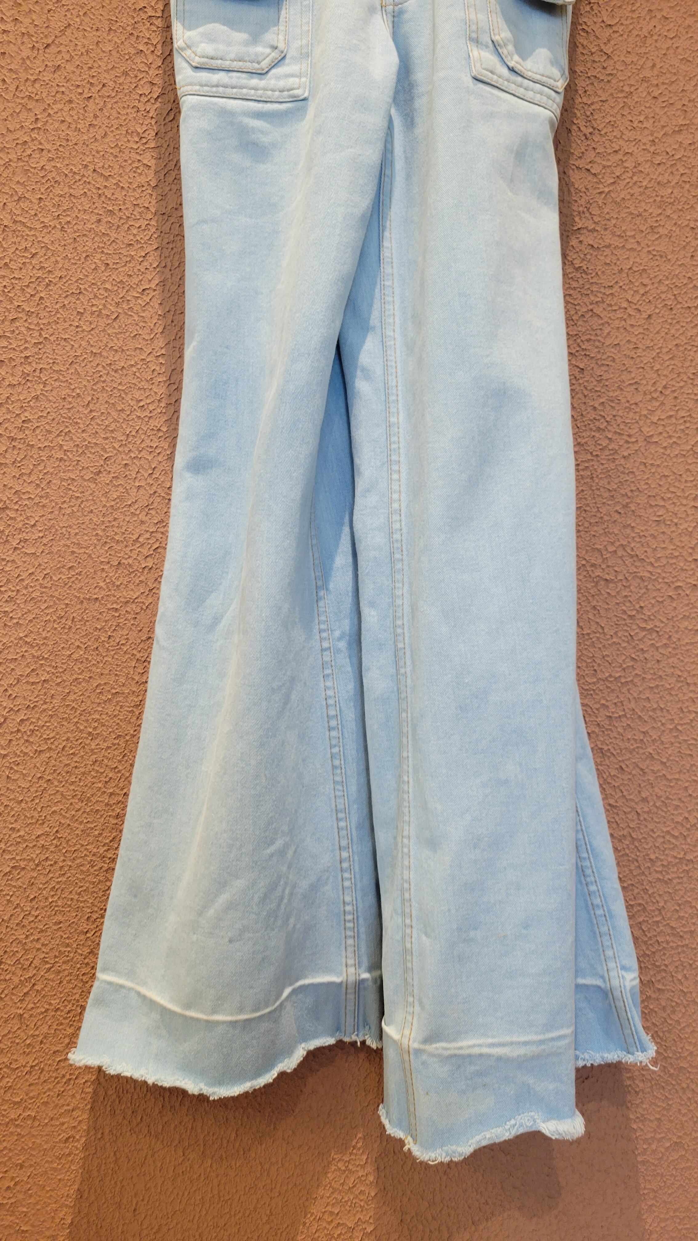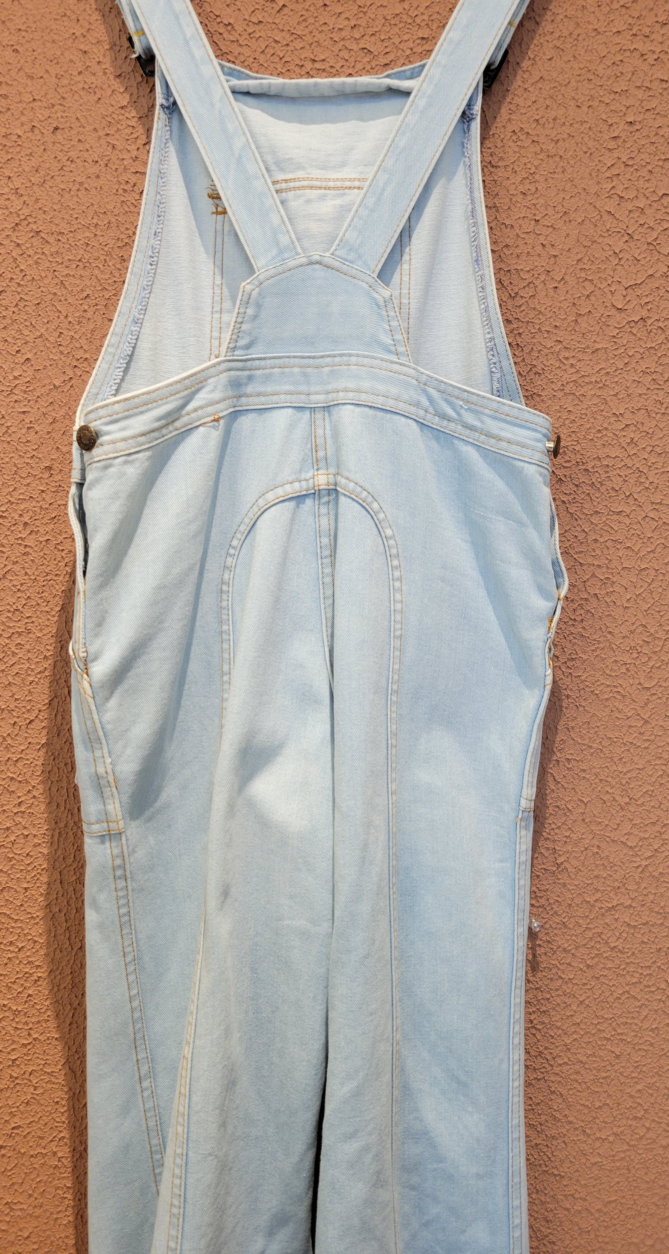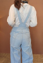 ヴィンテージのデニムサロペット。ややしっかりめのデニムで伸縮性はありません。ワイド&フレアのきれいなシルエットが脚長見え、スタイルアップを叶えます。