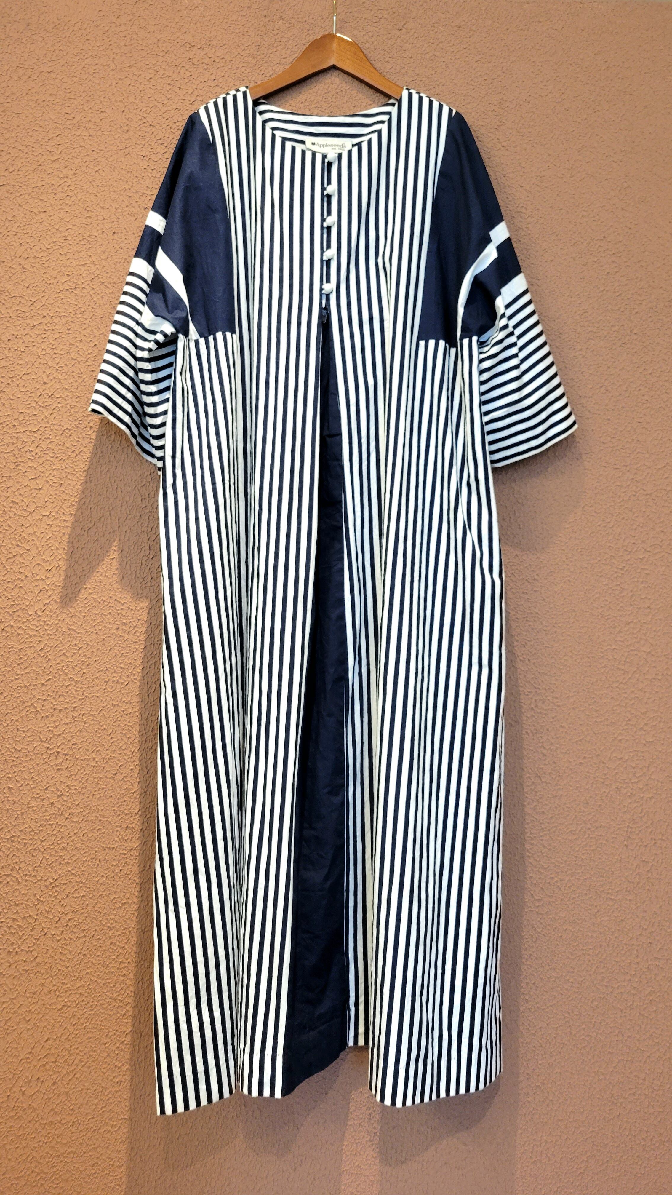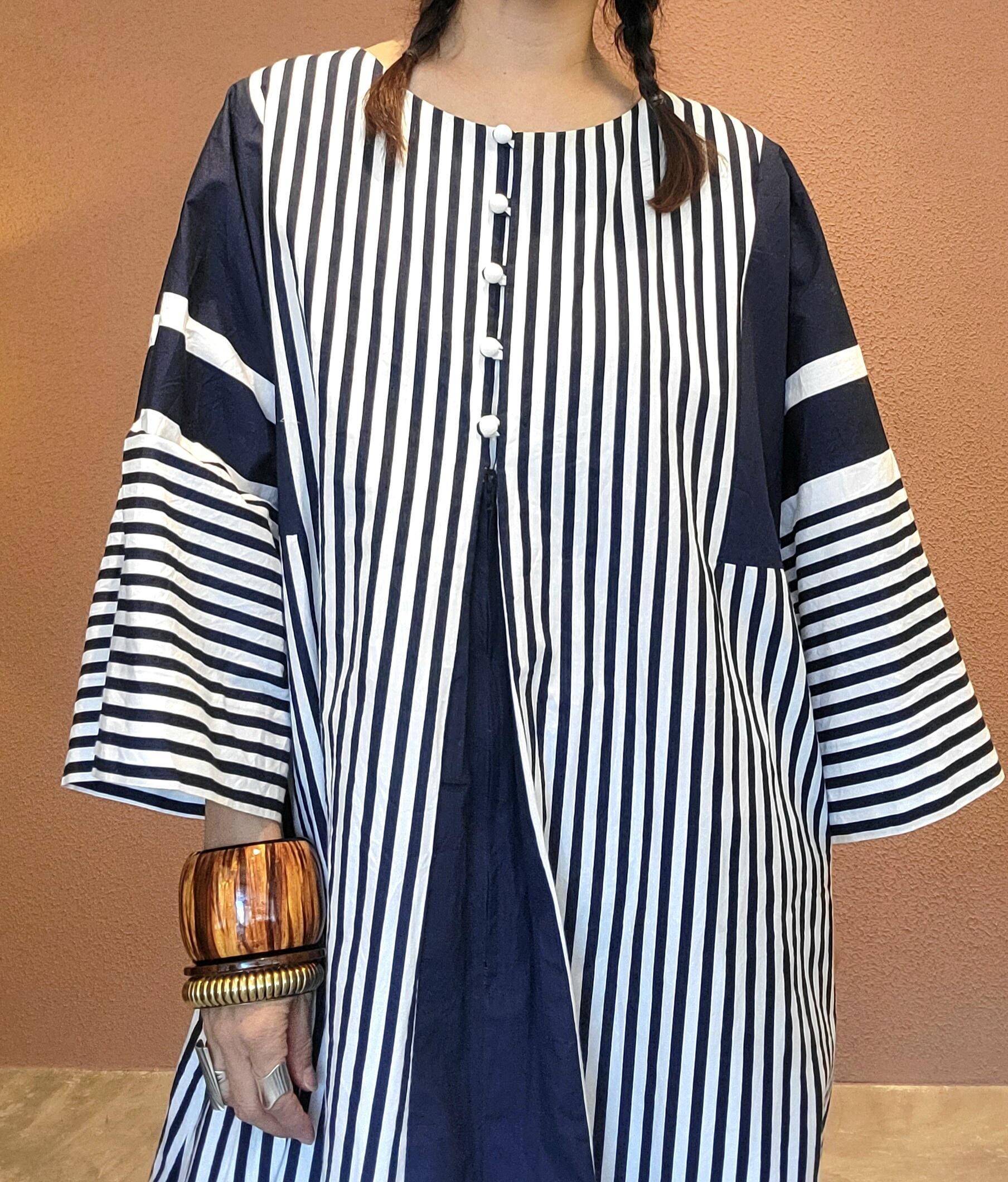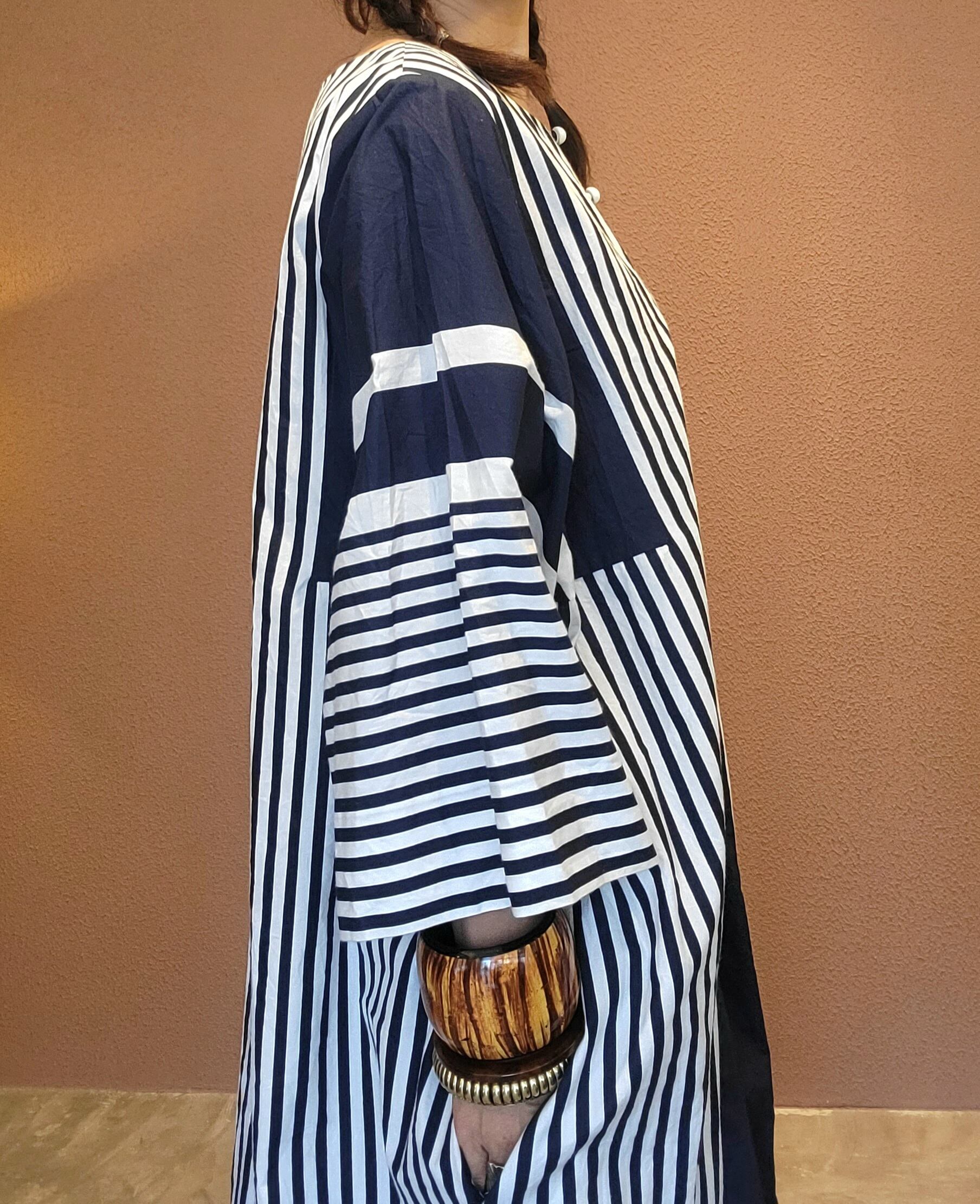 ヴィンテージのカフタンタイプのマキシワンピース。素材は張りのあるコットンです。肌にまとわりつかずさらりとした素材感です。締め付け感無くゆとりのあるサイジングなので秋冬はインナーニットを着てもシルエットが崩れません。ストレスフリーなデザイン、1枚で仕上がるワンピースです。