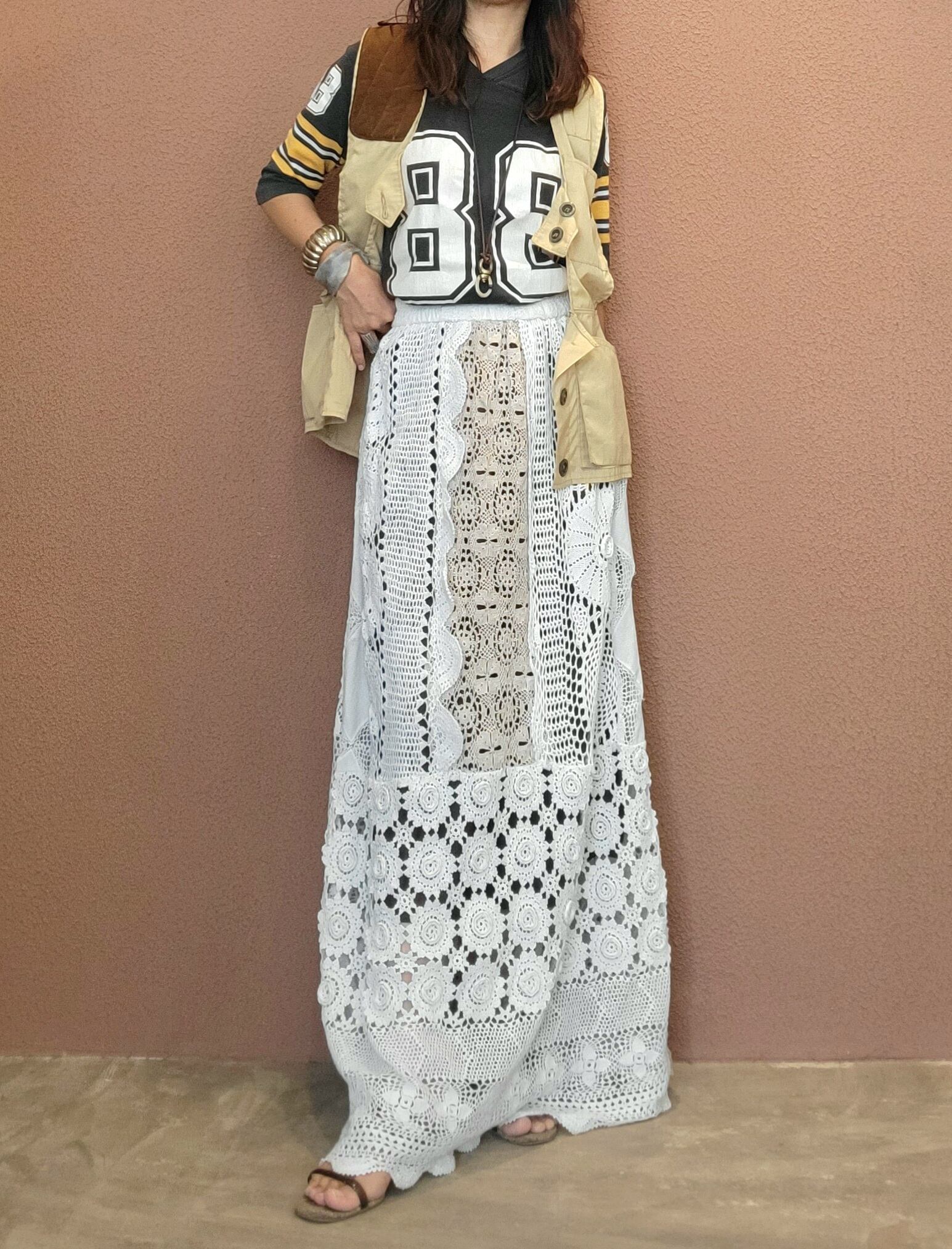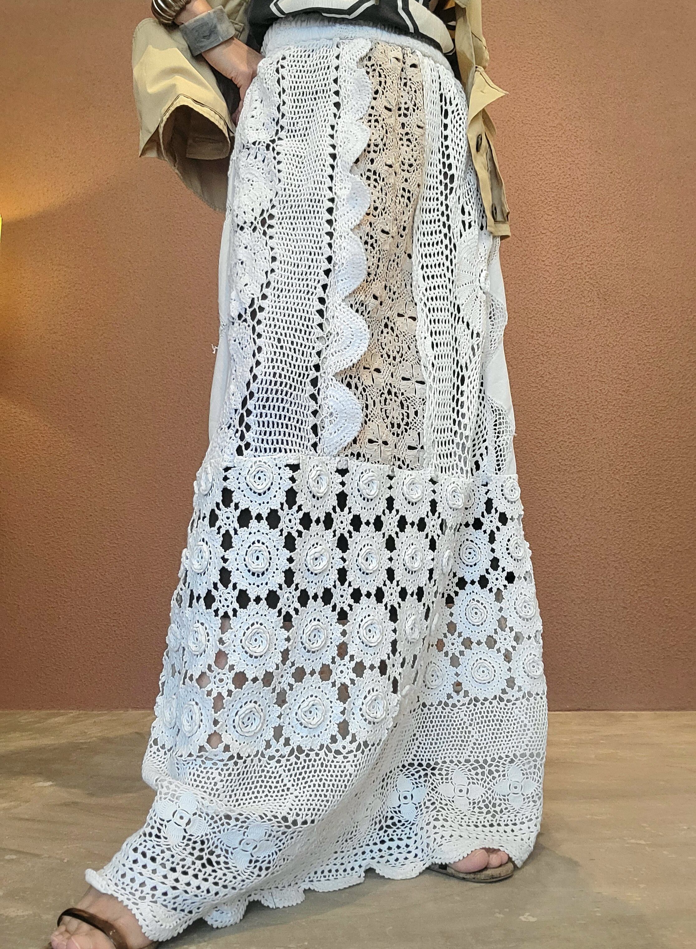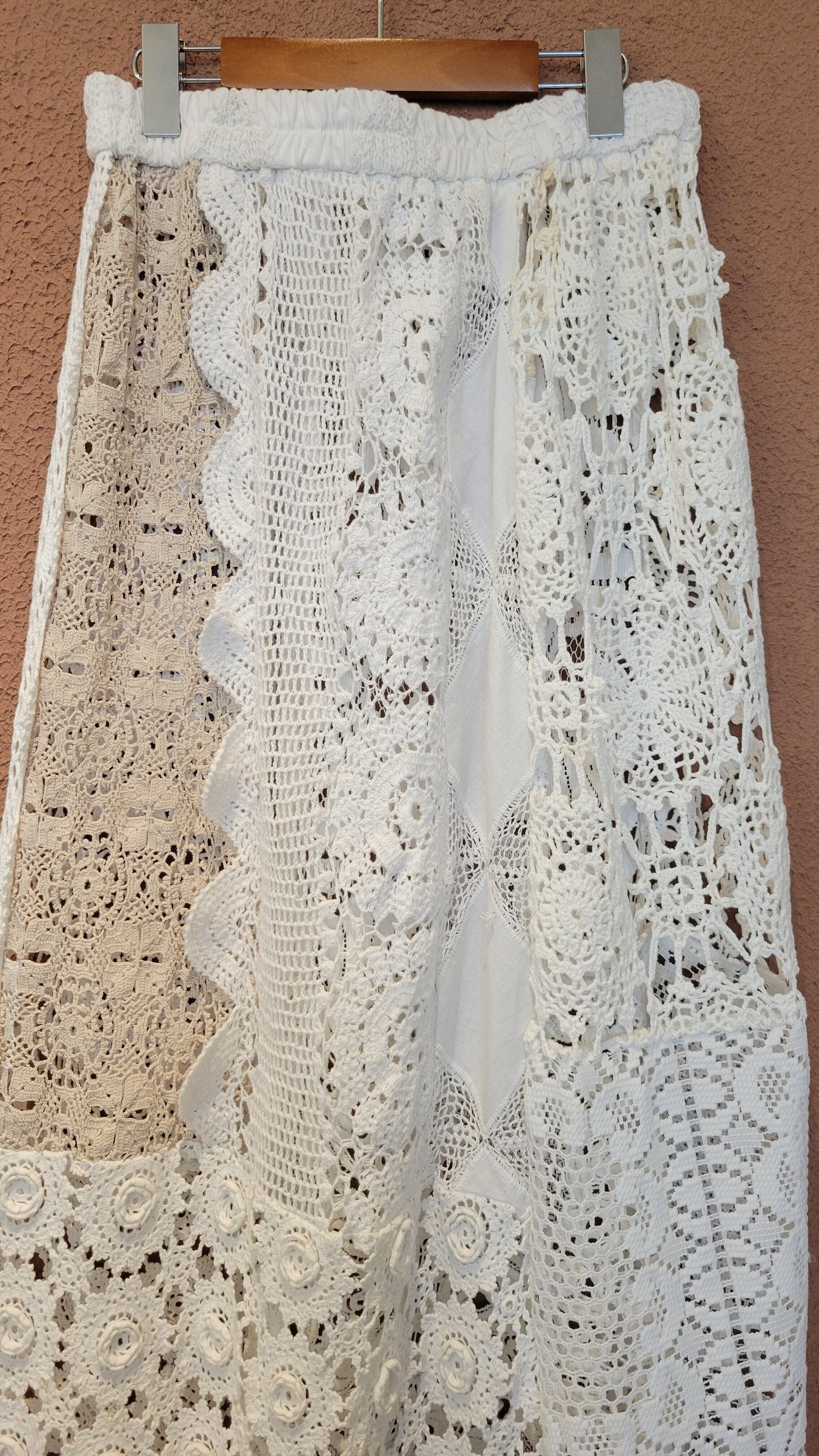 何枚ものヴィンテージクロシェとレースを繋ぎ合わせたリメイクのマキシスカート。ウエストゴムです。裏地は付いていません。異なるクロシェやレースの柄を存分に楽しめる存在感のあるスカートです。