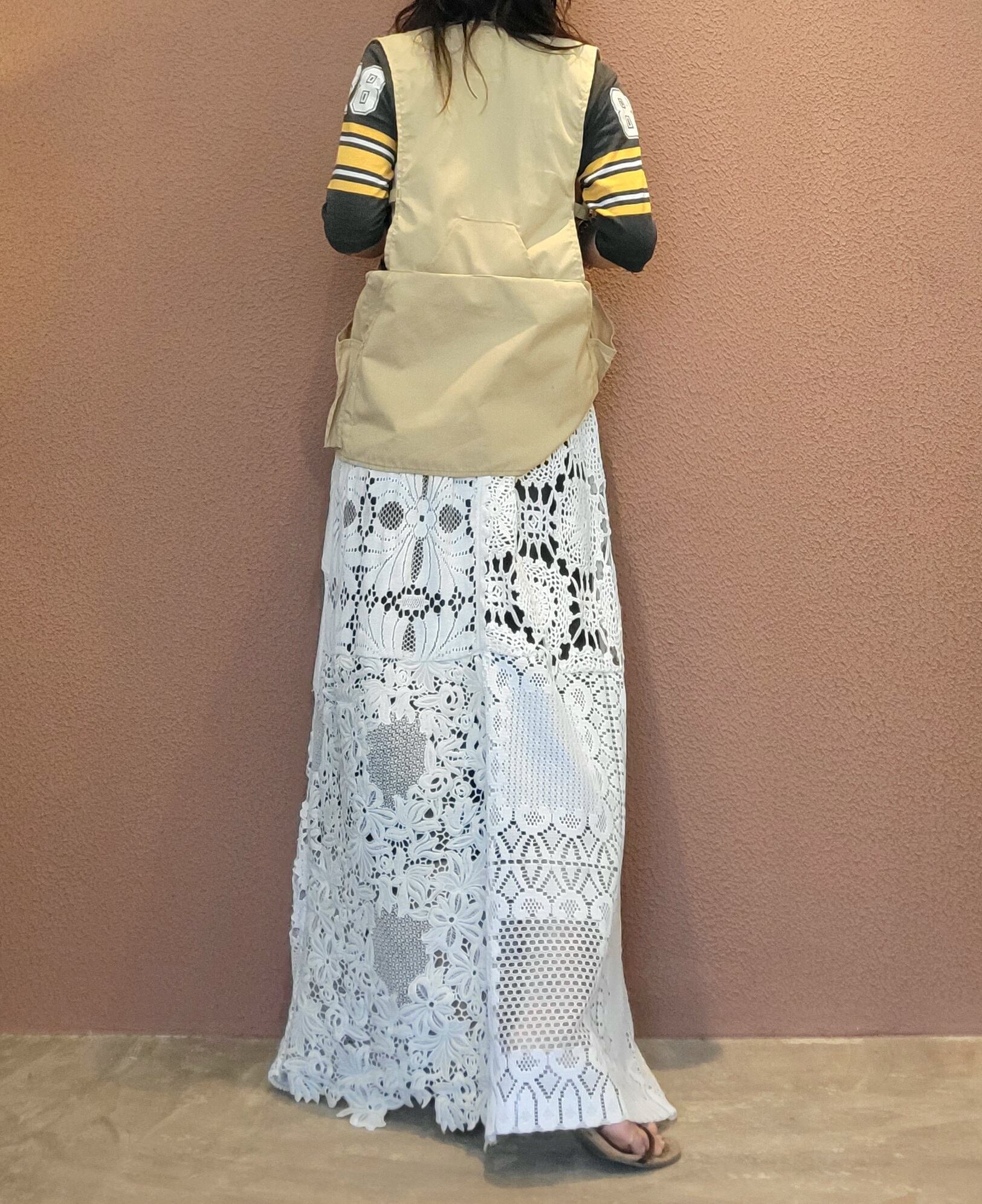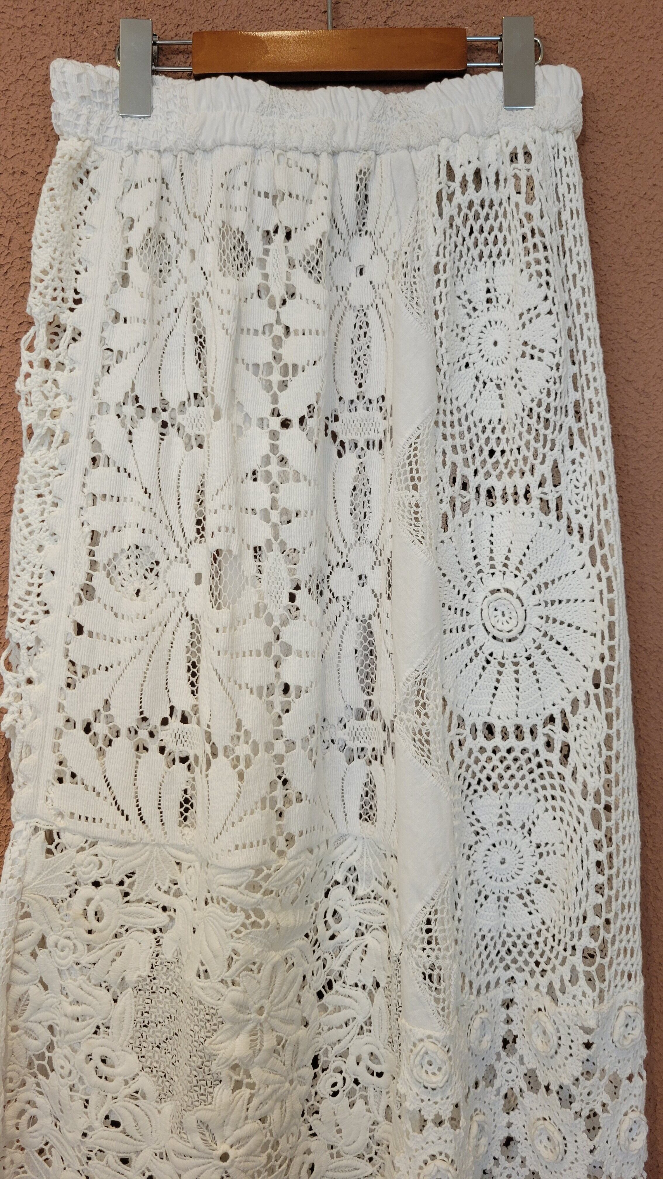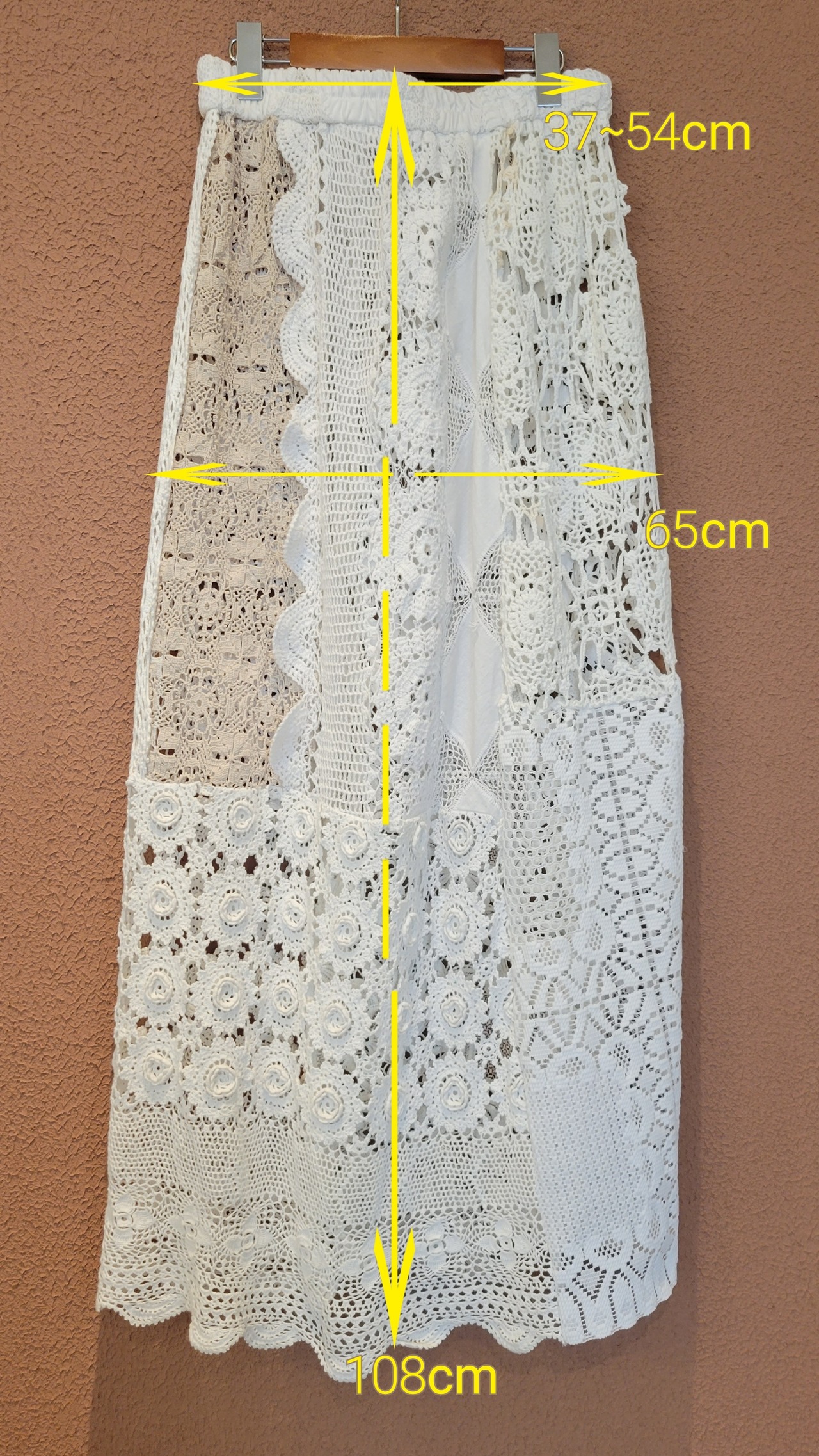 何枚ものヴィンテージクロシェとレースを繋ぎ合わせたリメイクのマキシスカート。ウエストゴムです。裏地は付いていません。異なるクロシェやレースの柄を存分に楽しめる存在感のあるスカートです。