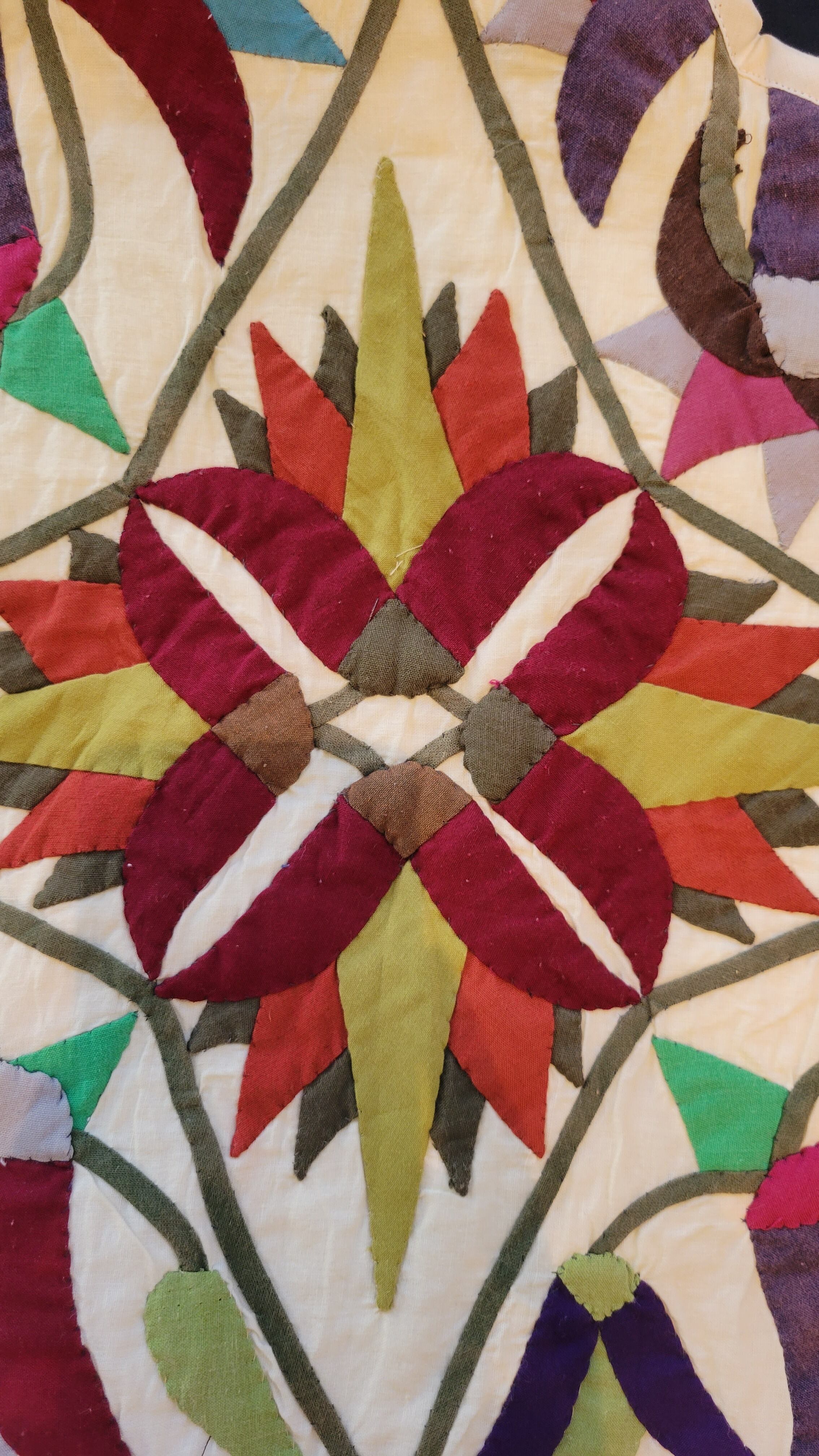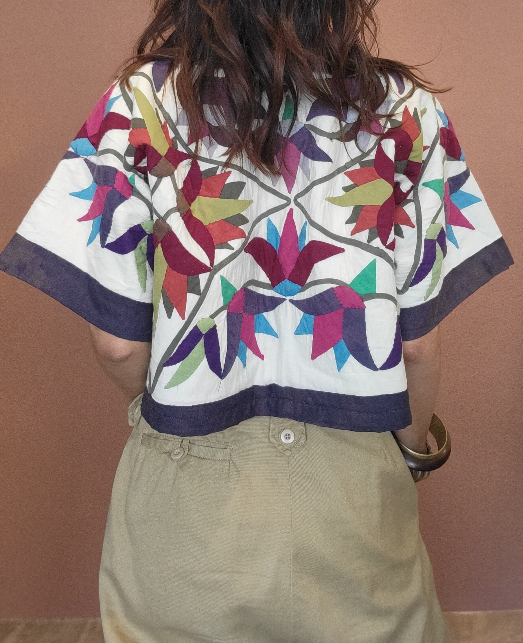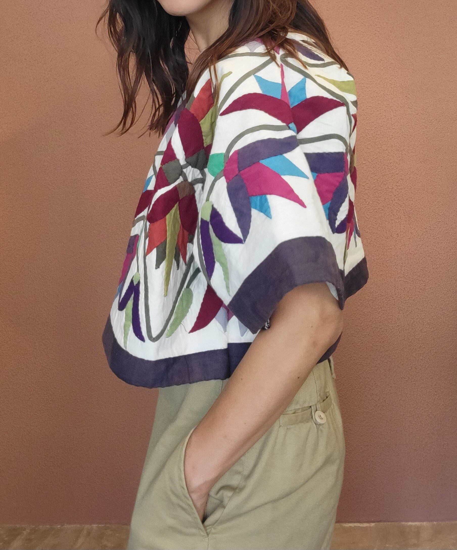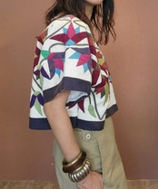 ヴィンテージのパッチワークキルトを使用したリメイクトップス。素材はコットン、やや厚手の張りのあるキルトです。前後どちらでも着用可能。広めの身幅とドルマンスリーブが幅広いサイズに対応。インナーに薄手のニットも着られるサイズ感です。ヴィンテージキルトにしては珍しい渋めの色合いで大人っぽくクールな印象。立体的な草花モチーフが美しく存在感のある1着です。