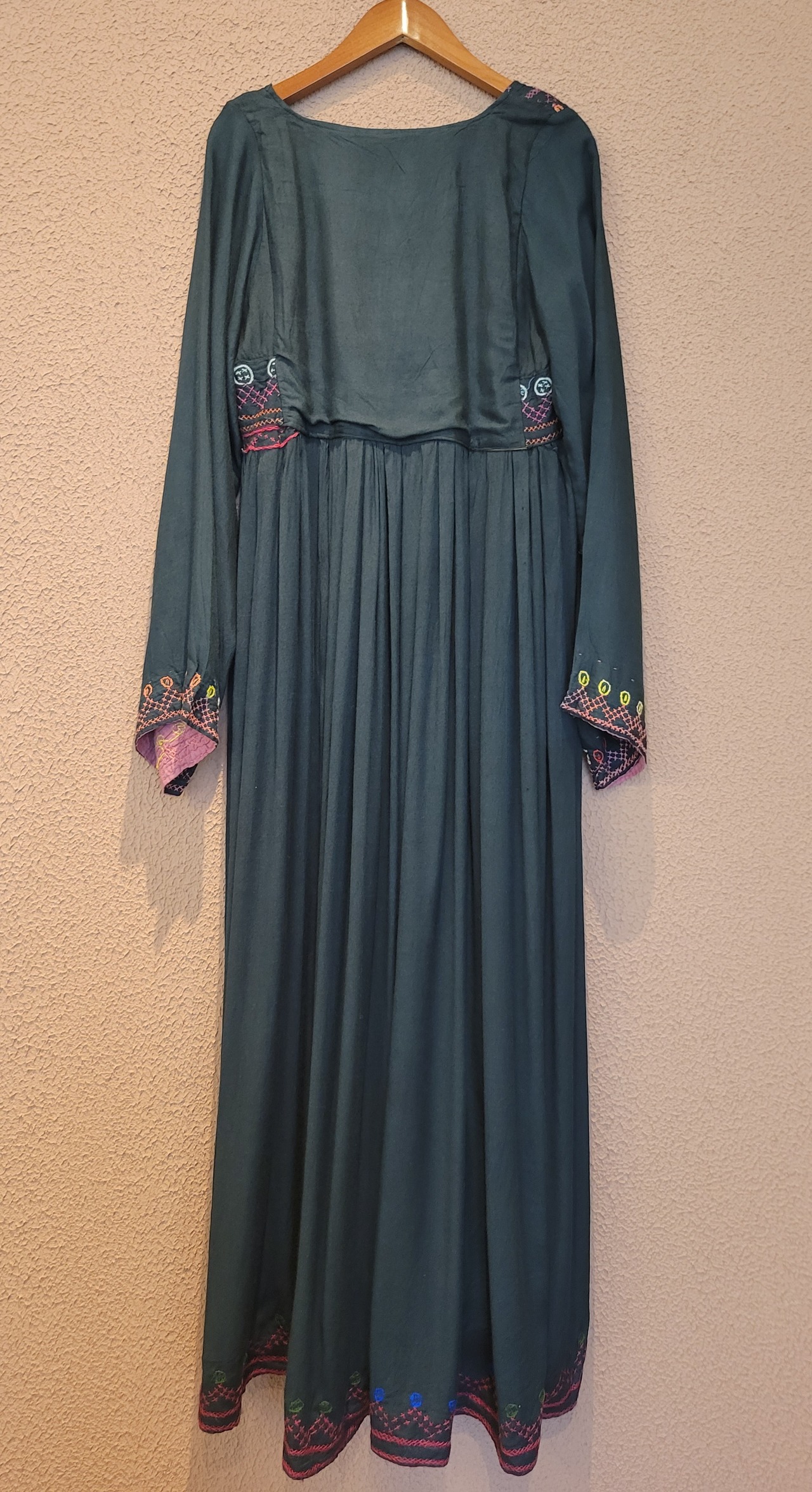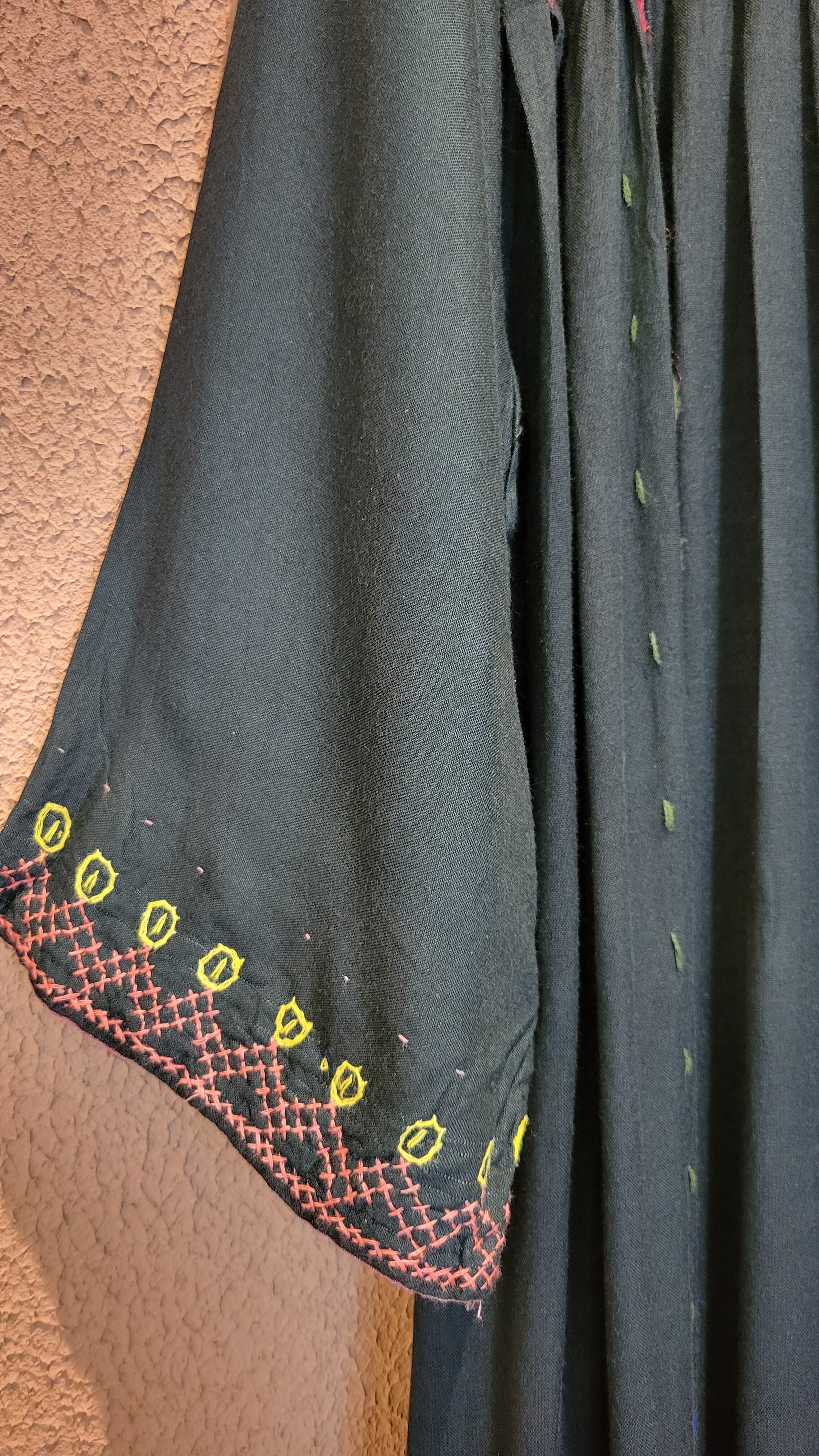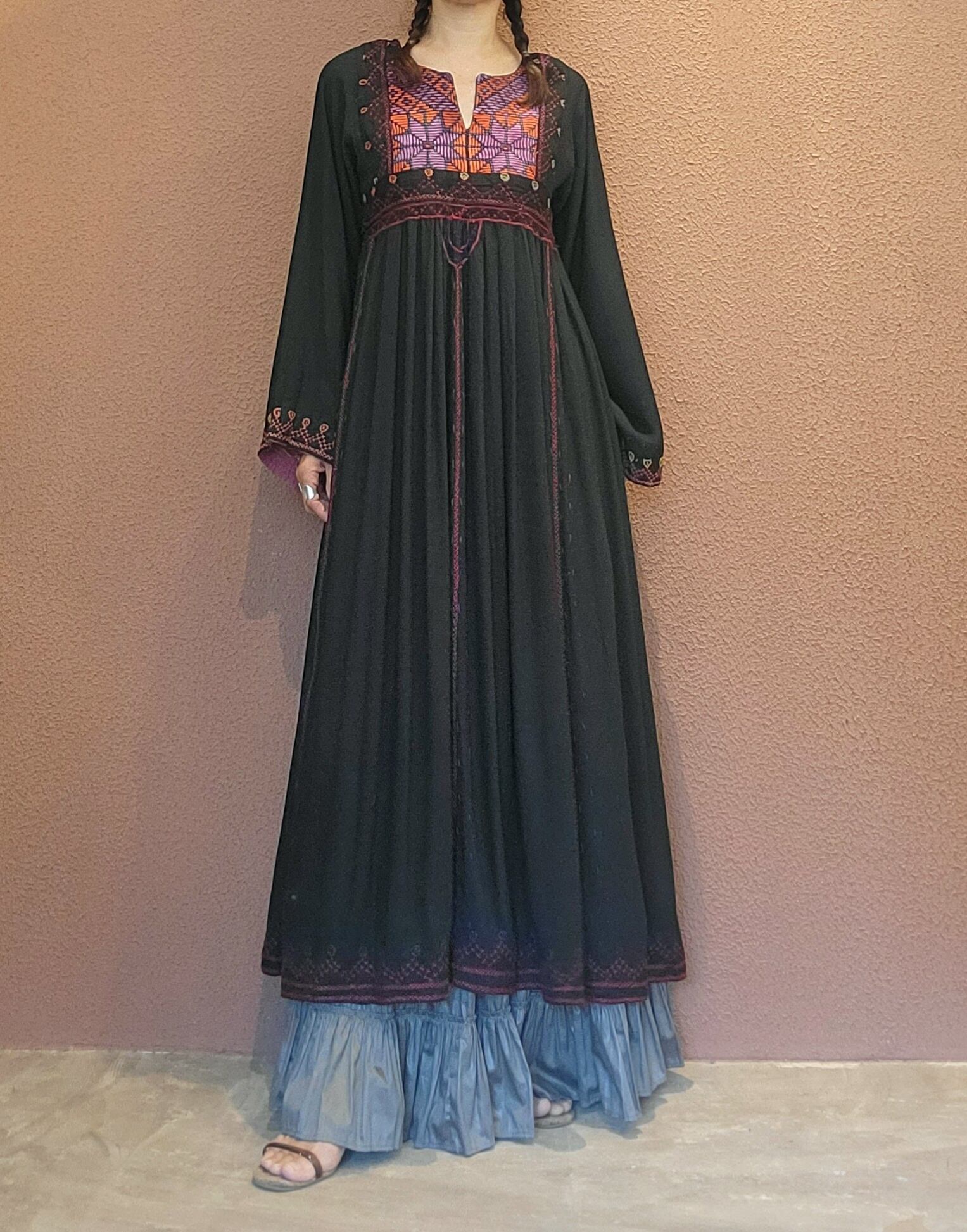 ヴィンテージのアフガンワンピース。素材表記はありませんがレーヨンのようです。肌触りの柔らかな落ち感のある素材です。年々入手困難になる稀少ななアフガンワンピース。黒地に落ち着いたカラーの刺繍が大人っぽい雰囲気の1枚です。