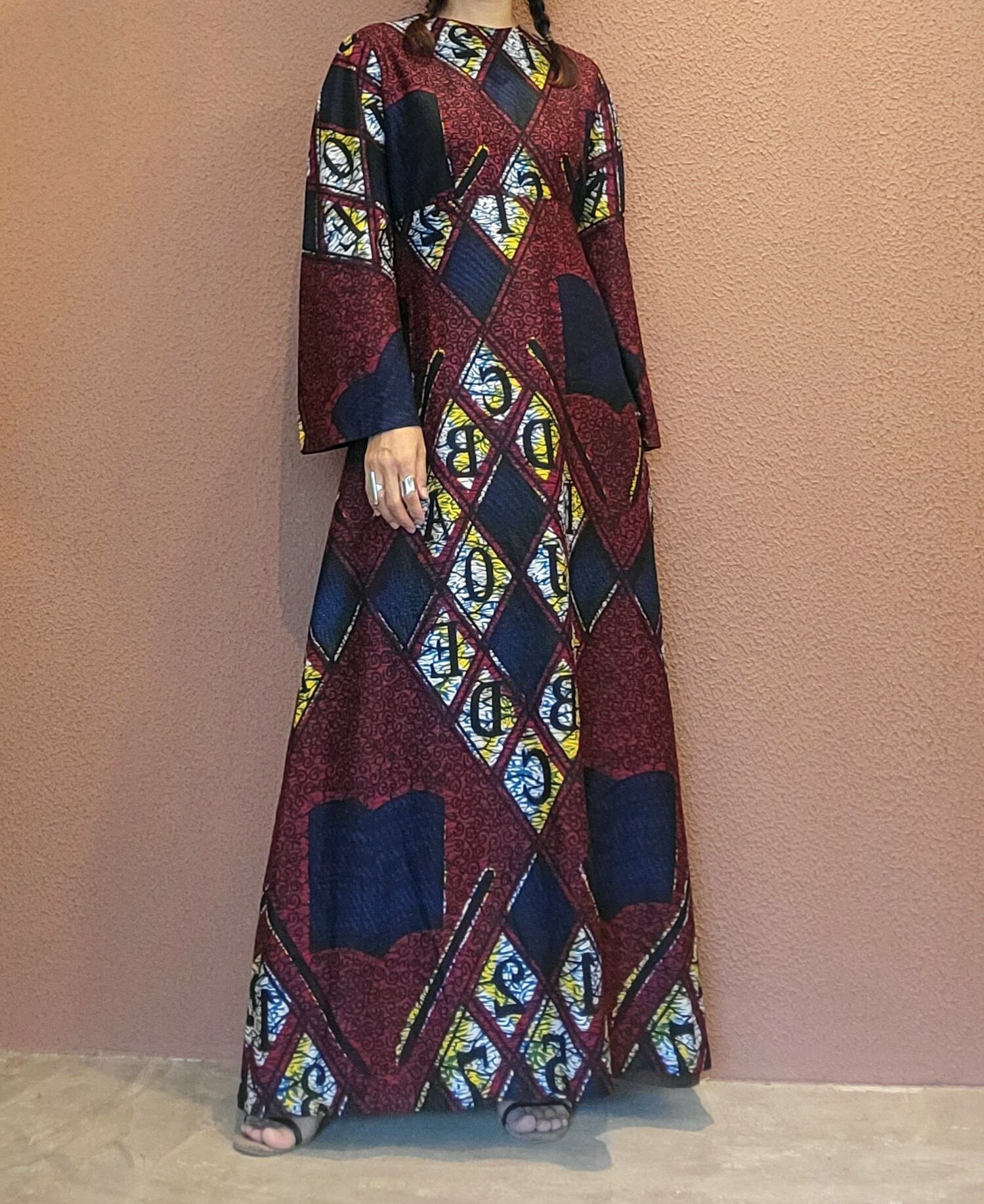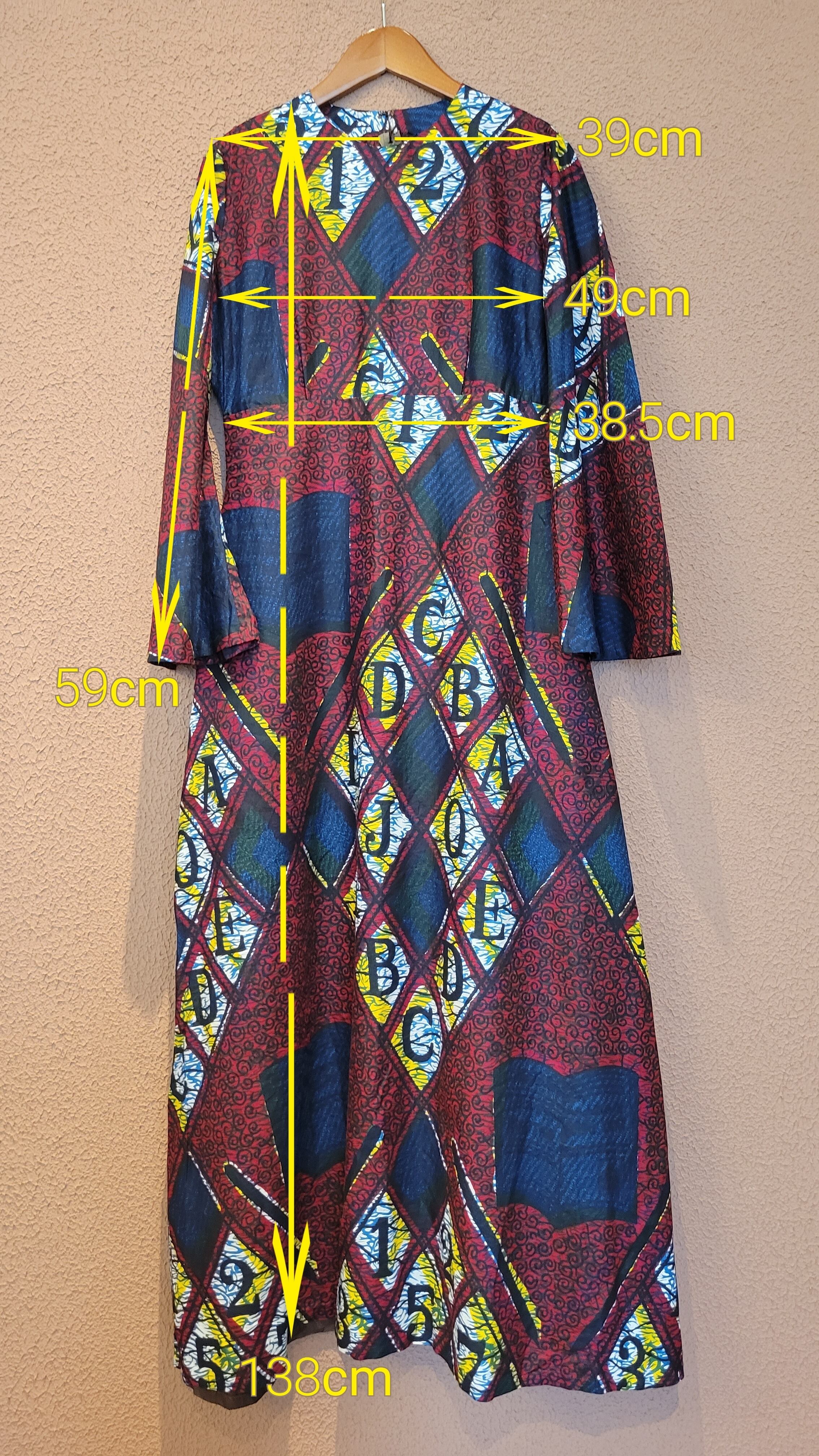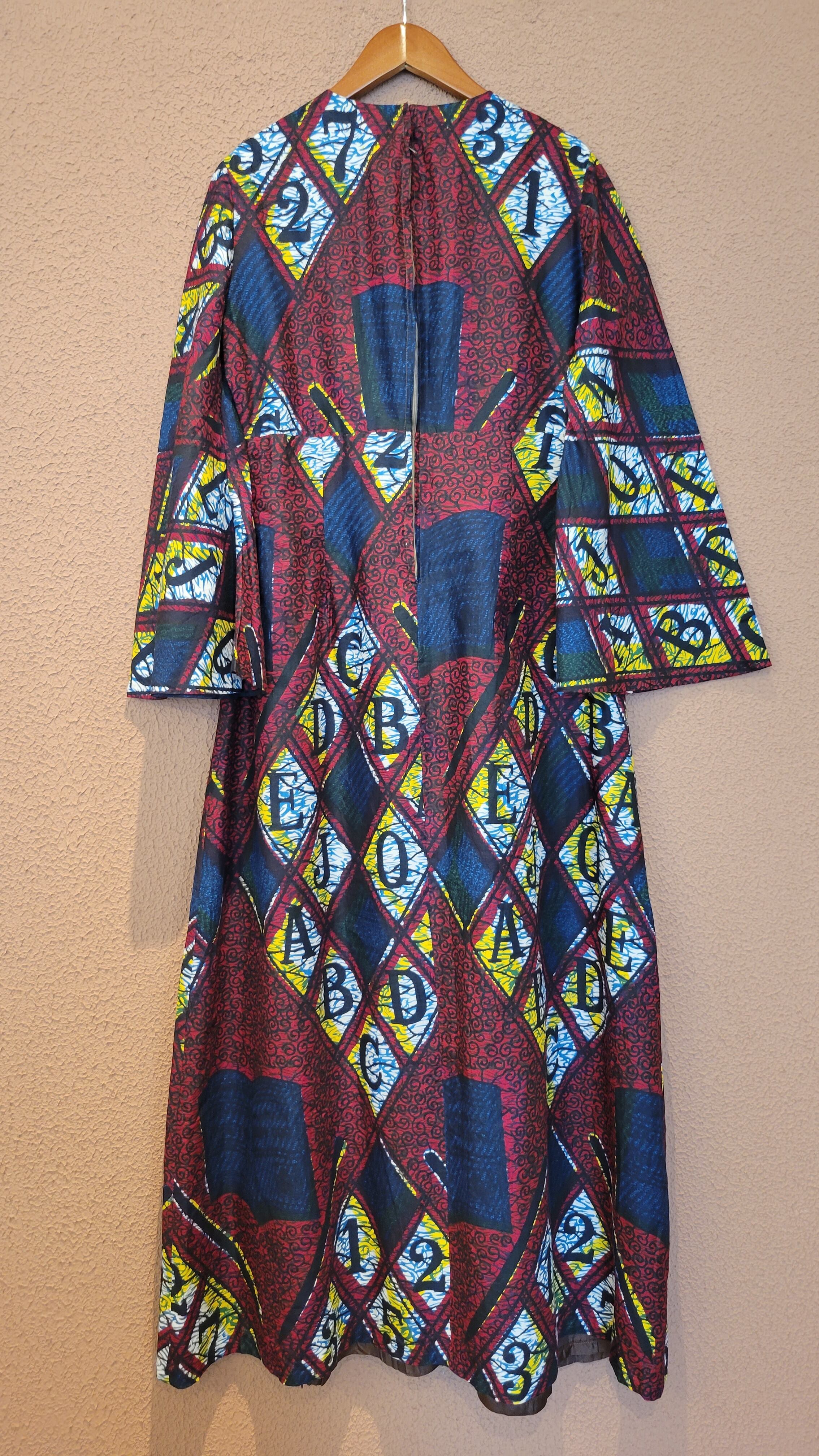 ヴィンテージのアフリカンバティックワンピース。素材表記はありませんがコットンです。スカート部分は裏地付きです。バックファスナーで着脱がしやすいです。落ち着きのある色味で着やすく、数字&アルファベットプリントに遊び心を感じます。フレアスリーブが良いアクセントの1枚で仕上がる着心地の良いワンピースです。