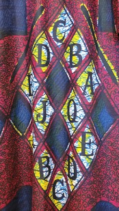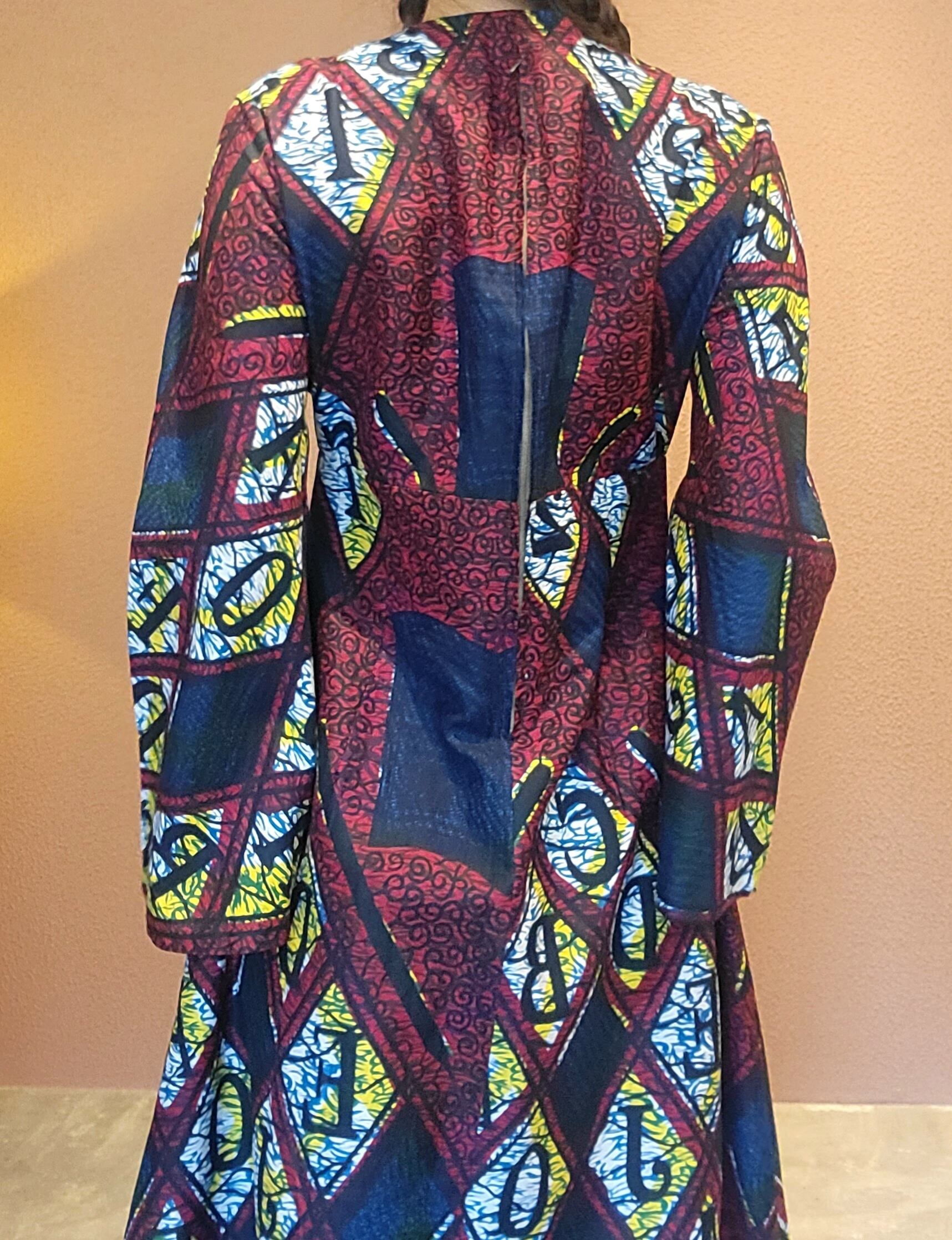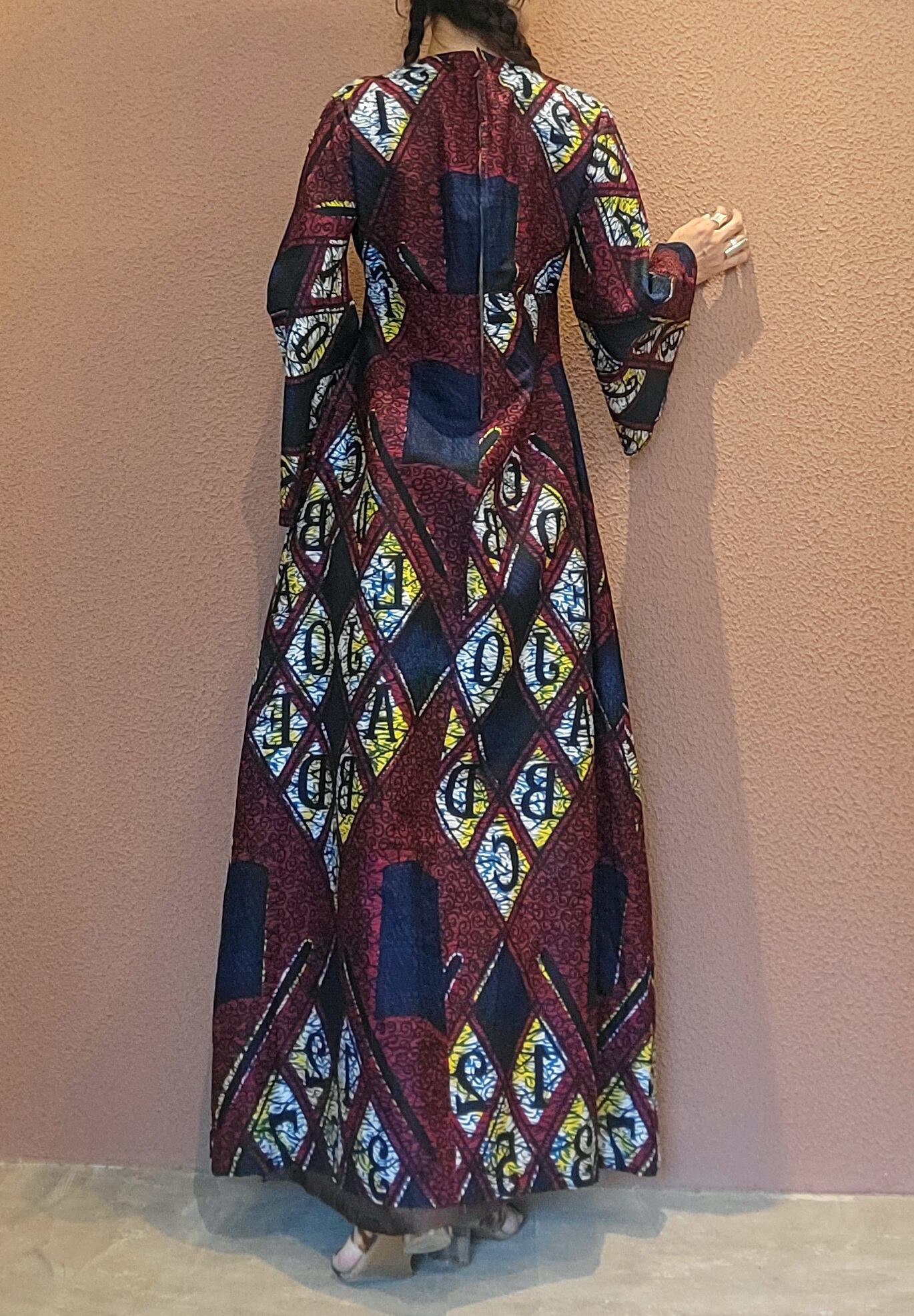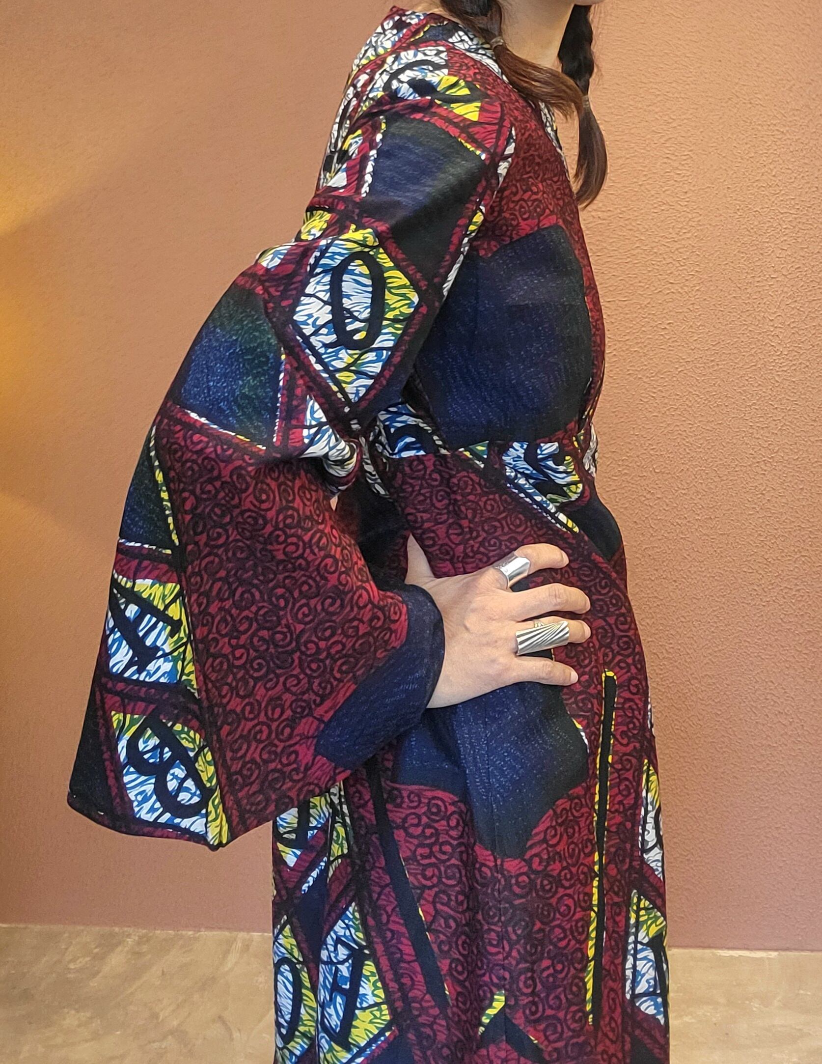 ヴィンテージのアフリカンバティックワンピース。素材表記はありませんがコットンです。スカート部分は裏地付きです。バックファスナーで着脱がしやすいです。落ち着きのある色味で着やすく、数字&アルファベットプリントに遊び心を感じます。フレアスリーブが良いアクセントの1枚で仕上がる着心地の良いワンピースです。