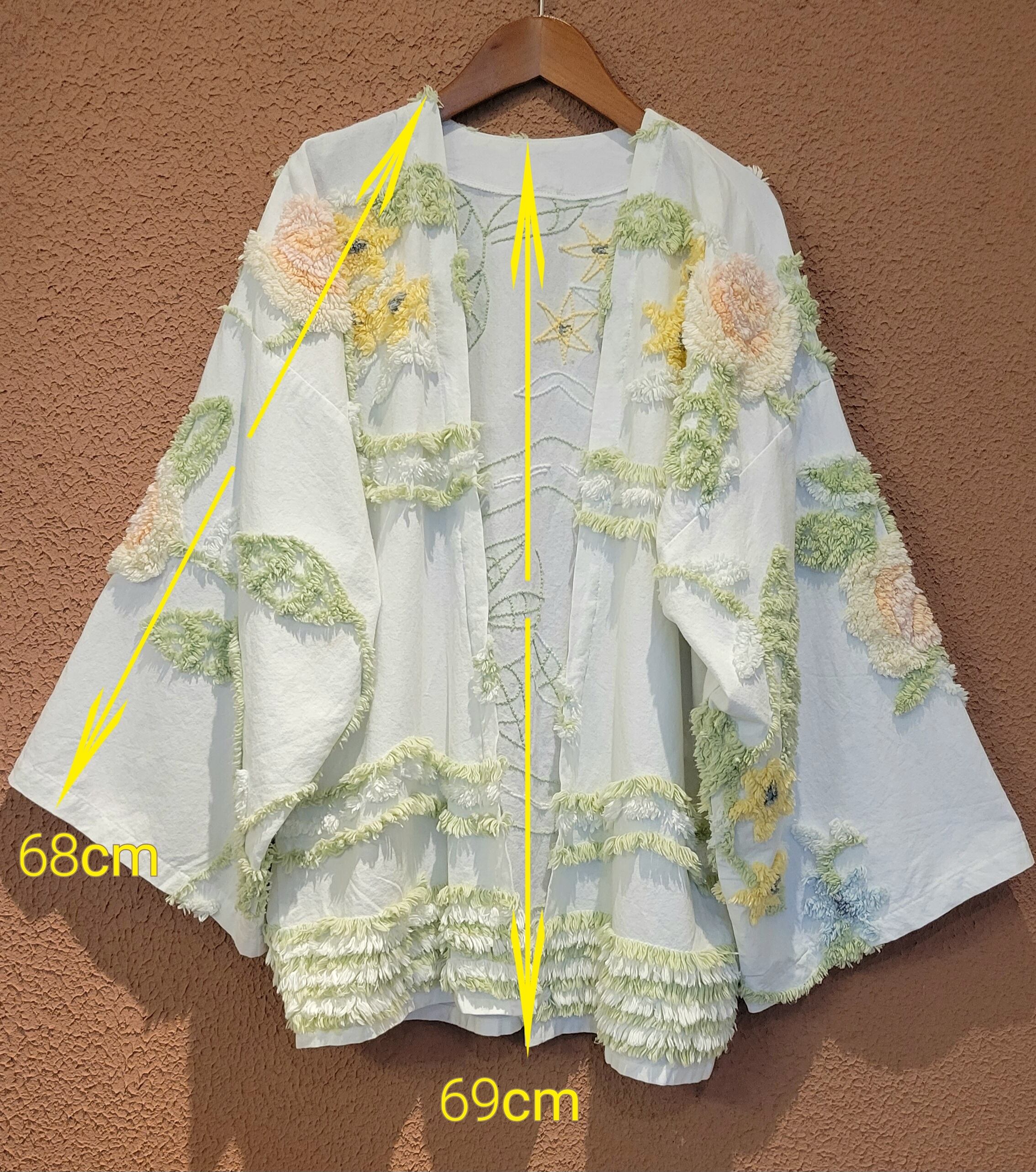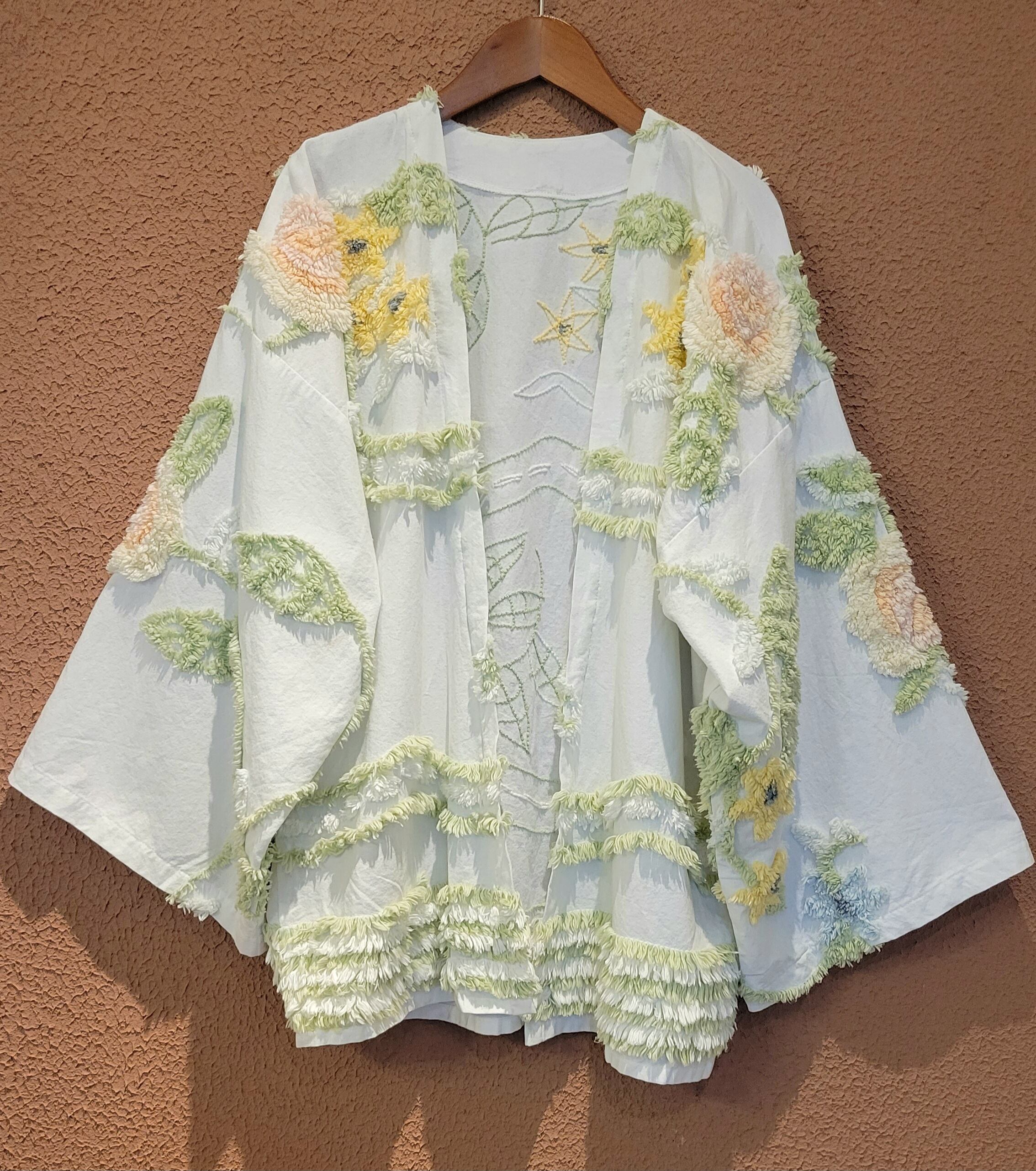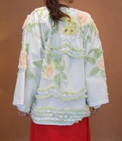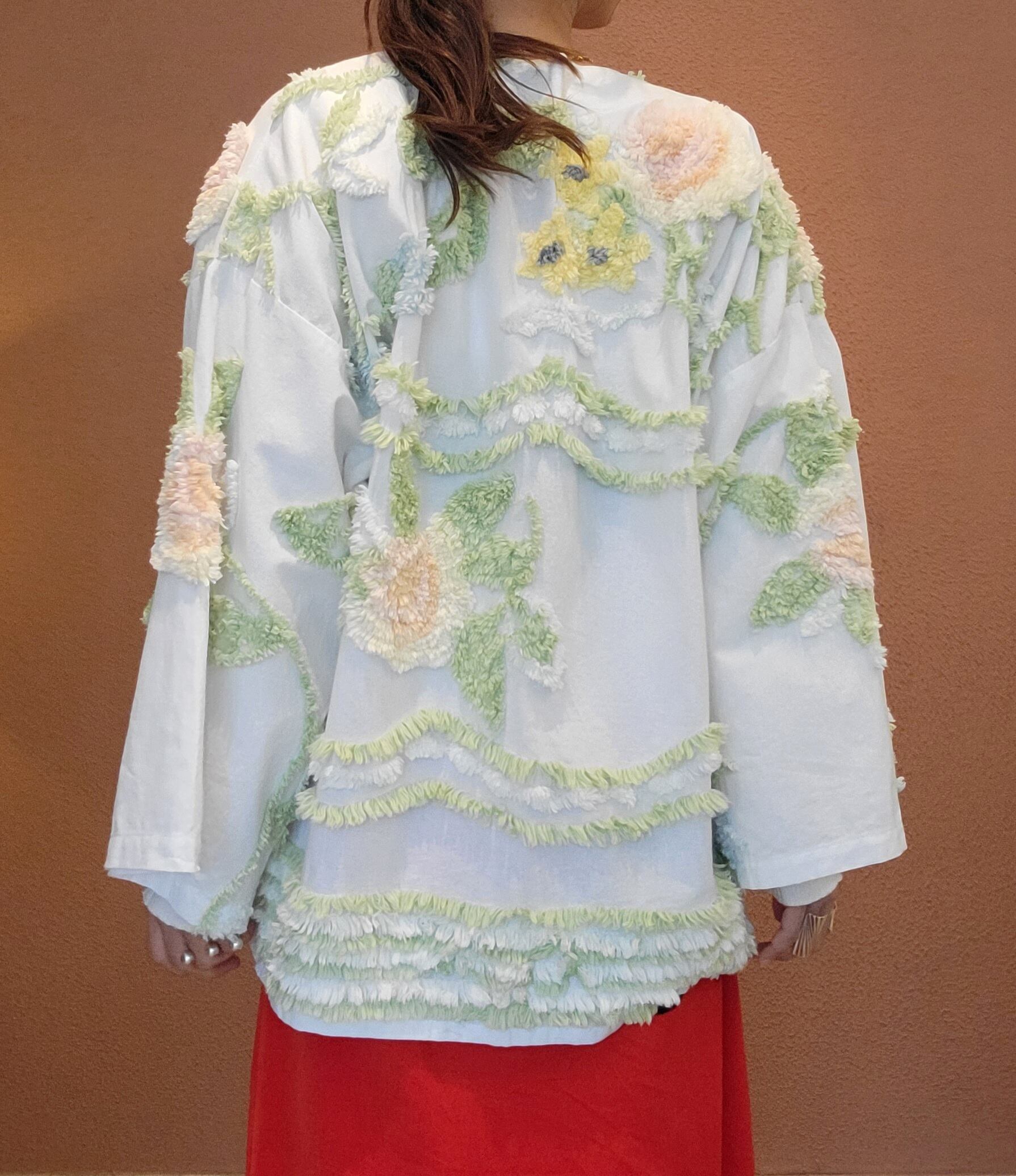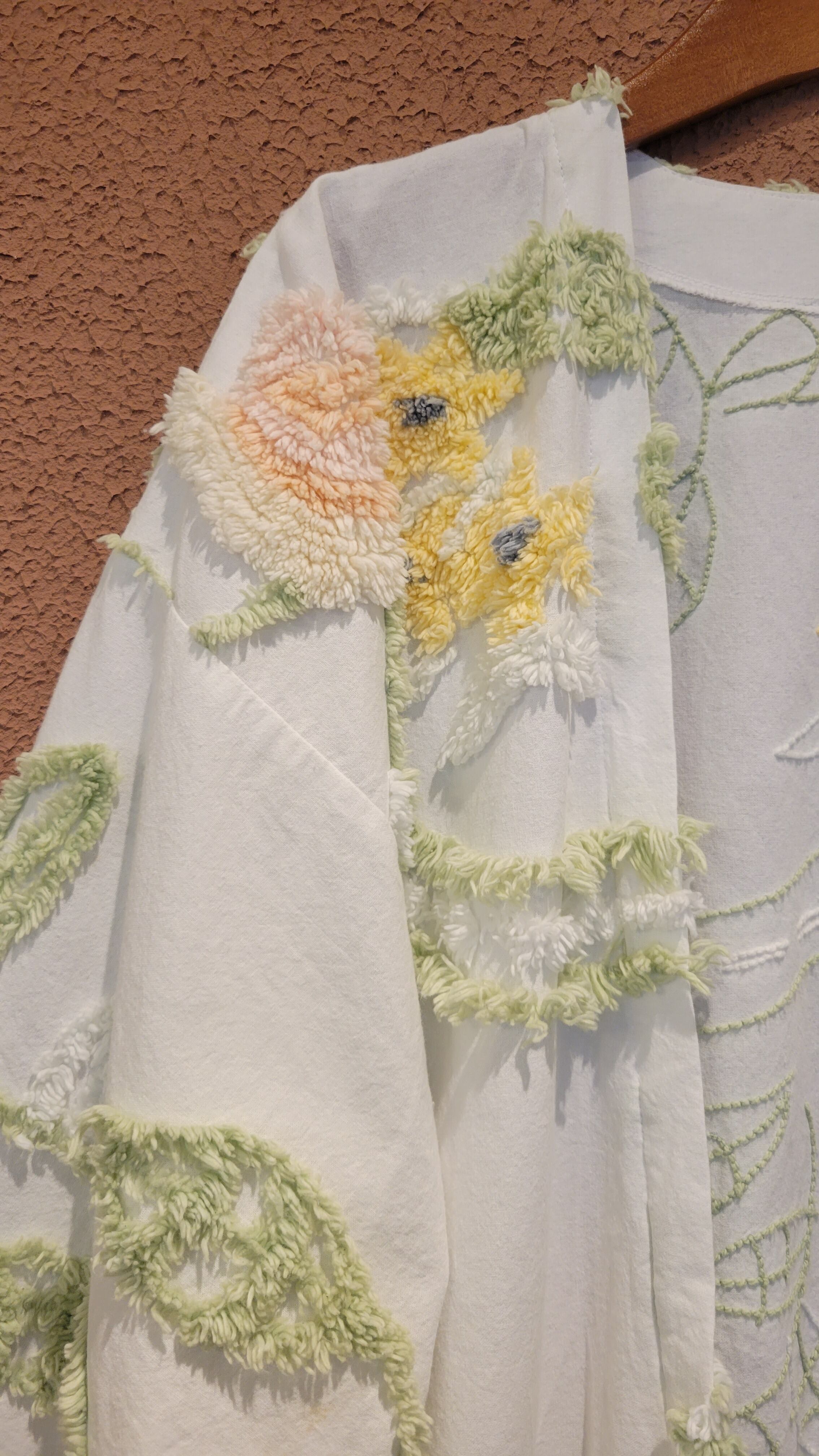 コットン生地のガウンにヴィンテージのシェニールテープが縫い付けられたリメイクガウン。さらりとしたコットンの肌触りとふわふわの毛足の長いシェニール織りの組み合わせが新鮮です。優しい色合いながらも存在感があり、真冬以外で長く着られるアイテムです。
