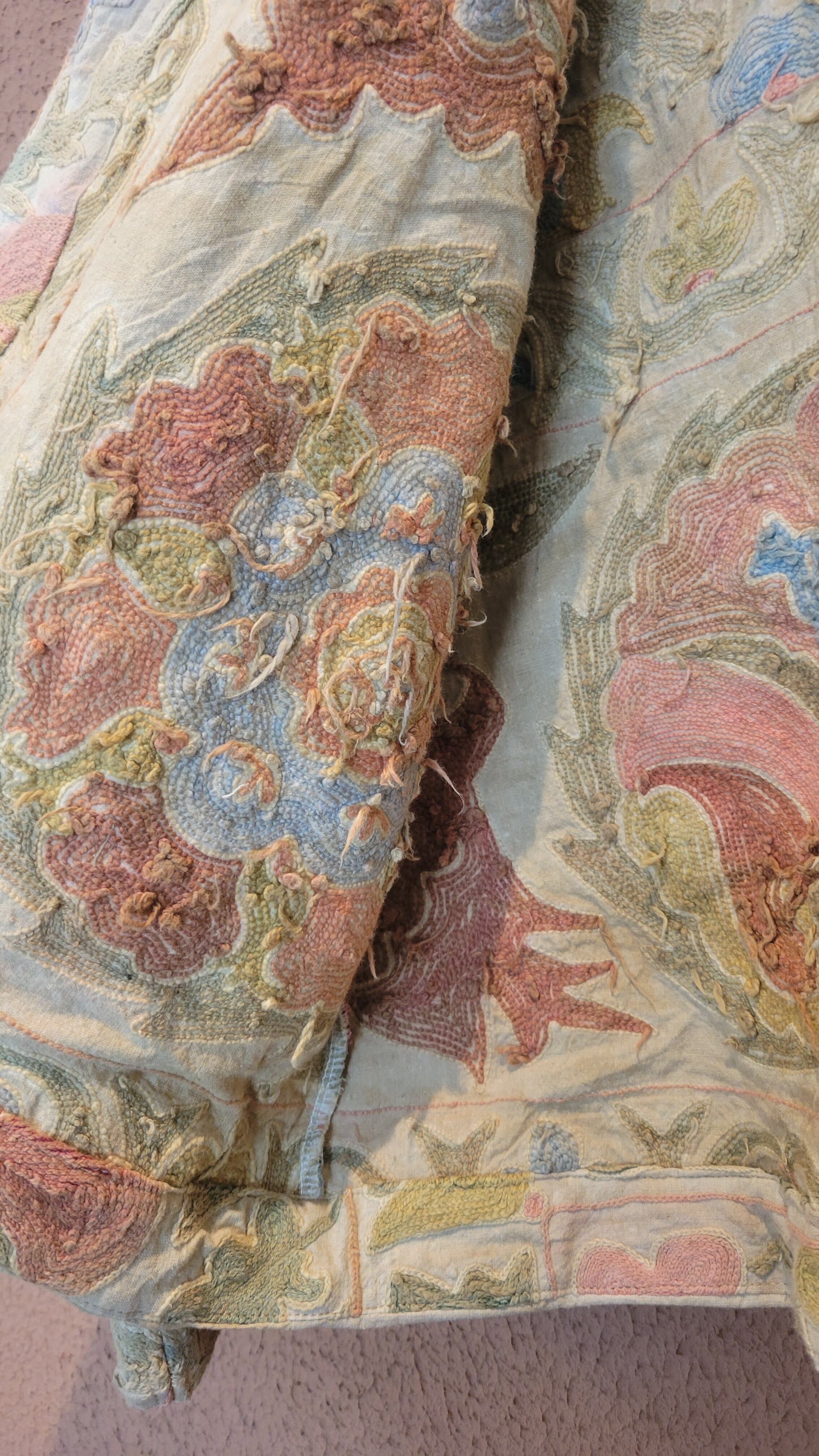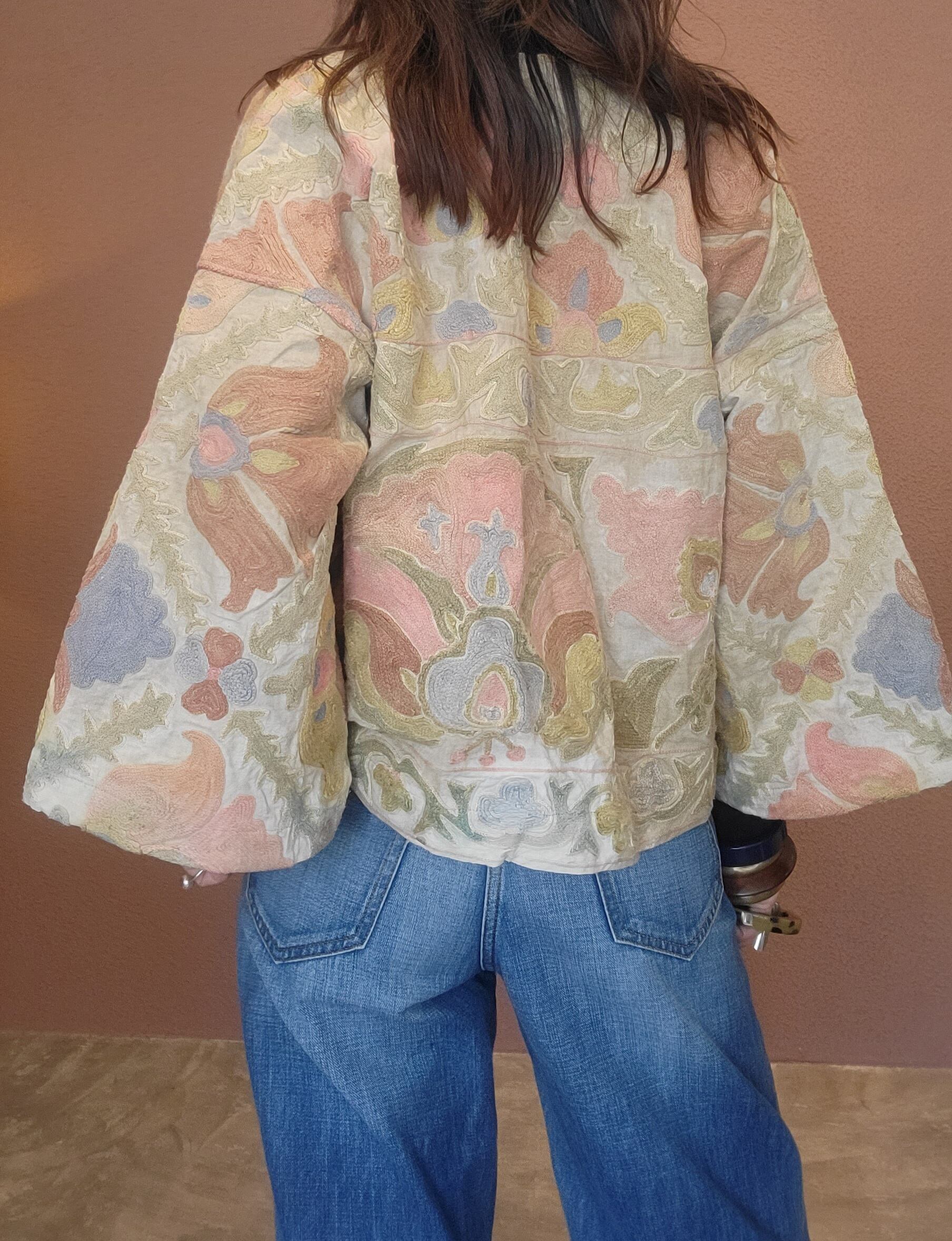 インドの古い刺繍生地を贅沢に使用したリメイクオープンジャケット。素材表記はありませんが厚地のコットンです。張り感があります。なんといってもフェードのかかった絶妙な色味が一番の魅力。良い意味での経年を感じられる、1枚羽織るだけで雰囲気の出るスペシャルピースです。