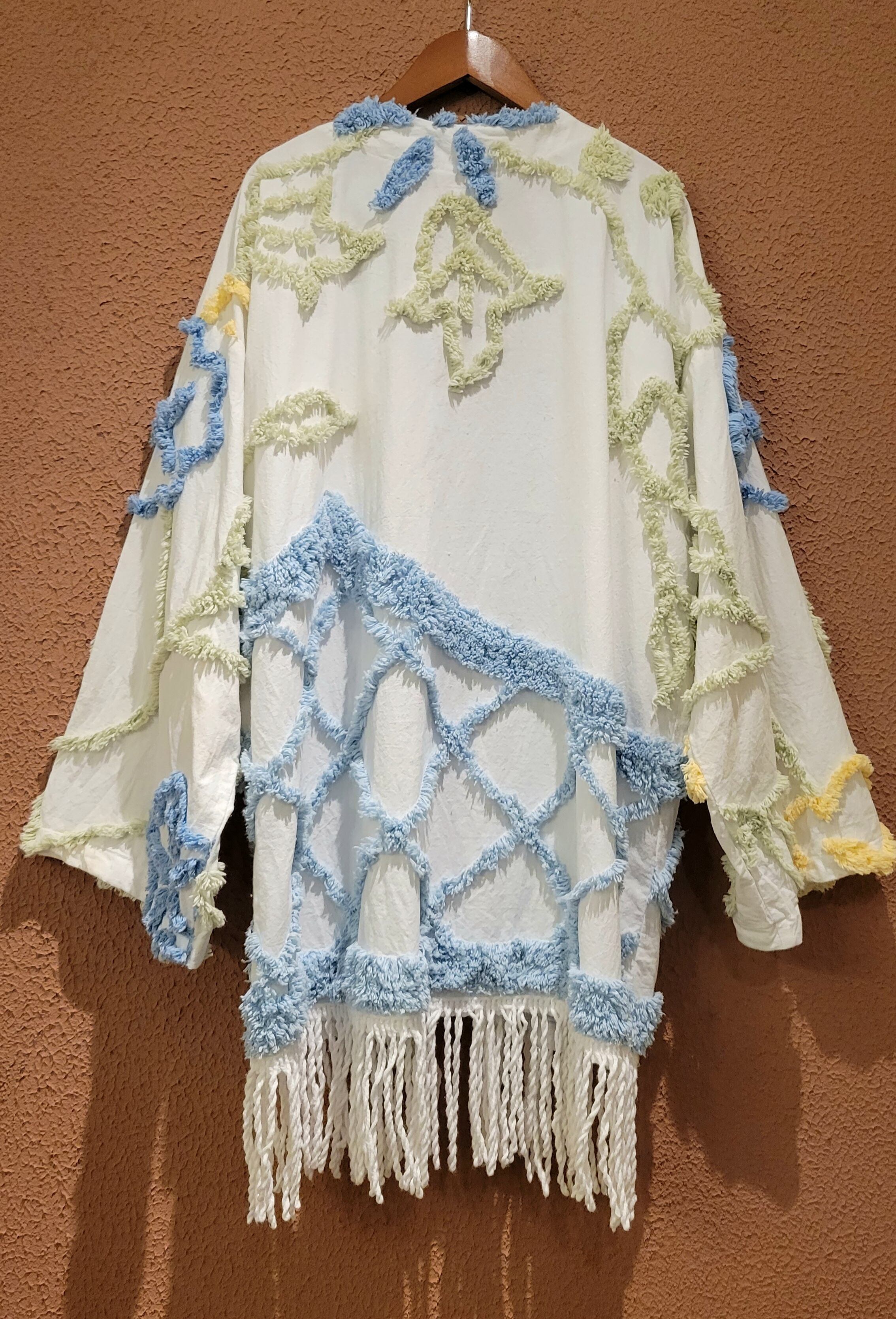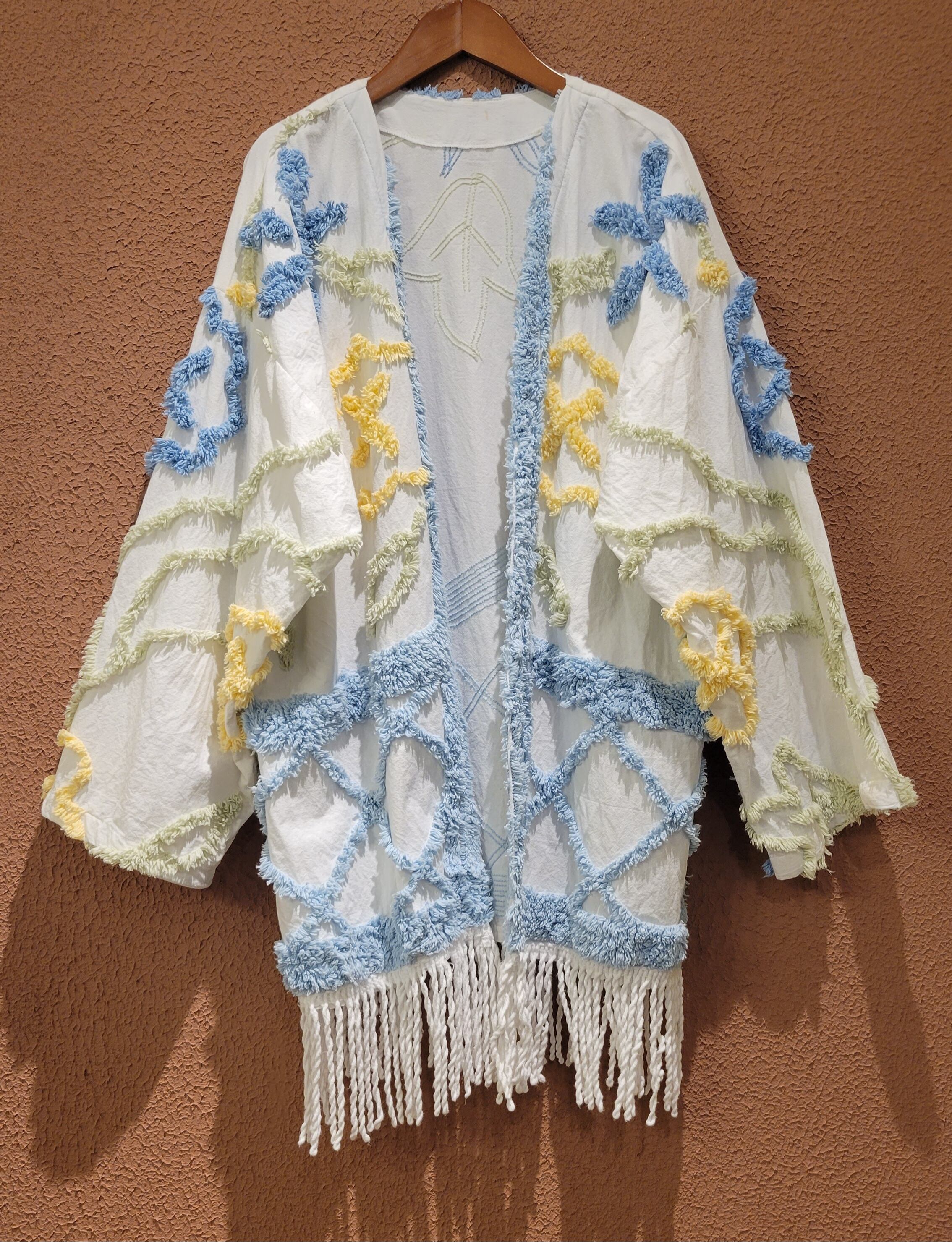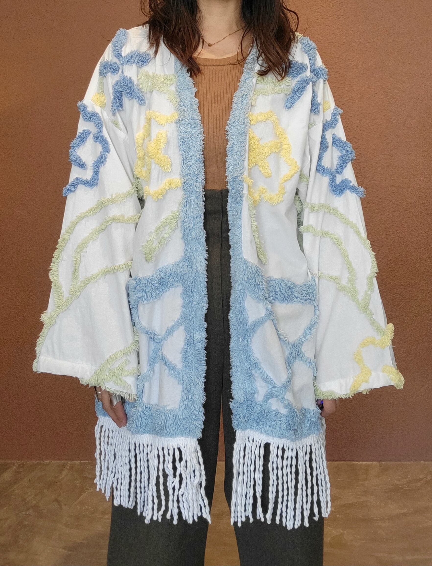 コットン生地のガウンにヴィンテージのシェニールテープが縫い付けられたリメイクガウン。さらりとしたコットンの肌触りとふわふわの毛足の長いシェニール織りの組み合わせが新鮮です。優しい色合いながら存在感もあります。真冬以外で長く着られるアイテムです。
