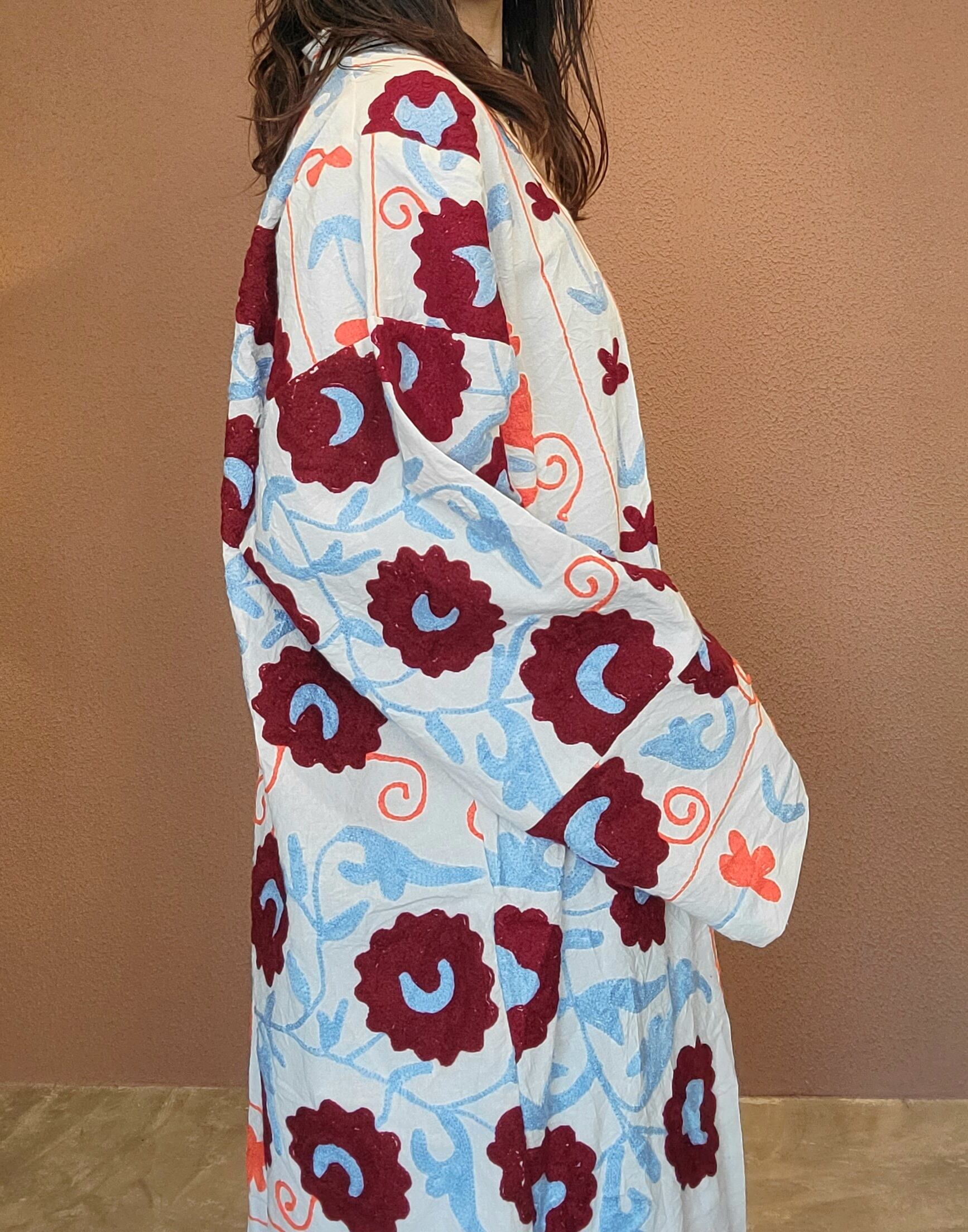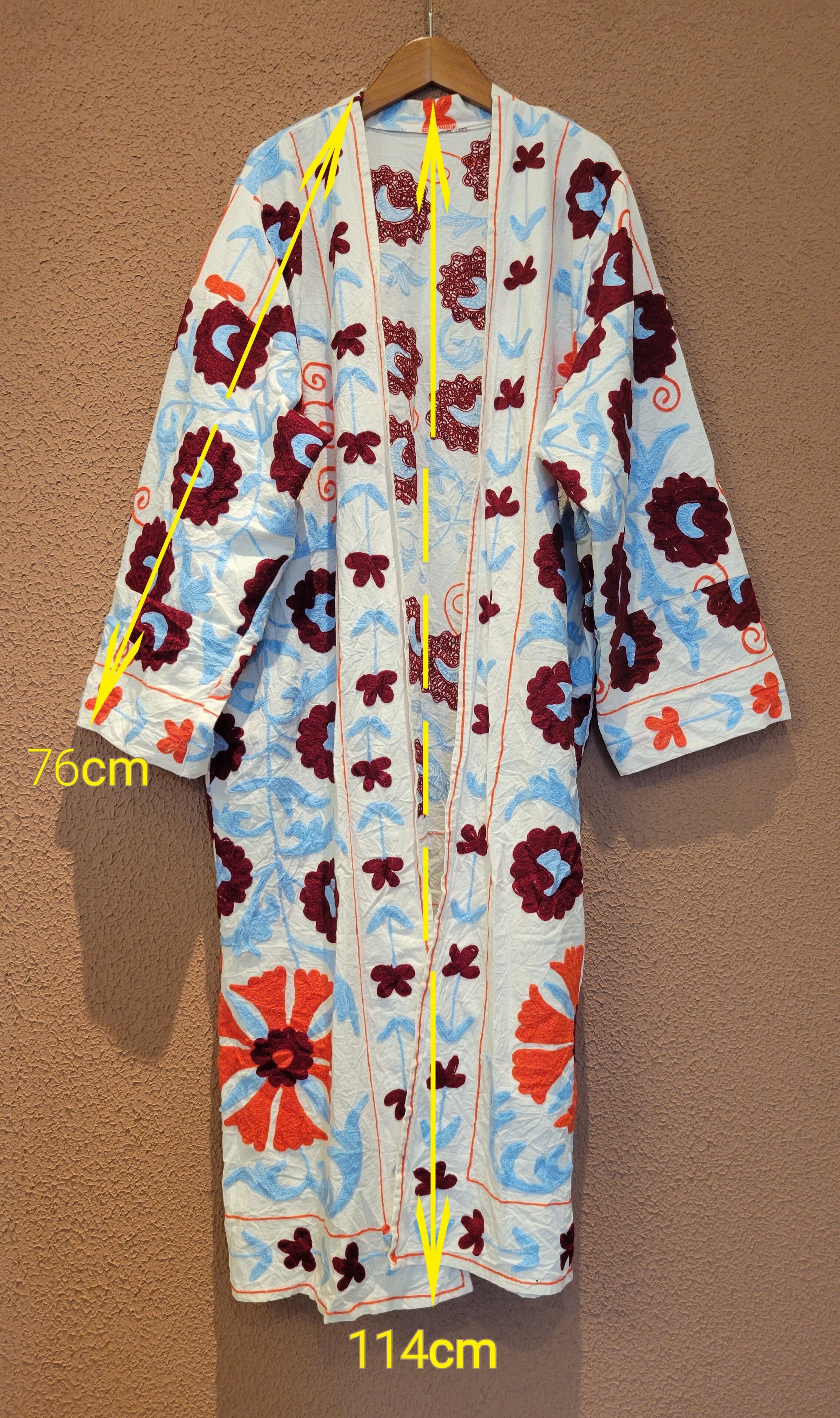 スザニ刺繍が全面に施された生地を贅沢に使用したリメイクガウン。素材はコットンです。ロング丈ですが重さは無いのでウエストベルトでワンピースのように着ても素敵です。さっと羽織ってサマになる1枚。