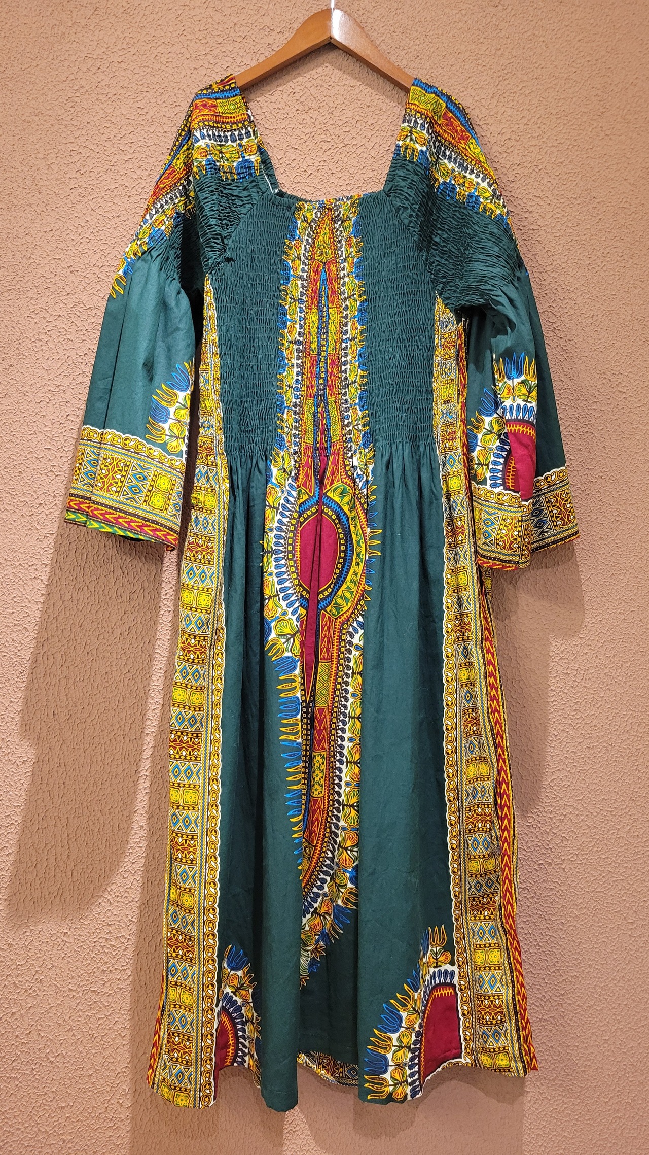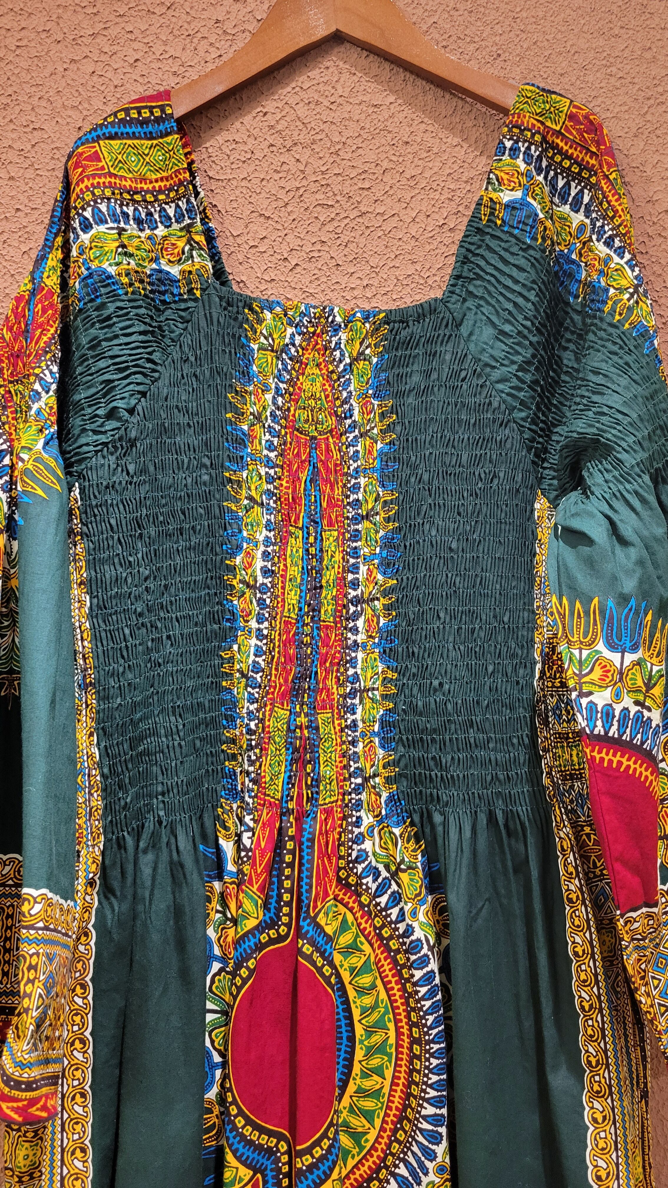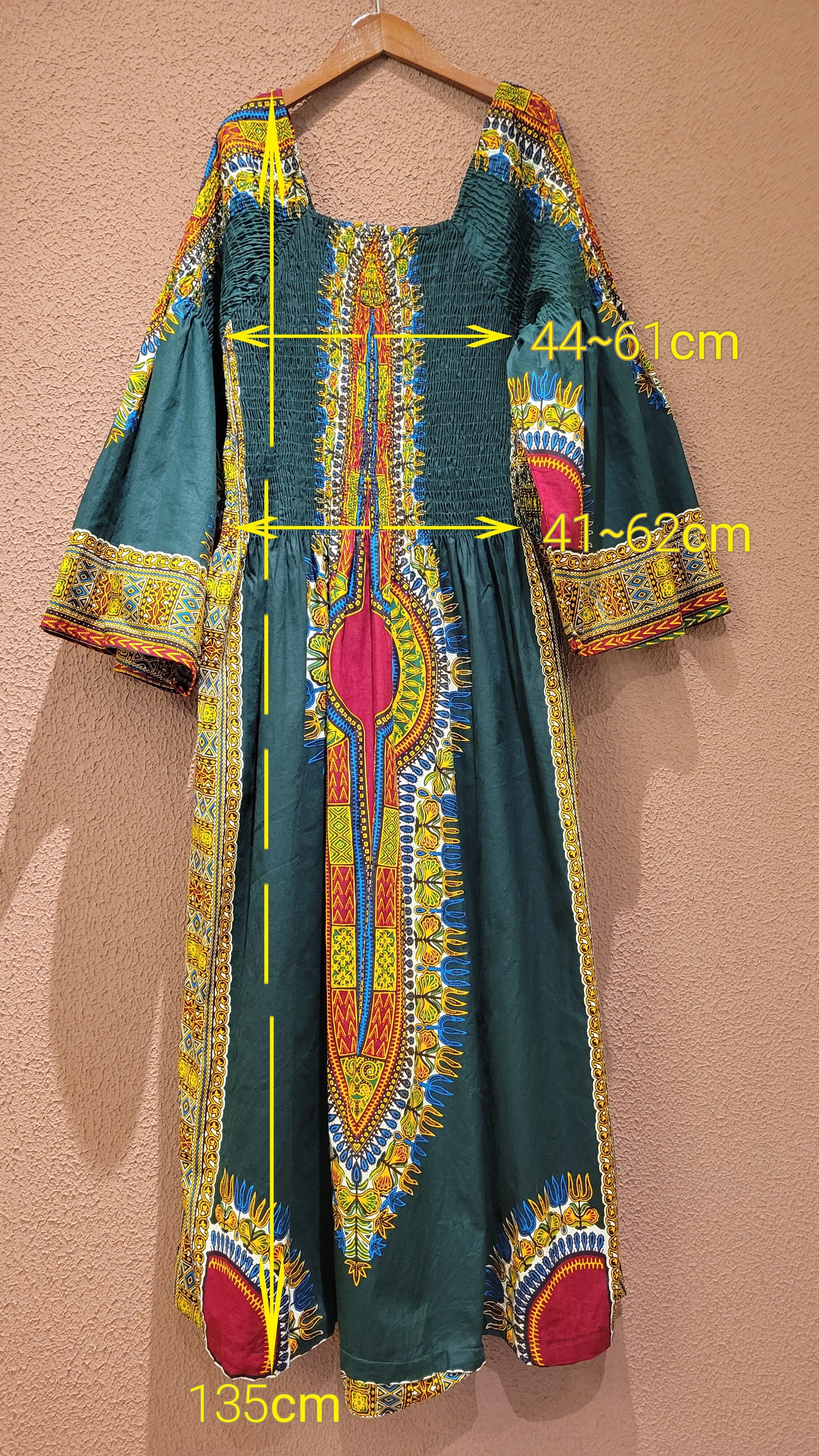 ヴィンテージのアフリカンダシキプリントのマキシワンピース。素材は張りのあるコットンです。トップス全面のシャーリングはヴィンテージにありがちな緩みもなくしっかり伸縮します。袖のデザインも珍しく華やかで着心地の良い1着です。
