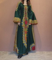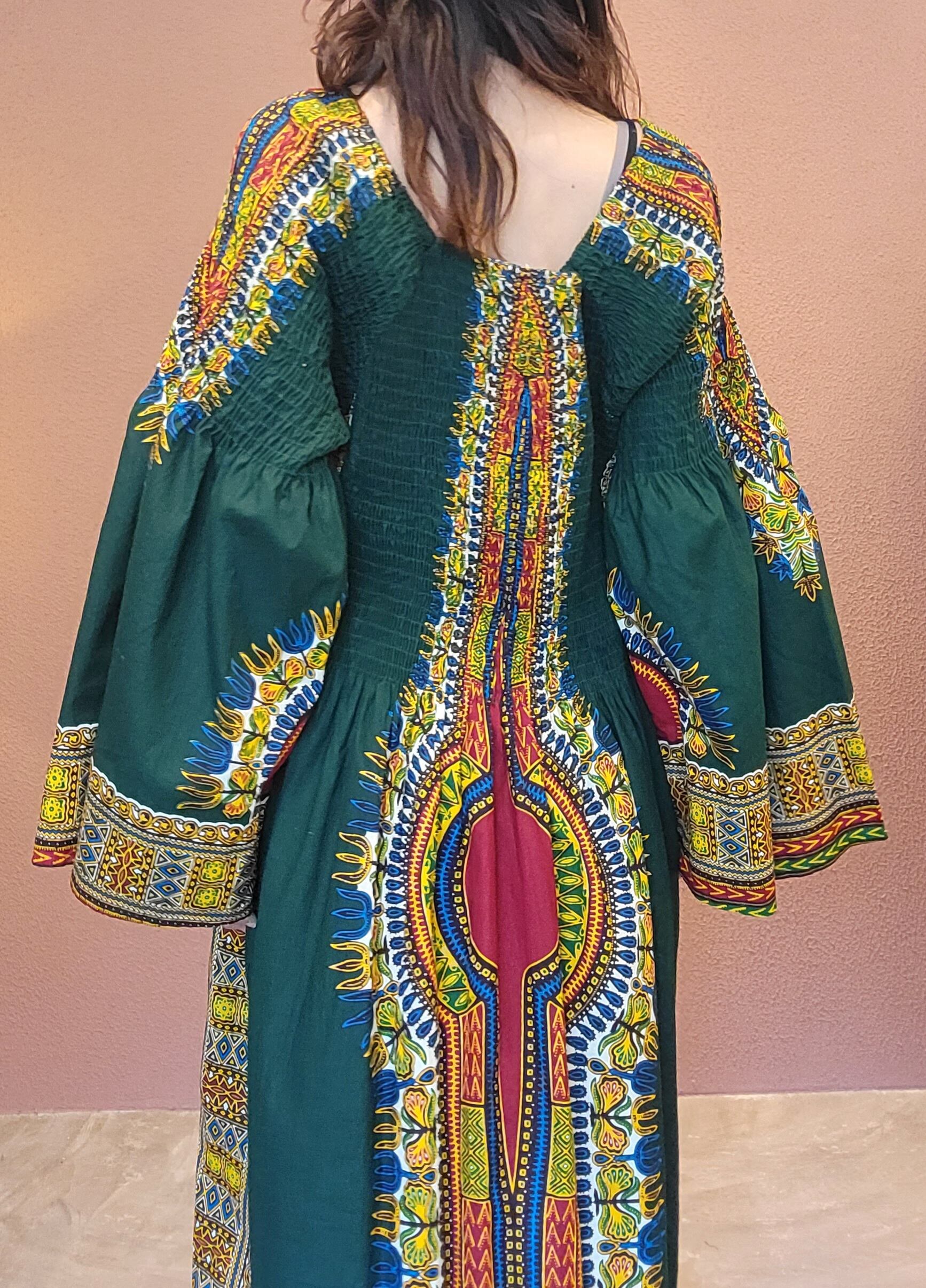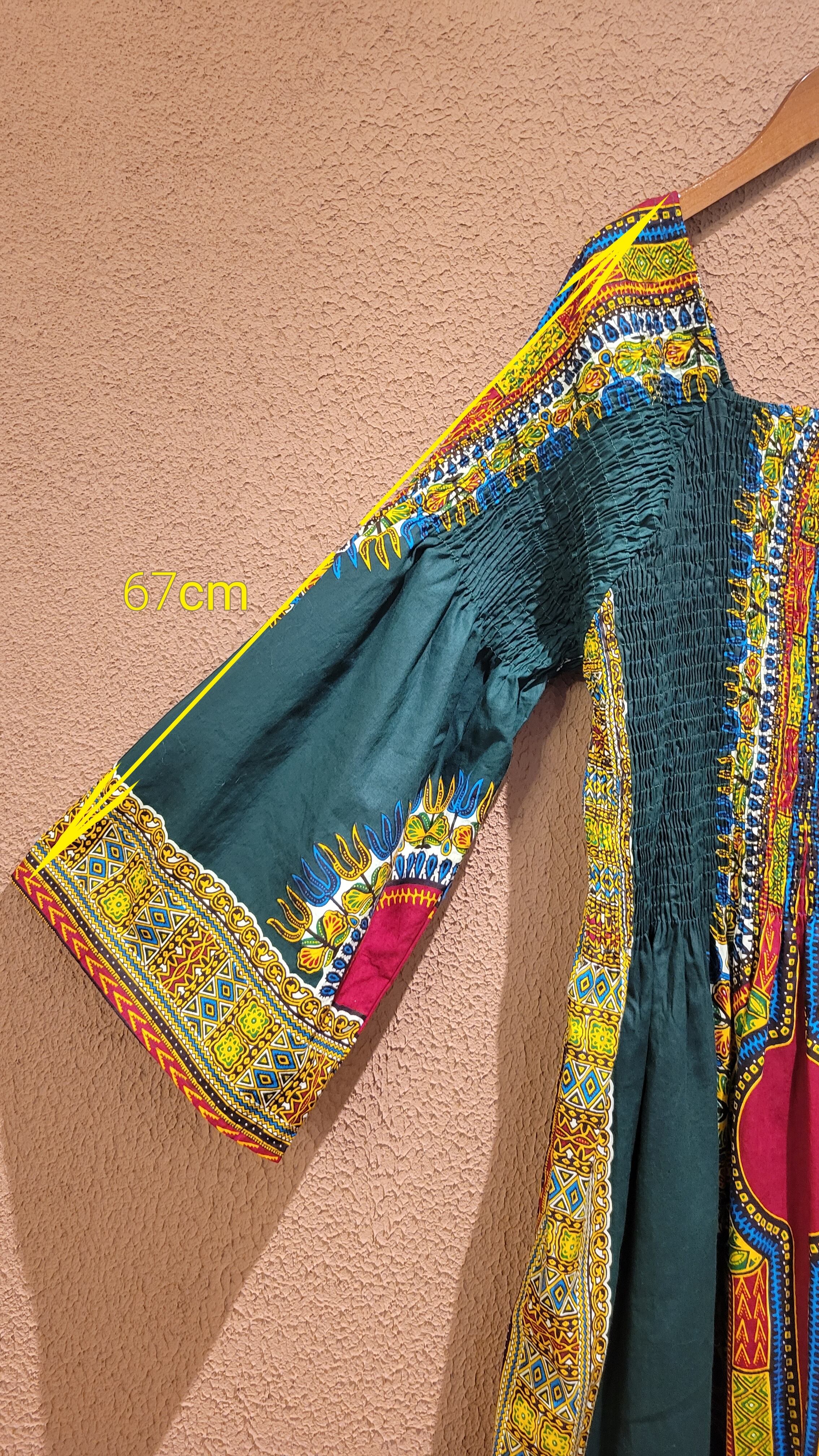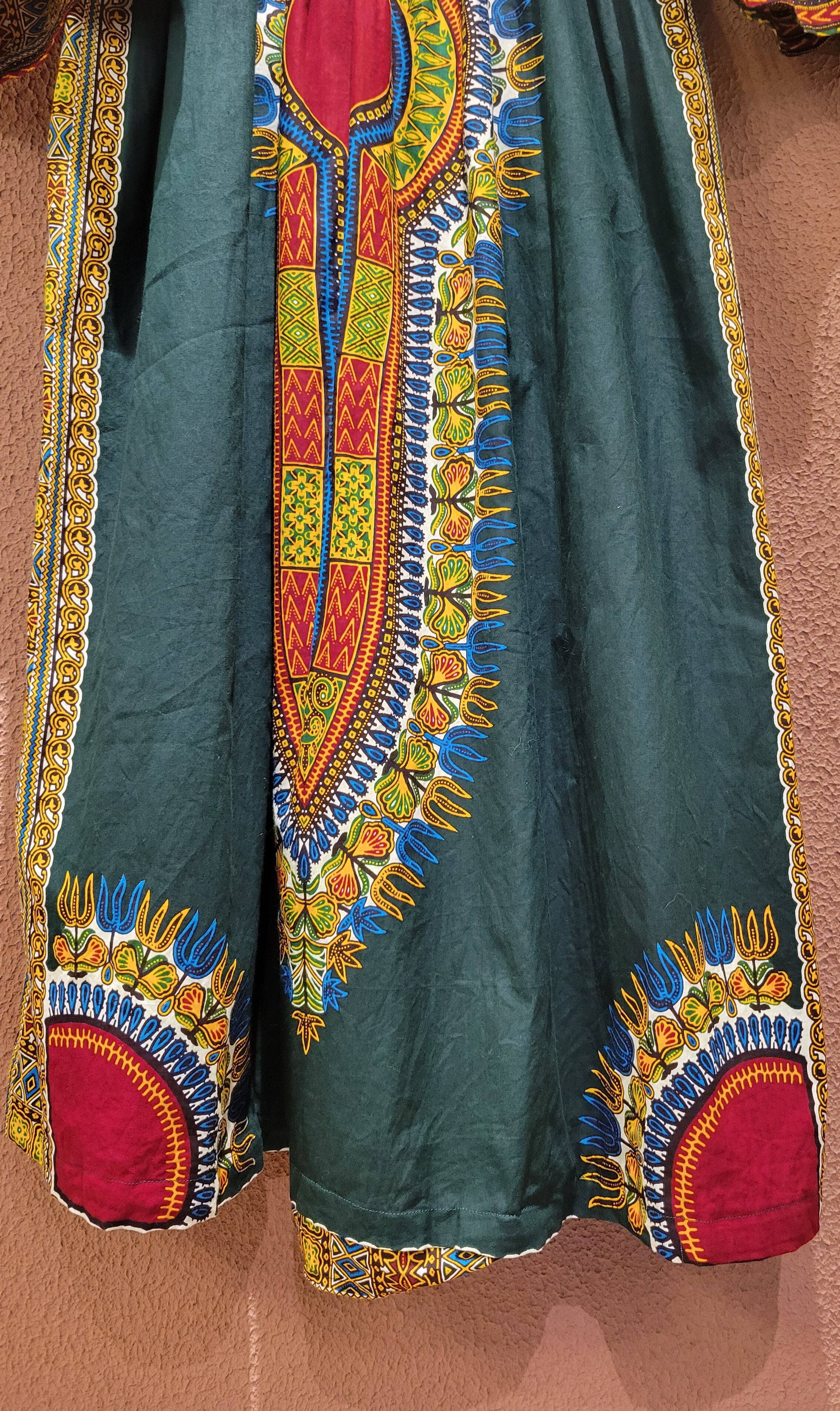 ヴィンテージのアフリカンダシキプリントのマキシワンピース。素材は張りのあるコットンです。トップス全面のシャーリングはヴィンテージにありがちな緩みもなくしっかり伸縮します。袖のデザインも珍しく華やかで着心地の良い1着です。