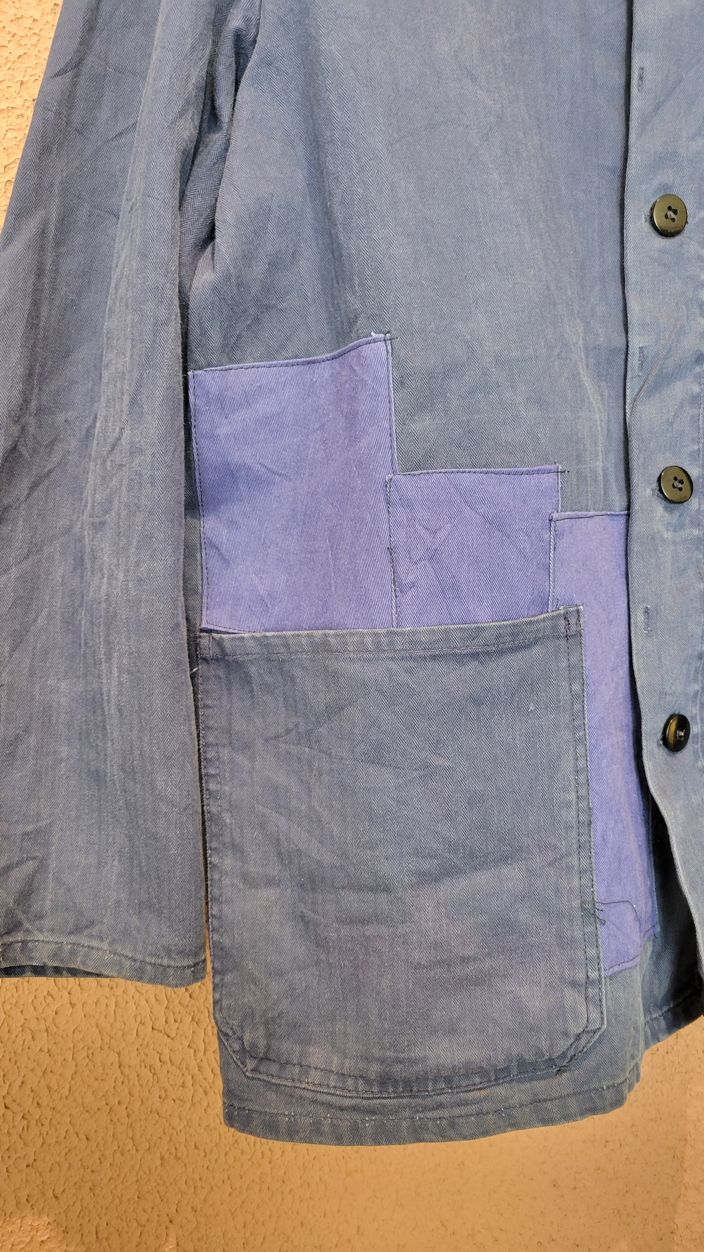 ユーロのヴィンテージワークジャケットに後からステンシルで文字入れがされたプチリメイクジャケット。素材表記はありませんがコットンのようです。メンズ、レディースどちらでも着られるサイズ感です。ショールカラーと継ぎはぎが良い雰囲気。どんなボトムにも良く合う普段使いにぴったりのアイテムです。*実際のお色は着用画像に近いです。