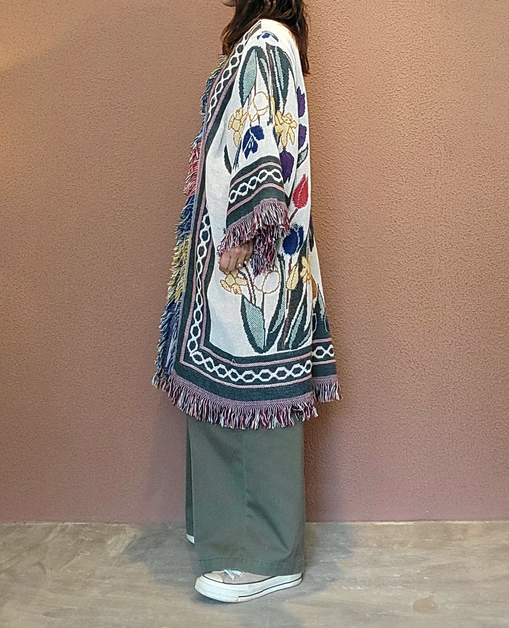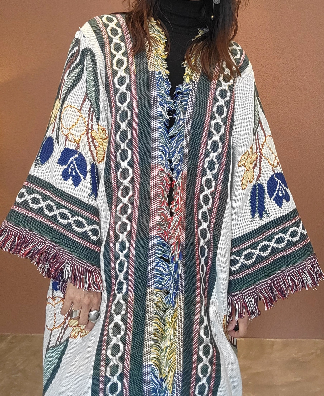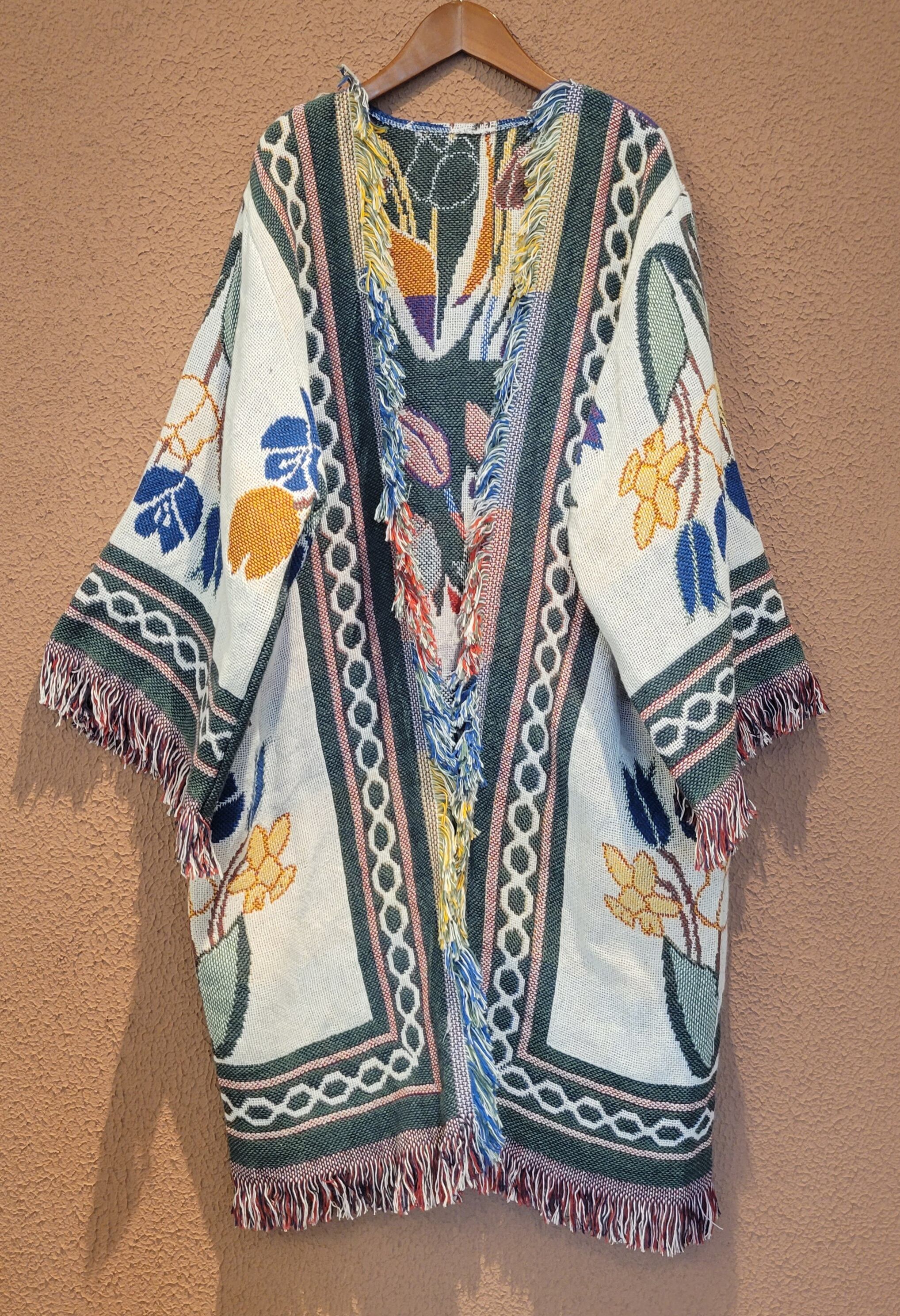 ヴィンテージのブランケットを使用したリメイクガウン。素材表記はありませんがコットンのようです。着心地の良いゆったりしたサイジング。膝下辺りまでのハーフガウン丈でブランケットを1枚まるごと纏ったような着心地です。お部屋の中での防寒にもぴったりです。