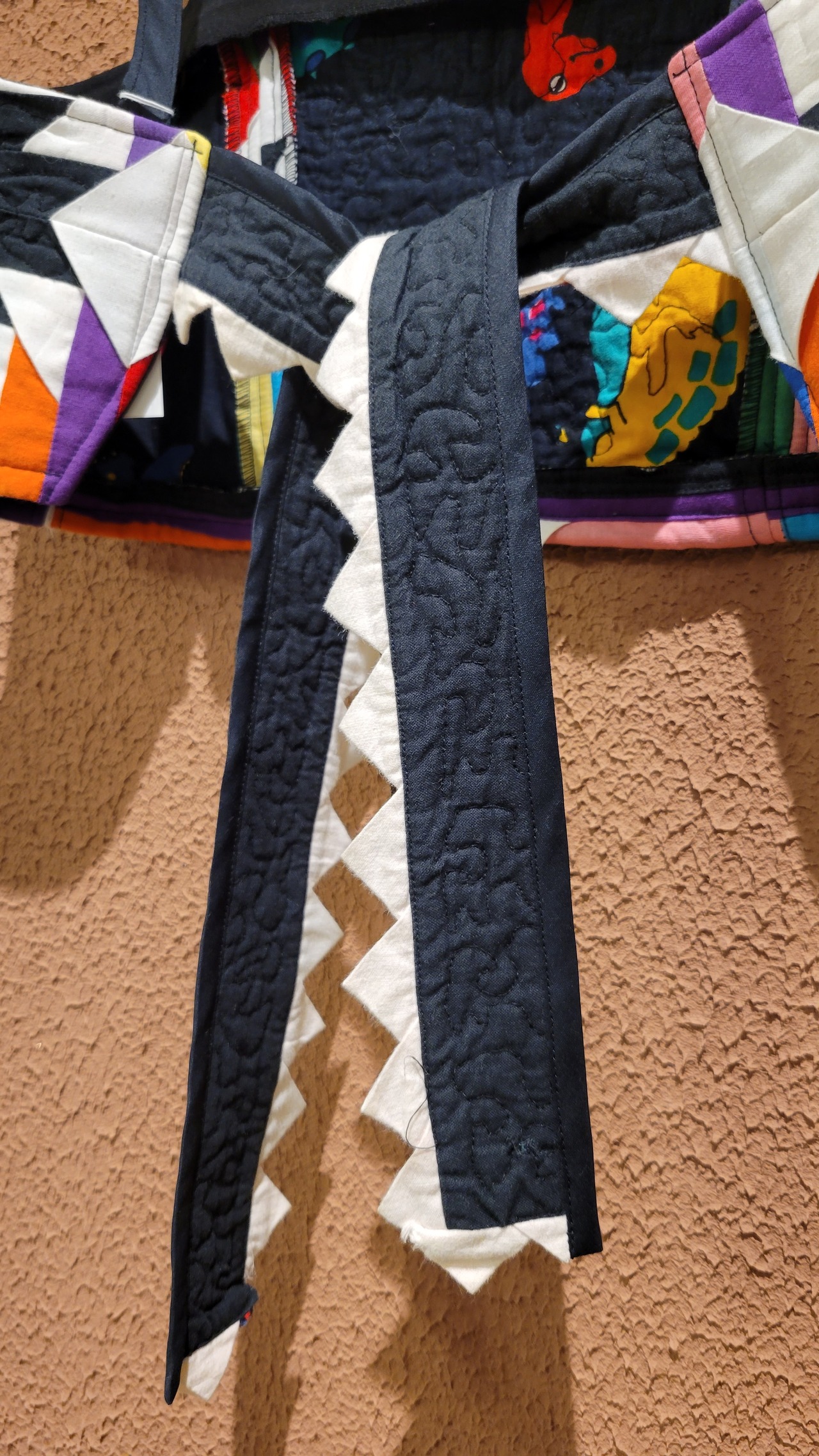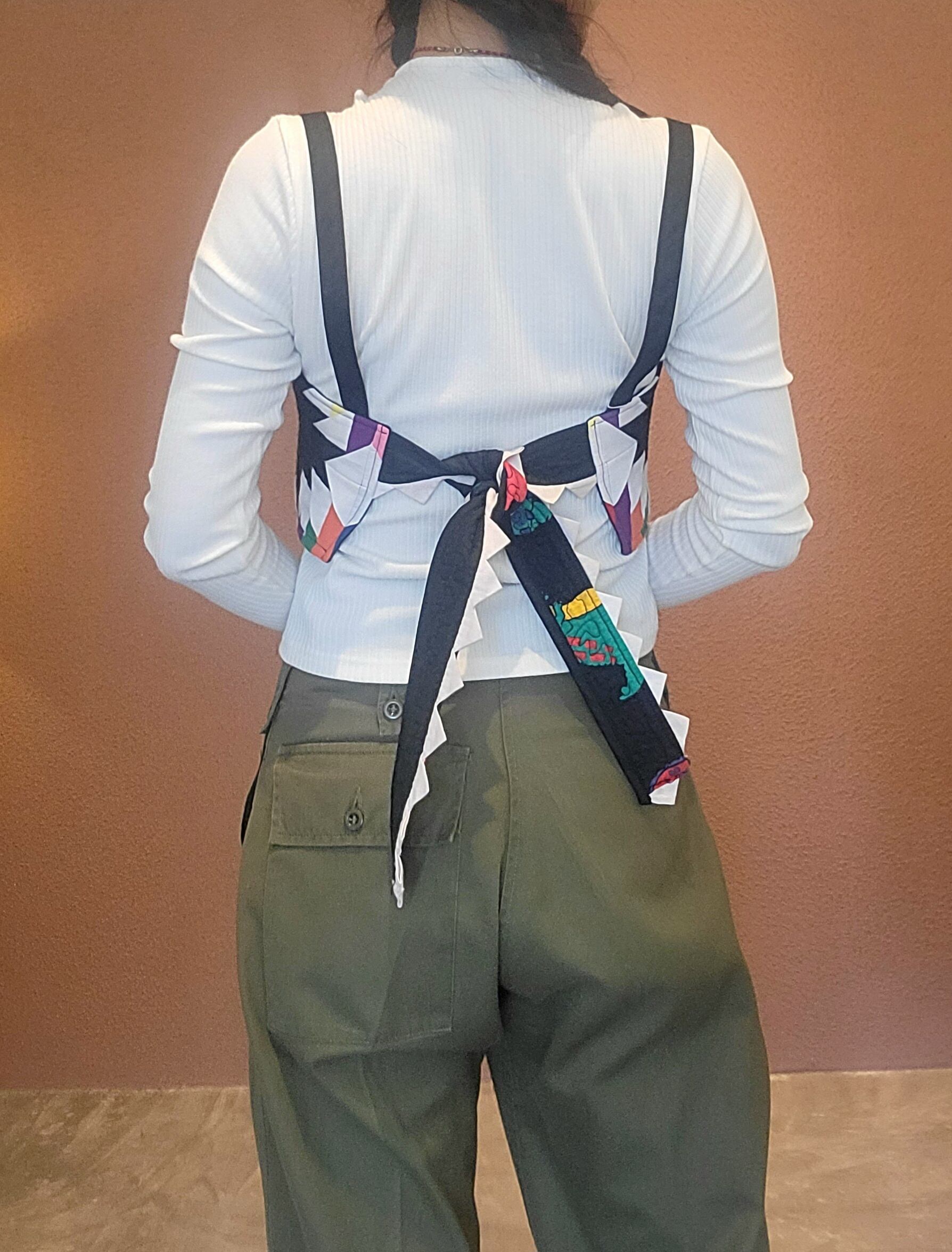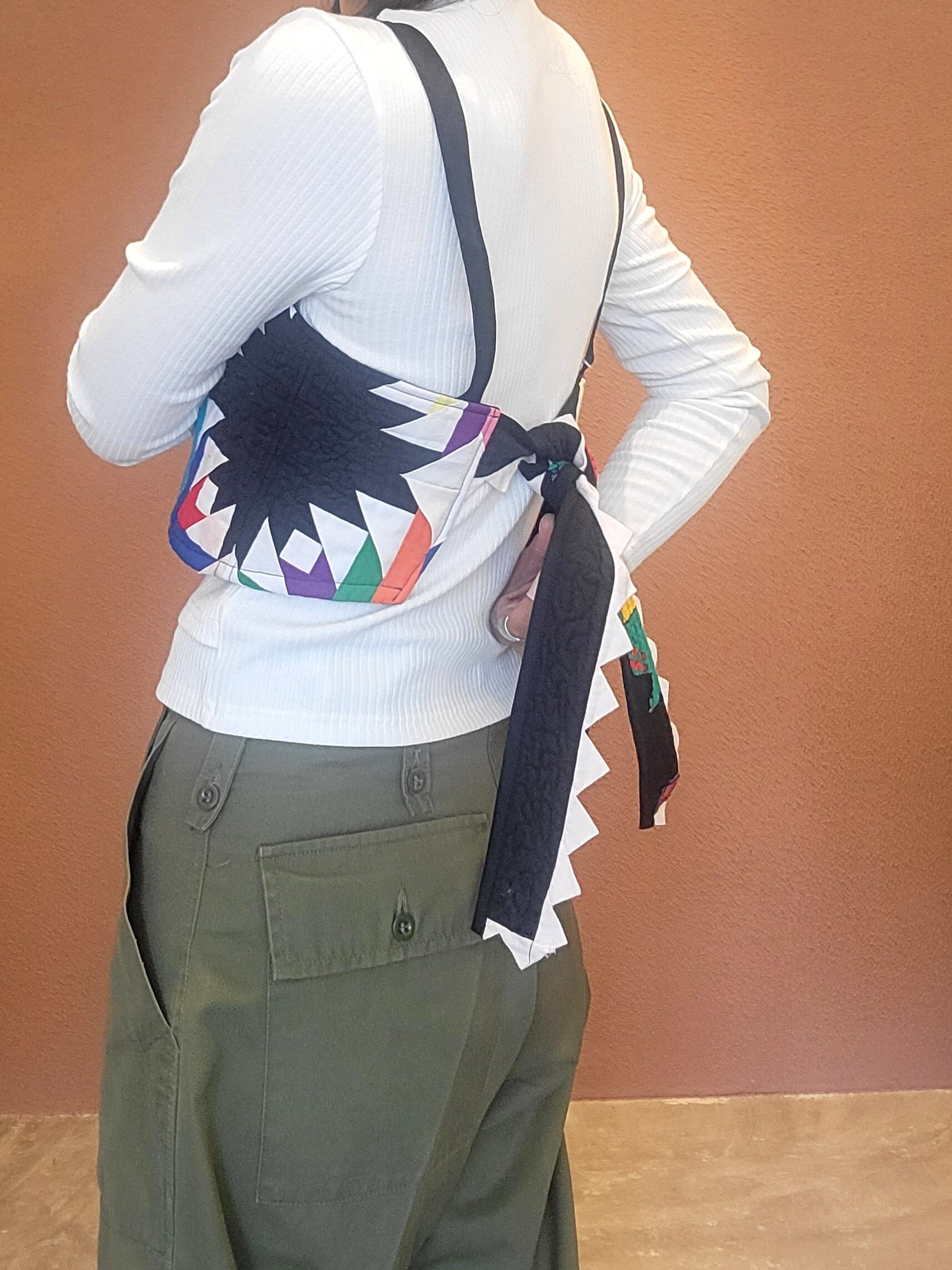 ヴィンテージのパッチワークキルト生地を使用したリメイクビスチェ。素材はコットンです。しっかり厚みのあるキルトです。ショルダーストラップを内側にしまいこんでコルセットのようにも着用できます。