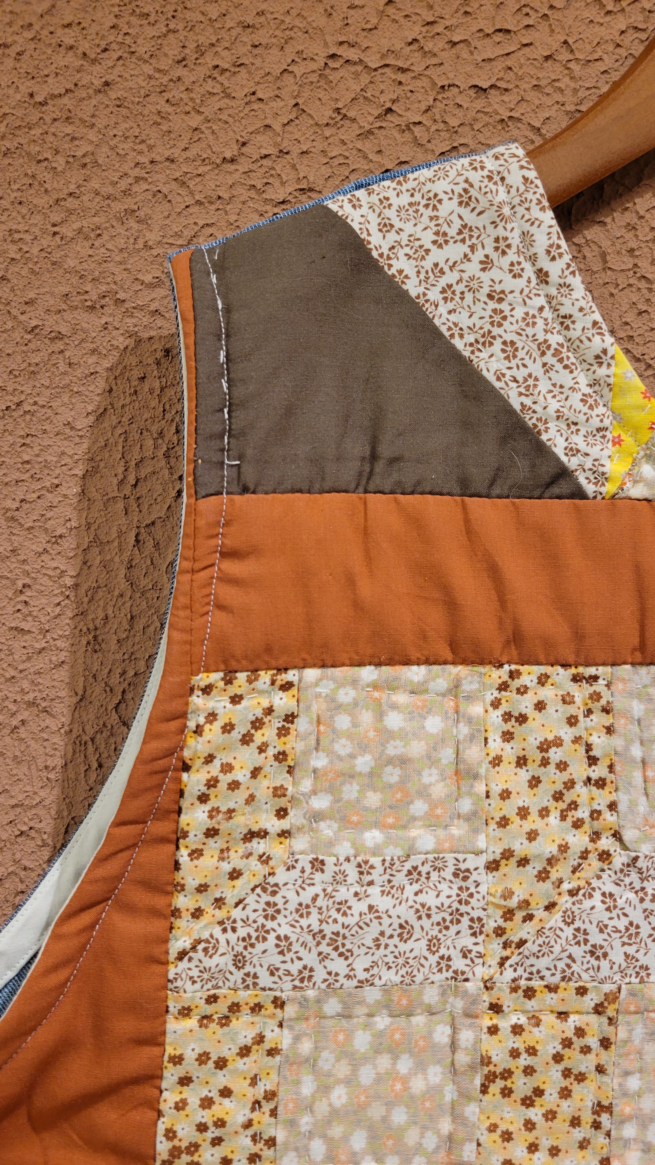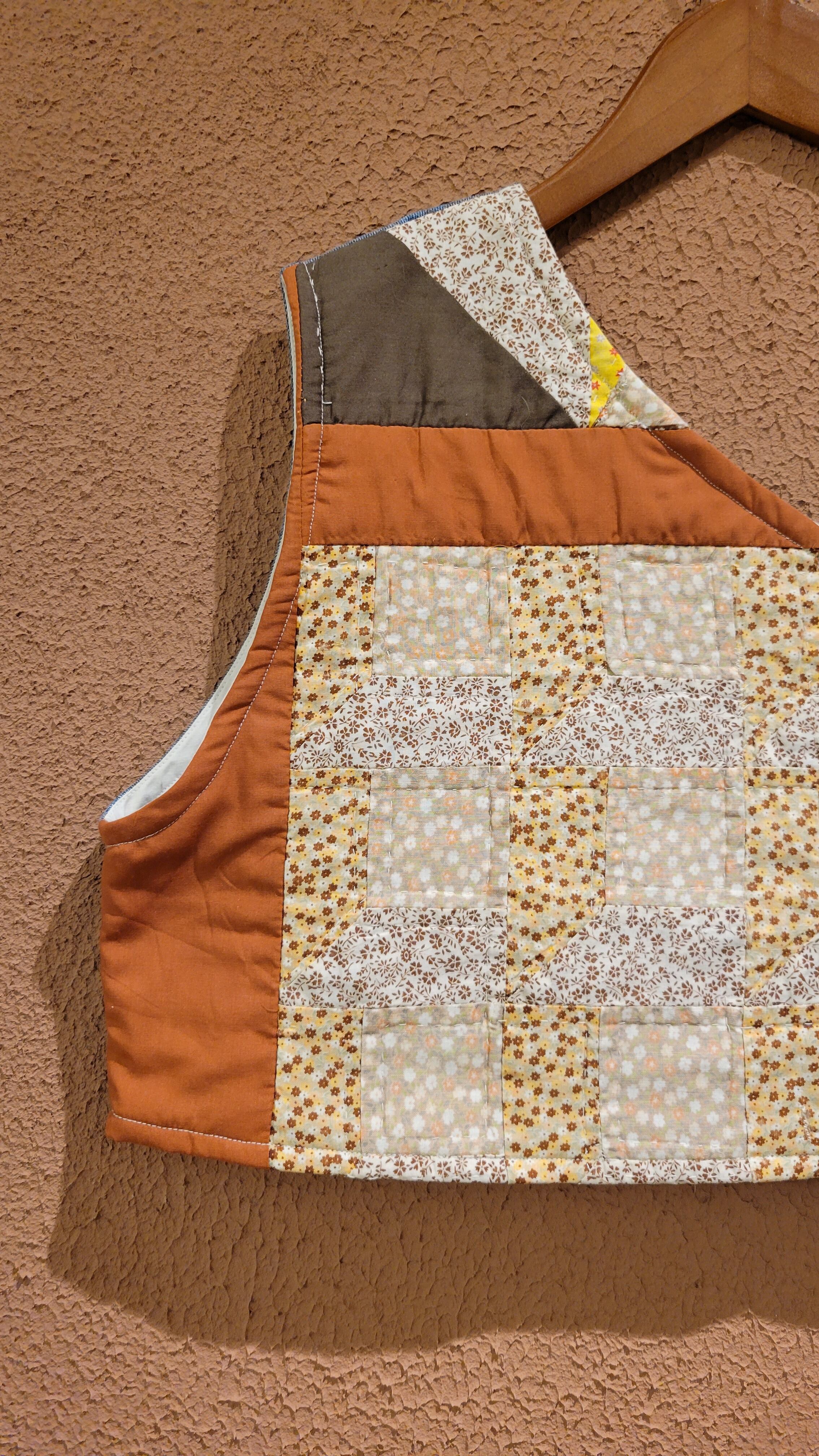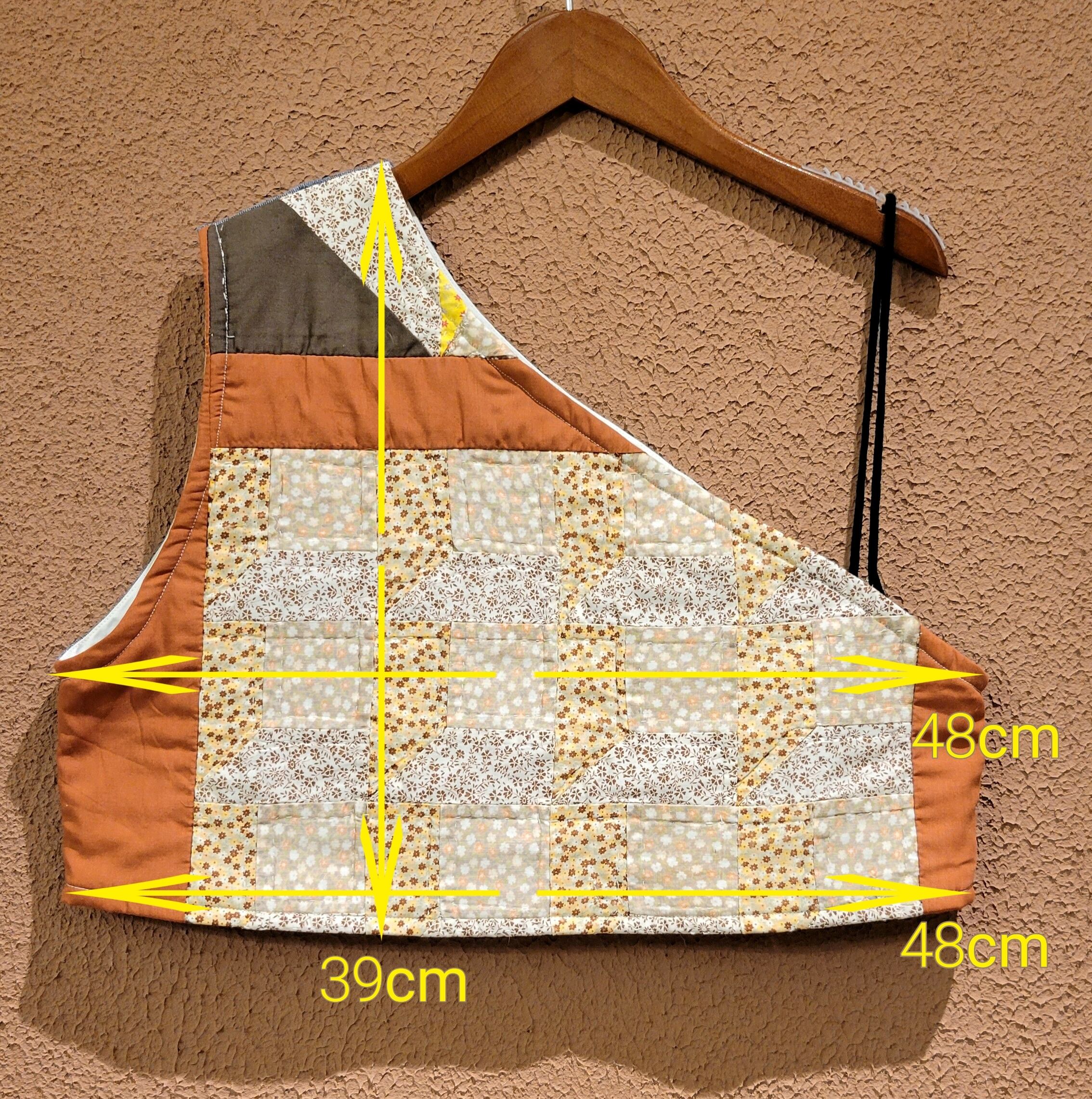 ヴィンテージのパッチワークキルト生地を使用したリメイクトップ。素材はコットンです。中綿入りのふんわり着心地の良いキルトです。中に着るインナーによって色々な表情が楽しめます。共布のリメイクパンツとセットアップとしてもおすすめです。