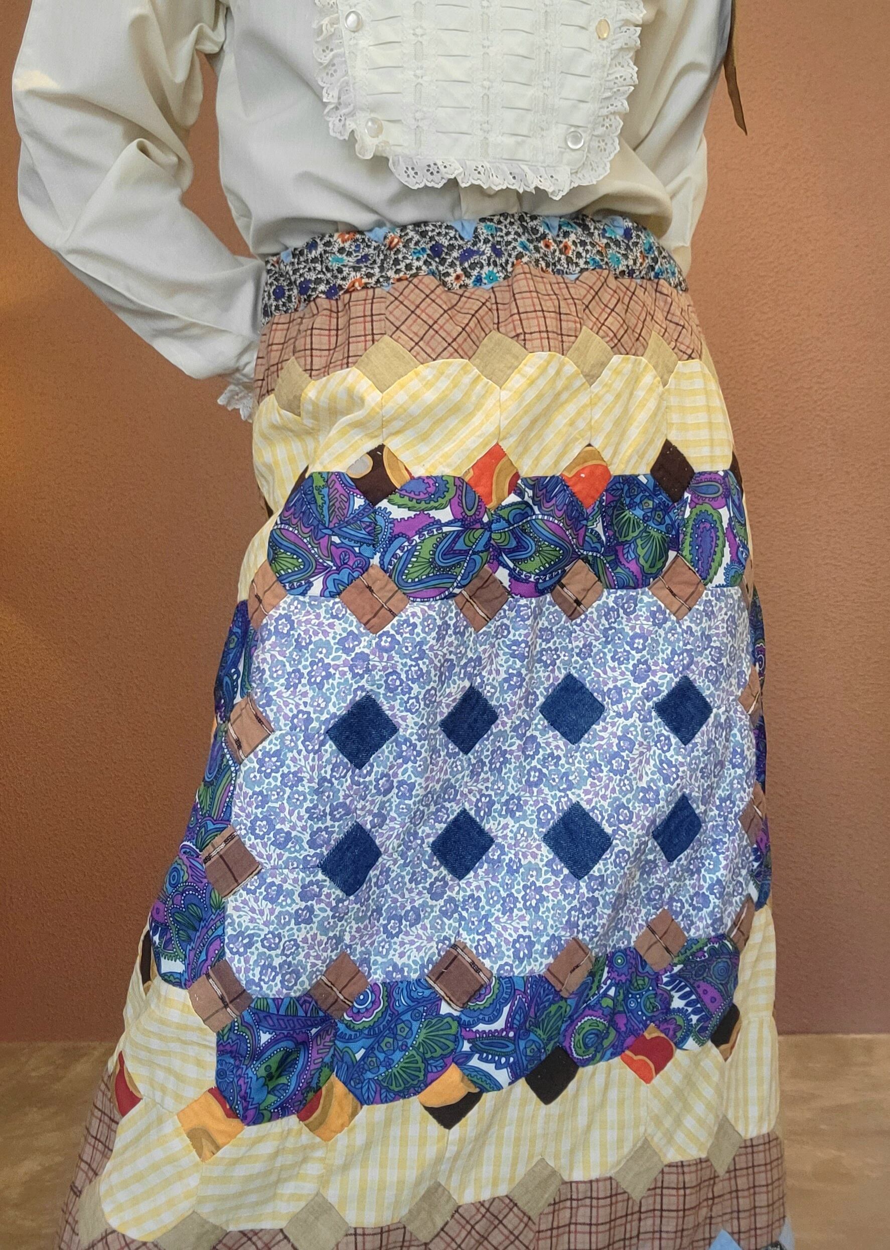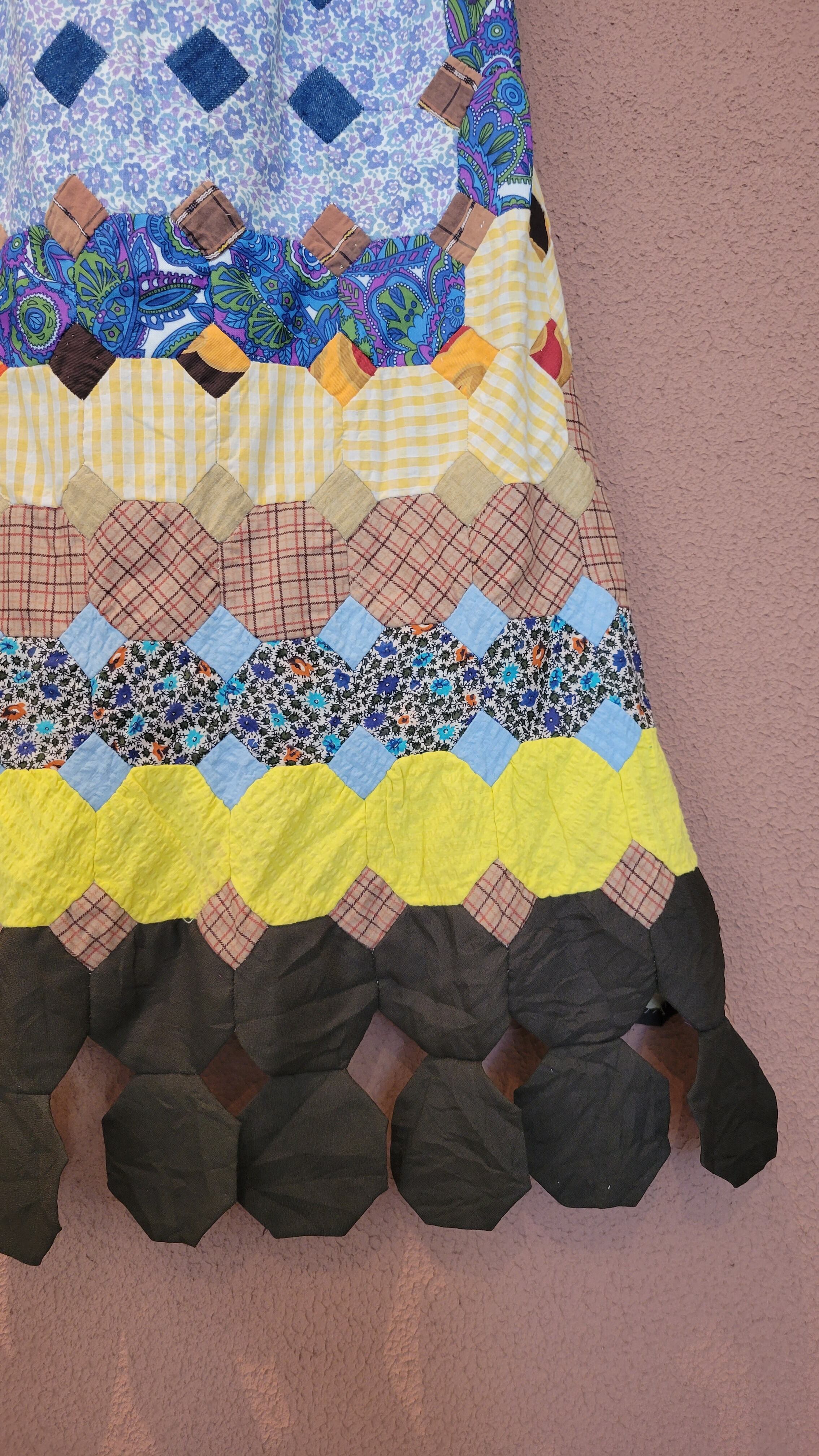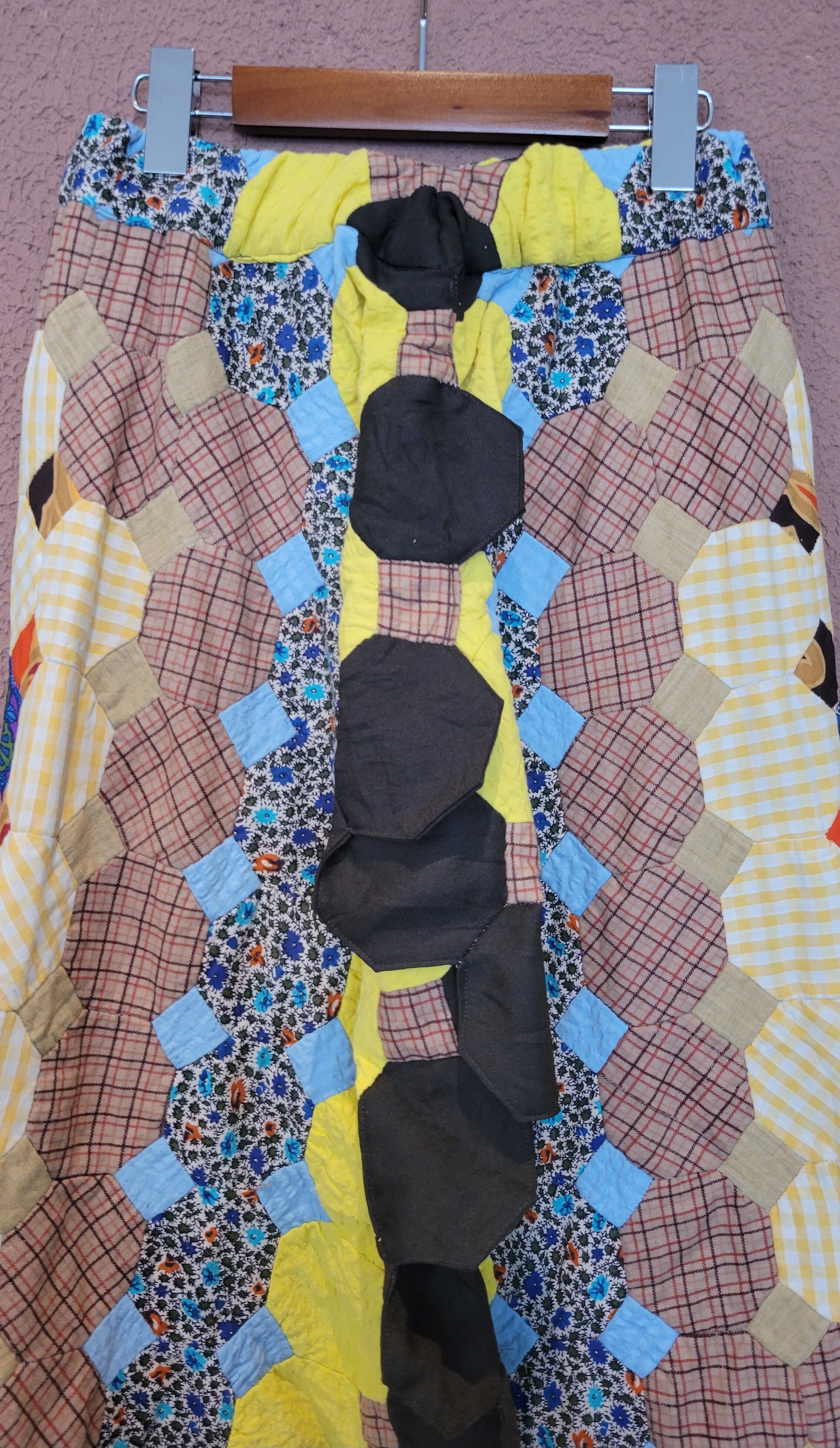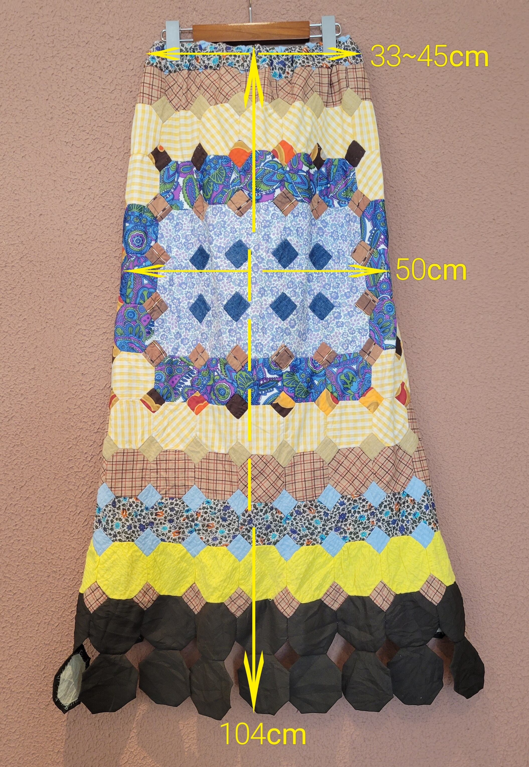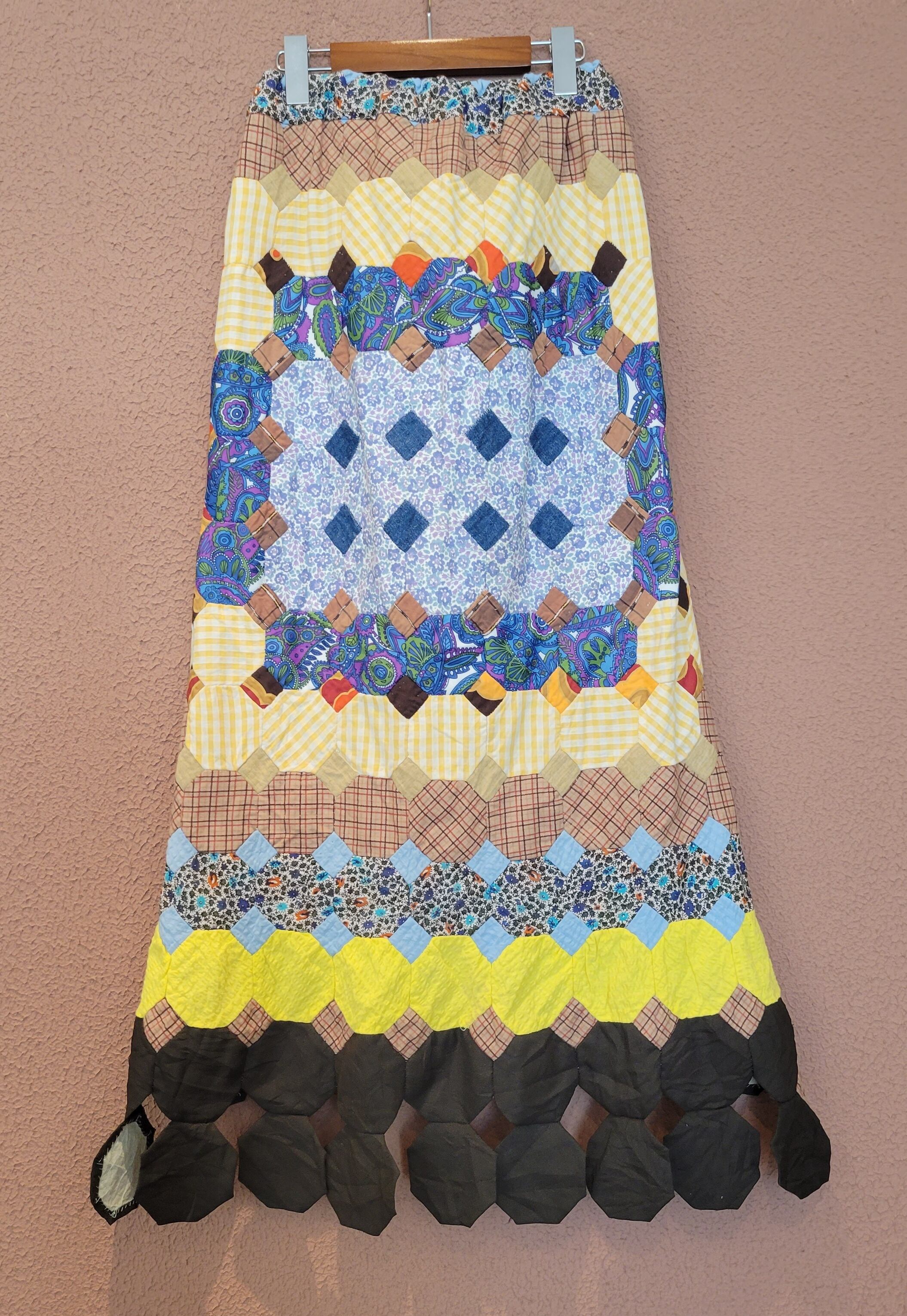 ヴィンテージのパッチワークキルト生地を使用したリメイクマキシスカート。素材はコットンです。ウエストゴム。バックスリットで足さばきが良いです。バックの縫い合わせ部分が立体的になっており個性的。裾のヒラヒラも可愛いポイントです。