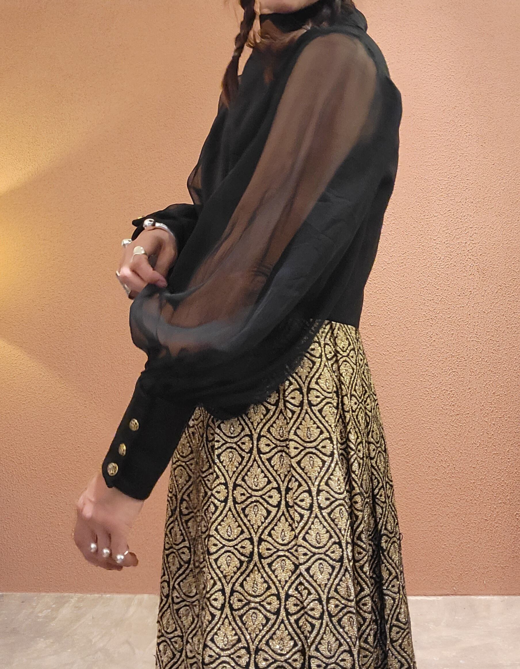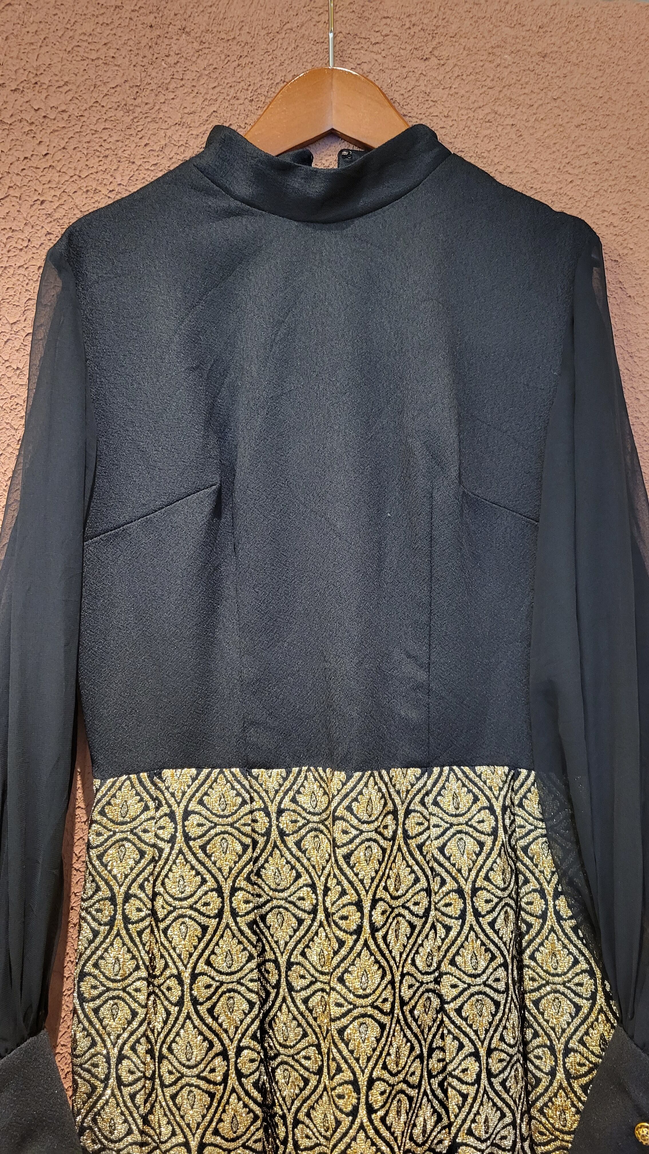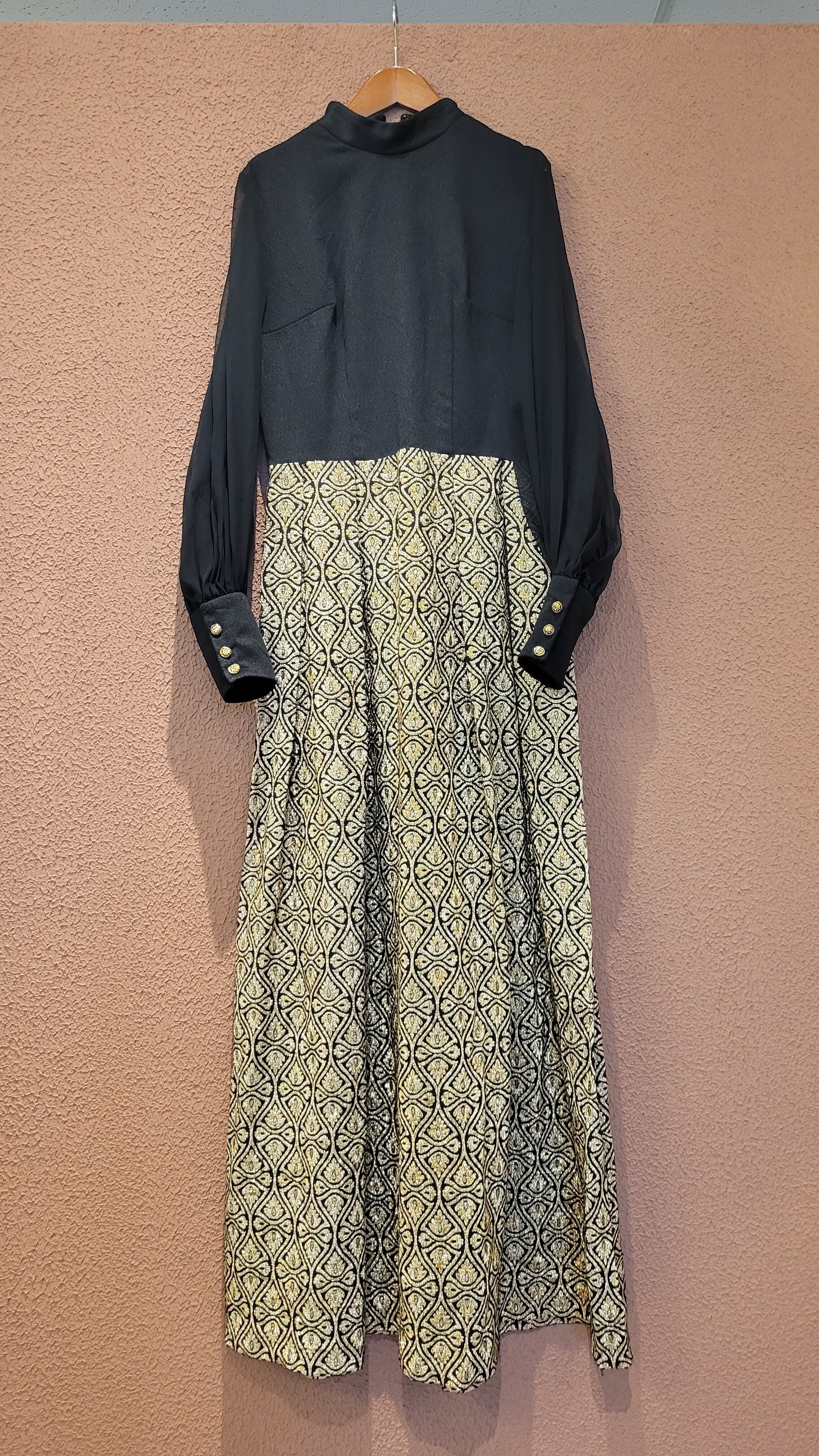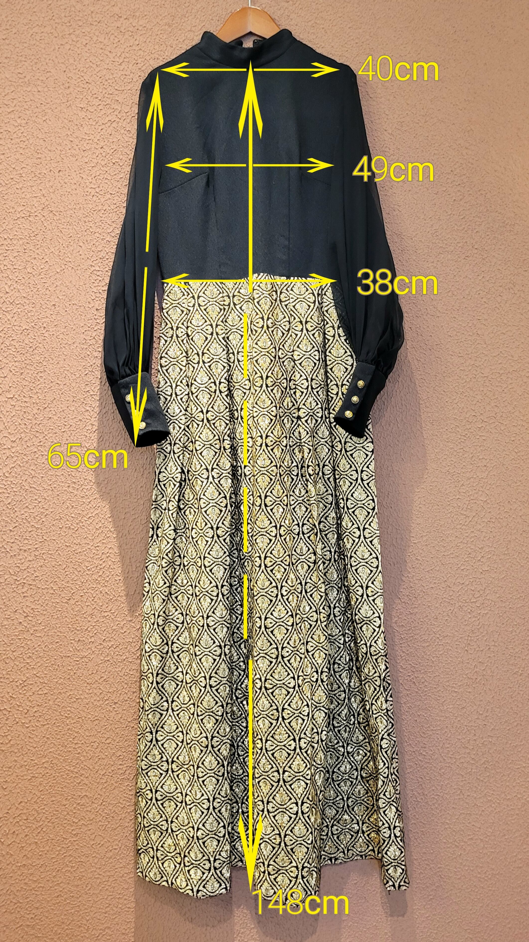 ヴィンテージマキシドレス。素材表記はありませんがやや厚手のポリエステルのようです。バックファスナー仕様、伸縮性はありません。着丈長めですが裾上げ可能なデザインです。シアーなボリュームスリーブが印象的。パーティー等の華やかな場にもぴったりな、1枚で仕上がるワンピースです。