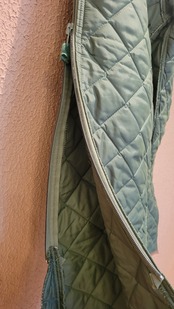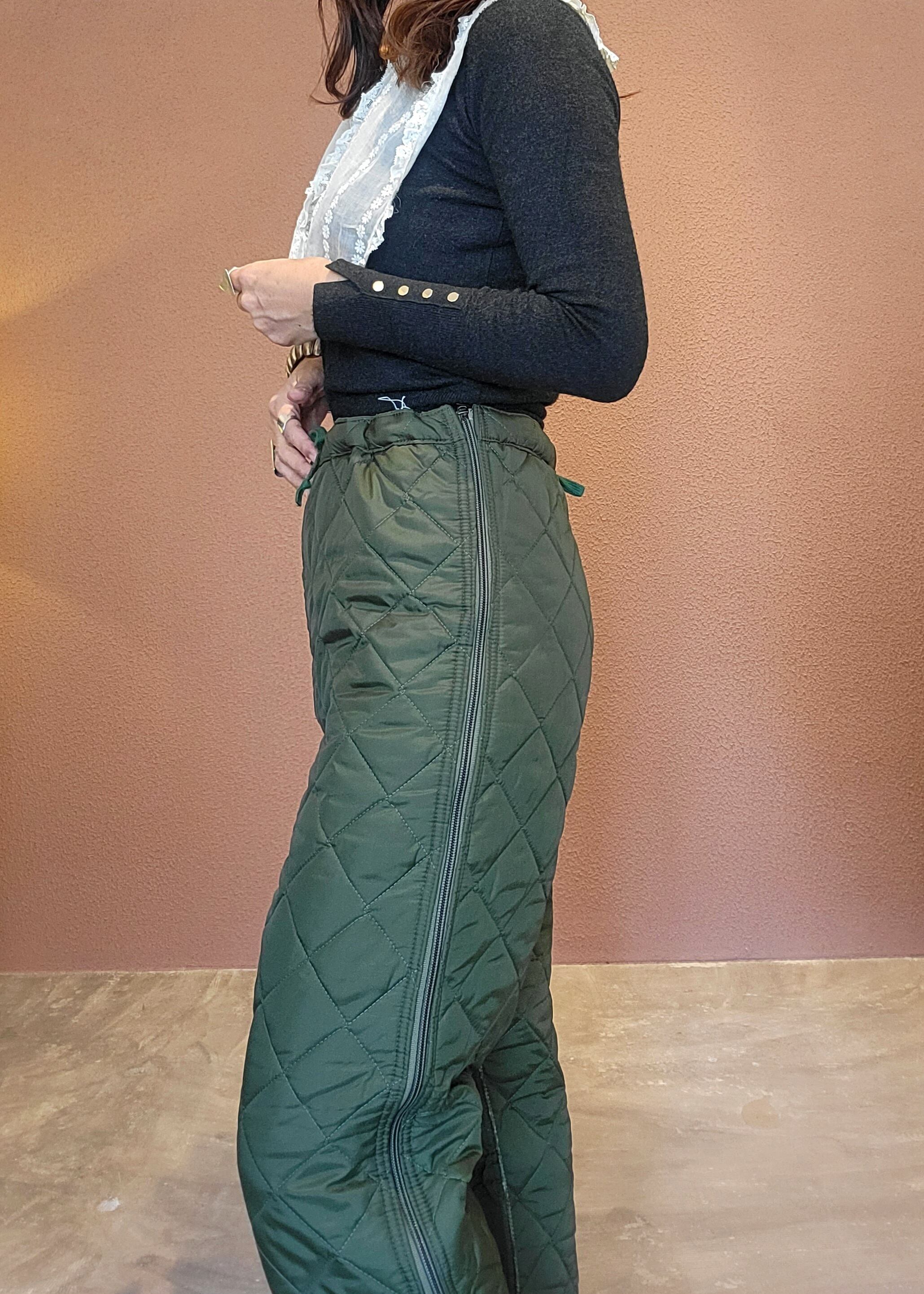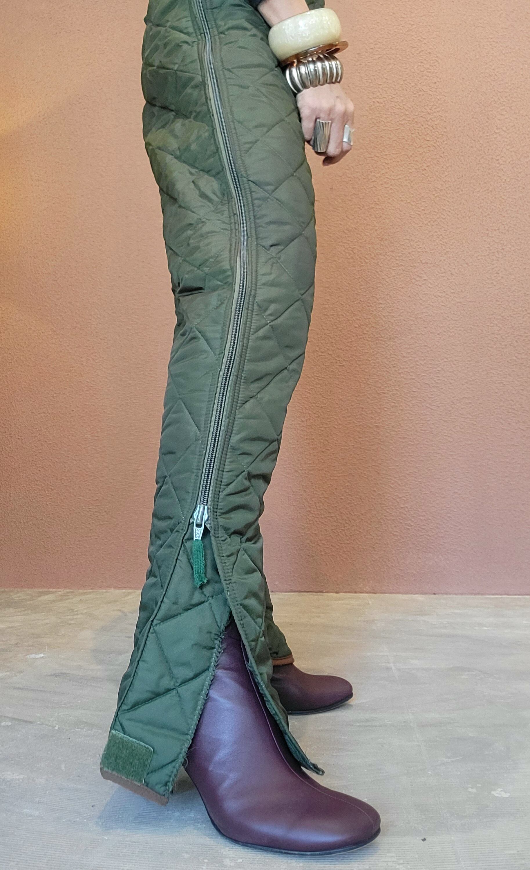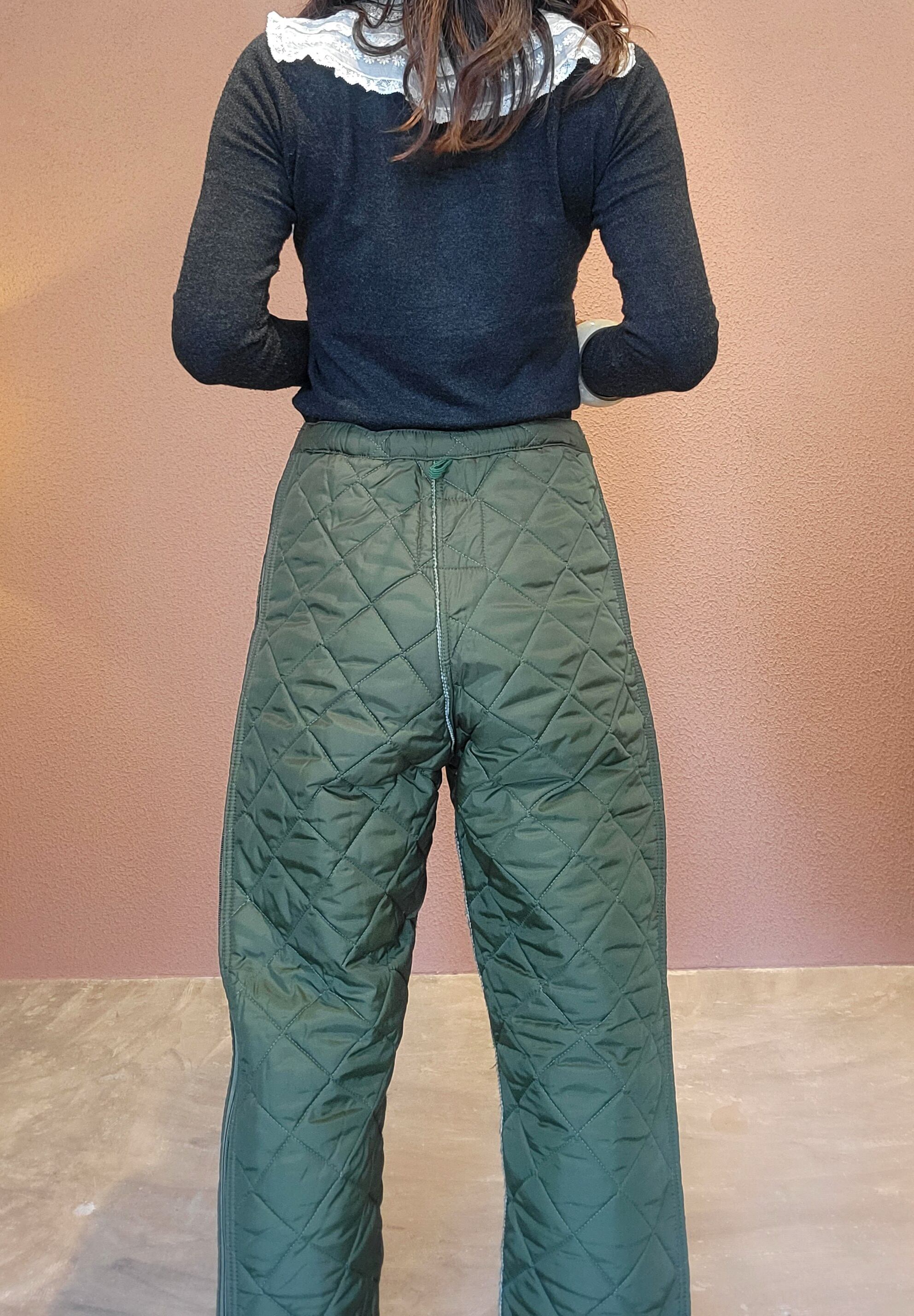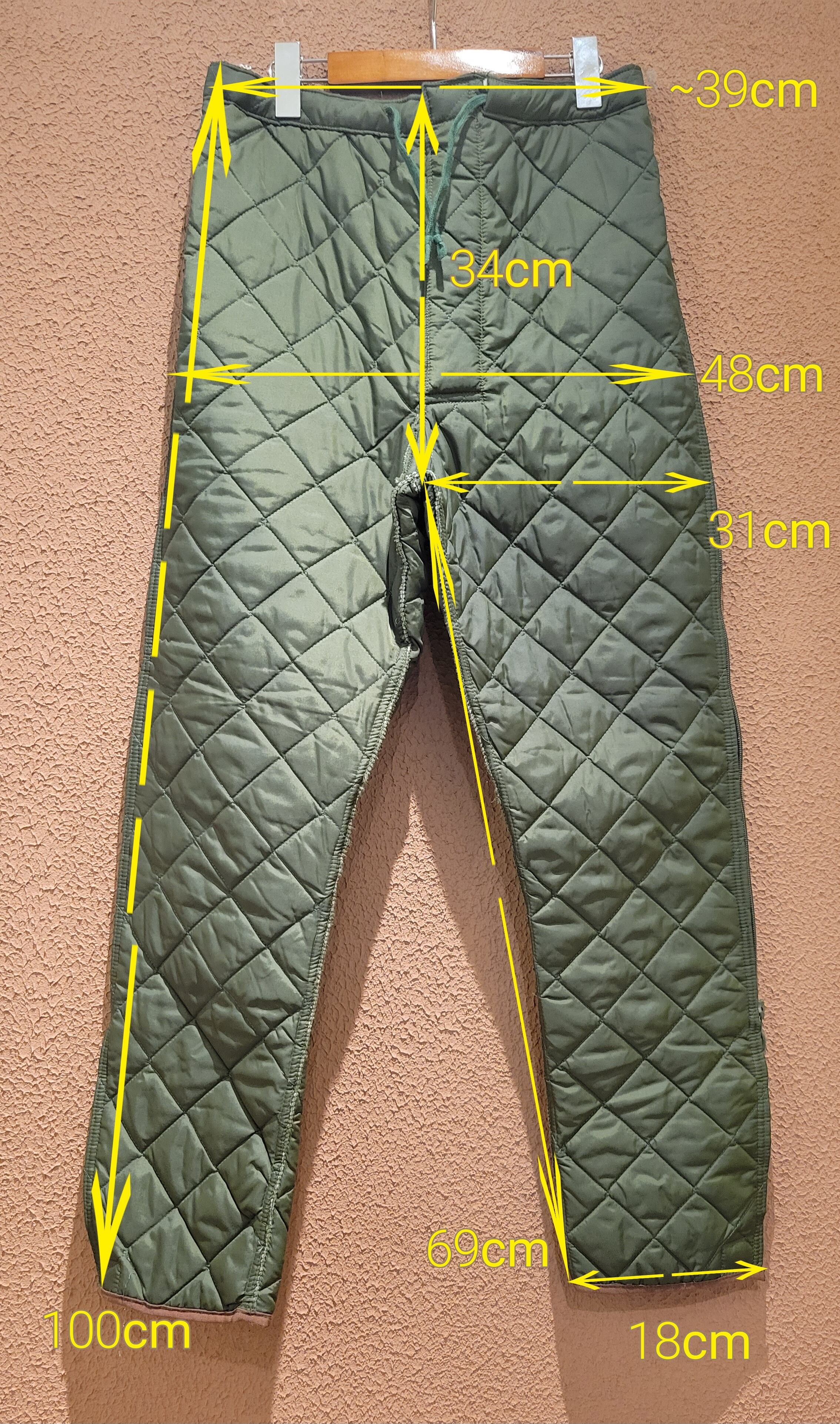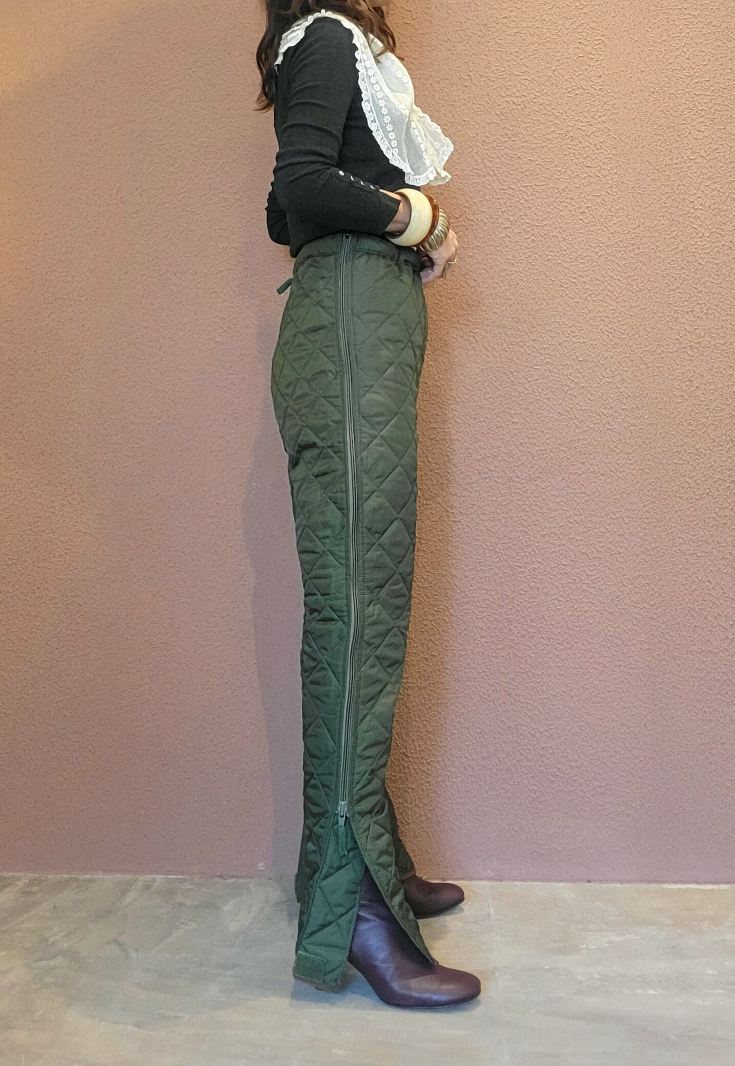 イギリス軍キルティングライナーパンツ。ウエストはドローコードでサイズ調節が可能です。サイドフルジップで裾から上に向かって開ける仕様となります。裾にマジックテープと22cmのスリット入り。マジックテープを外した状態で着用するとスリットがキレイに足元に添うため、すっきりしたシルエットのきれいめスタイリングも可能に。ほぼ未使用のミントコンディション、稀少なレディースサイズでおすすめです。