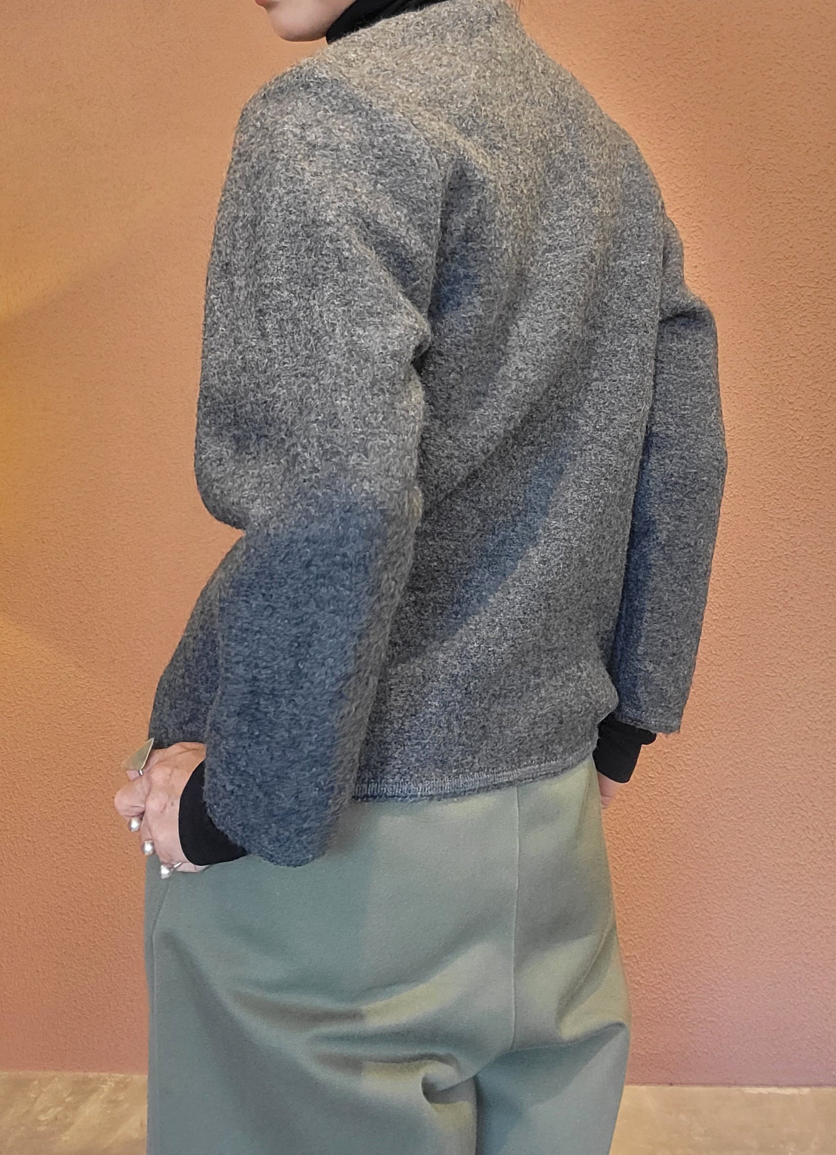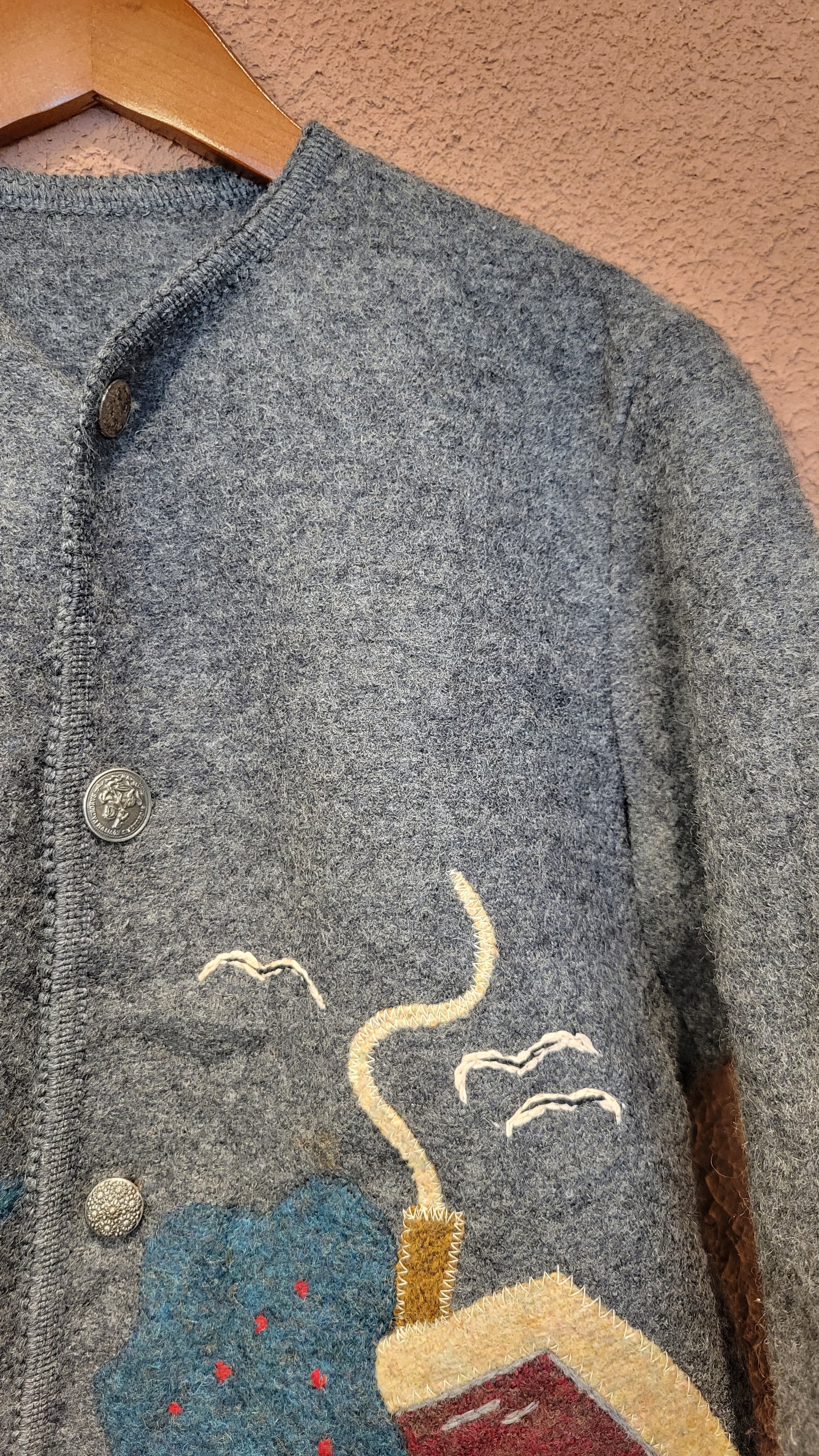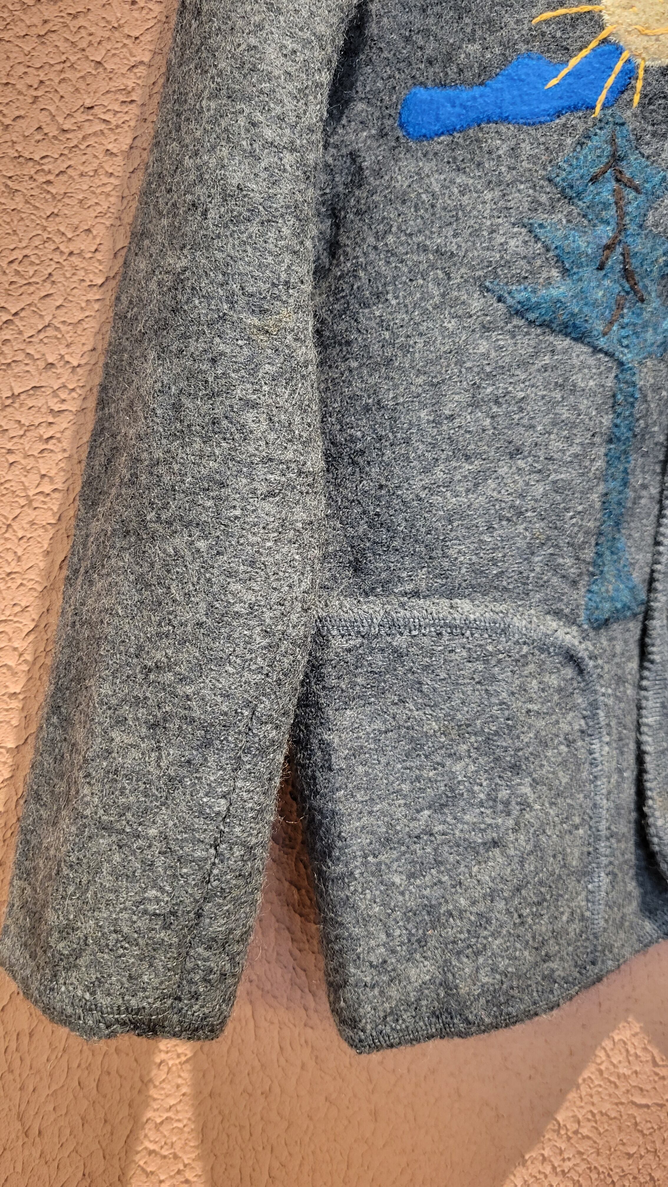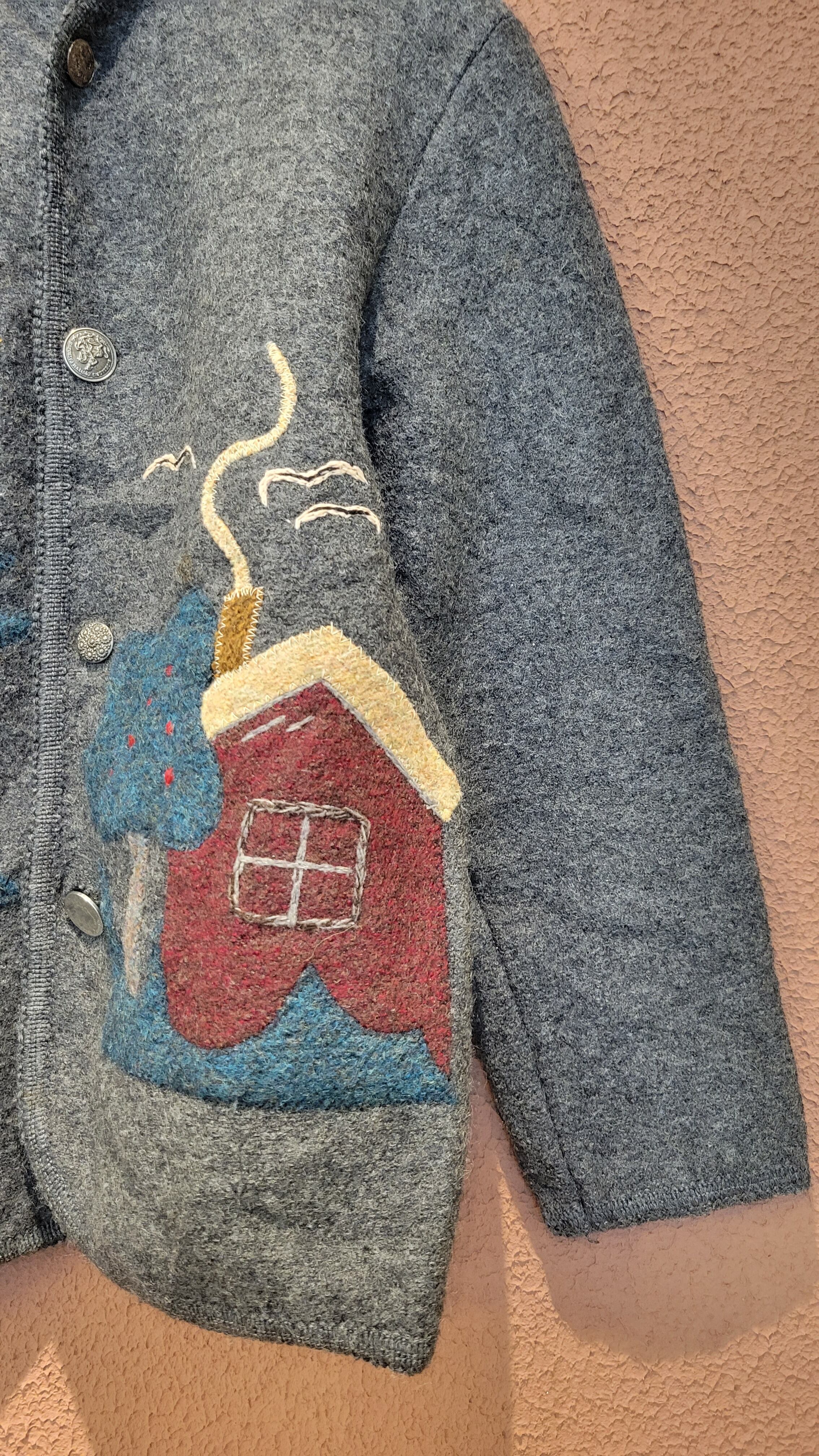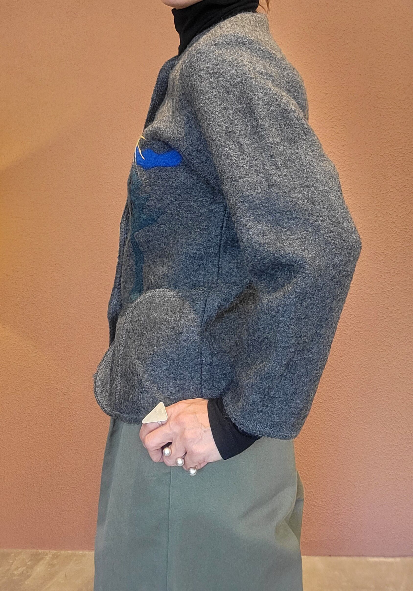 ヴィンテージのウールジャケット。ハンドメイドのようです。しっかりと目の詰まった圧縮ウールのような素材で保温性に優れています。フロントのボタンはひとつひとつ異なるヴィンテージボタンで雰囲気たっぷり。コンパクトサイズですっきりきれいめスタイリングにもぴったりです。