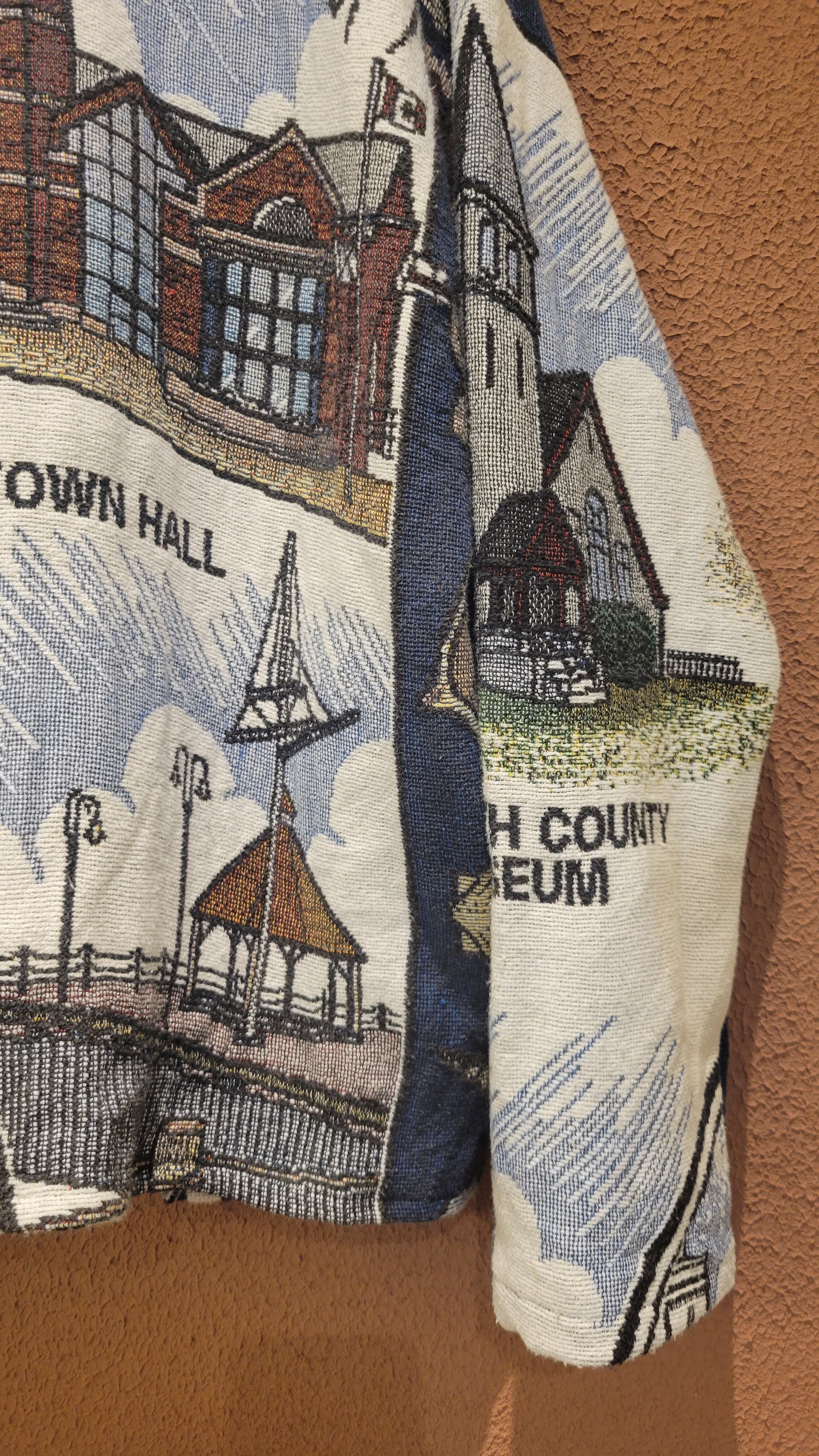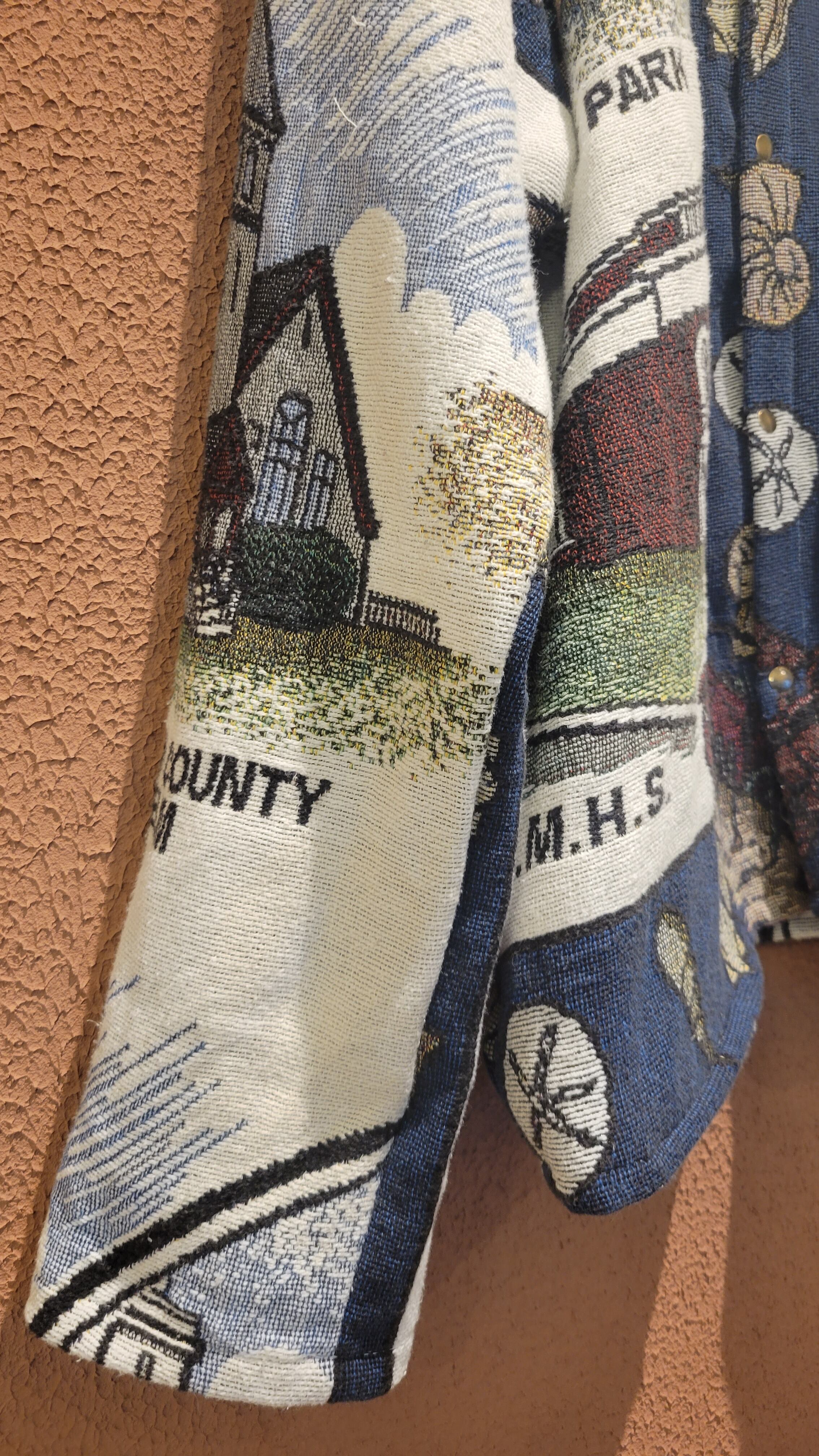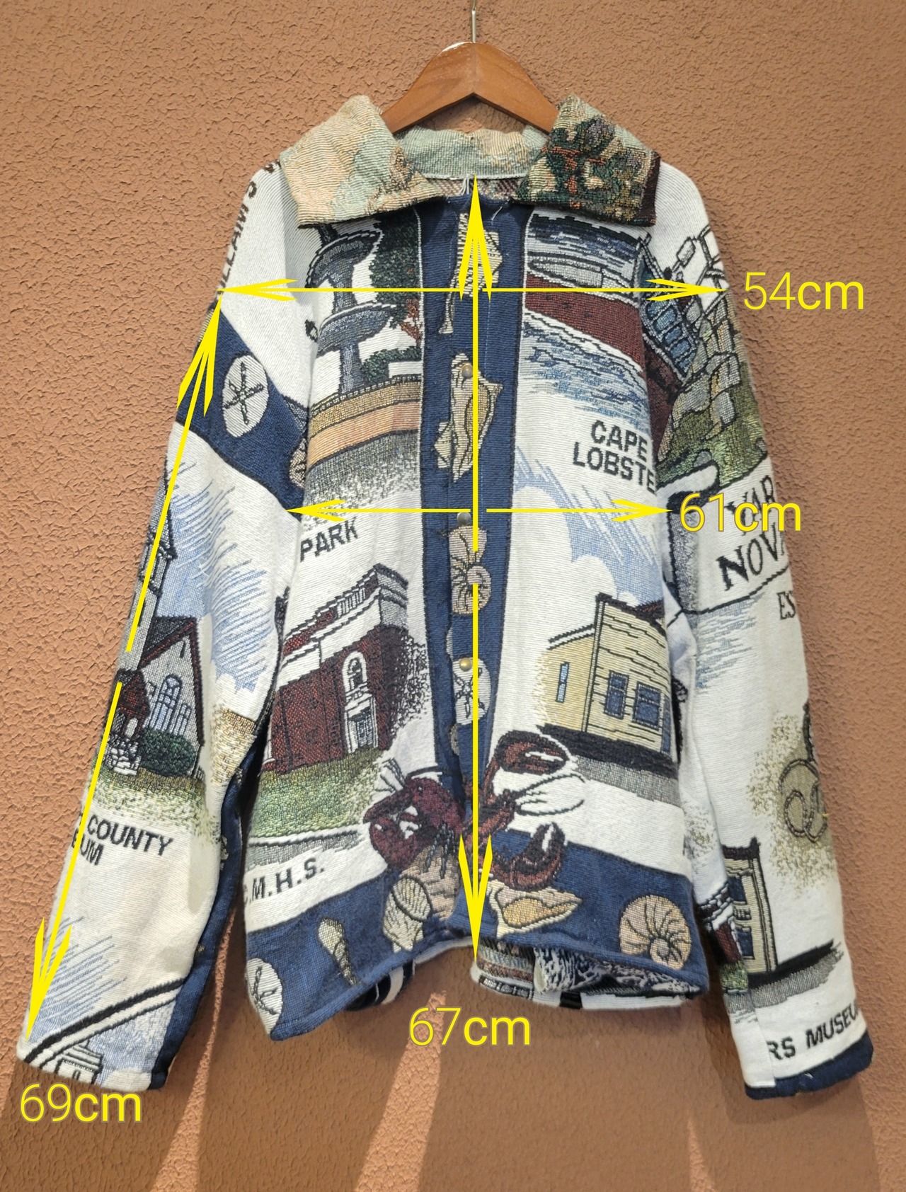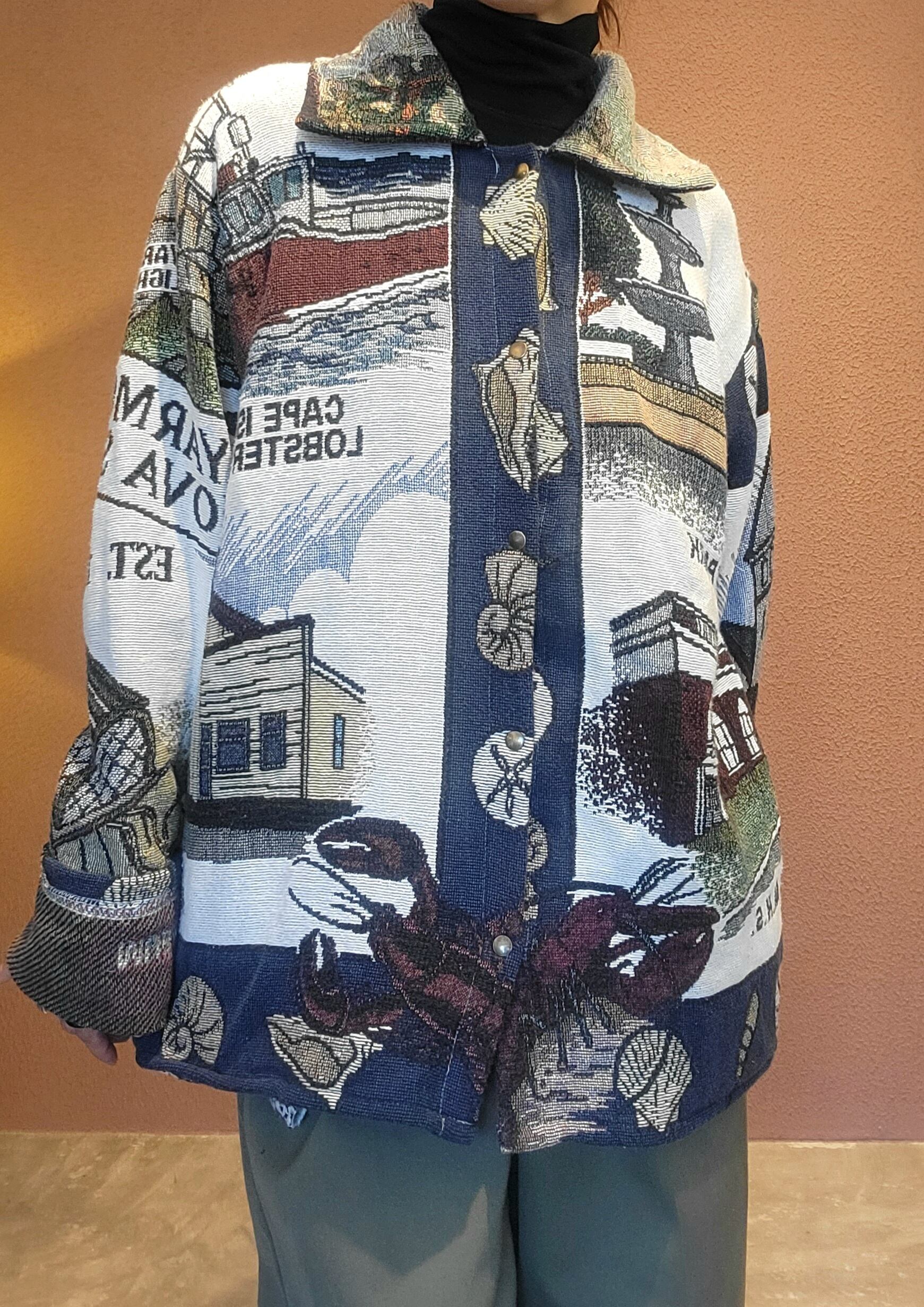 ヴィンテージのブランケットを使用したリメイクジャケット。素材表記はありませんがコットンのようです。フロントはスナップボタン仕様。大きめサイズで男女兼用で着用できます。女性がオーバーサイズで着るのもおすすめです。袖丈長めですが折り返して裏側を見せても可愛いです。肩の力を抜いたカジュアルスタイリングに。